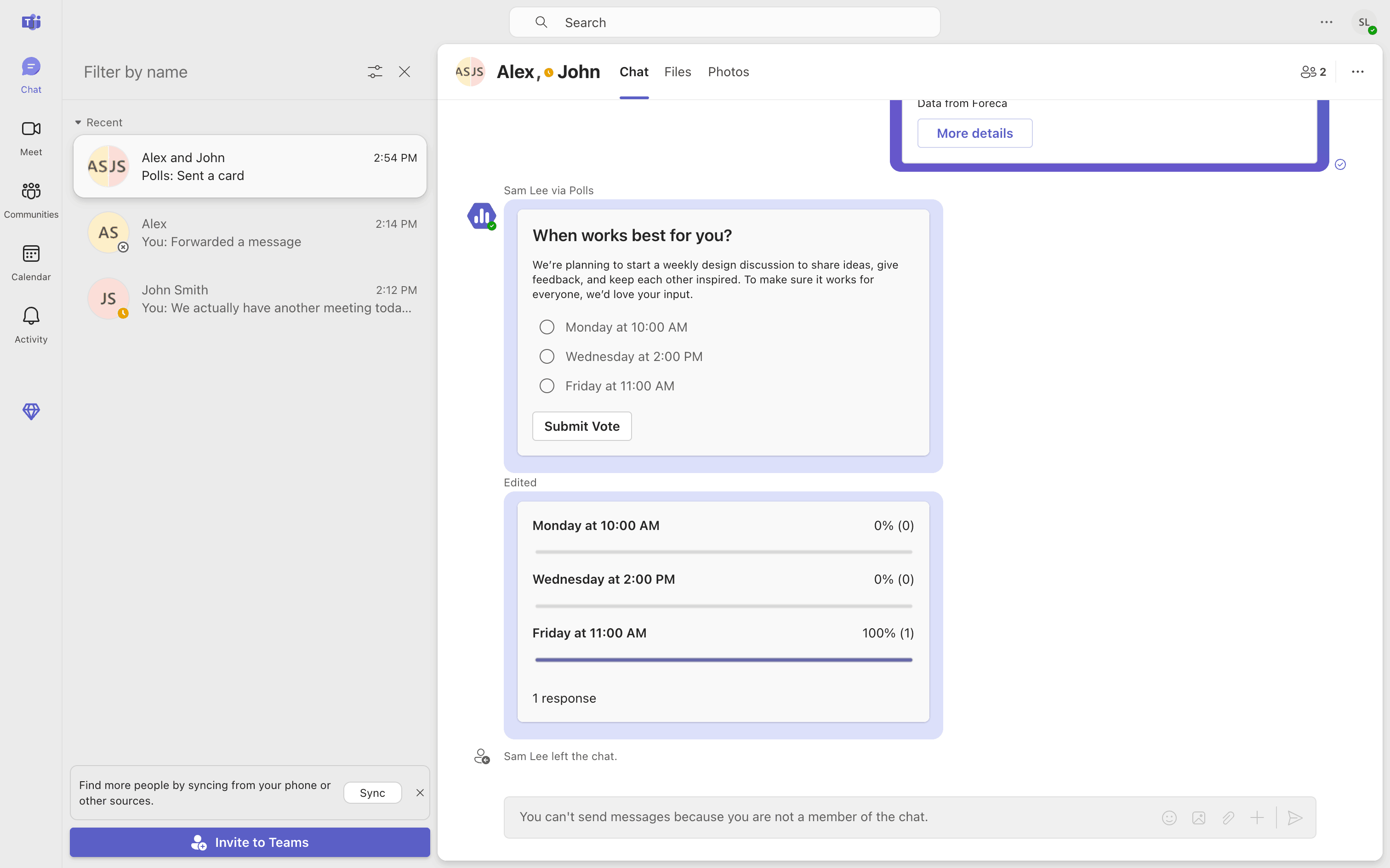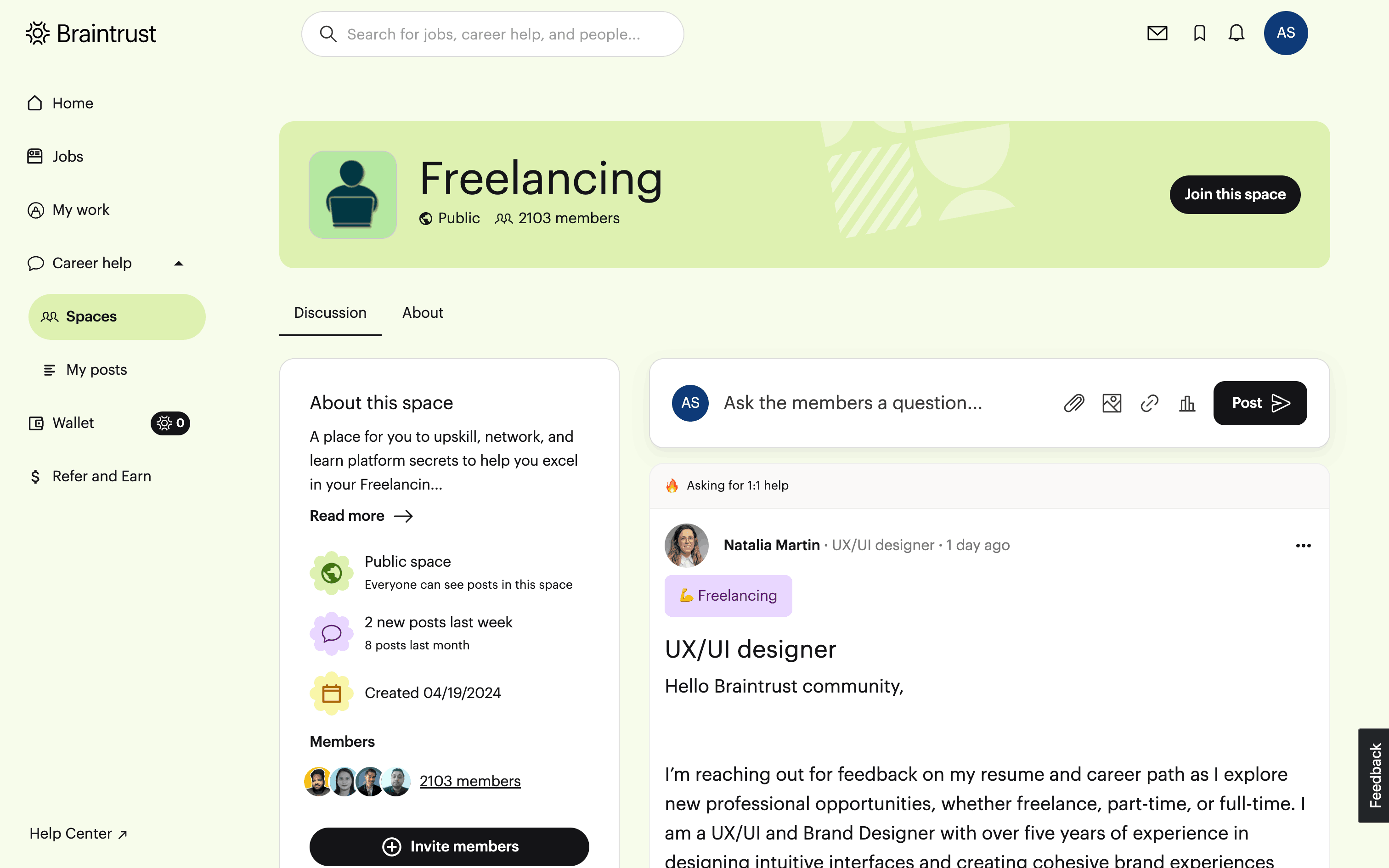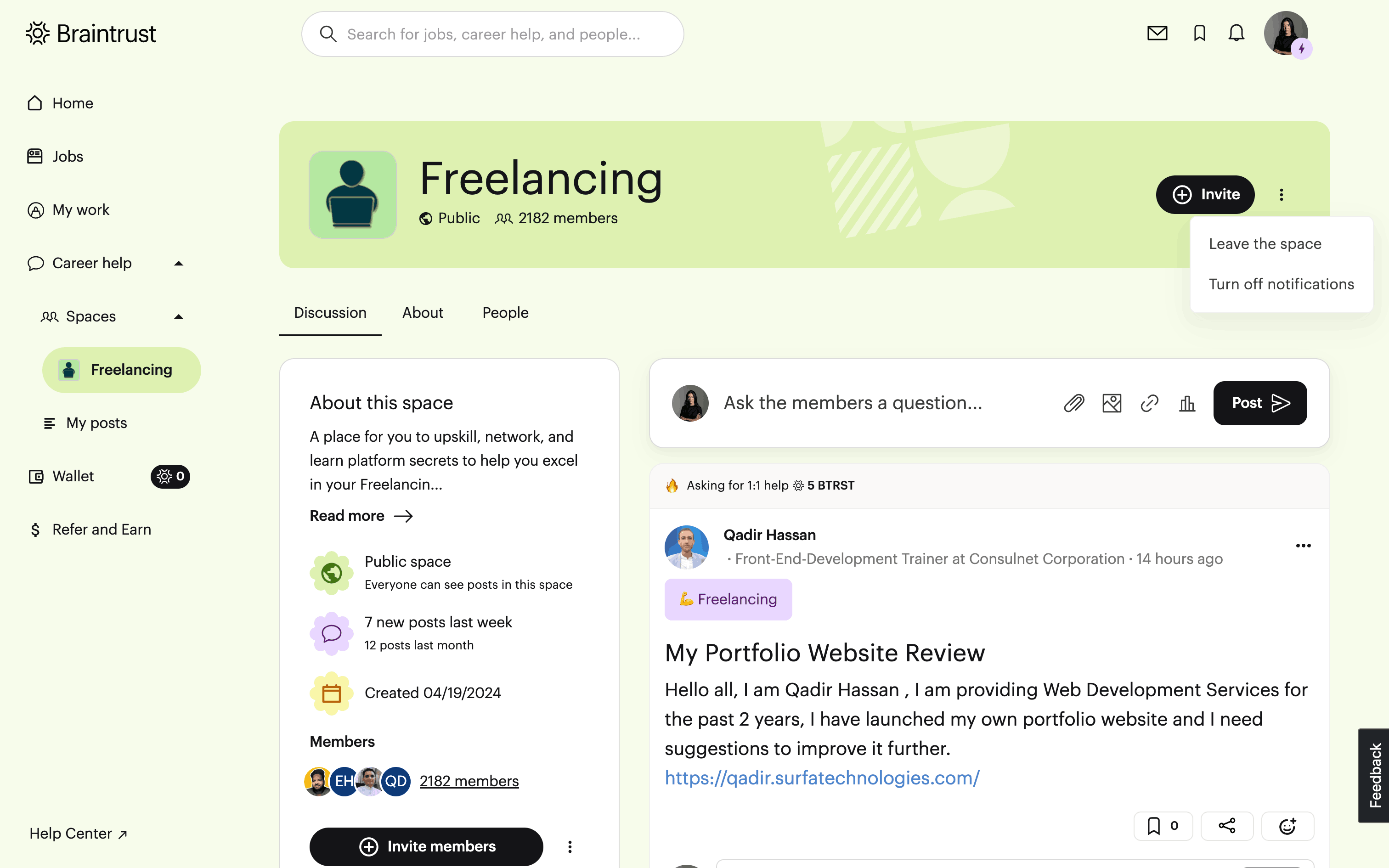 The user leaves a 'Freelancing' space, which changes the 'Invite' button to a 'Join this space' button. This reflects the user's updated status as a non-member.