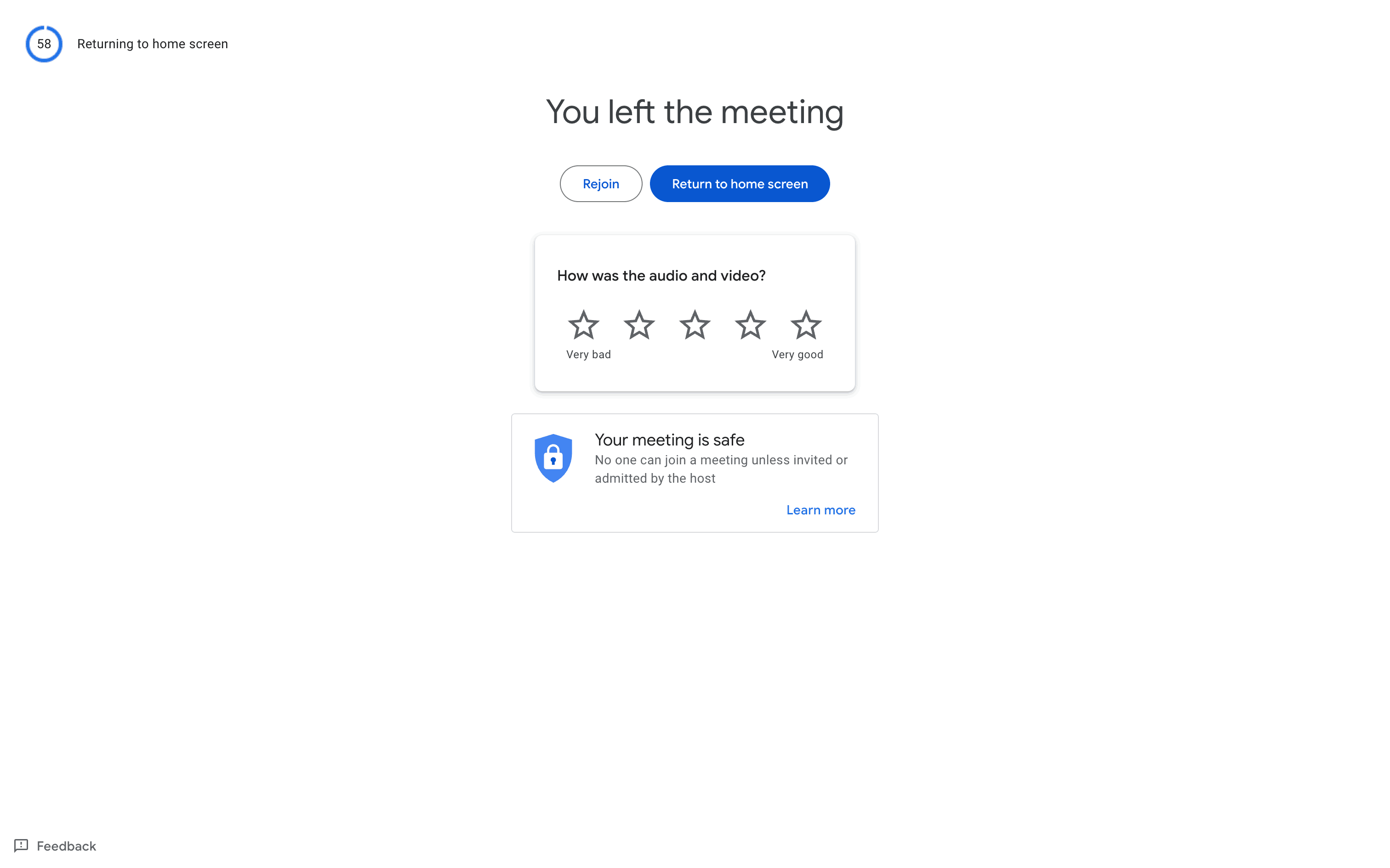 The user flow shows a user leaving a video call. After ending the call, the user is presented with options to rejoin or return to the home screen.