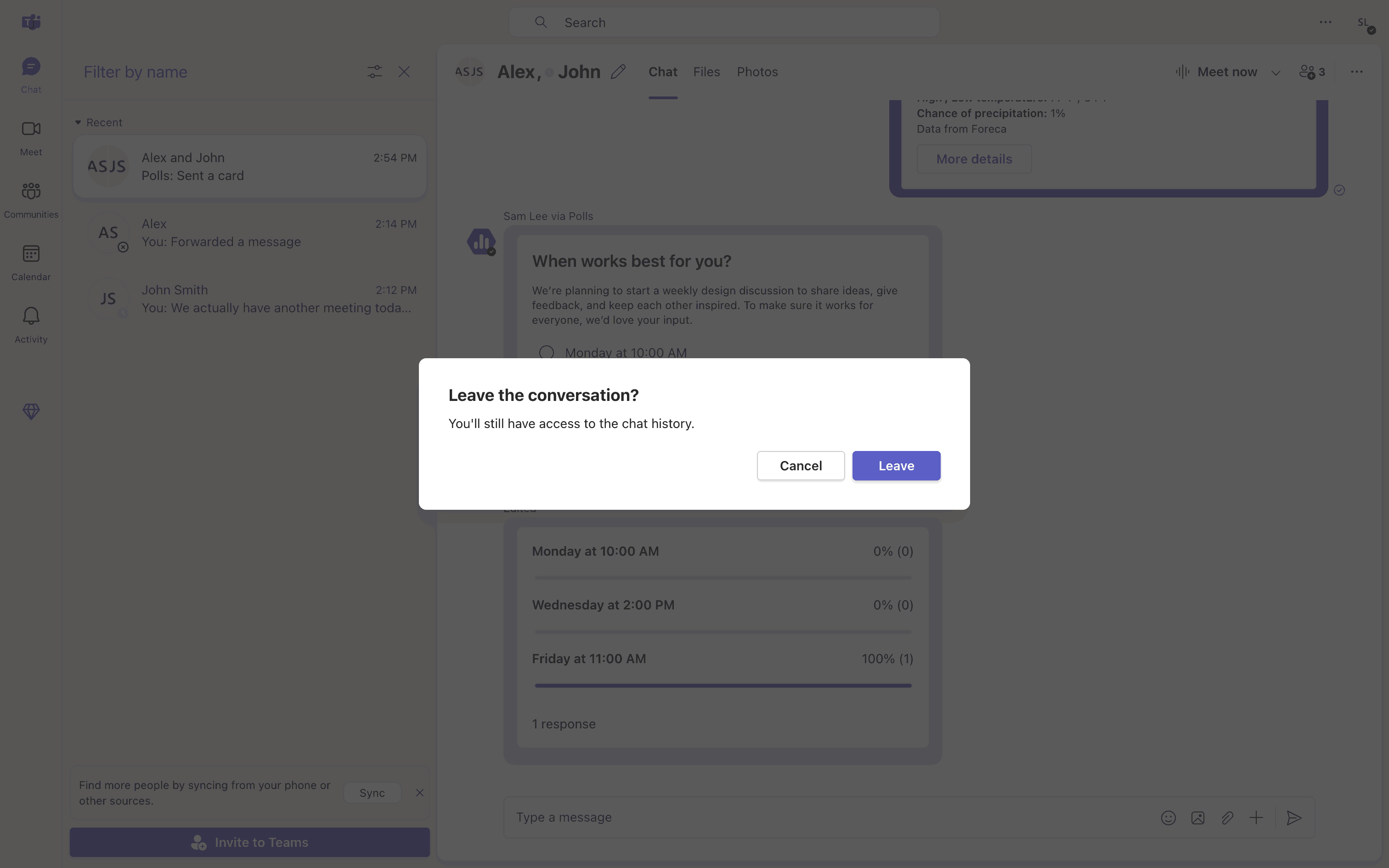 The user initiates leaving a group chat by selecting the leave option and confirming the action. The chat interface then updates to reflect the user's departure.