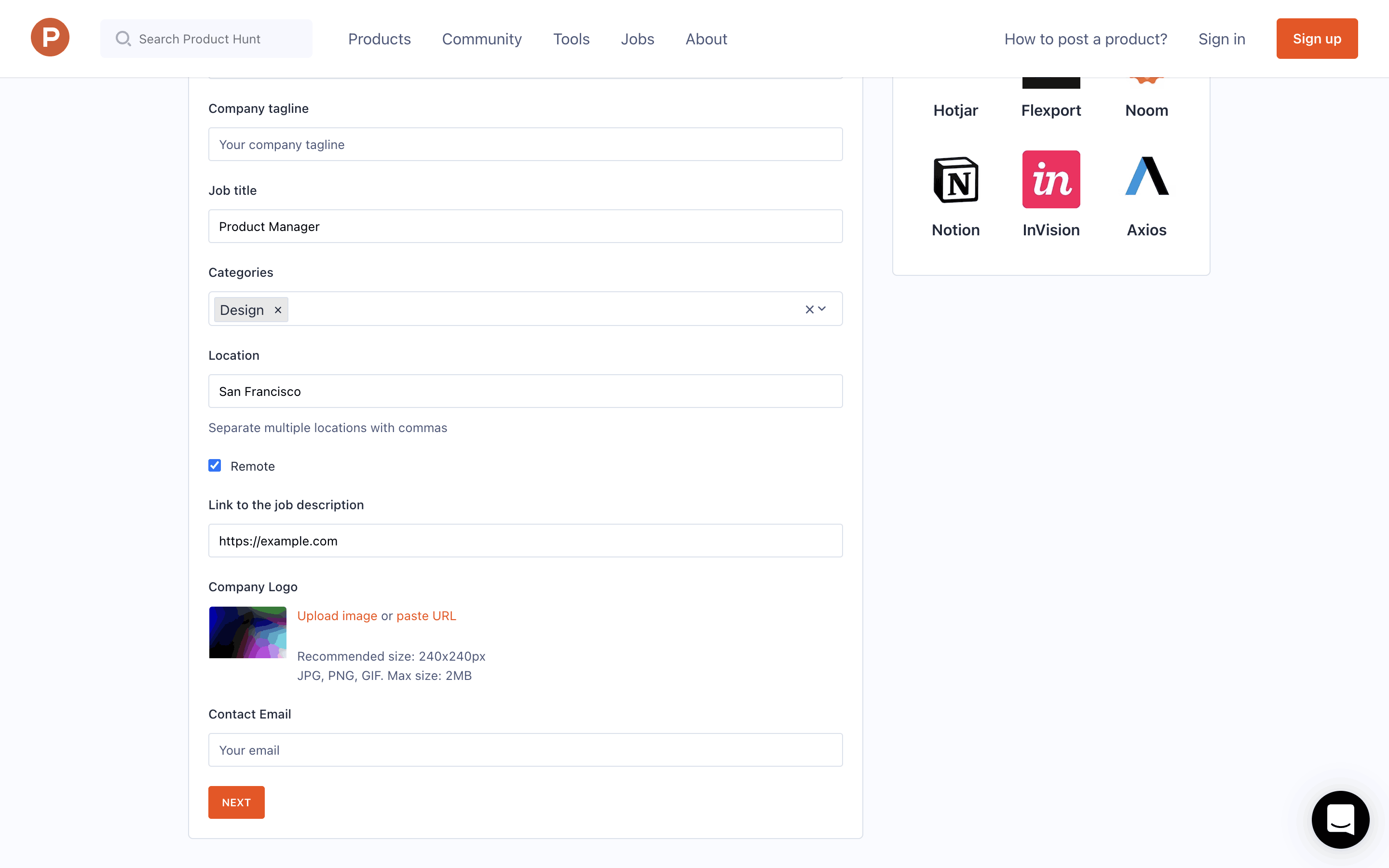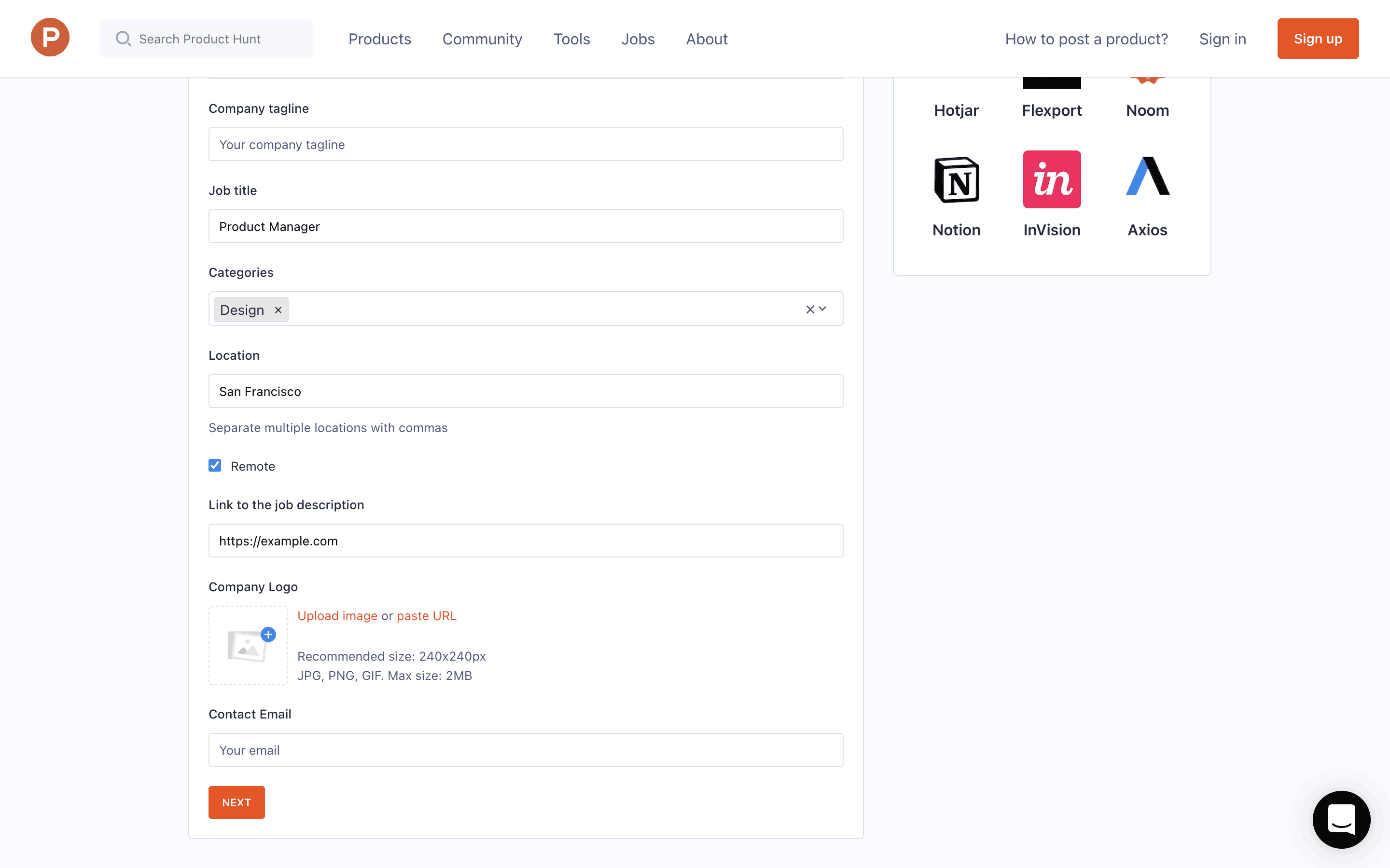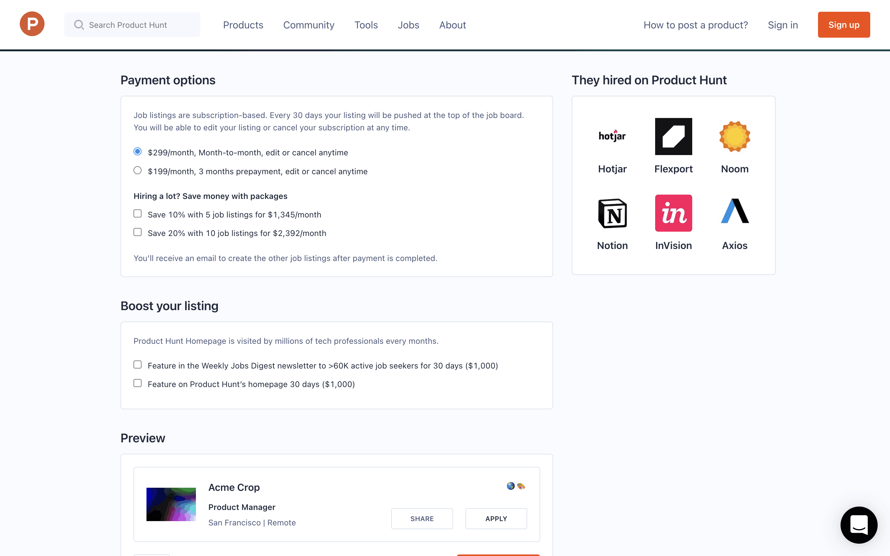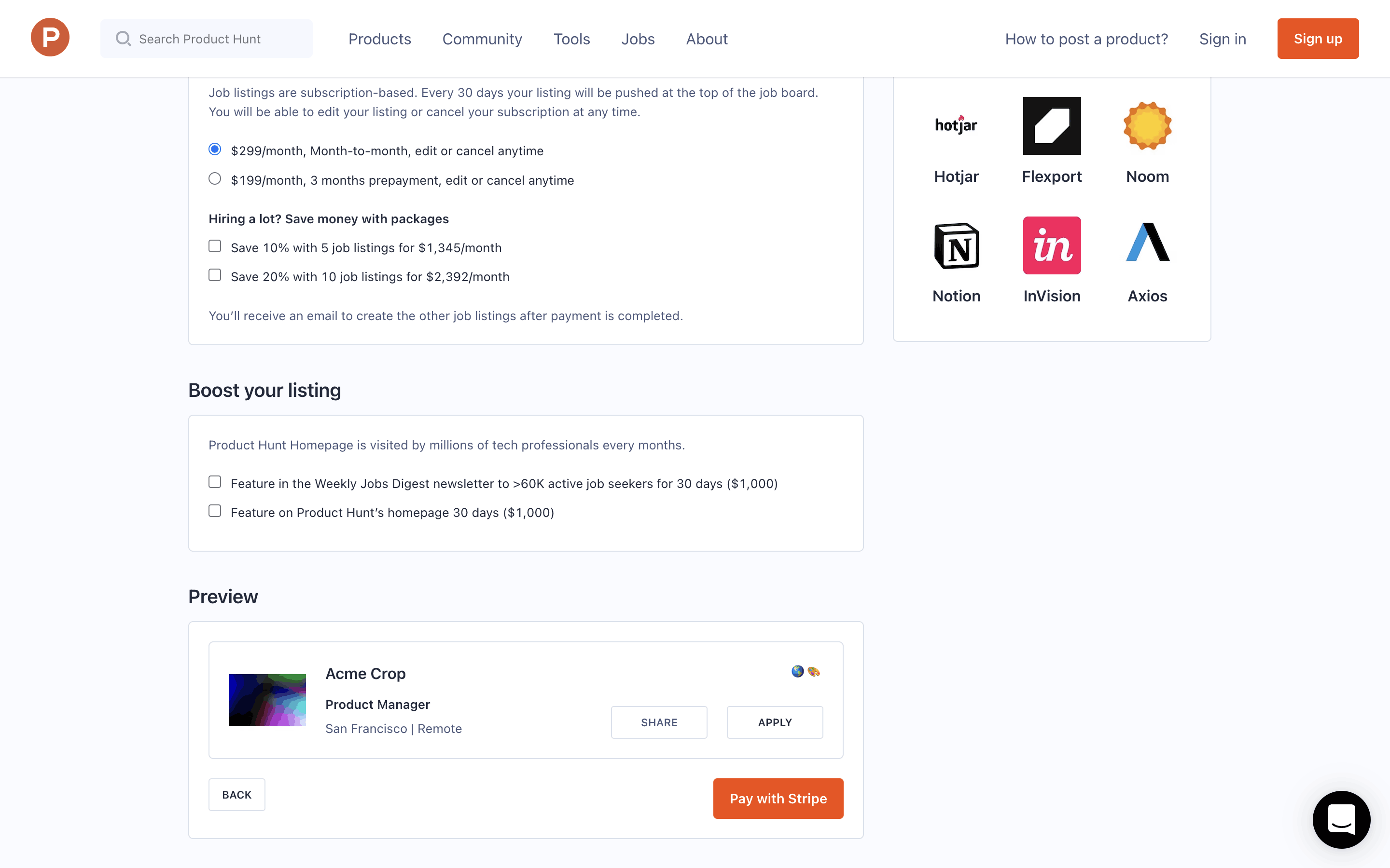 The user flow showcases posting a job, starting from the job listing page, proceeding through the job creation form, and ending with the payment process. The flow concludes with a checkout modal.