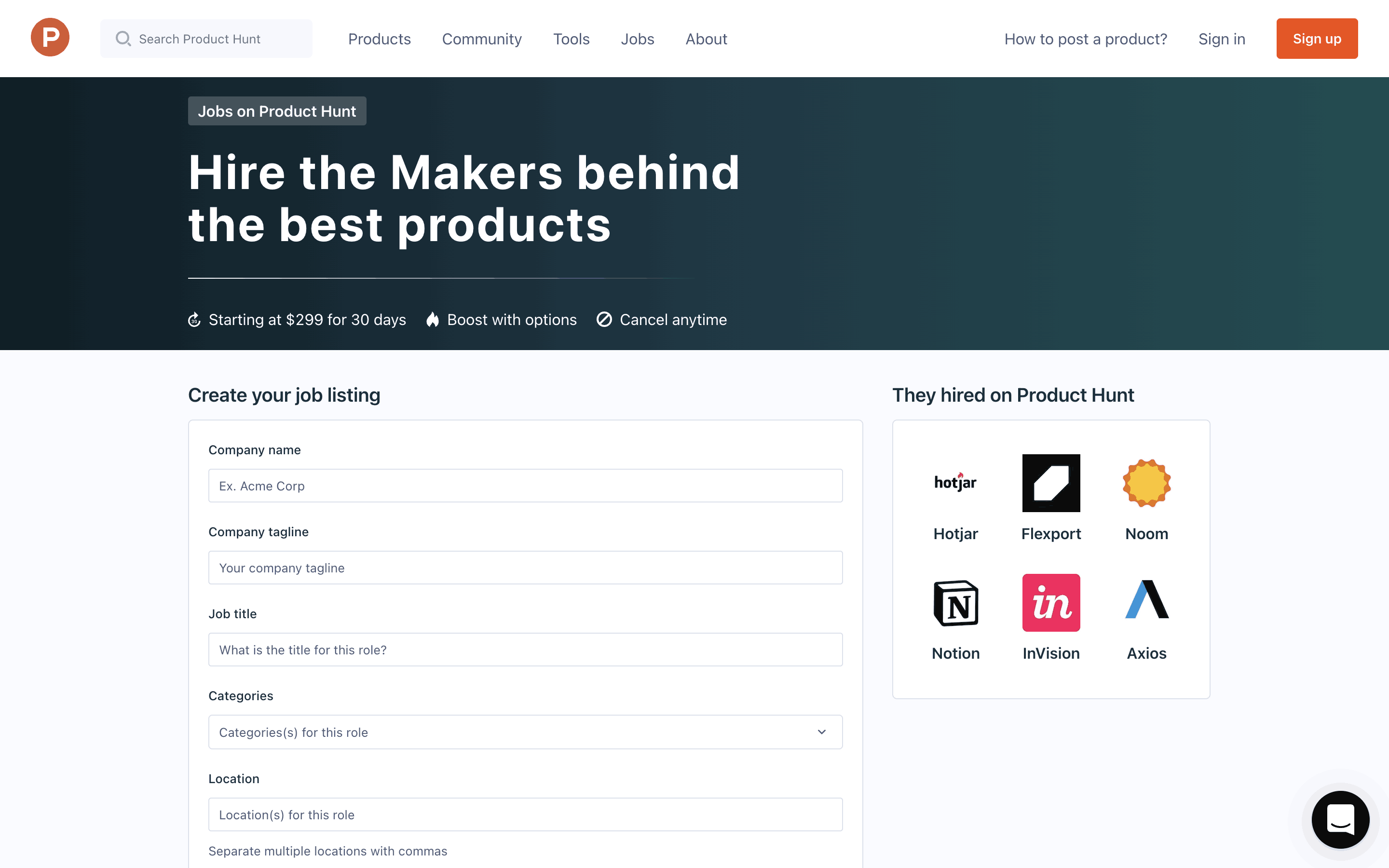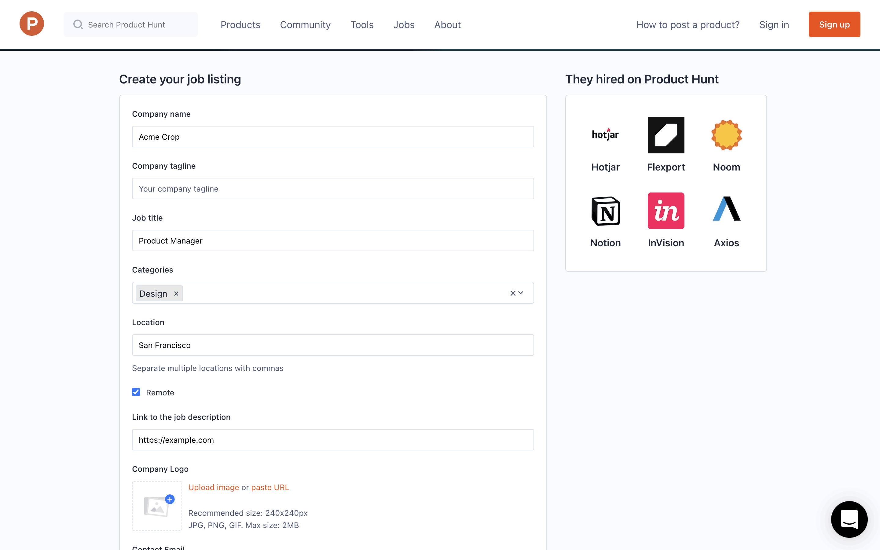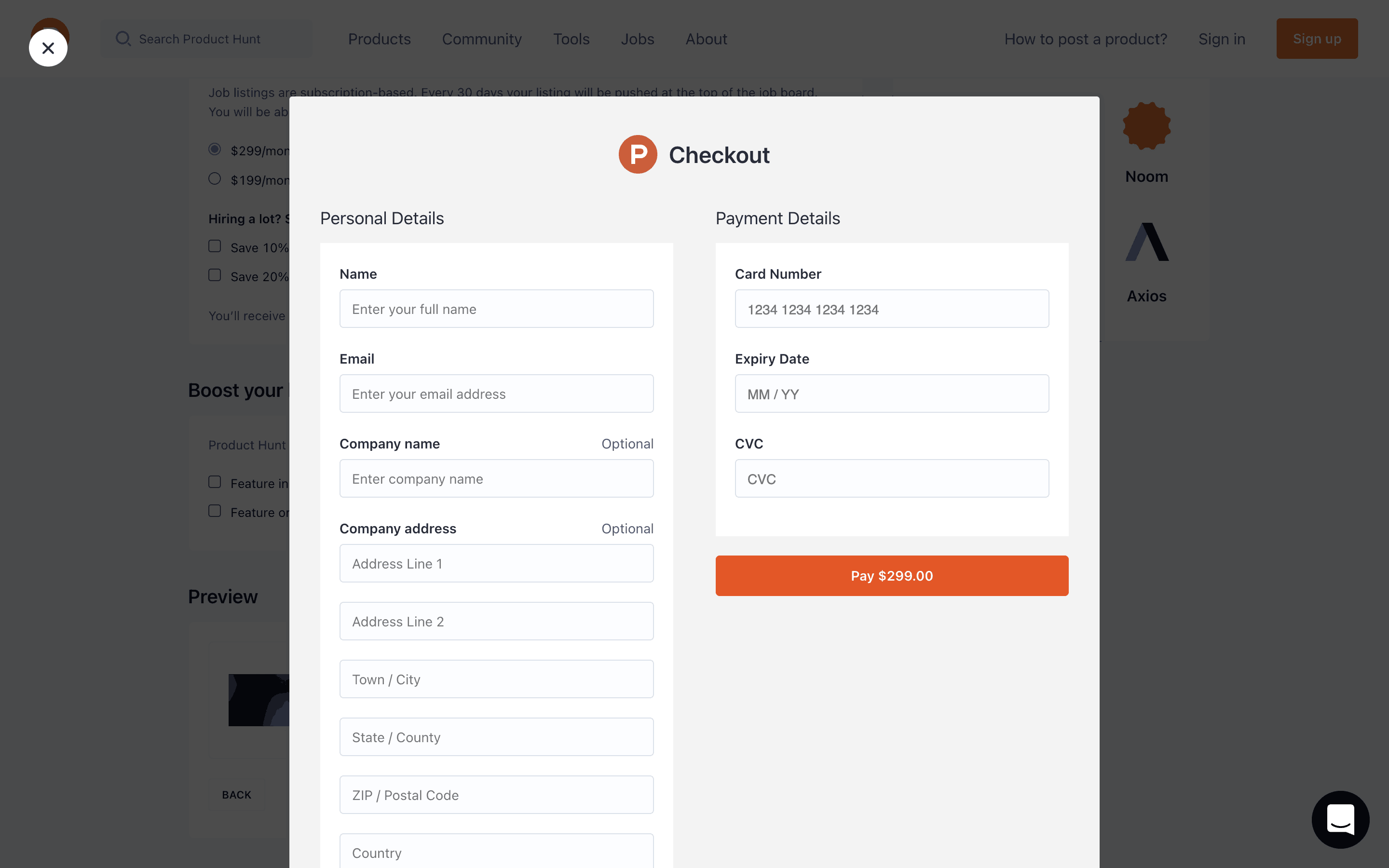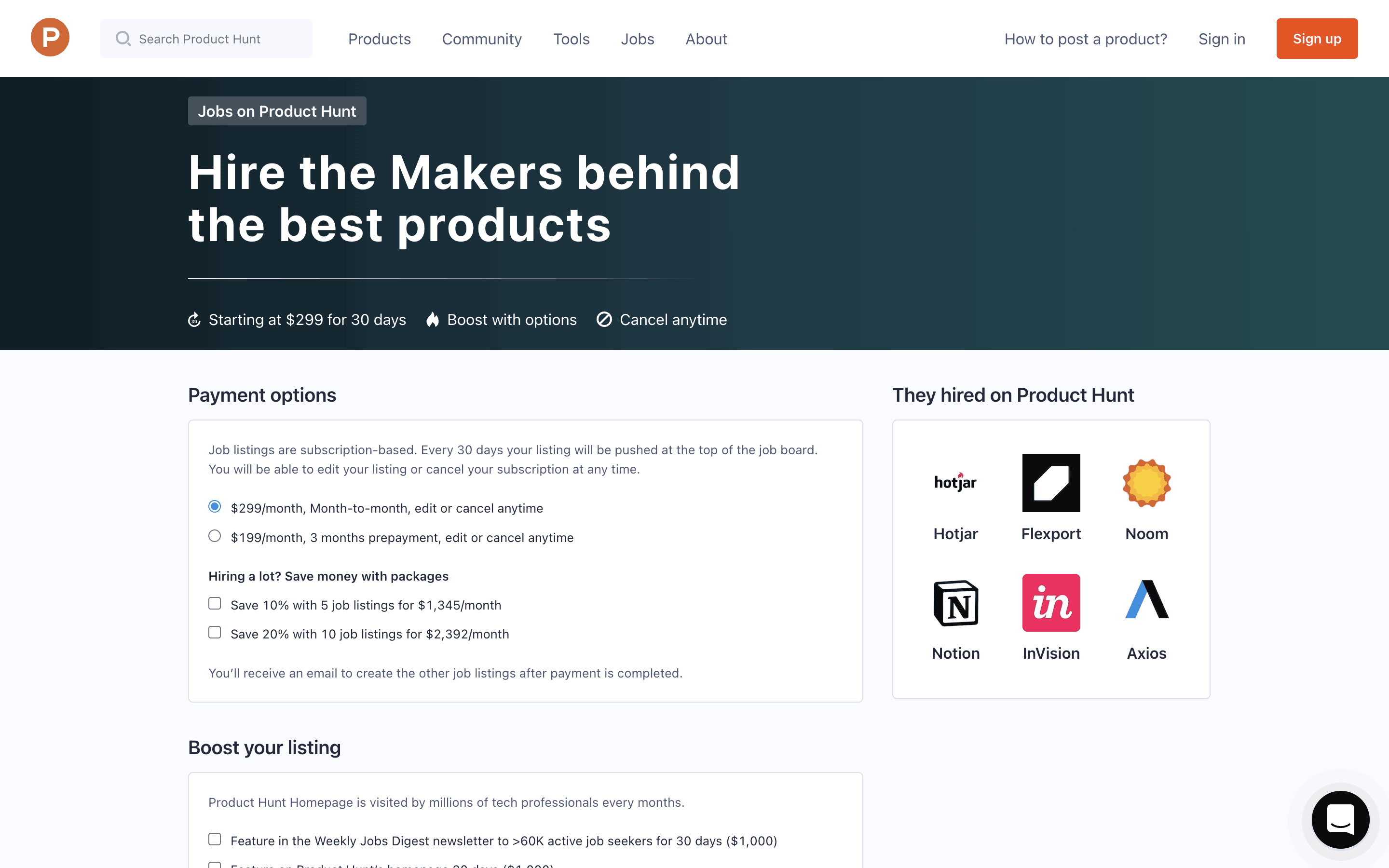 The user flow showcases posting a job, starting from the job listing page, proceeding through the job creation form, and ending with the payment process. The flow concludes with a checkout modal.