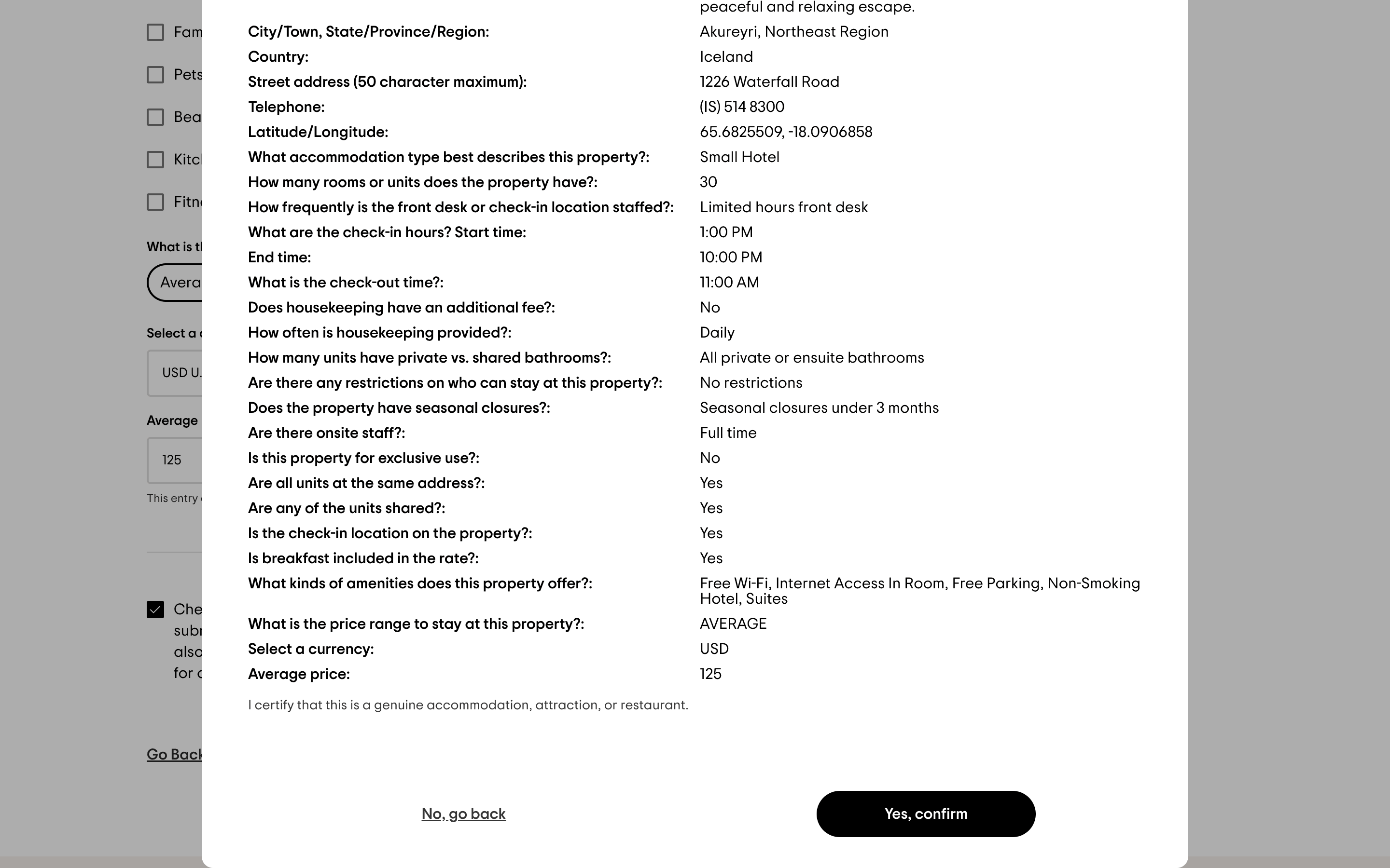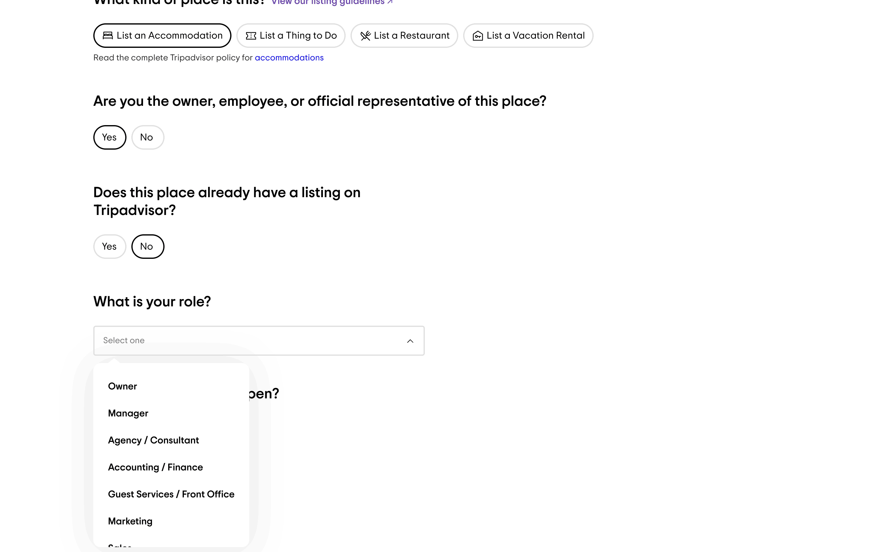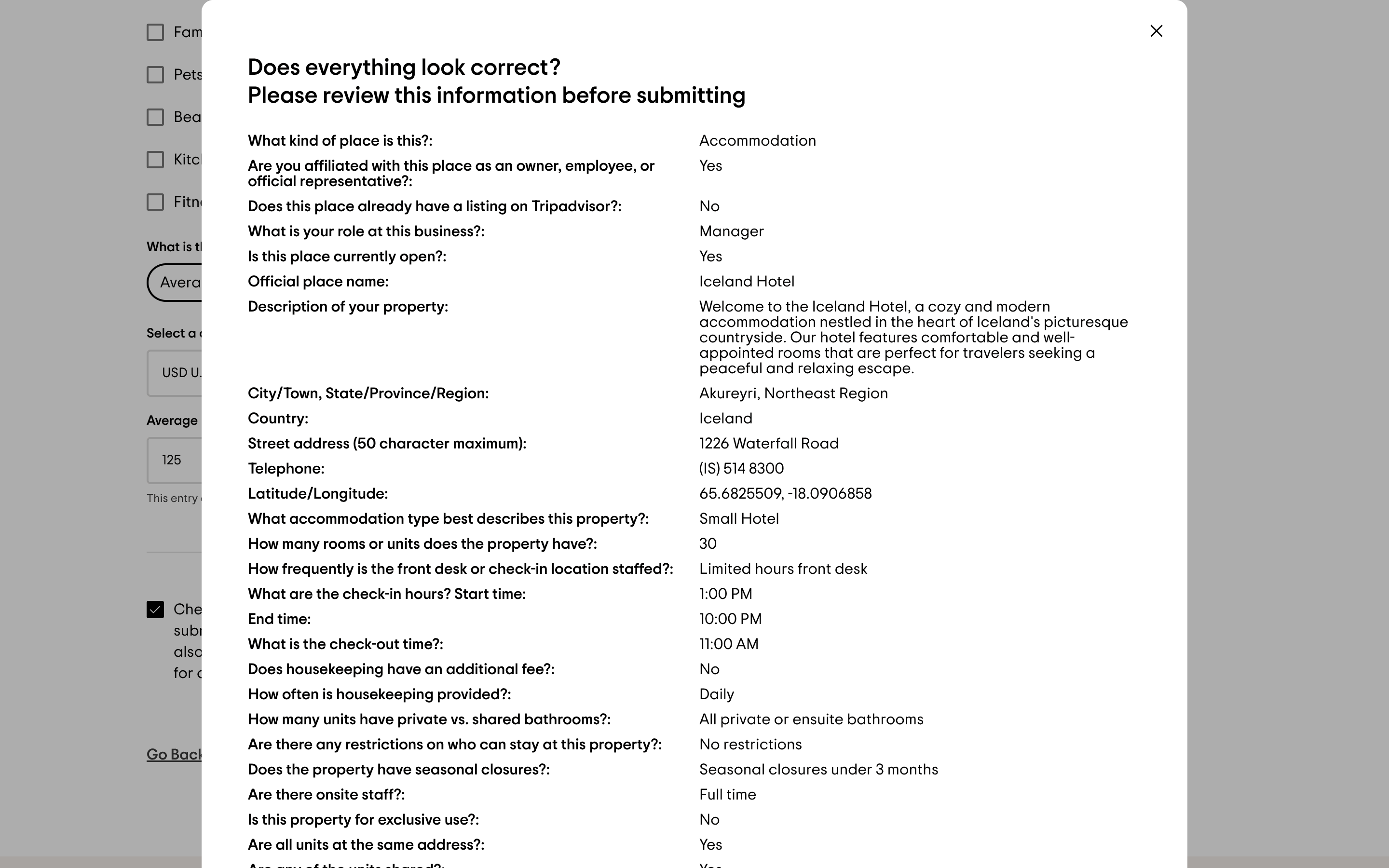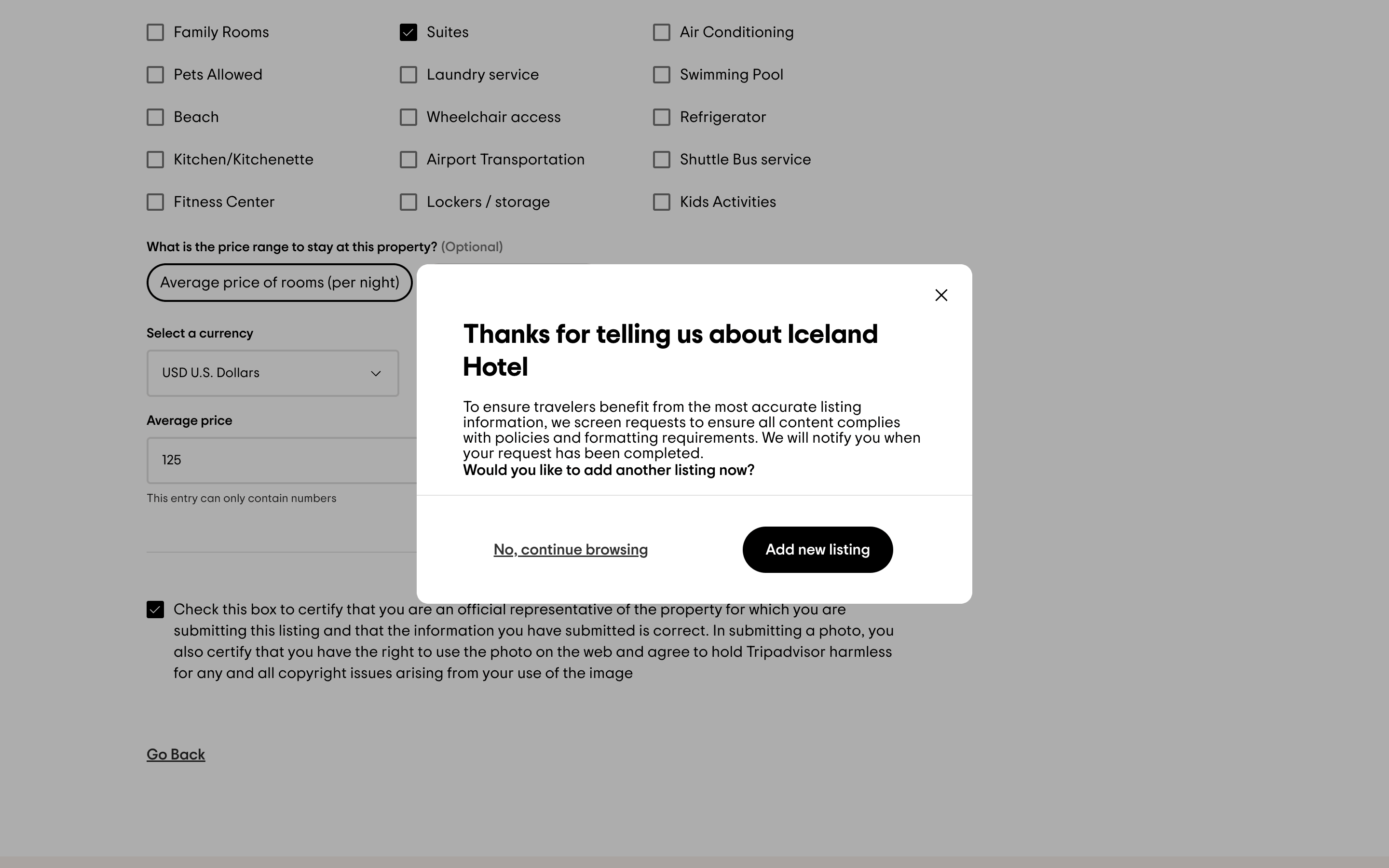 The user adds a new accommodation to TripAdvisor by filling out a detailed form. They then review and submit the information.