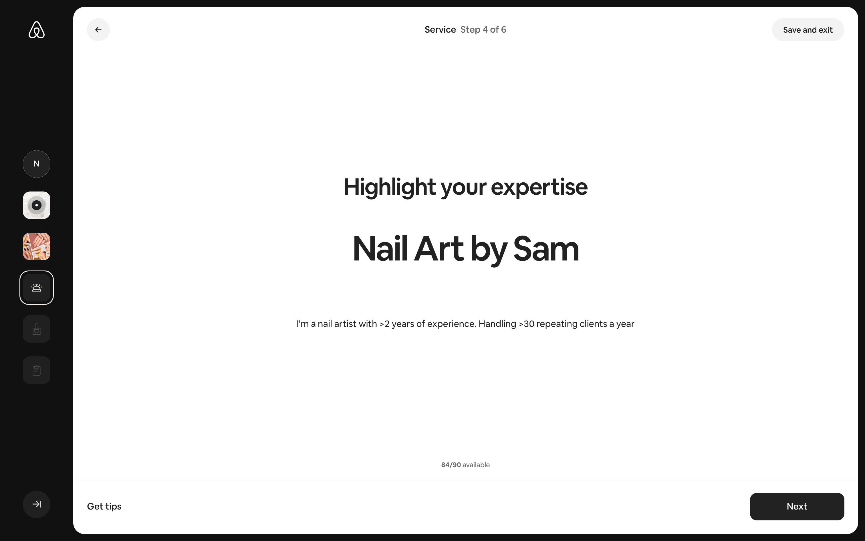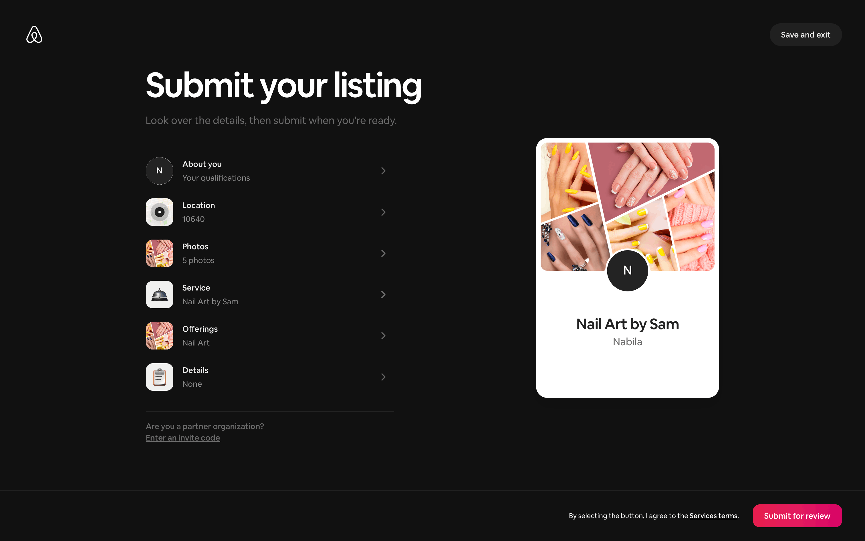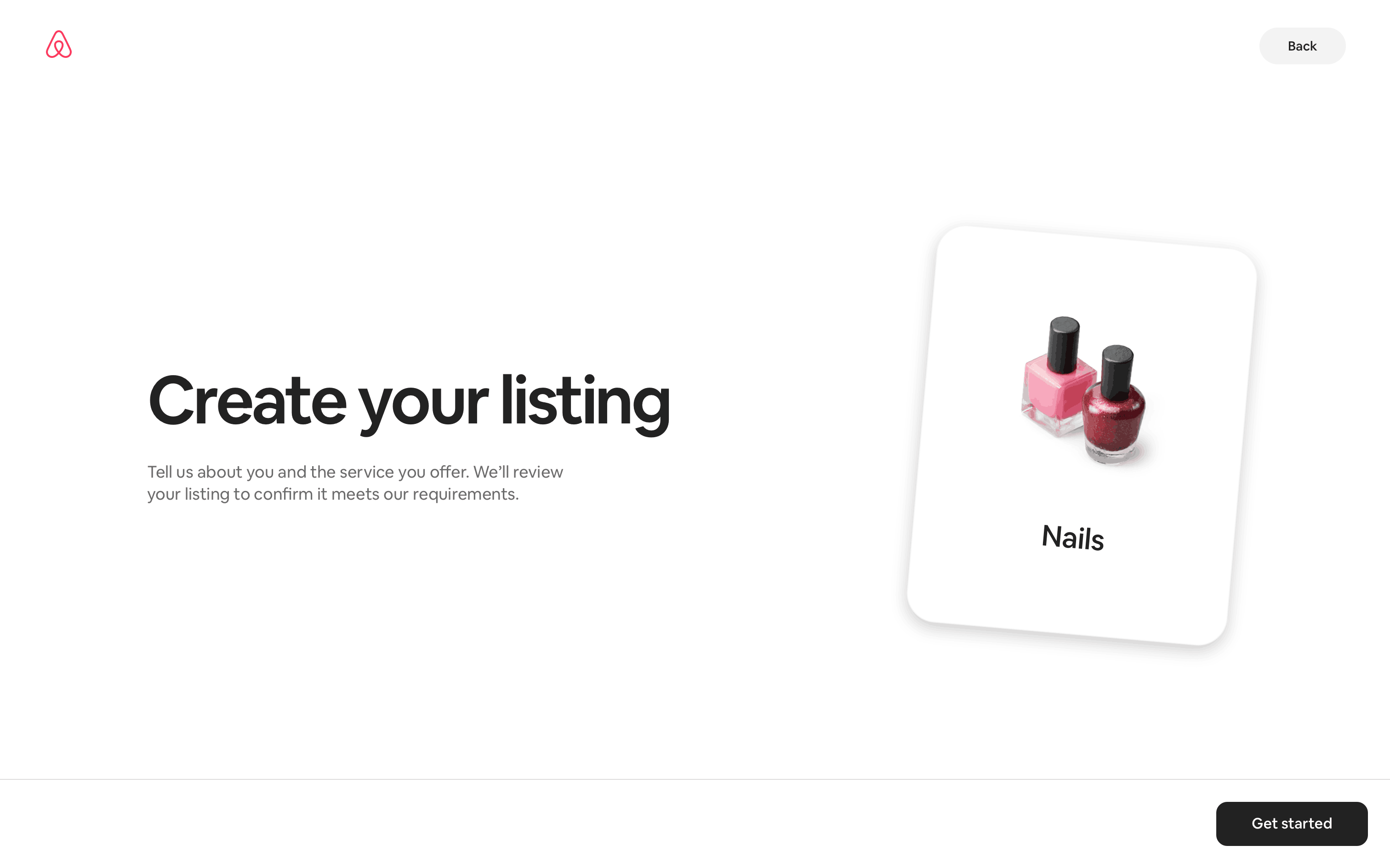 The user creates a new service listing by providing details about their nail service. The listing is then displayed on the listing page.