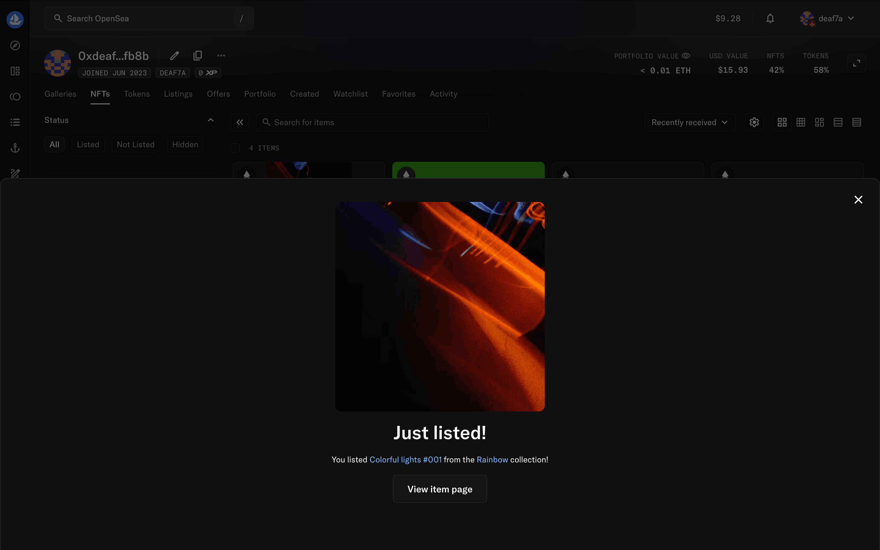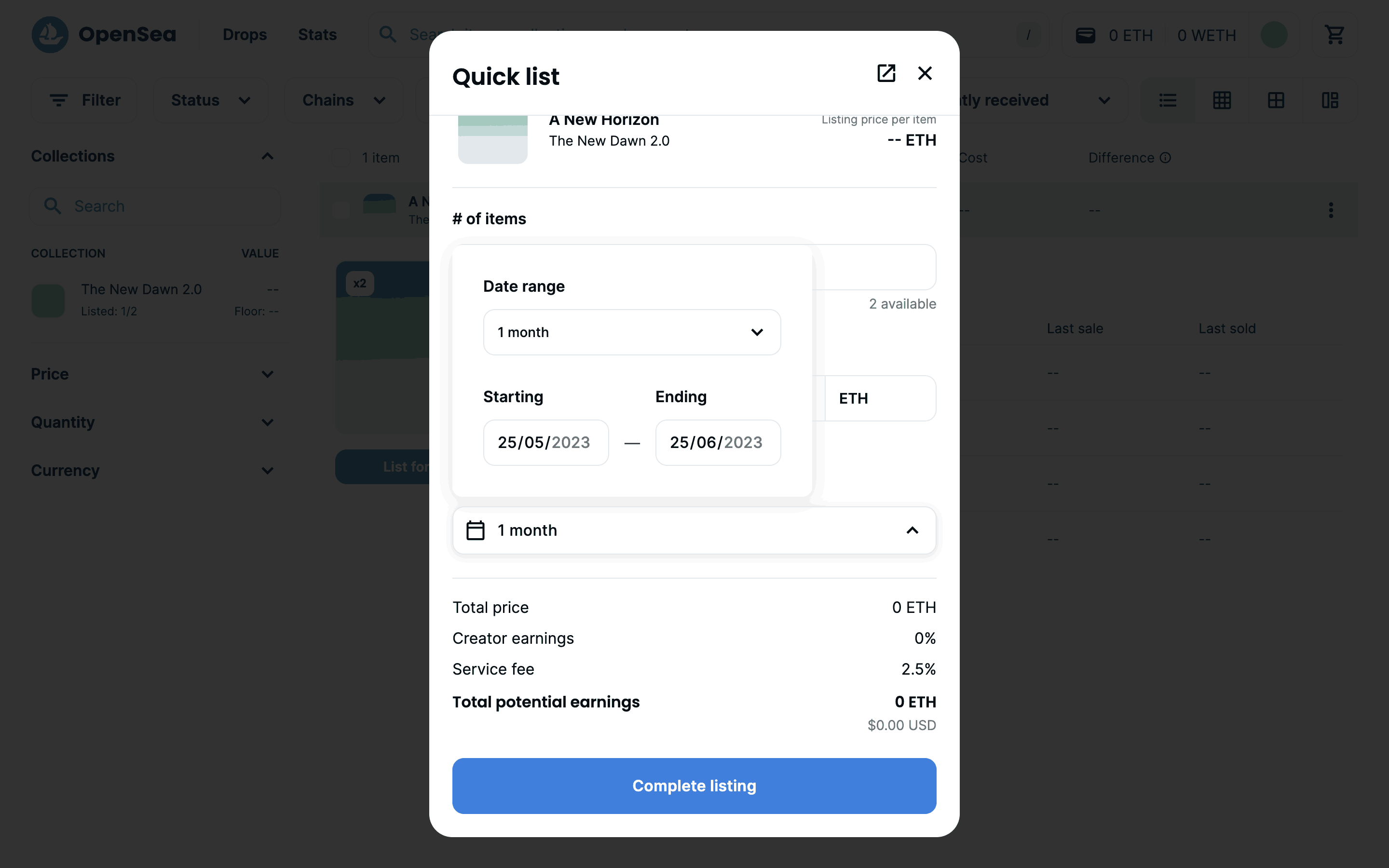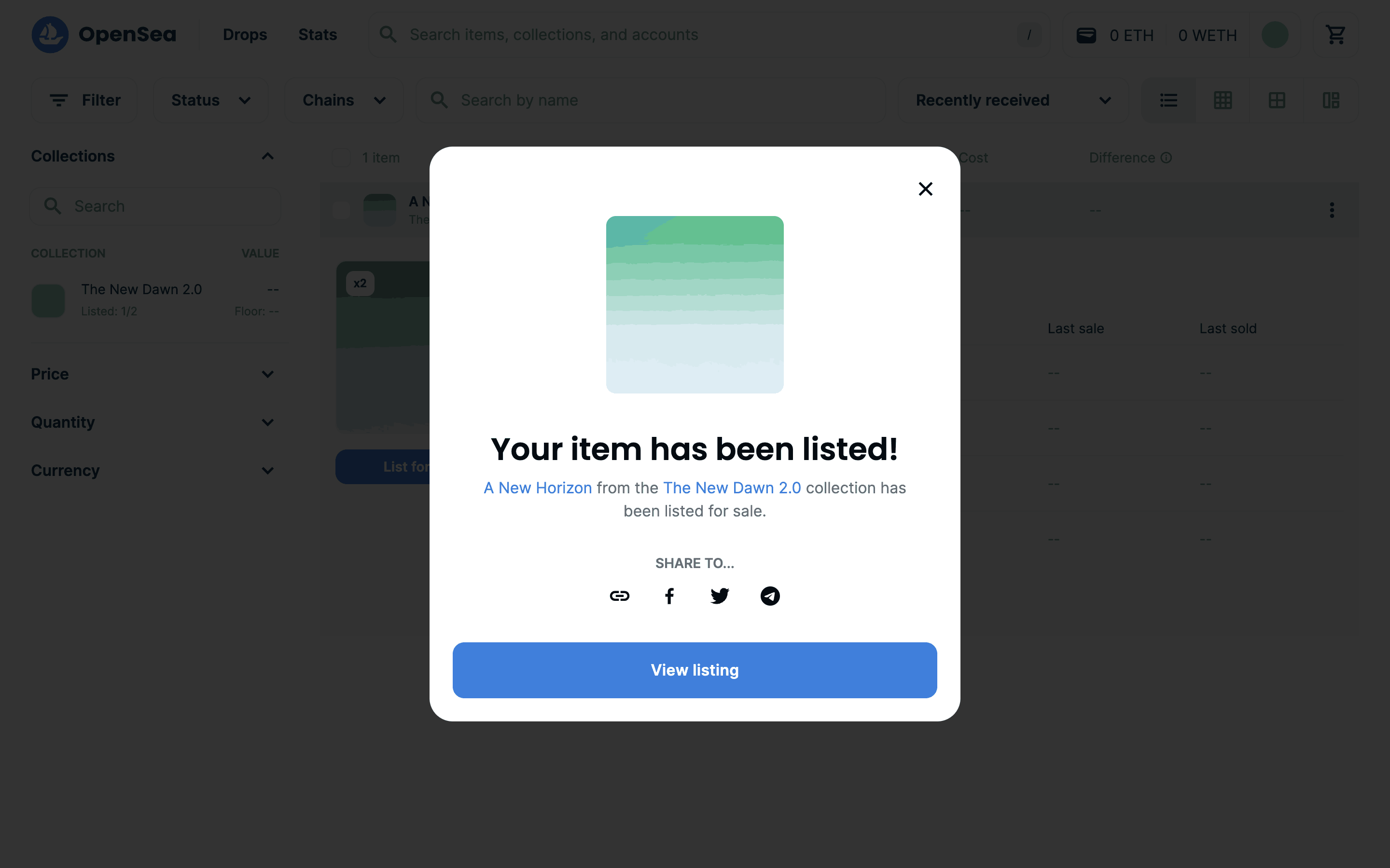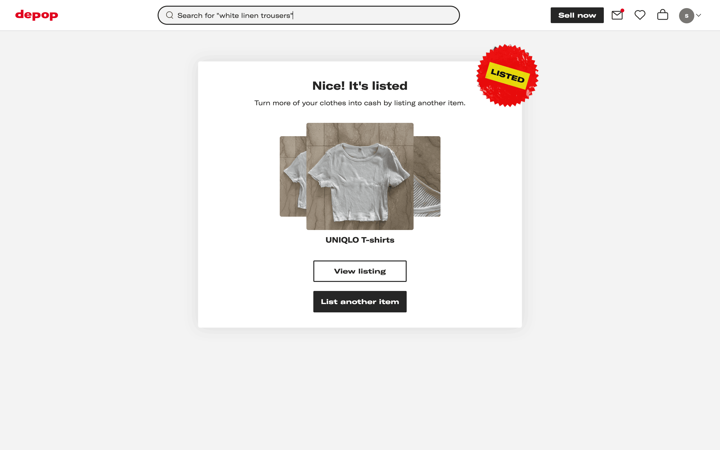 The user lists an item for sale by configuring the listing details and submitting it. A confirmation modal appears upon successful listing.