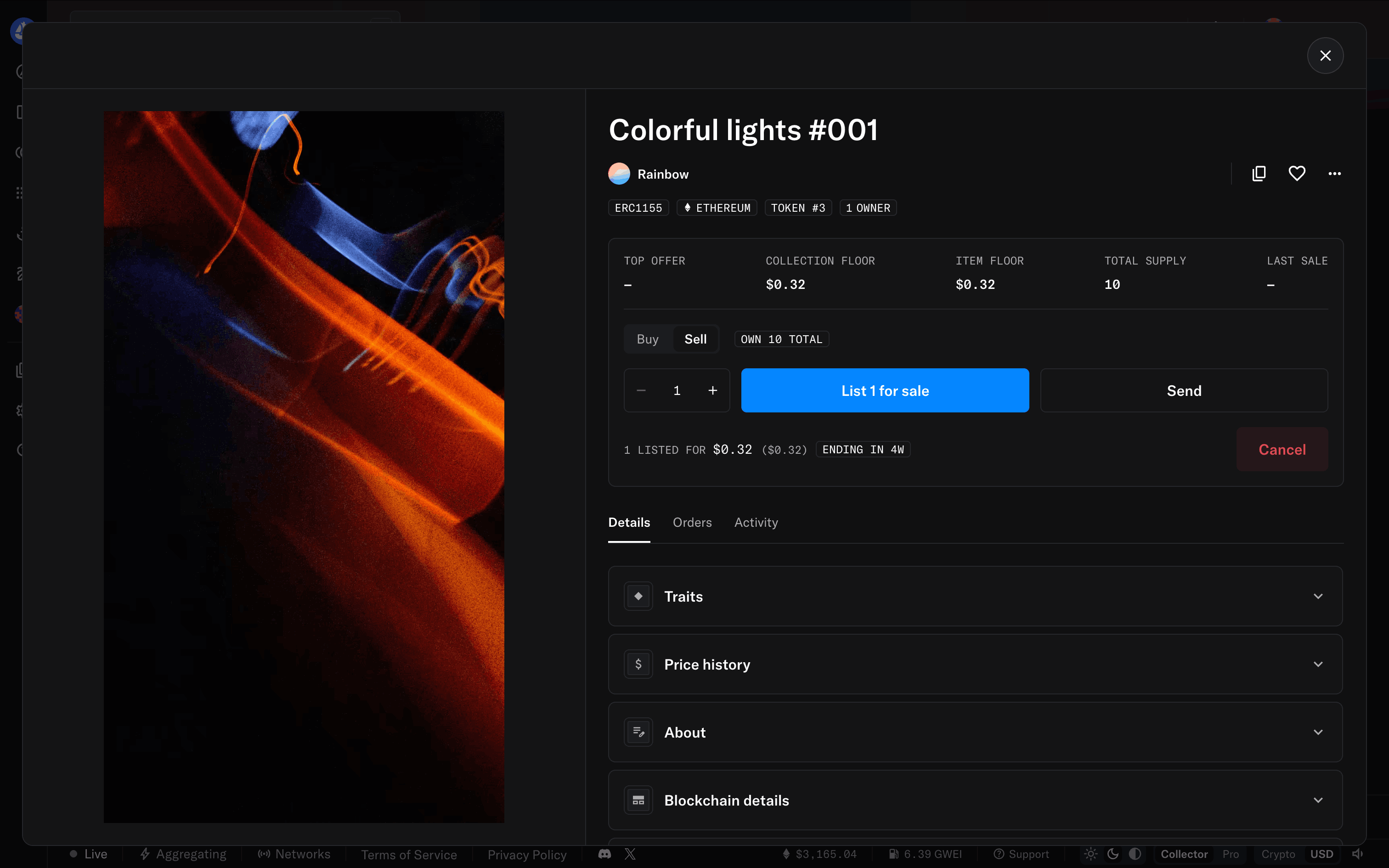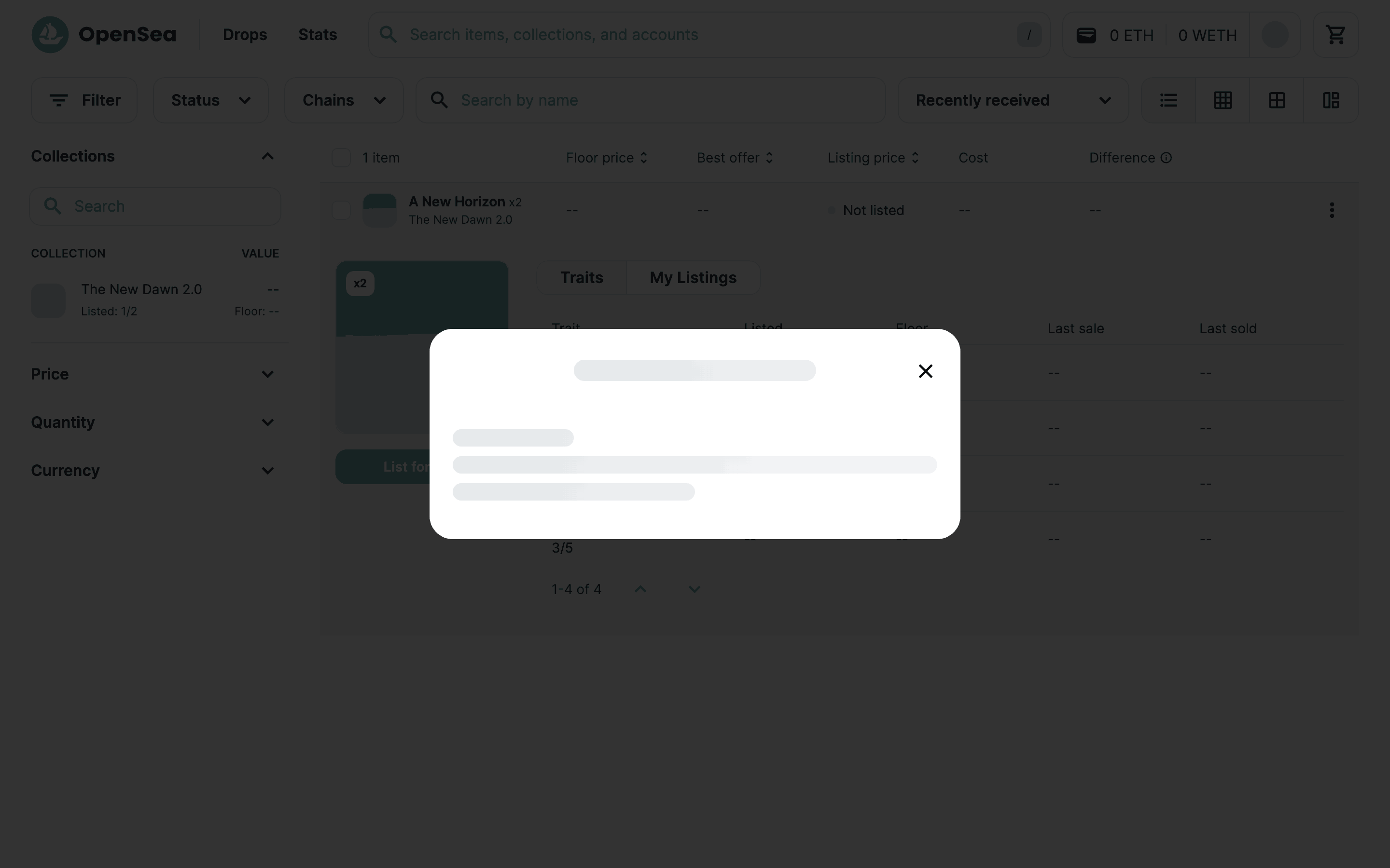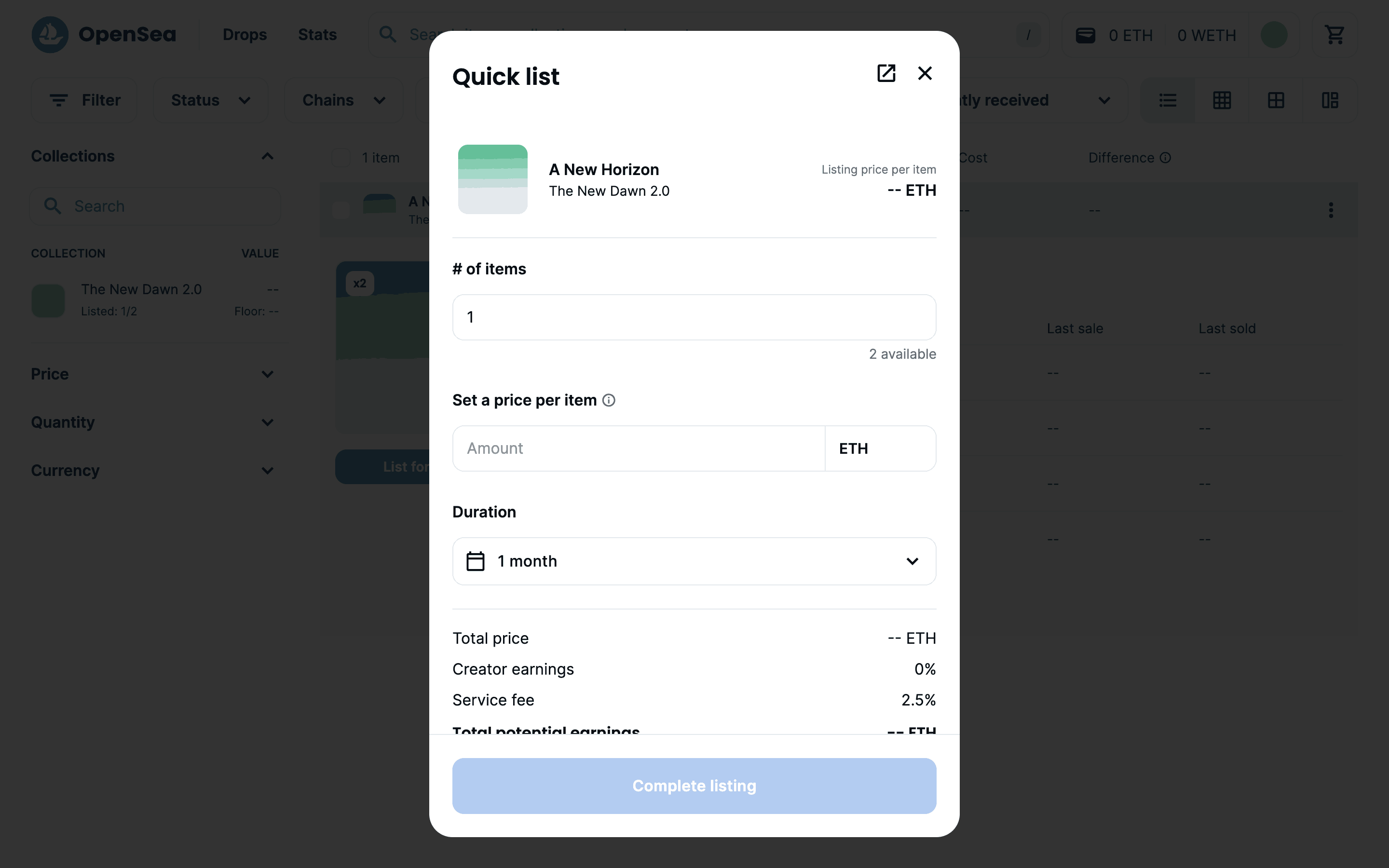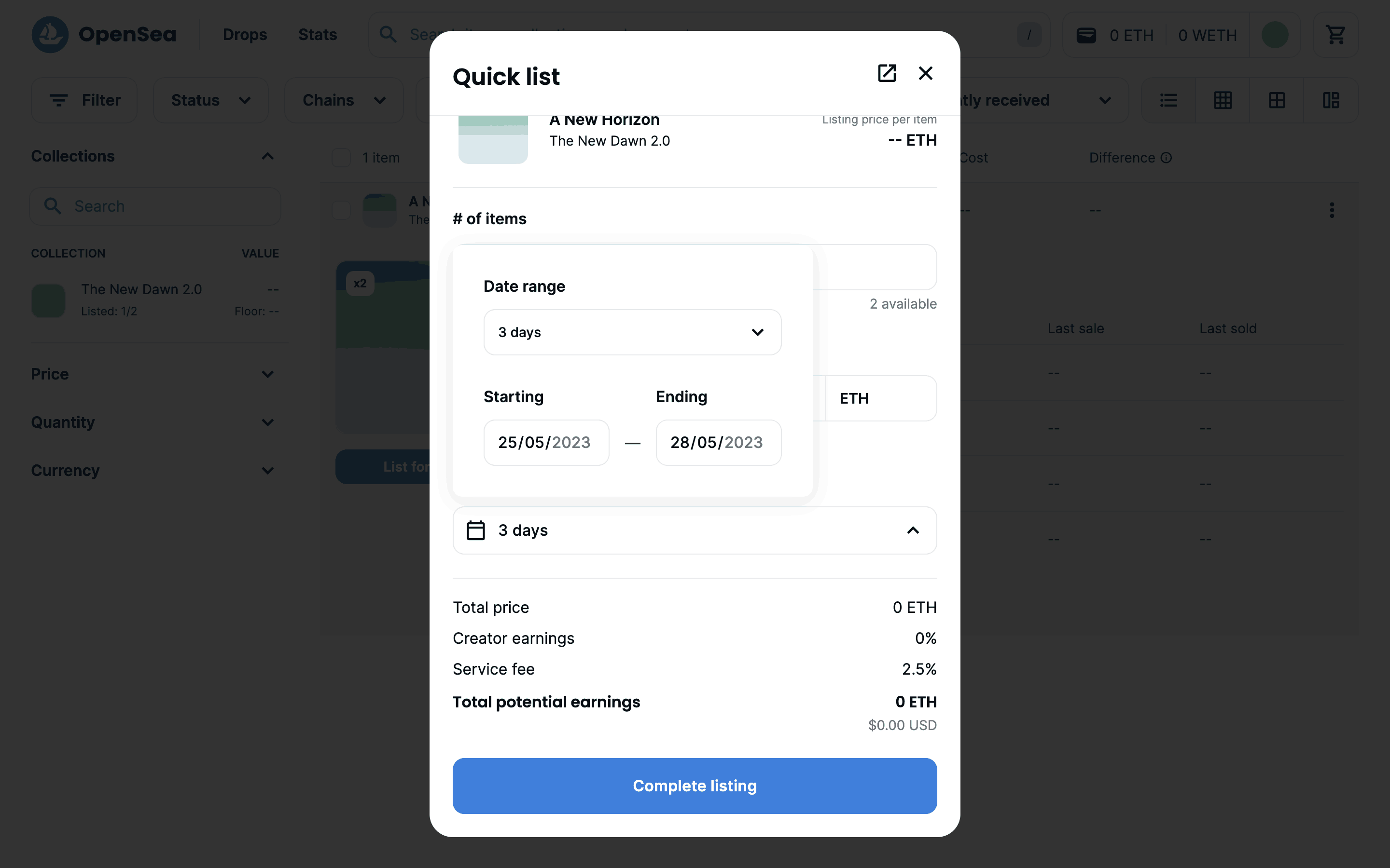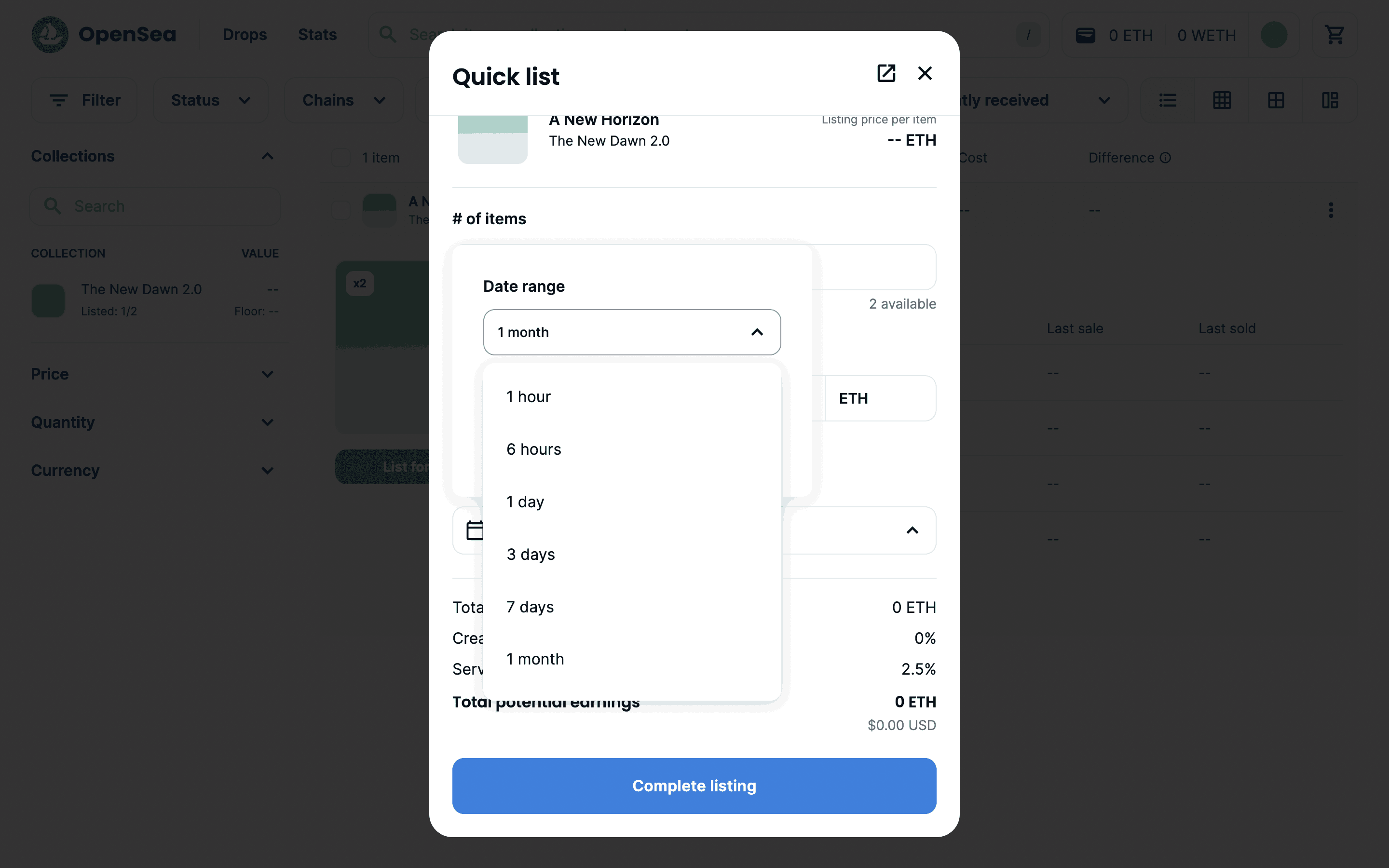 The user lists an item for sale by configuring the listing details and submitting it. A confirmation modal appears upon successful listing.