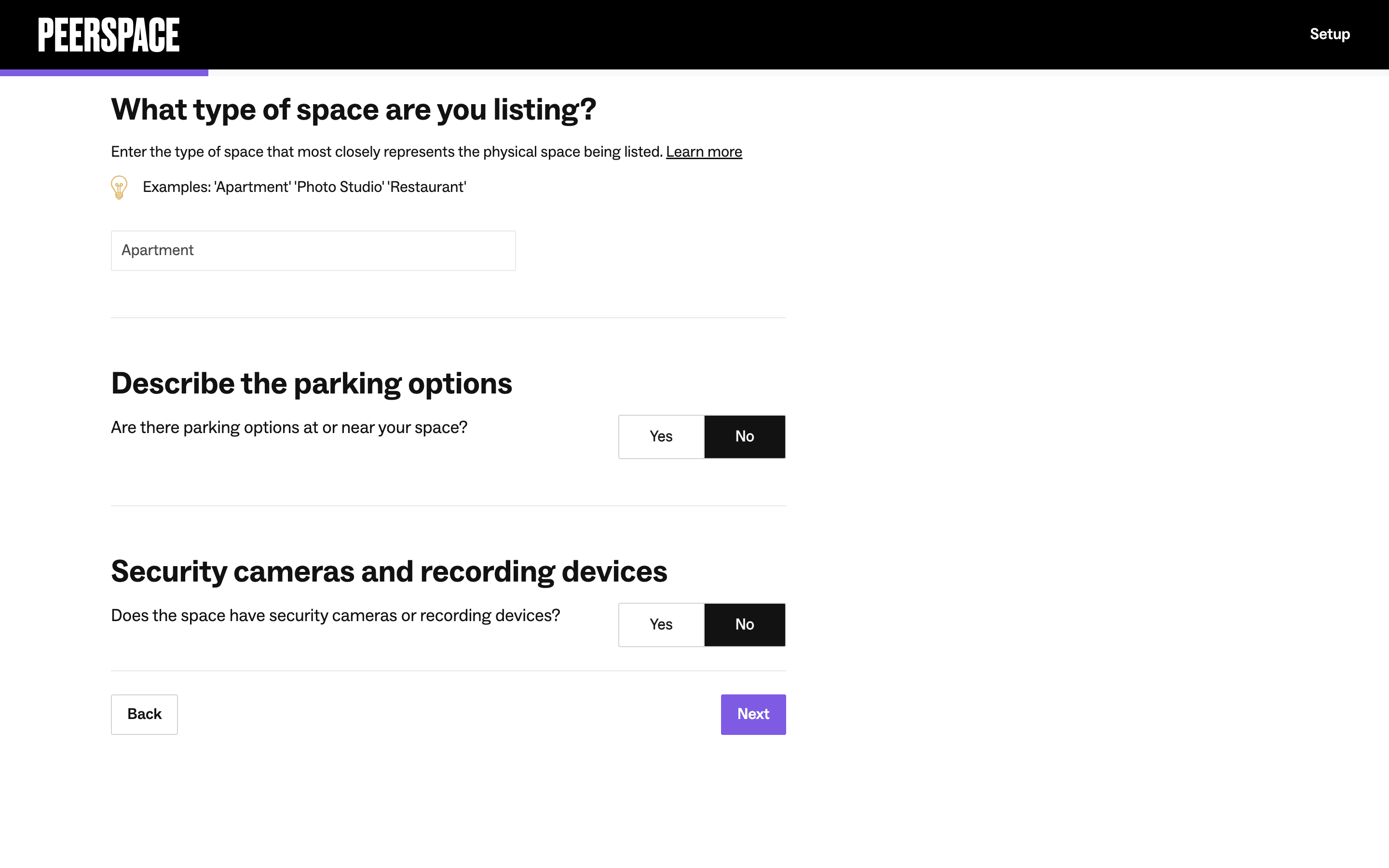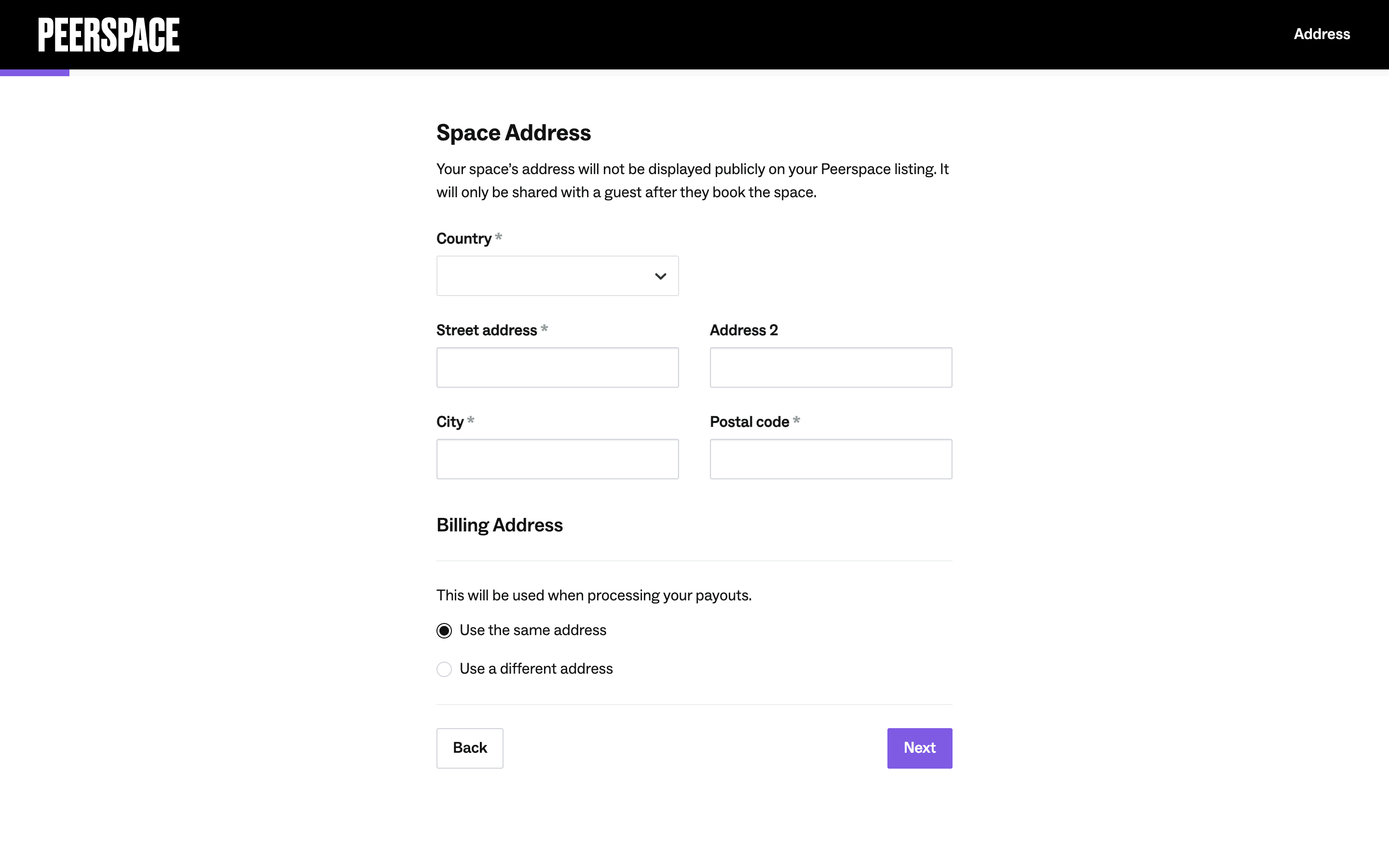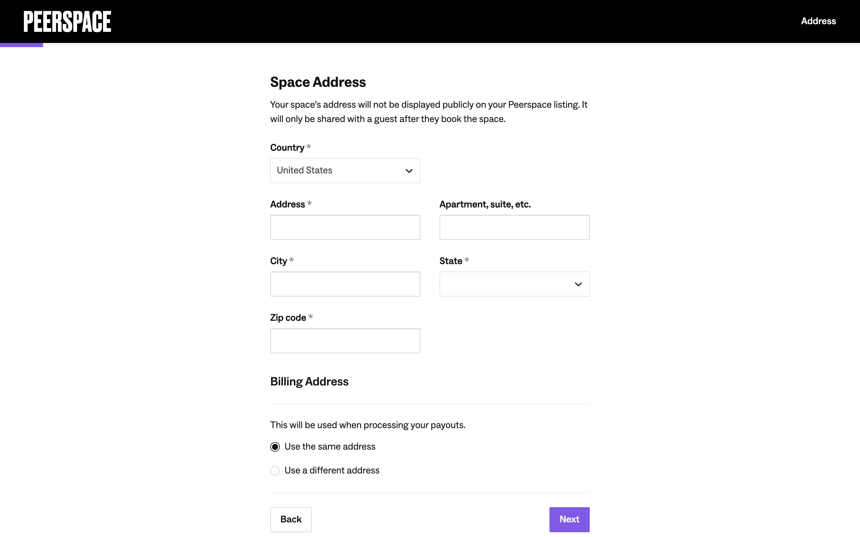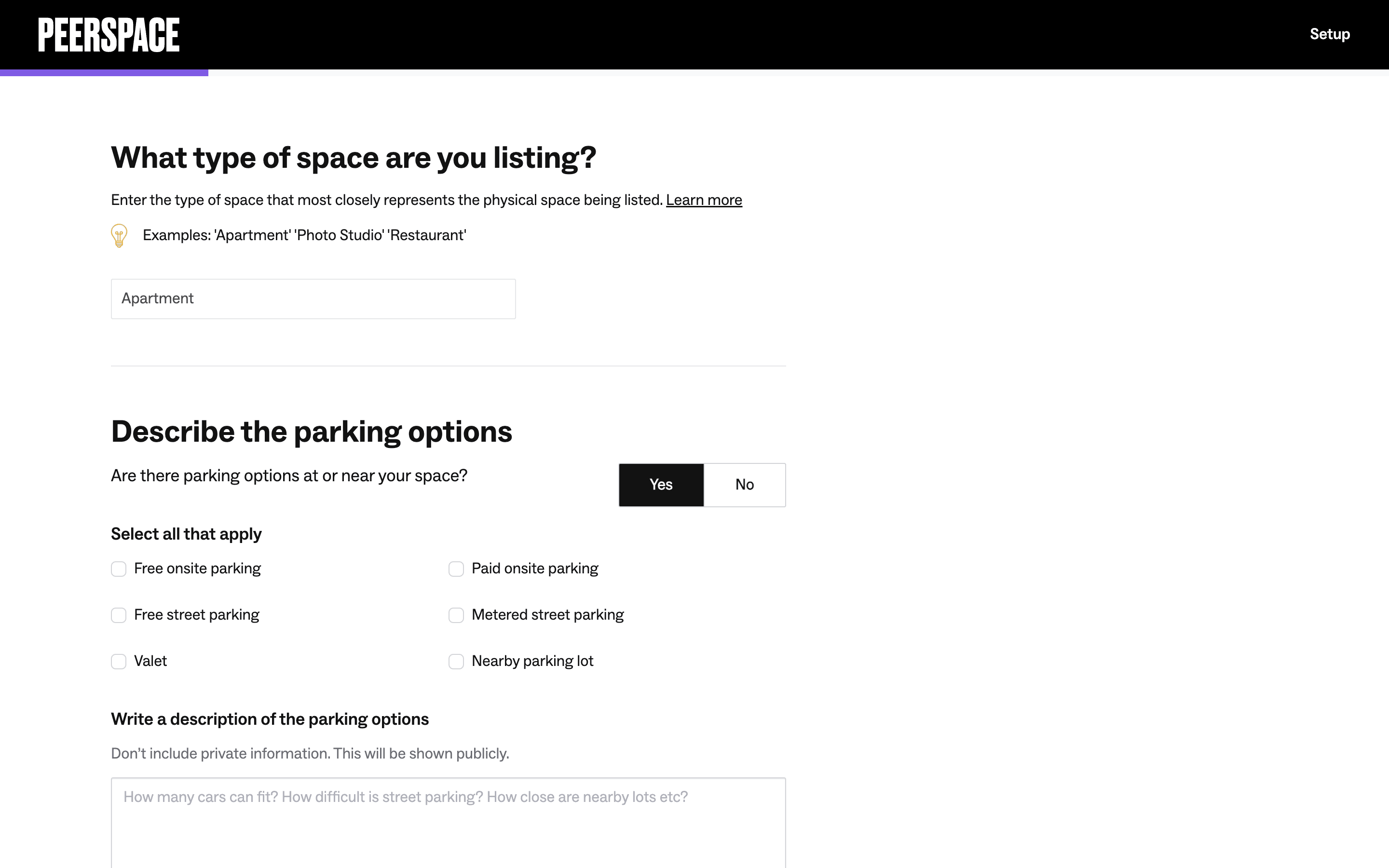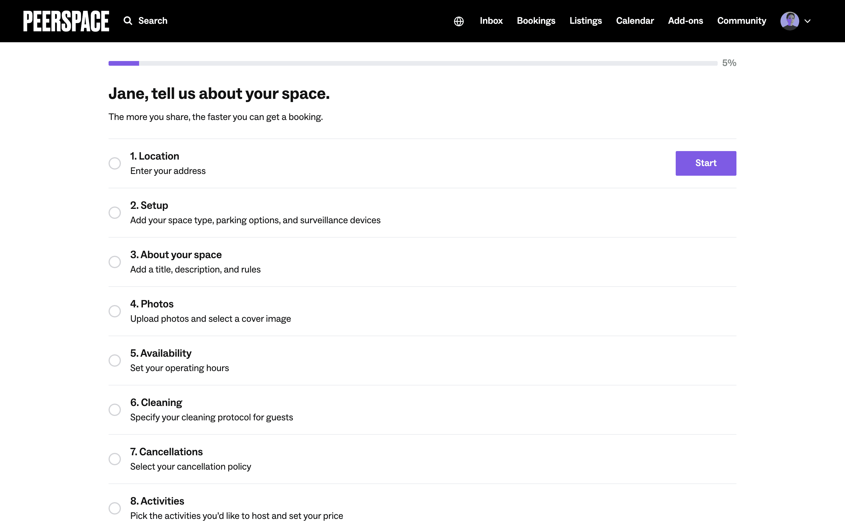 Users list their space by completing a multi-step form providing address, setup details, and a title/description. The process is guided by progress indicators and clear calls to action.
