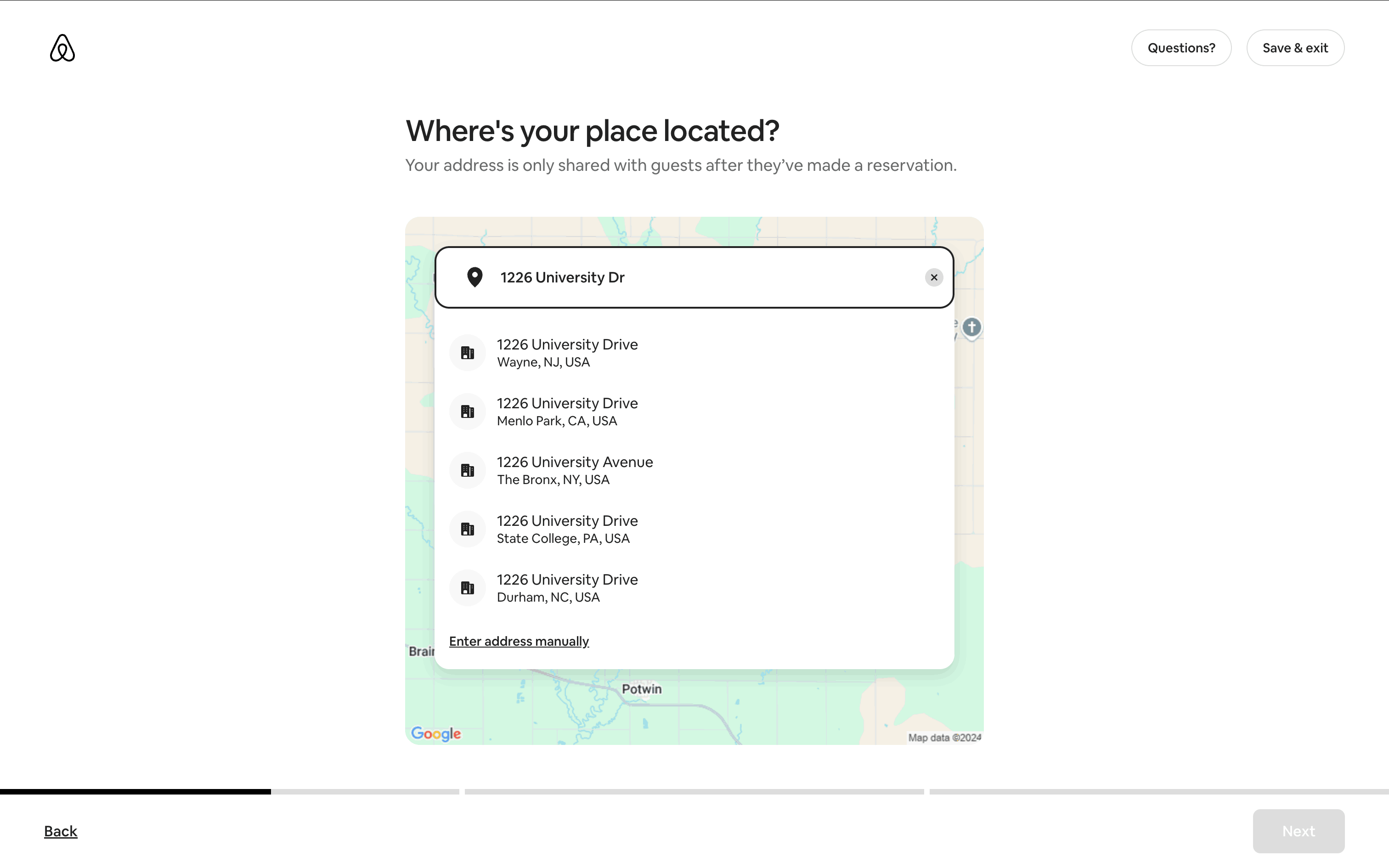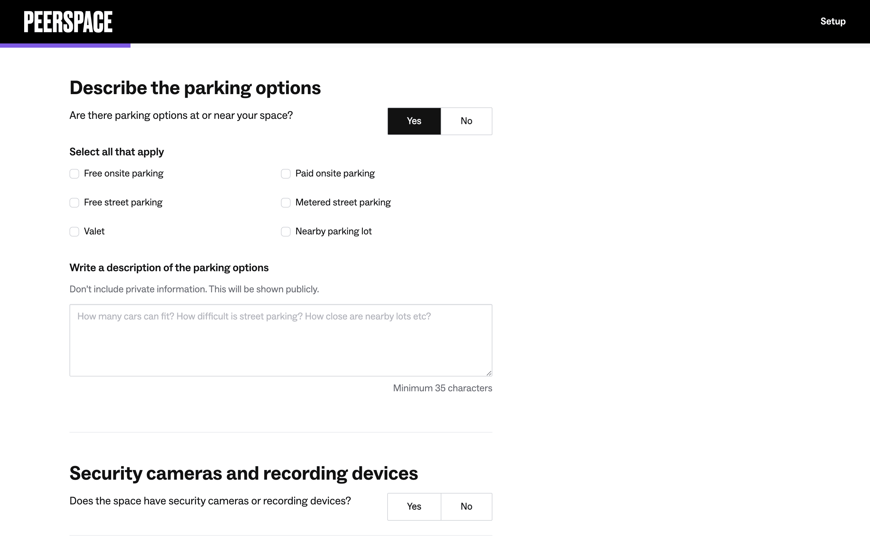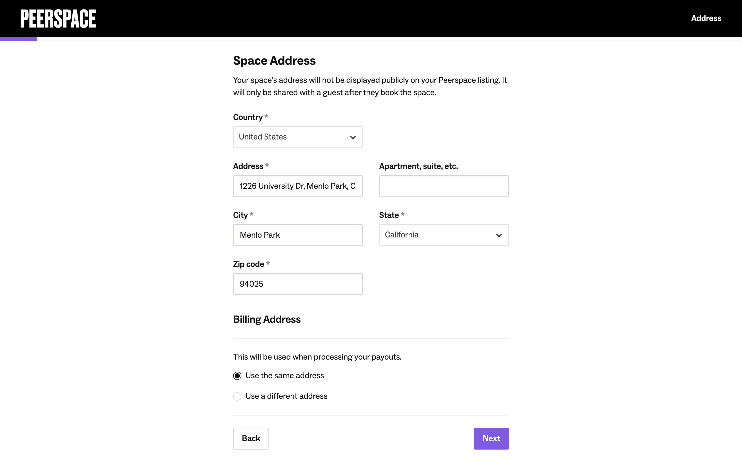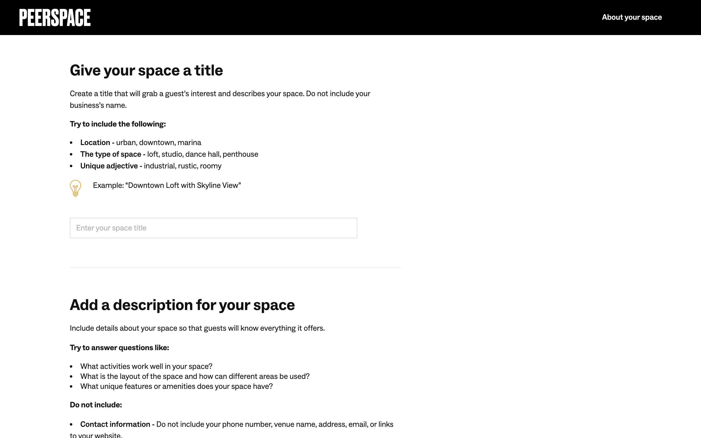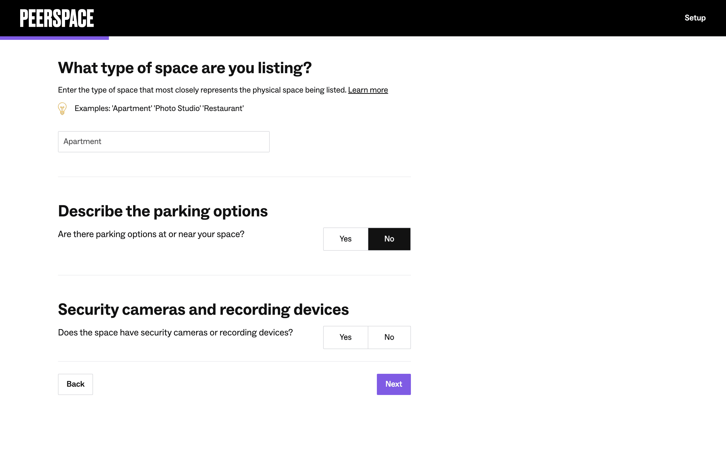 Users list their space by completing a multi-step form providing address, setup details, and a title/description. The process is guided by progress indicators and clear calls to action.