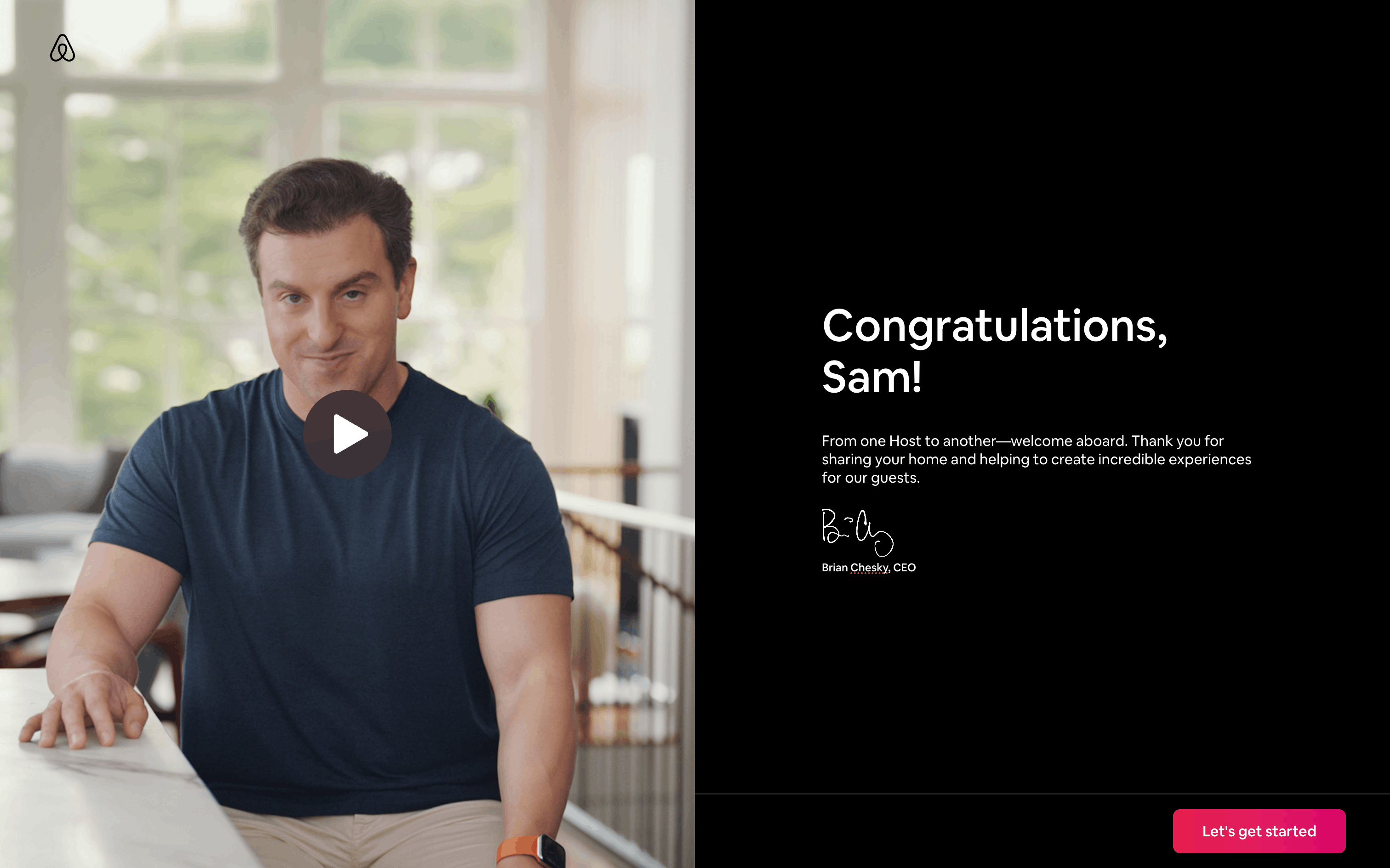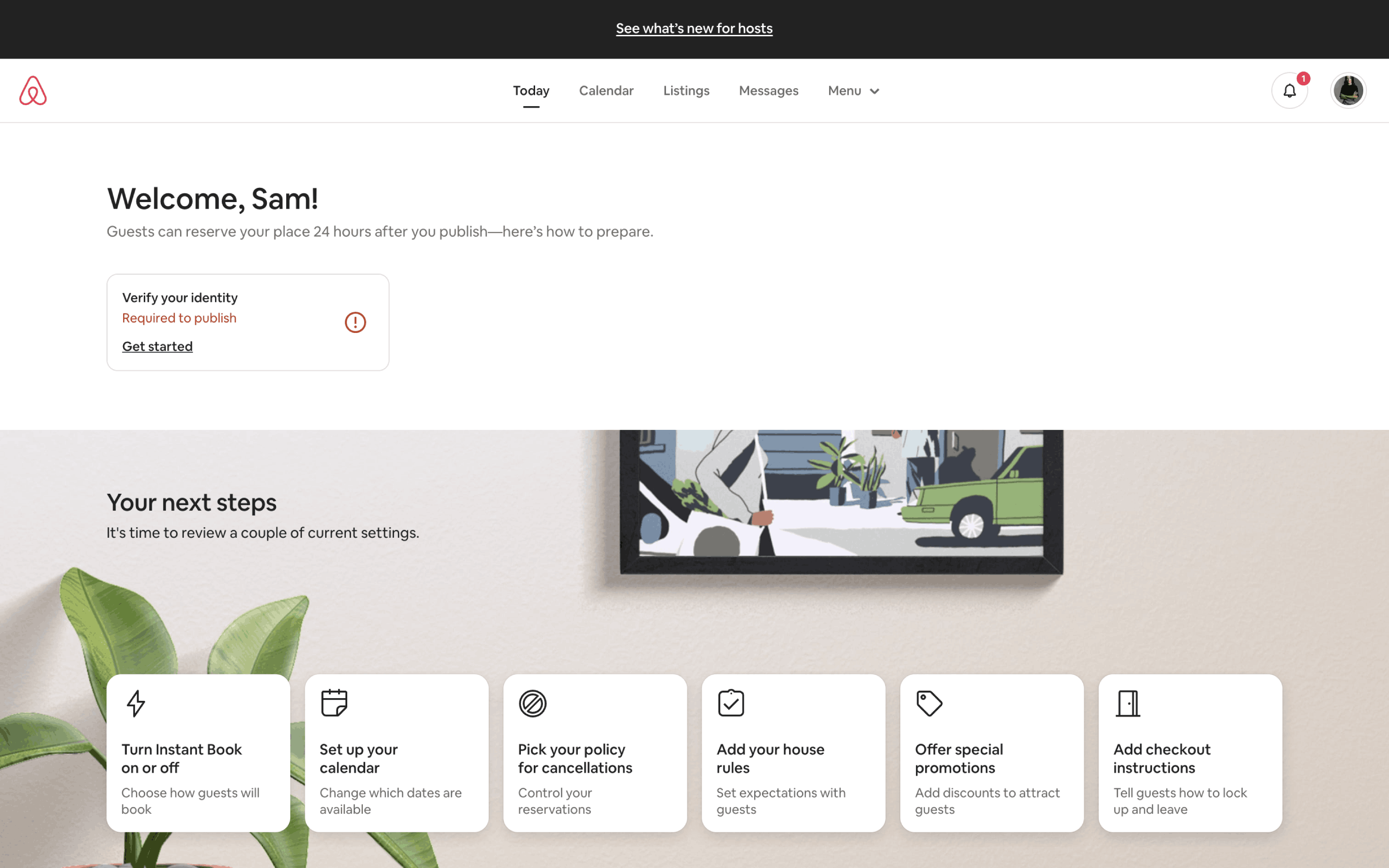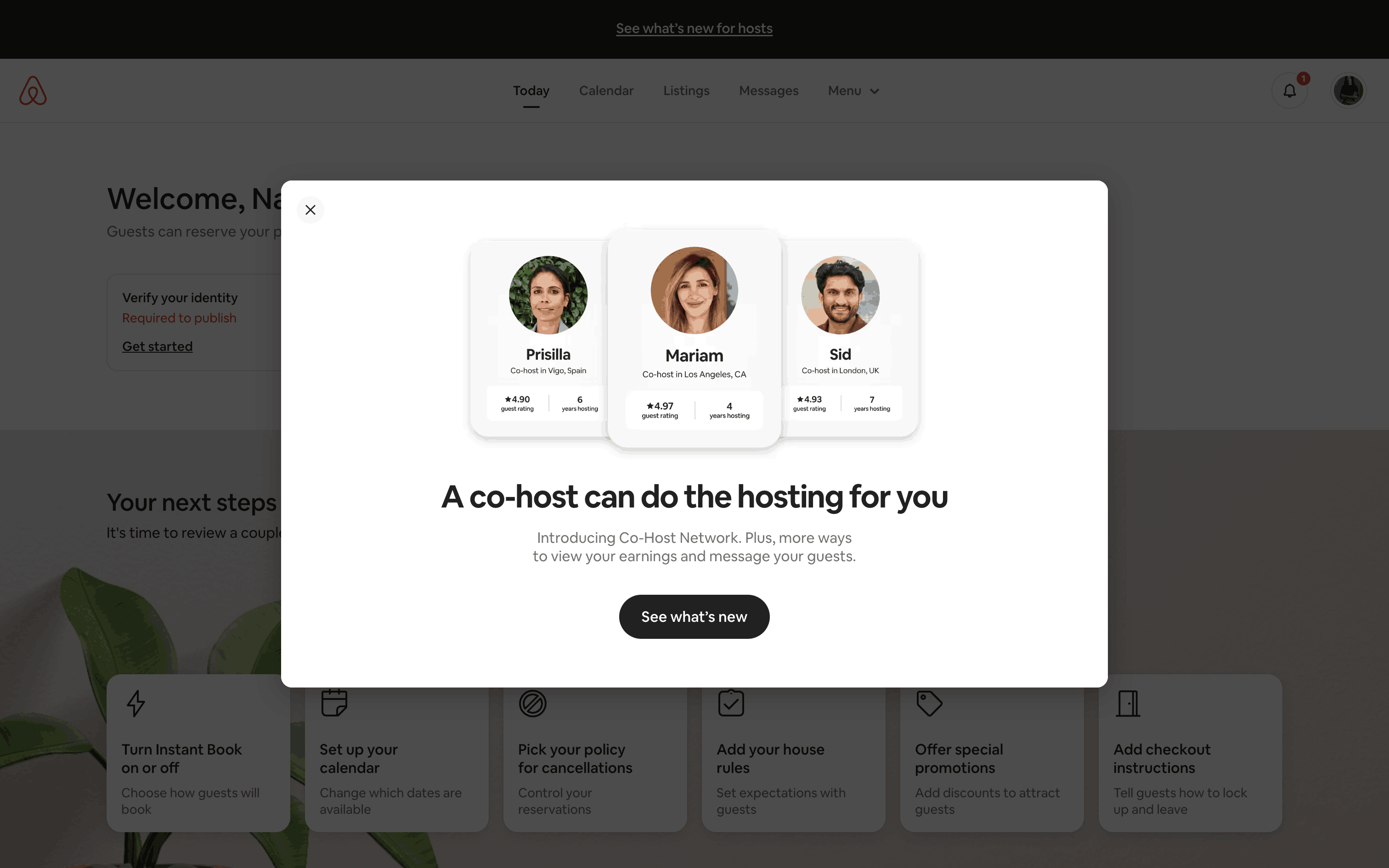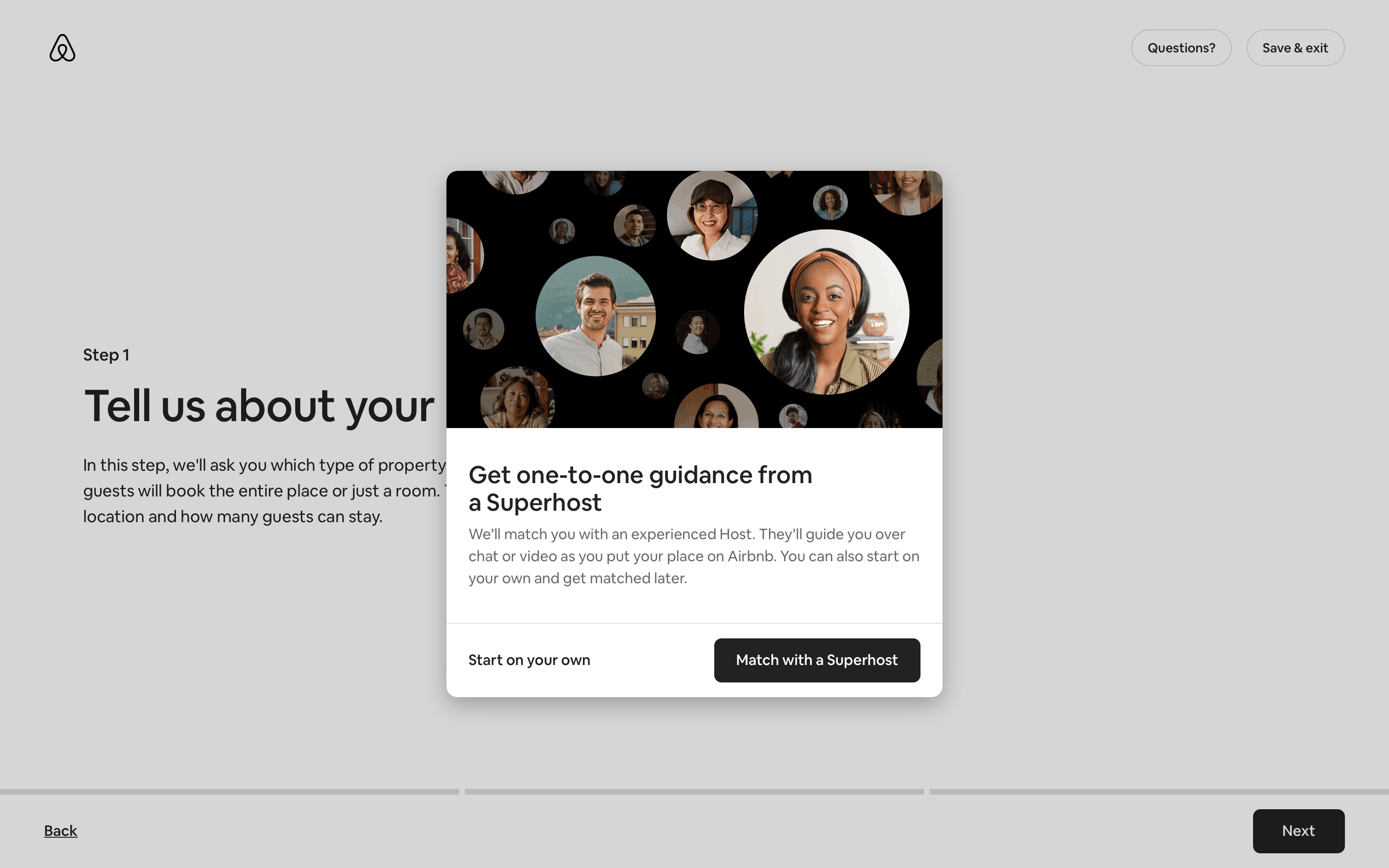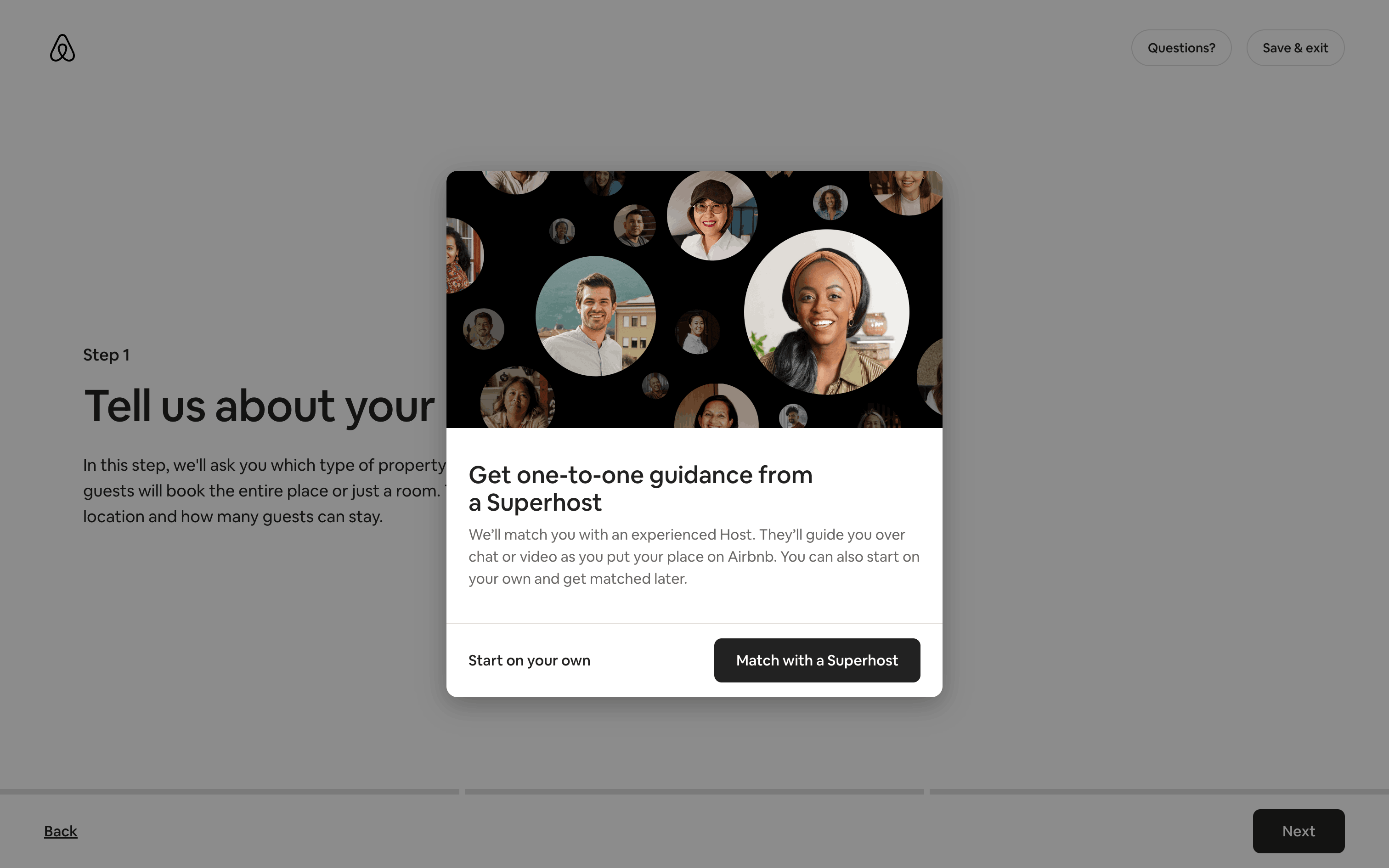 The user flow demonstrates listing a property on Airbnb. It covers property details, photos, and publishing, with Superhost guidance and co-hosting options.