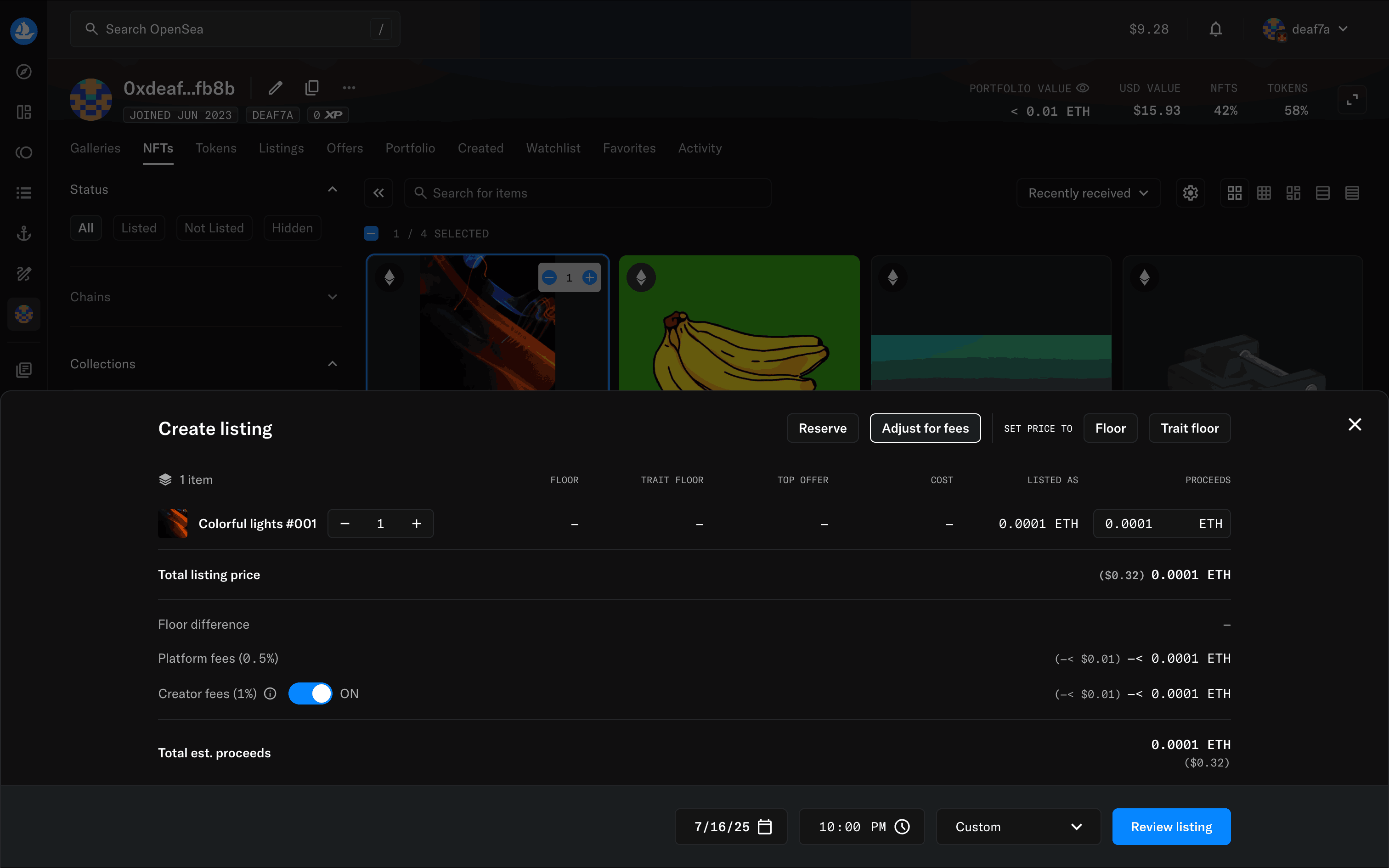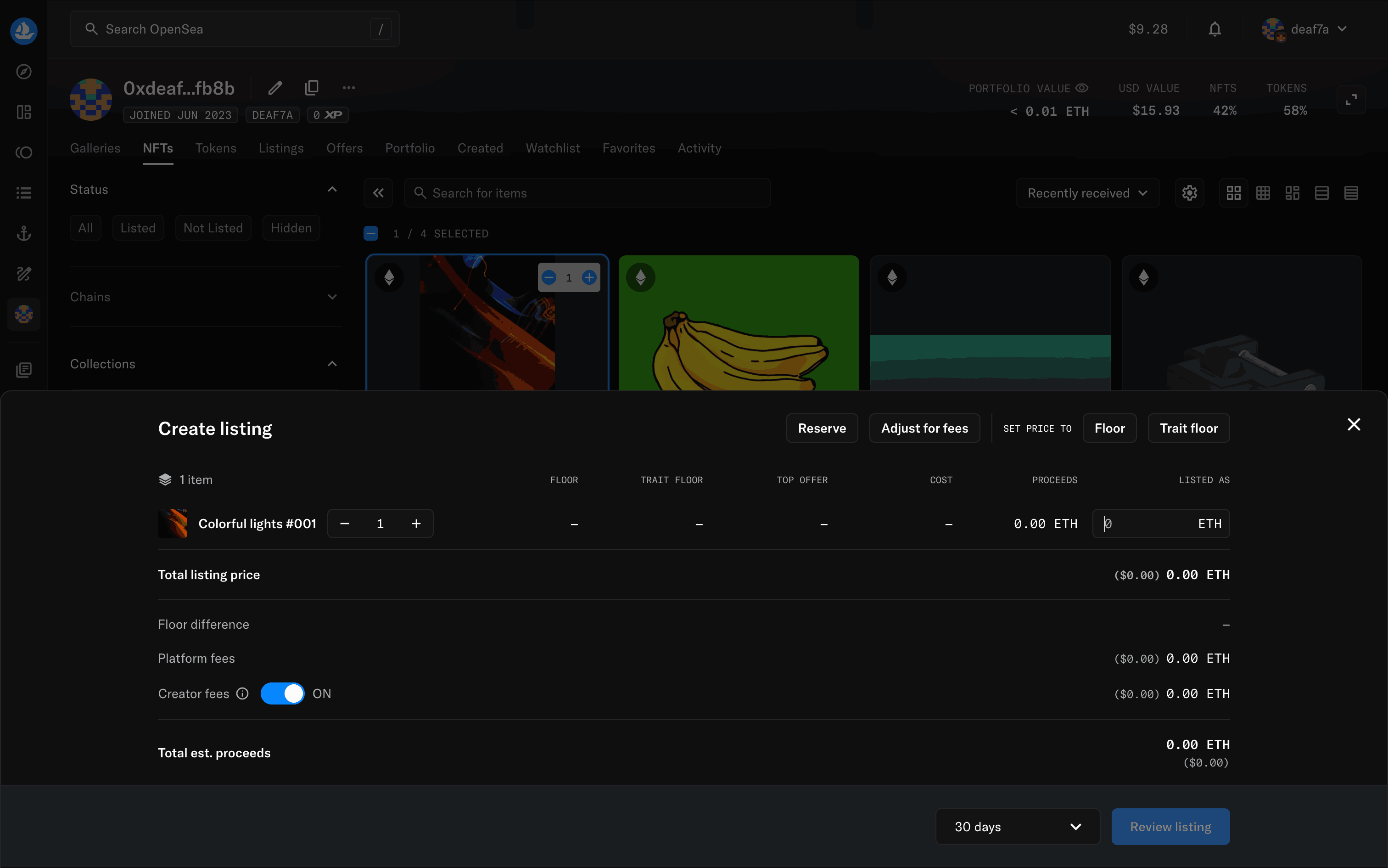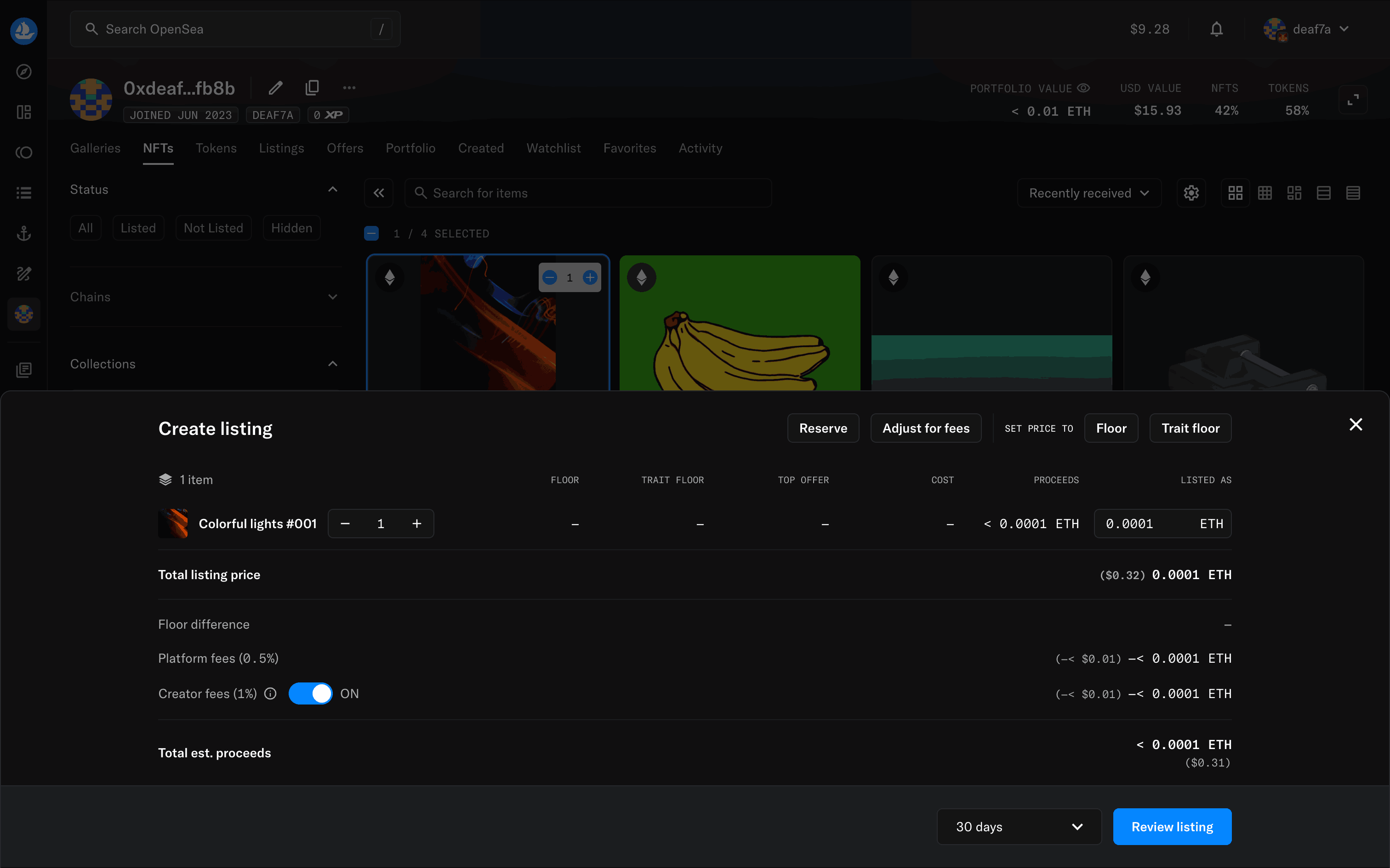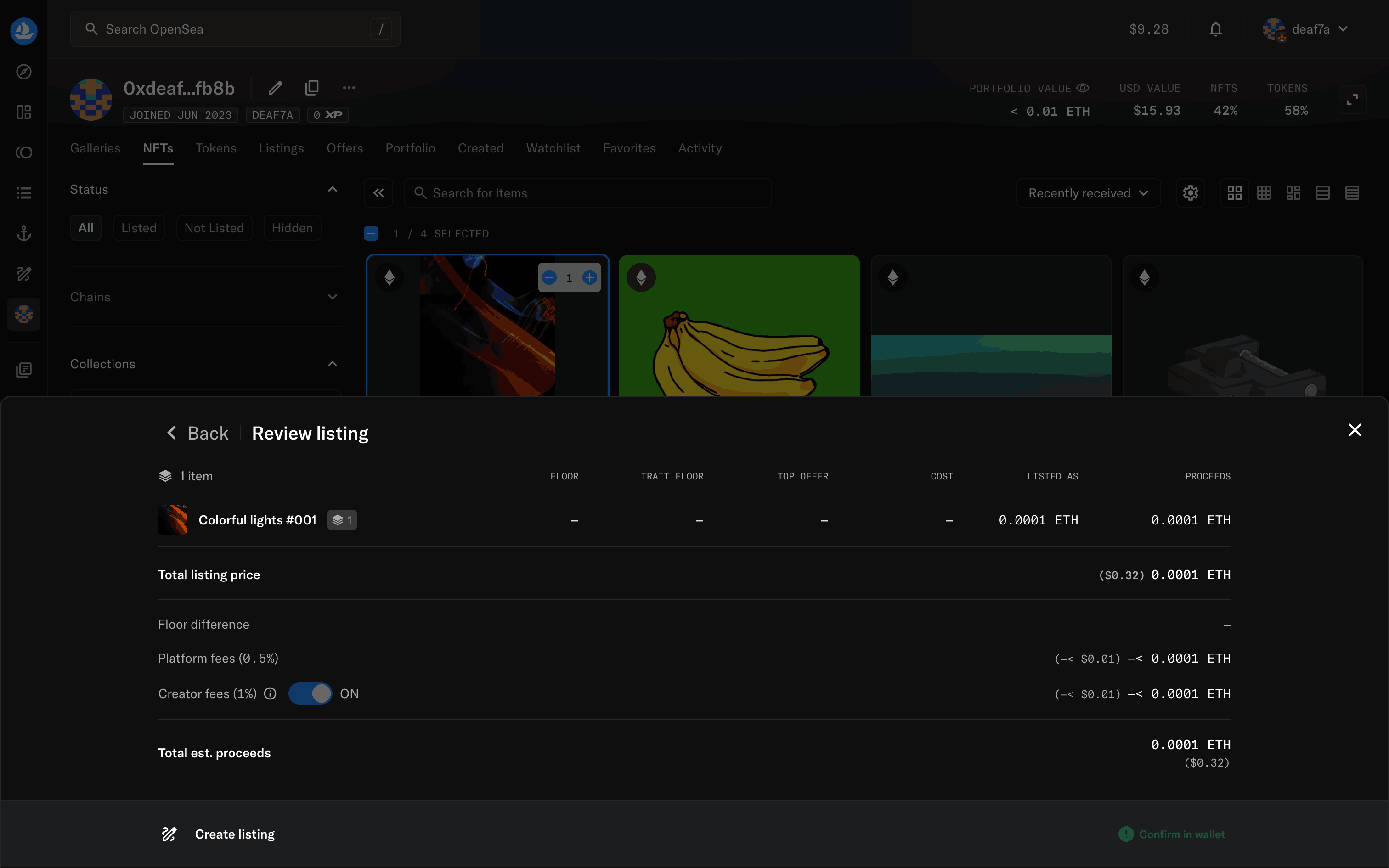 The user flow shows how to list an NFT for sale. It involves selecting an NFT, setting the price, reviewing the details, and confirming the listing.