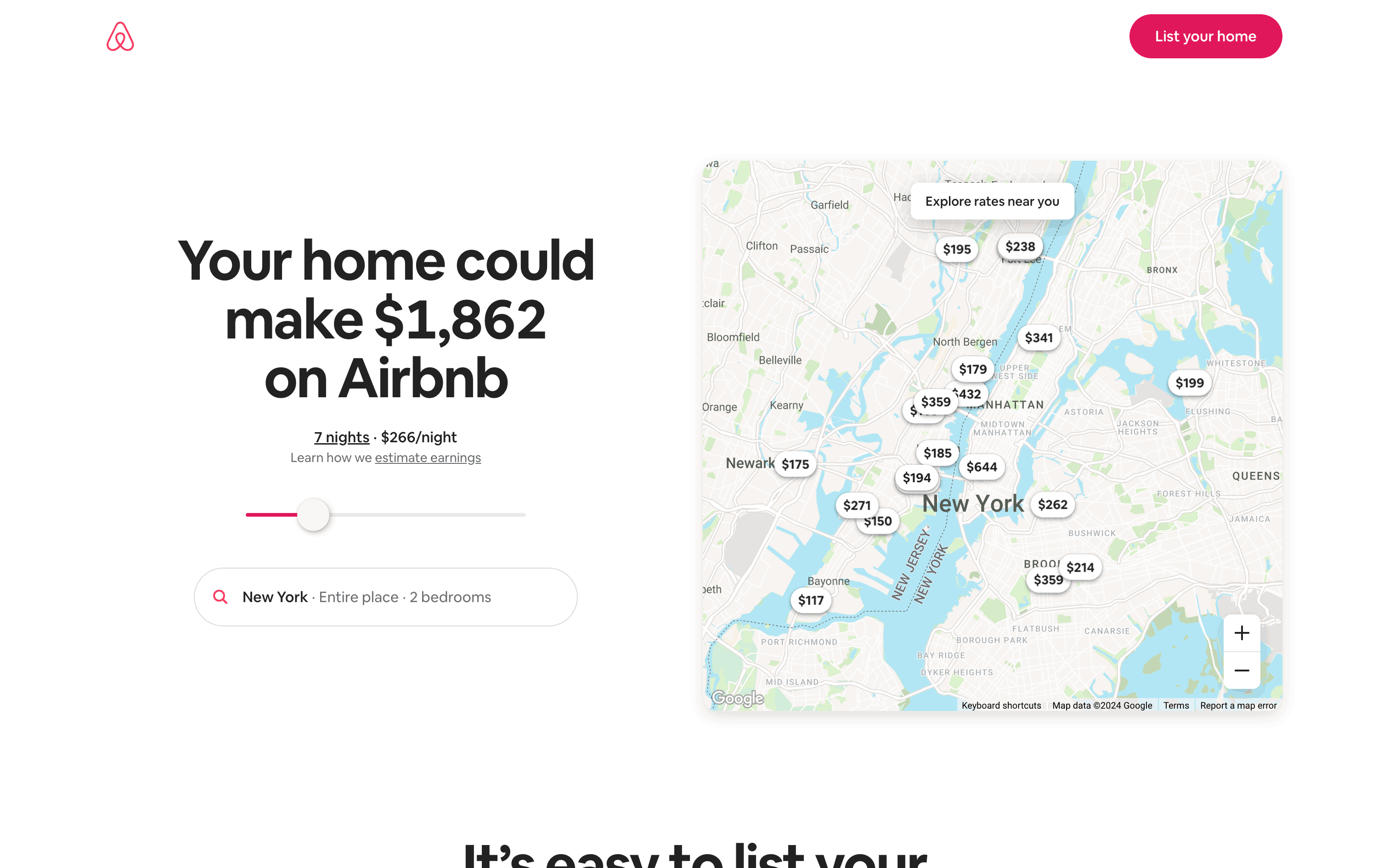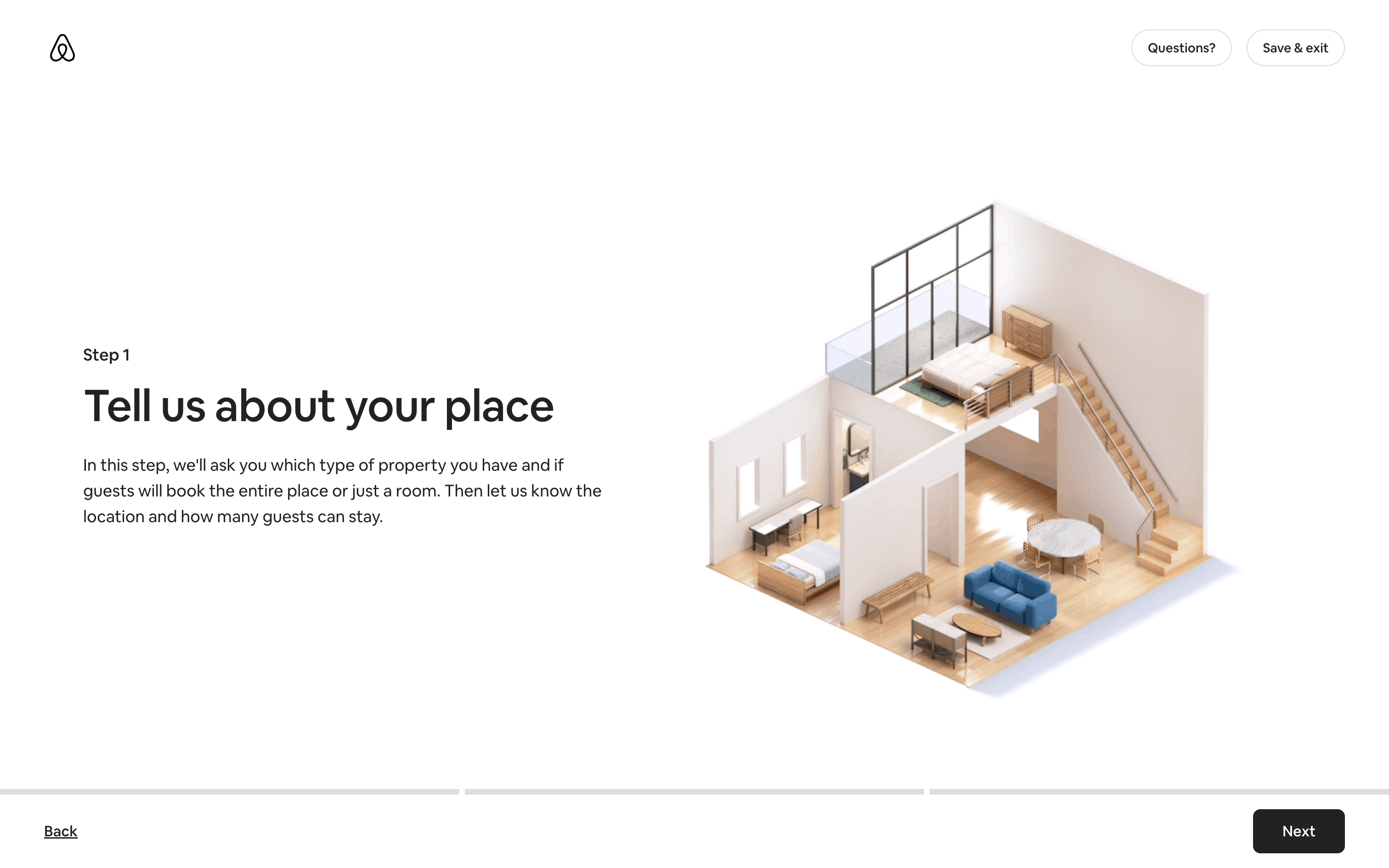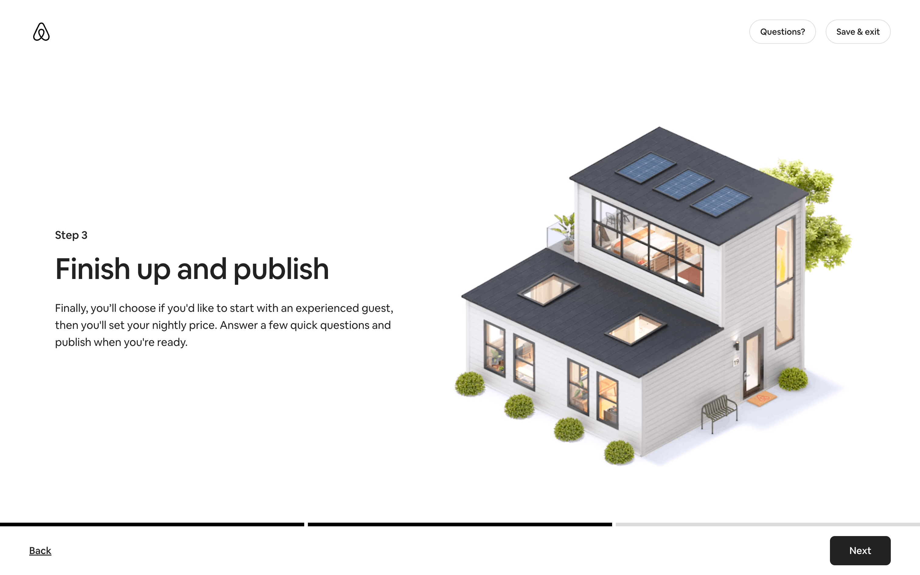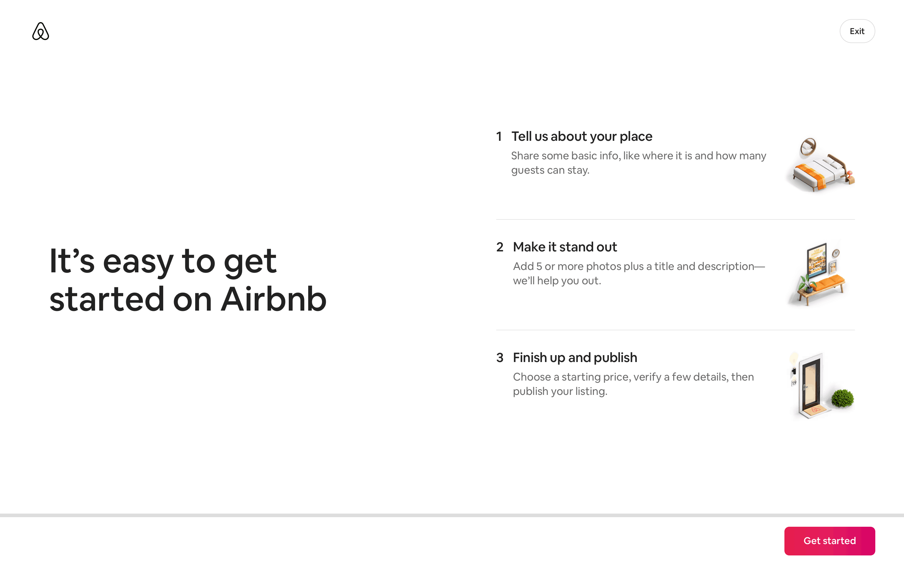The user flow guides a user through the process of listing a home on Airbnb. It involves providing property details, setting prices, and sharing safety information.