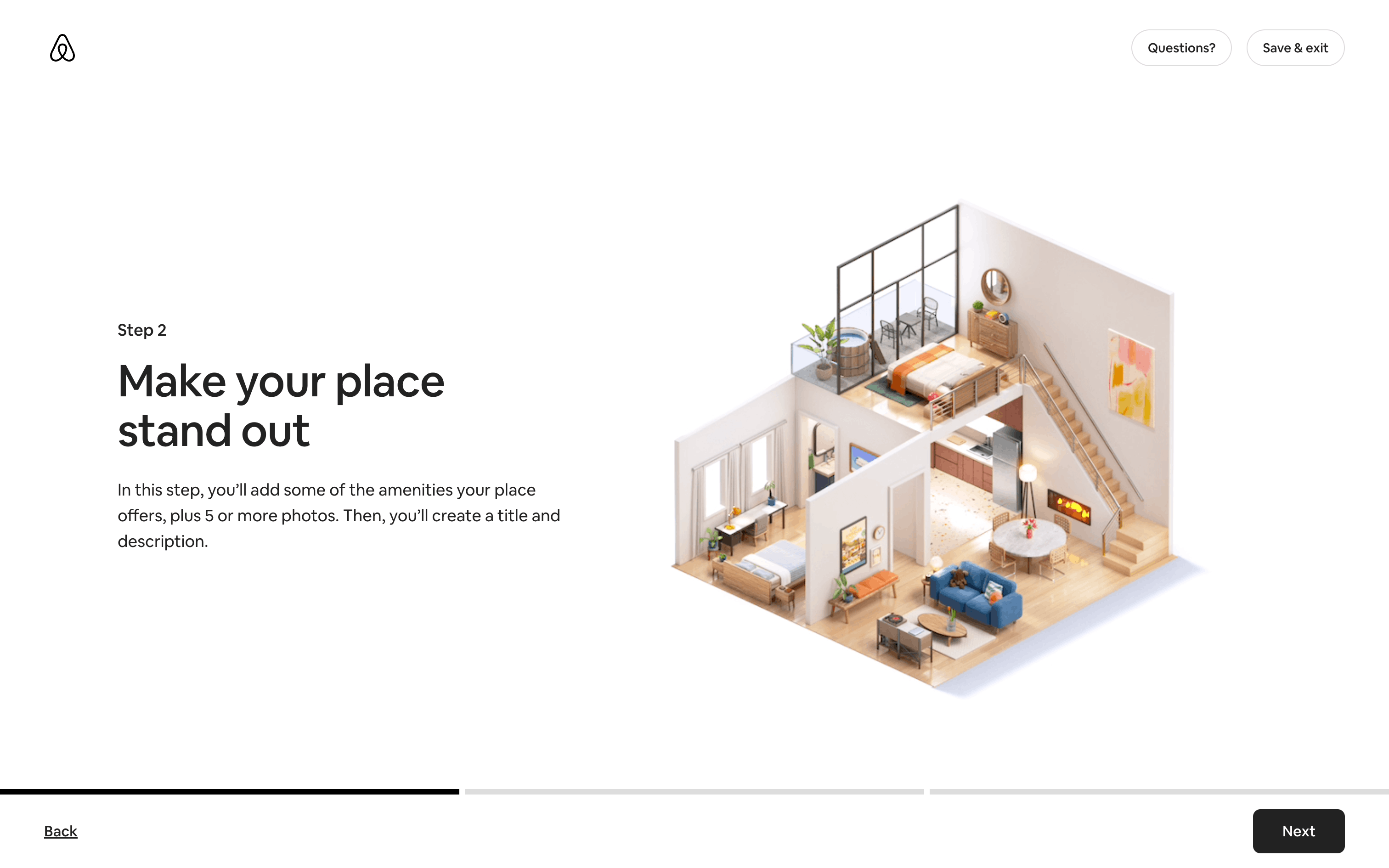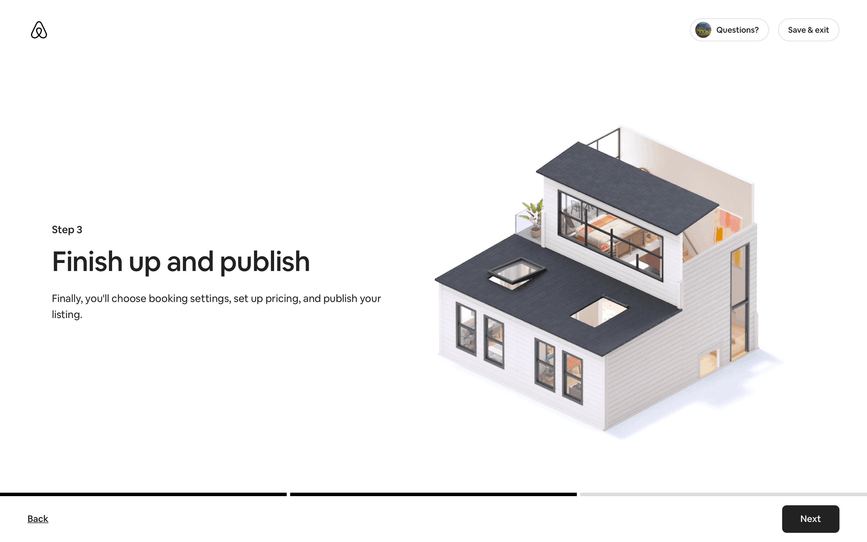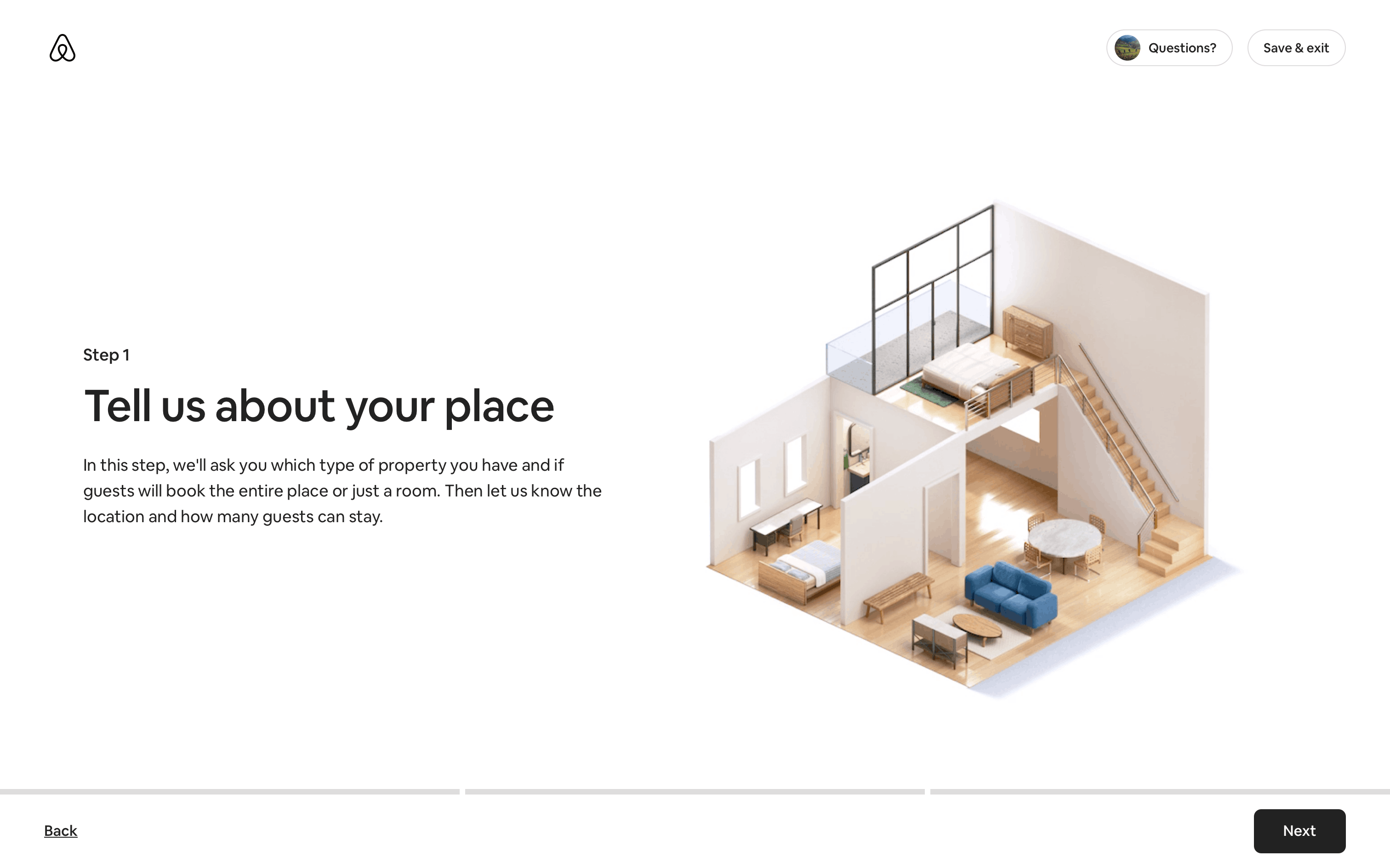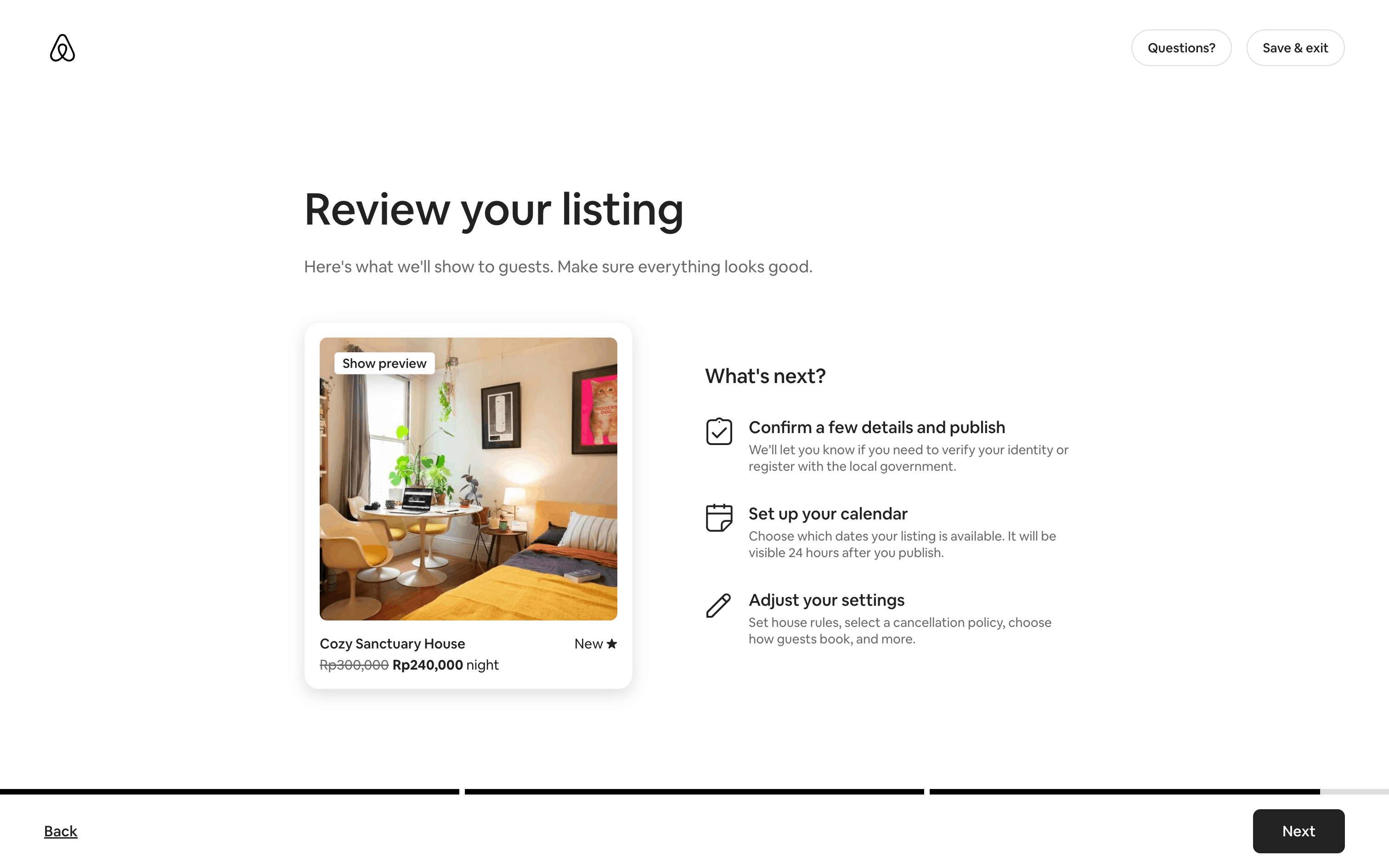 The user flow guides a user through the process of listing a home on Airbnb. It involves providing property details, setting prices, and sharing safety information.