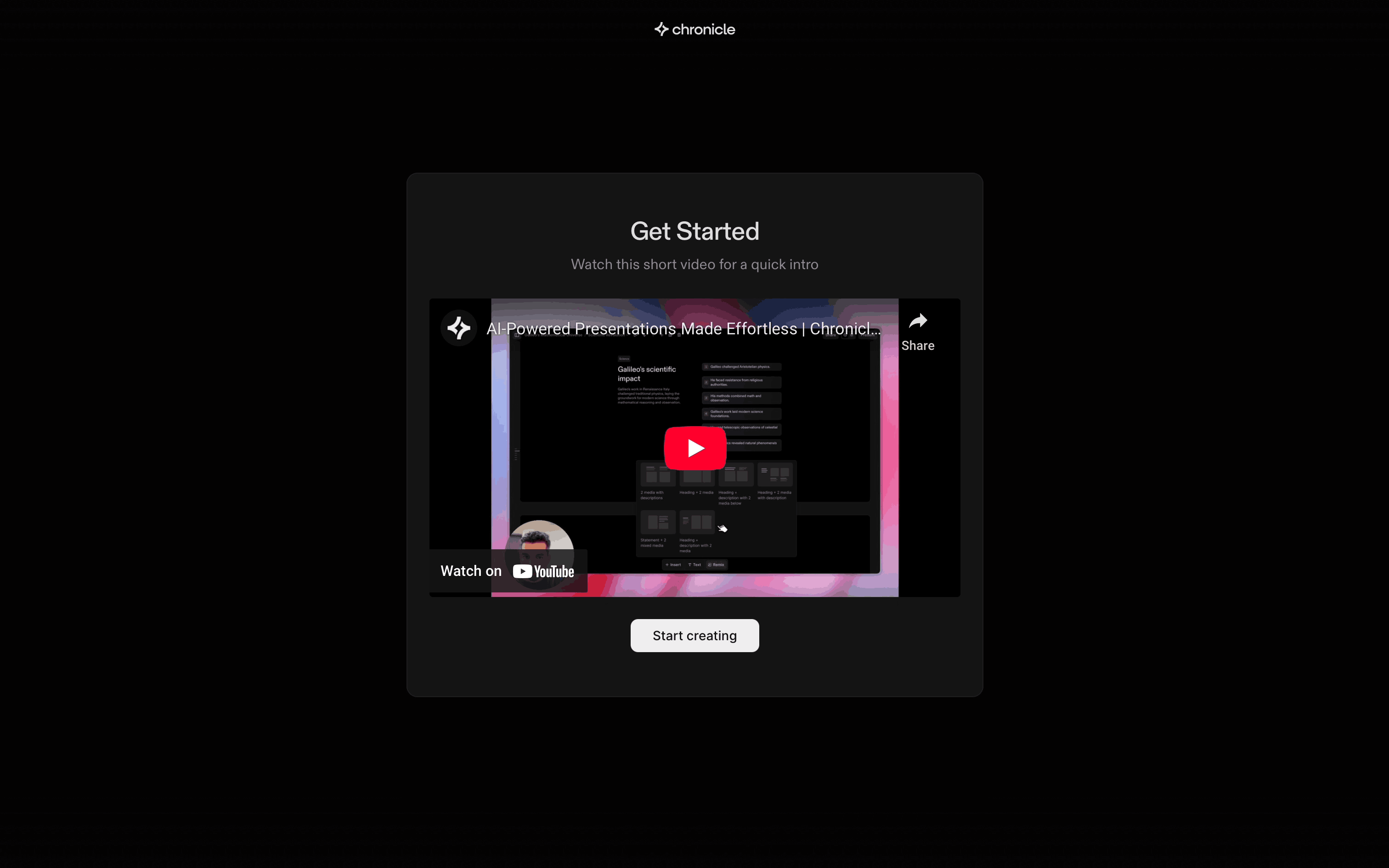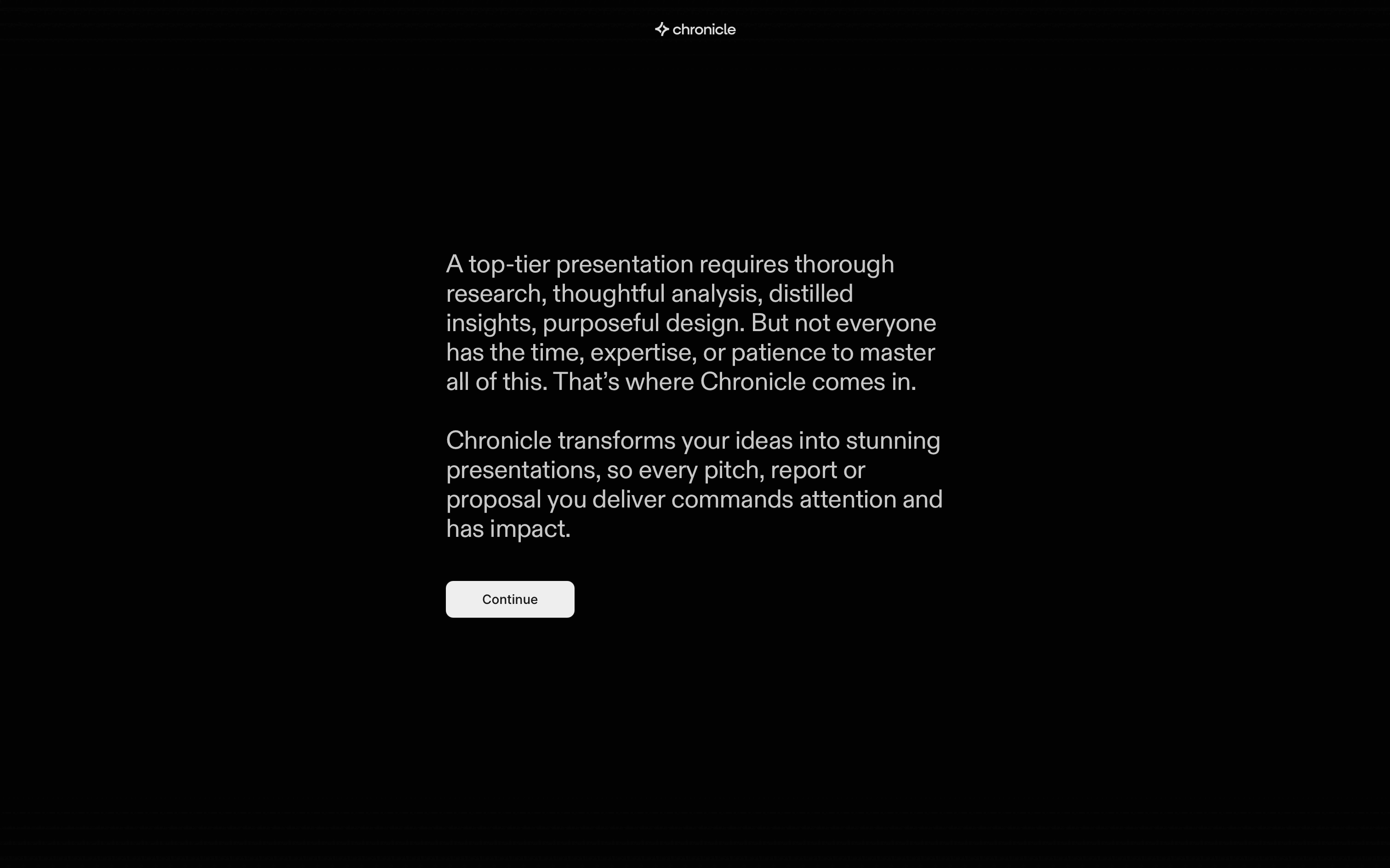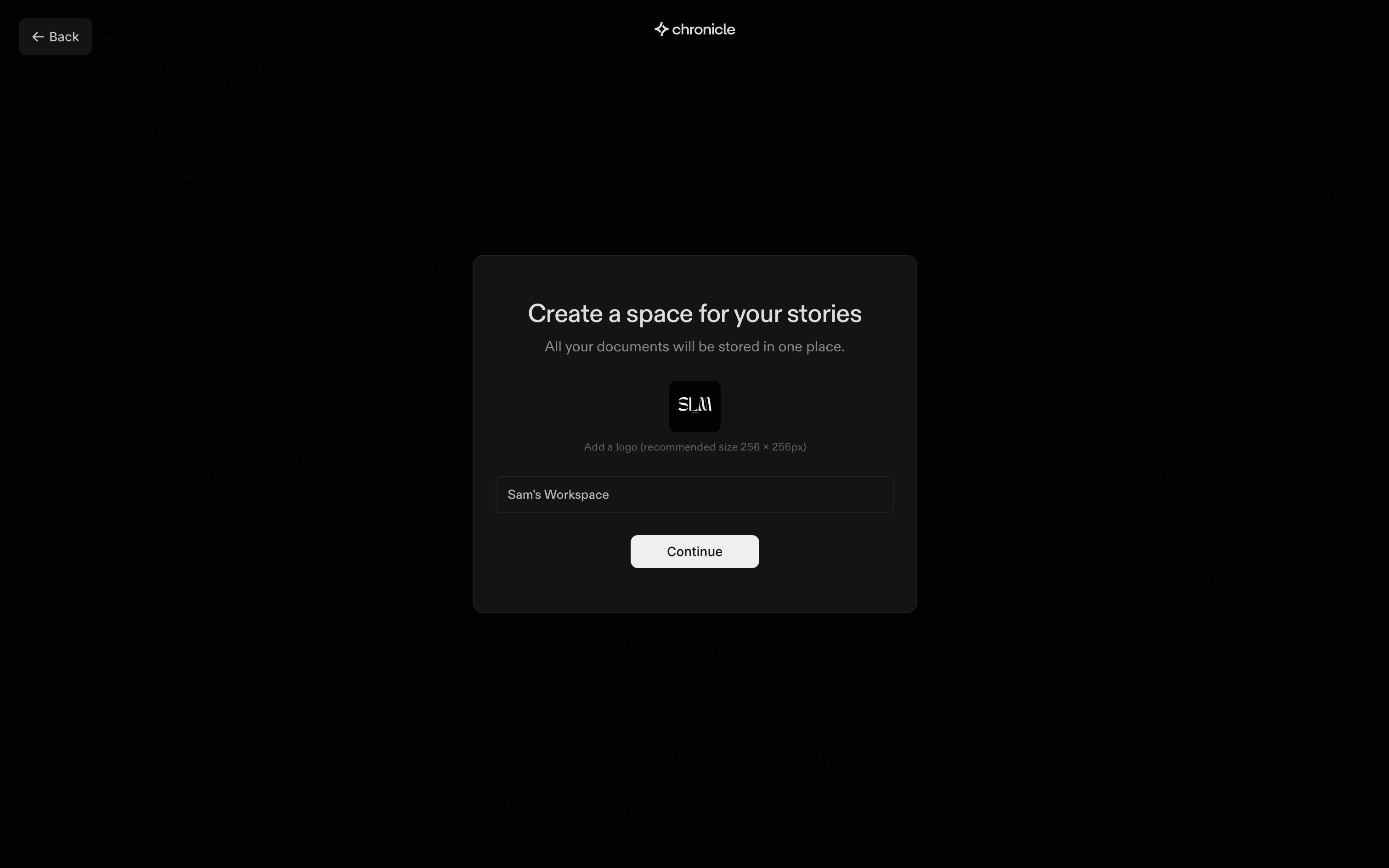 The user goes through the onboarding process, which includes signing up, creating a workspace, and finally being presented with options to create a new Chronicle.