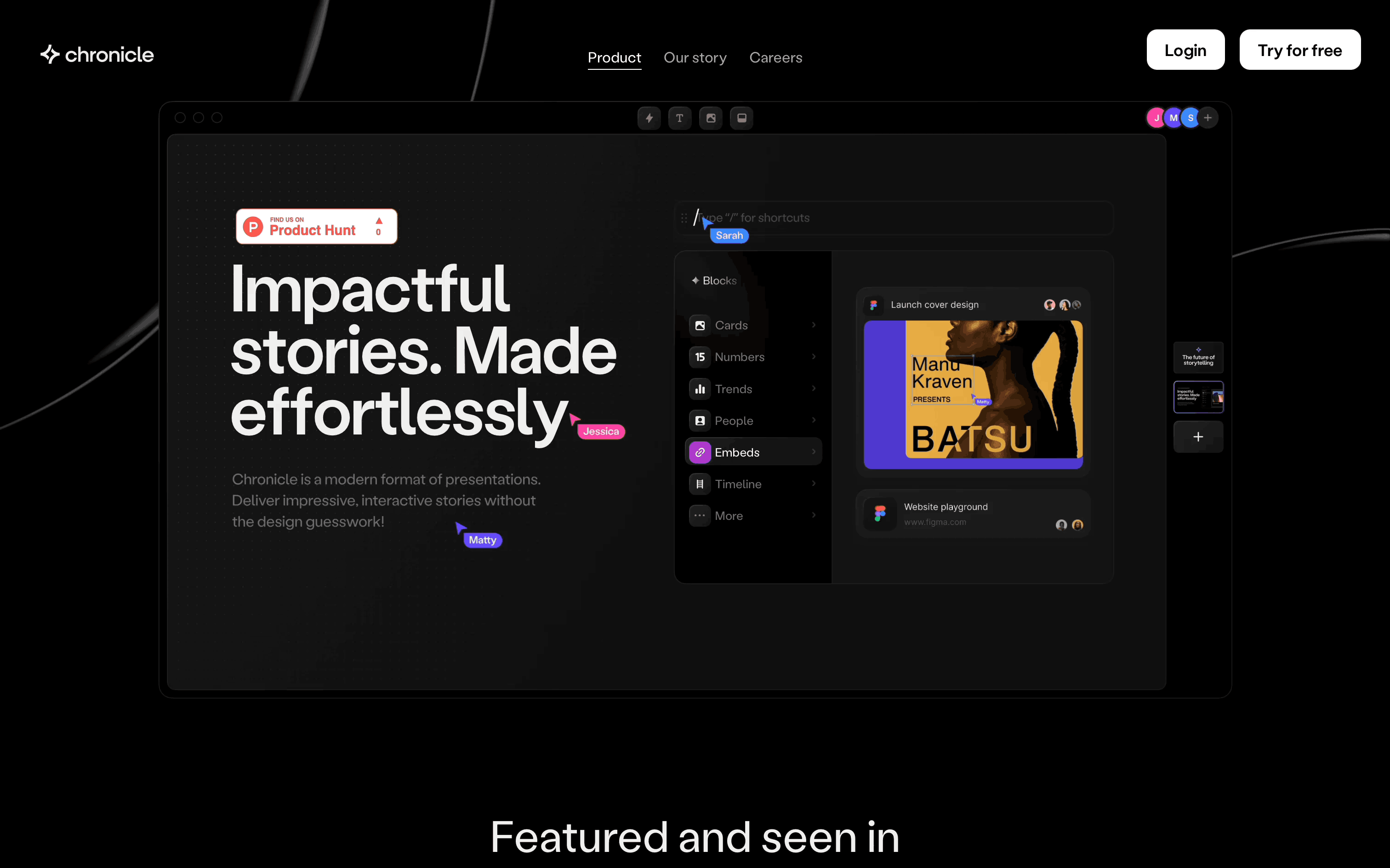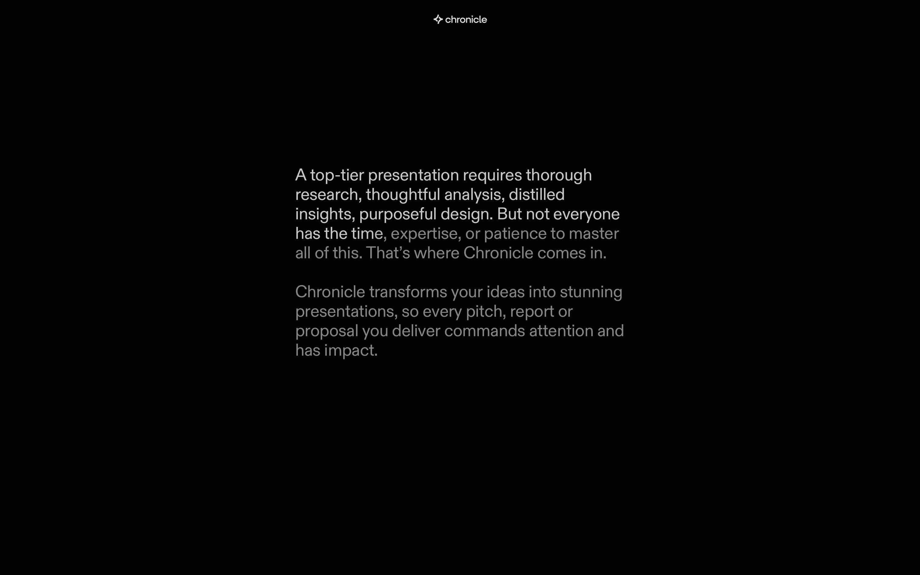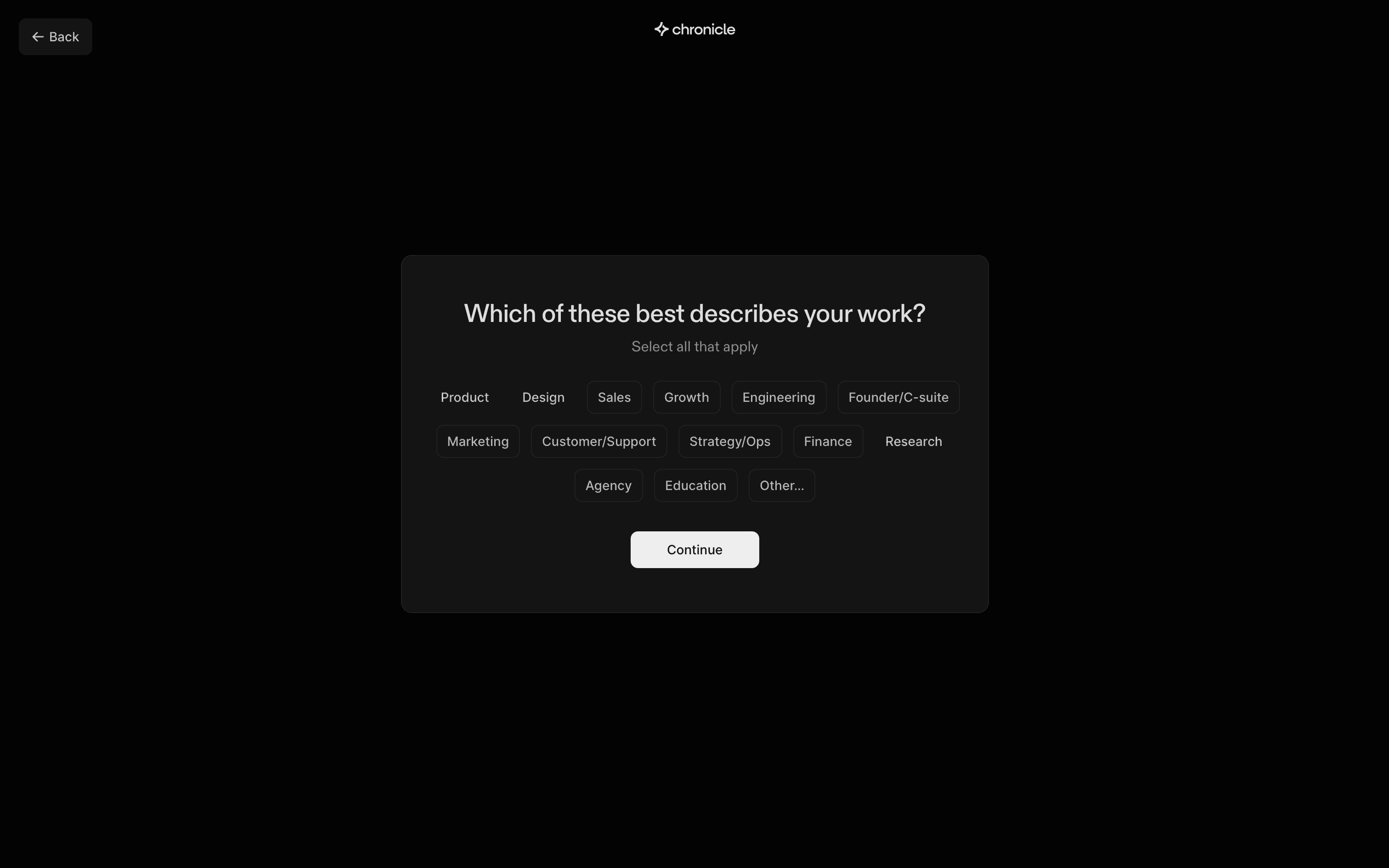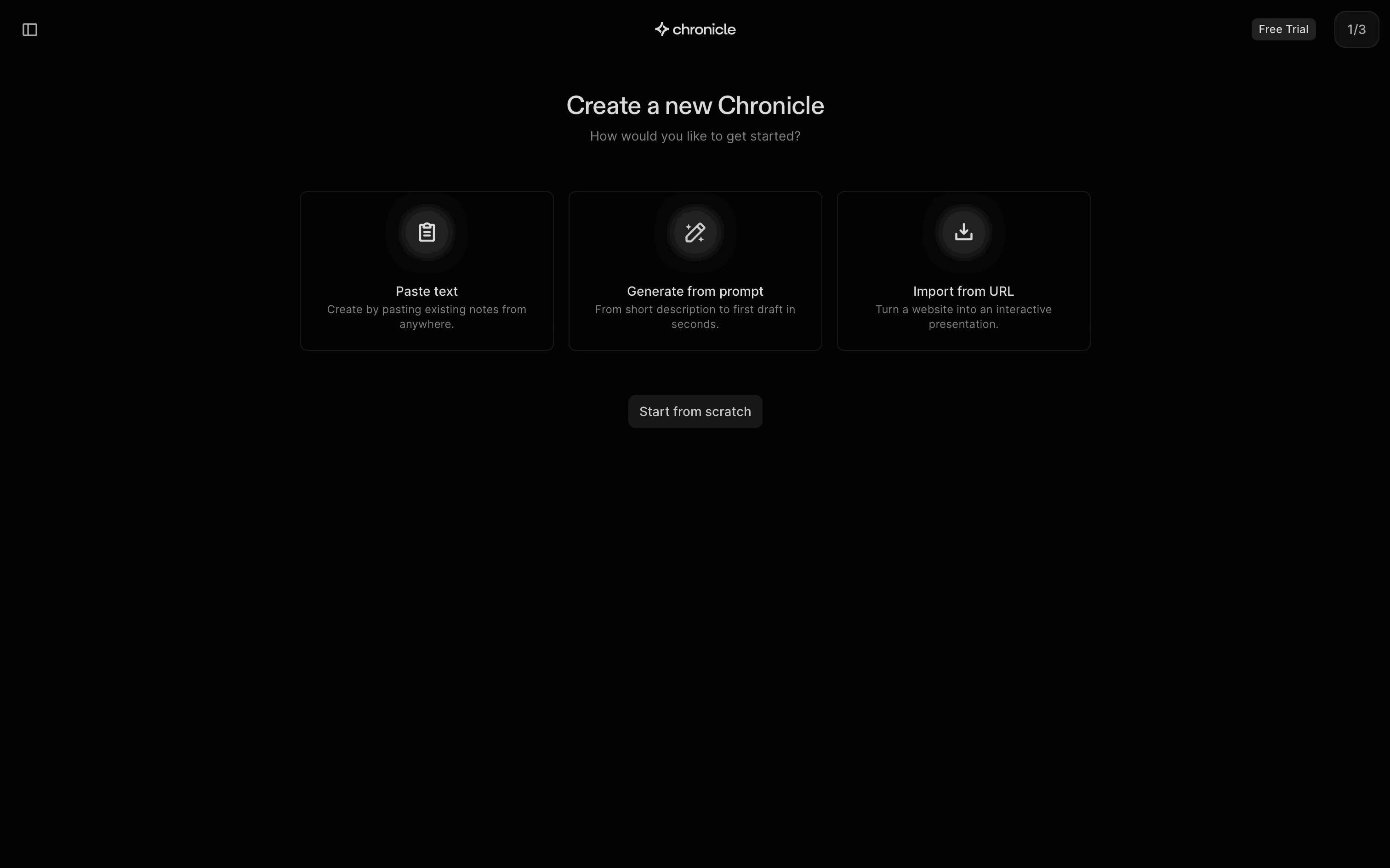 The user goes through the onboarding process, which includes signing up, creating a workspace, and finally being presented with options to create a new Chronicle.