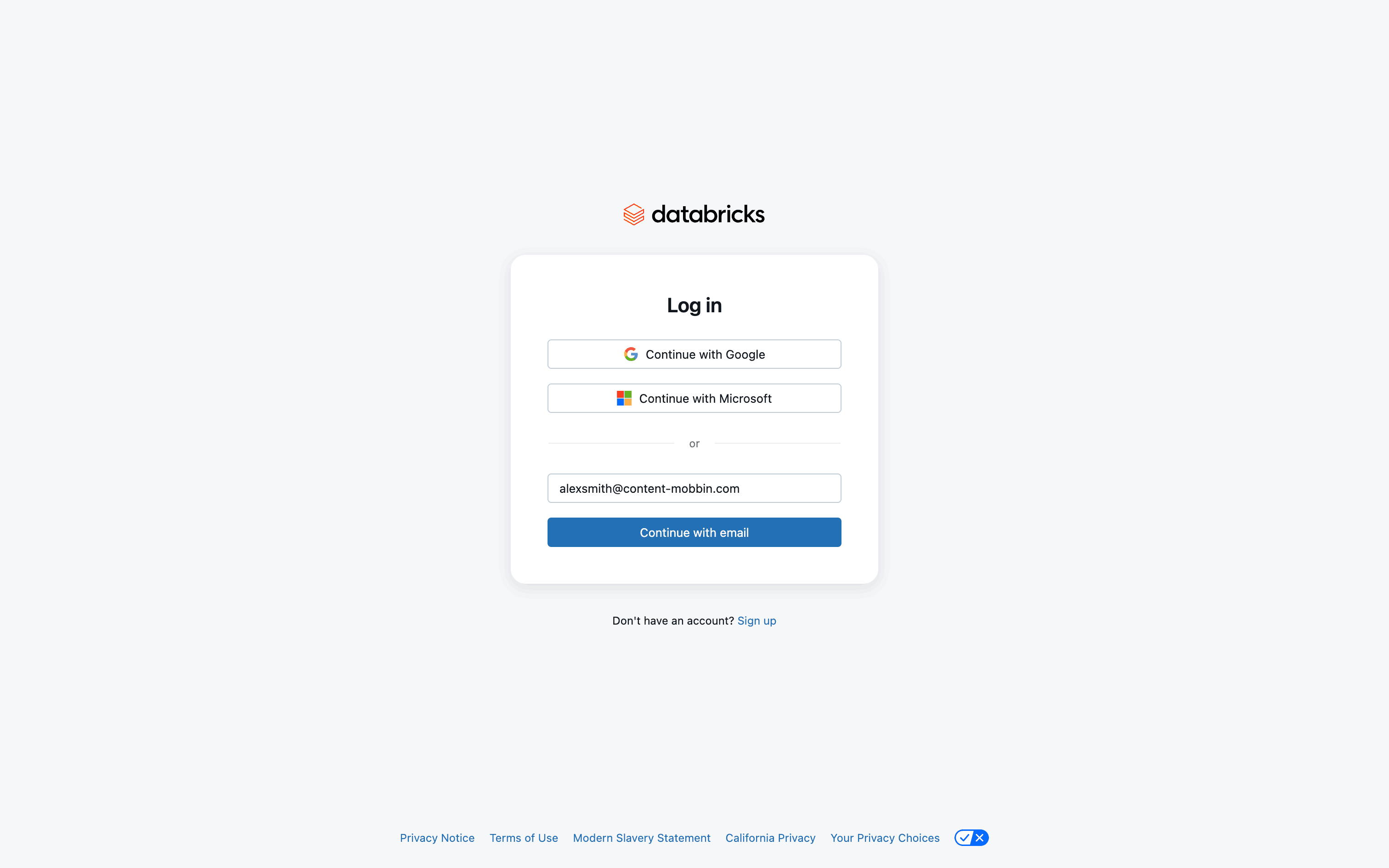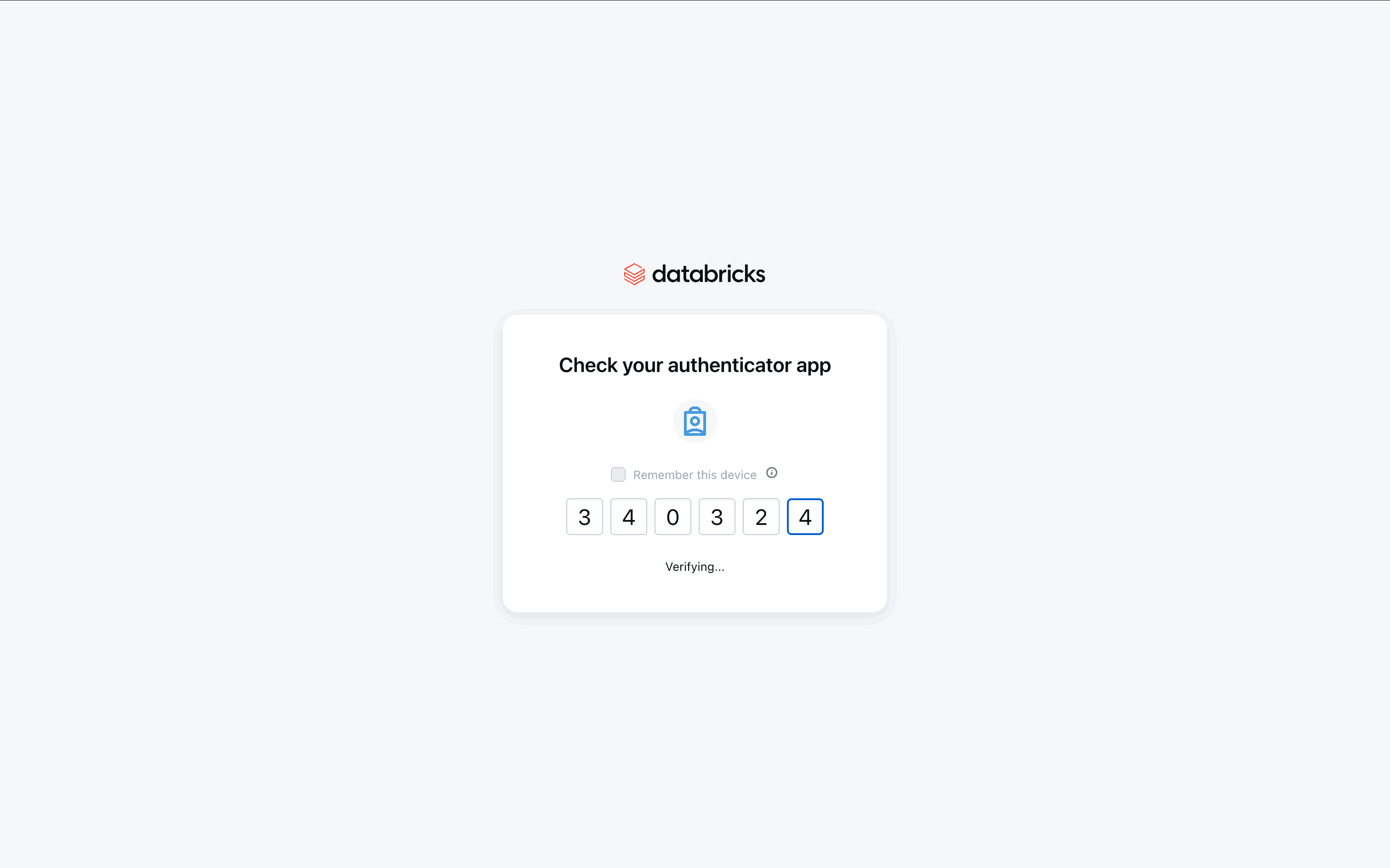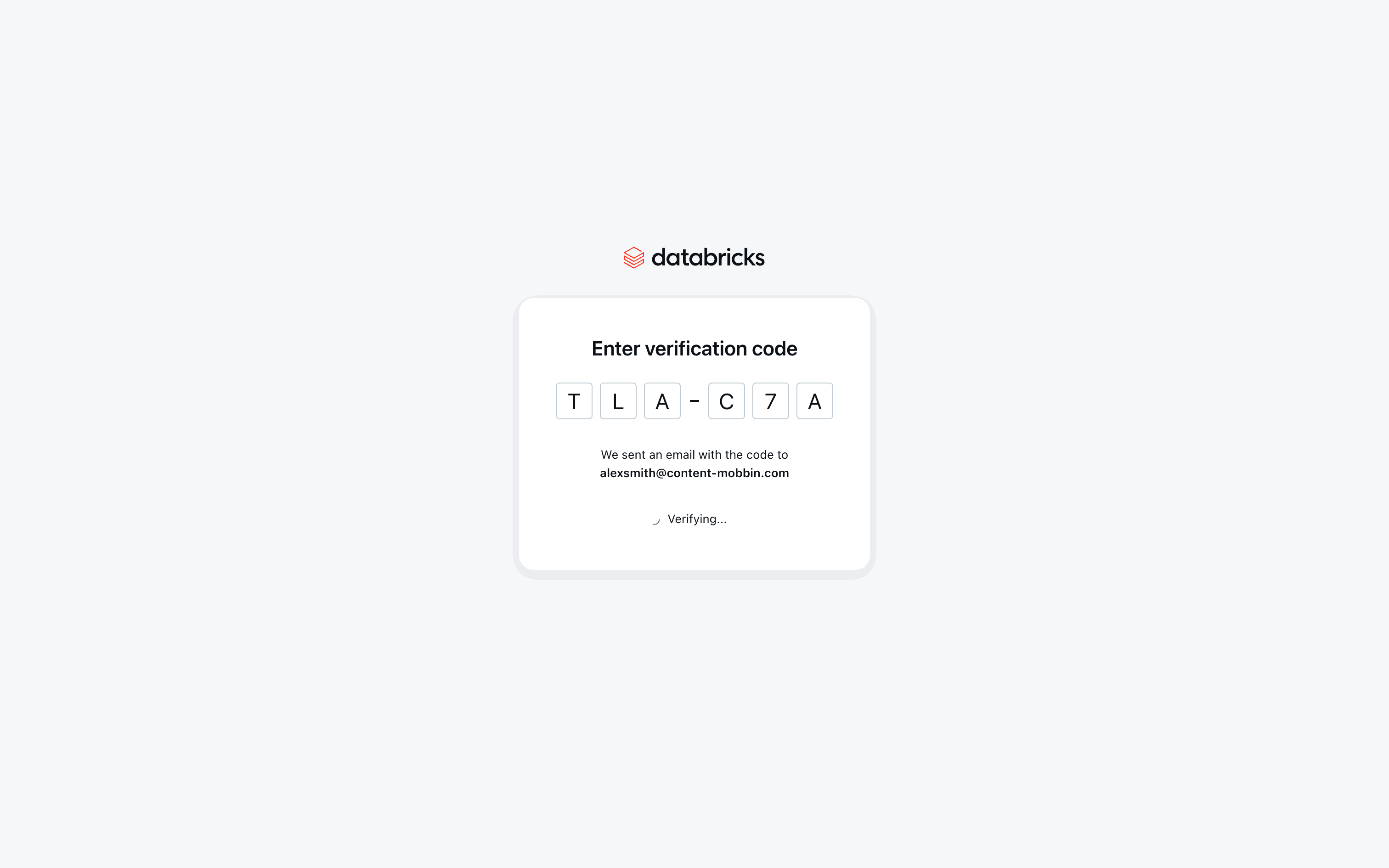 The user logs in to Databricks using email and authenticator app verification. Upon successful login, the user is directed to the Databricks welcome page.