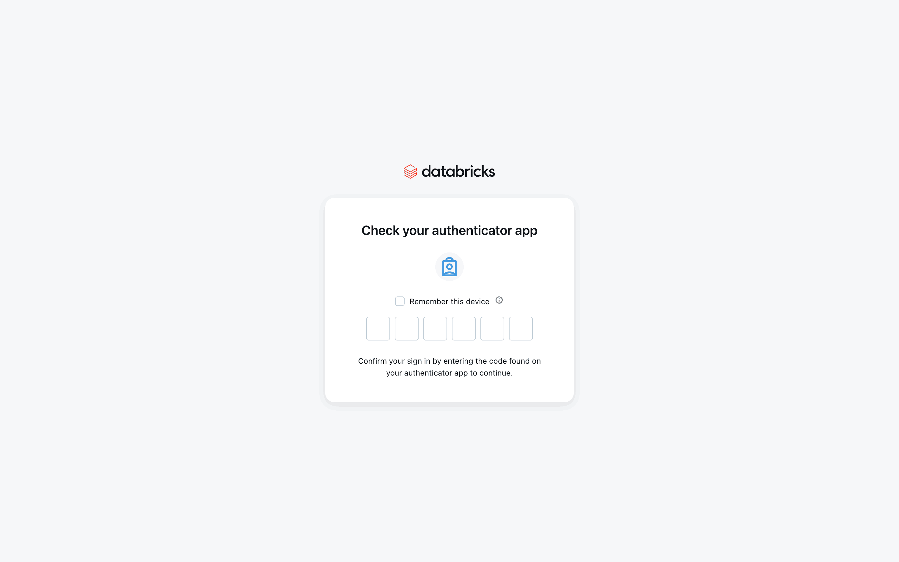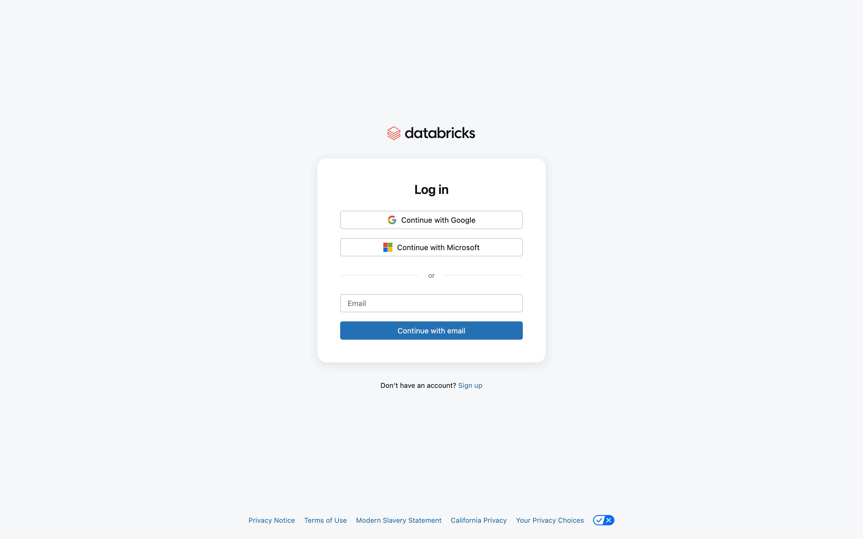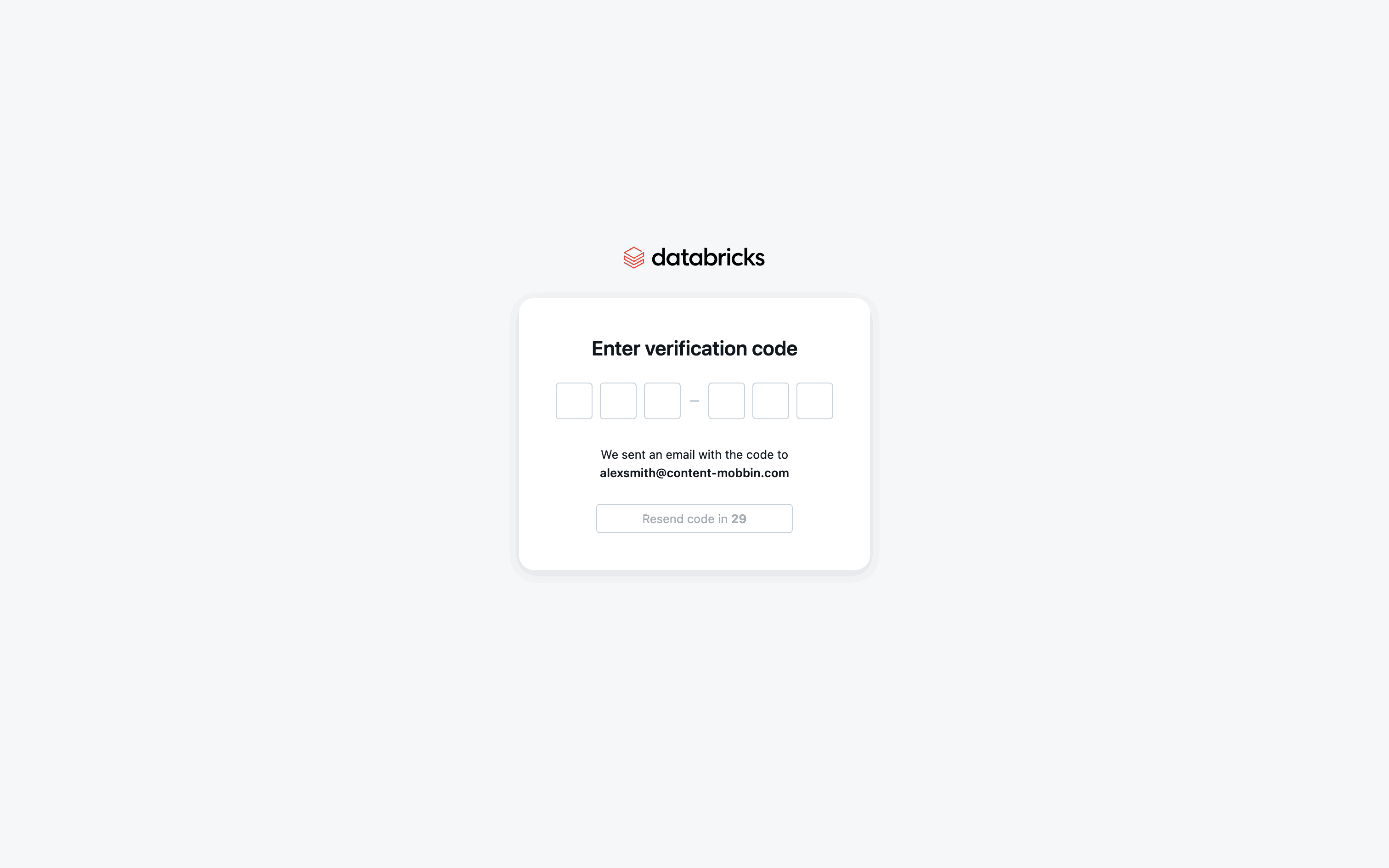 The user logs in to Databricks using email and authenticator app verification. Upon successful login, the user is directed to the Databricks welcome page.