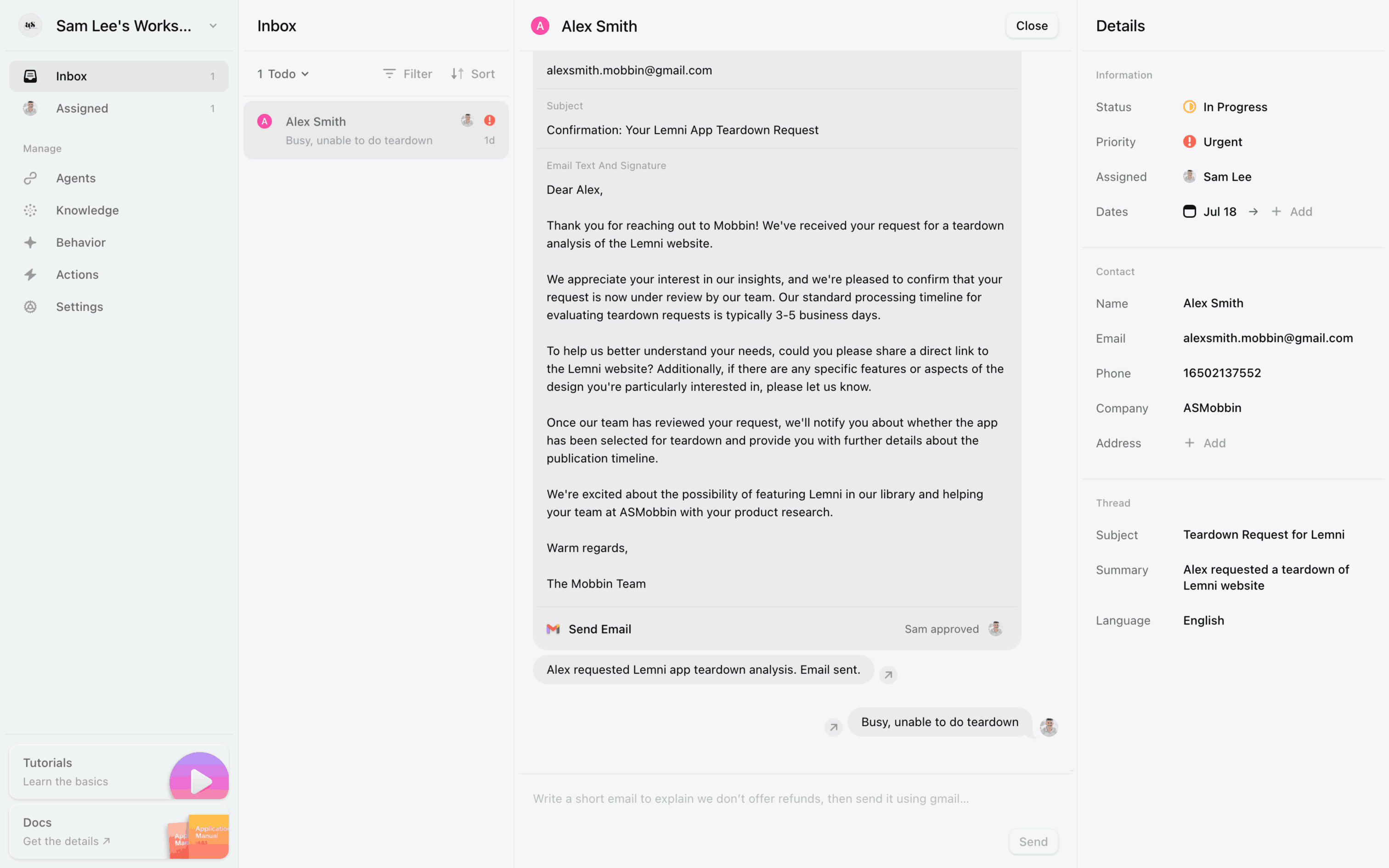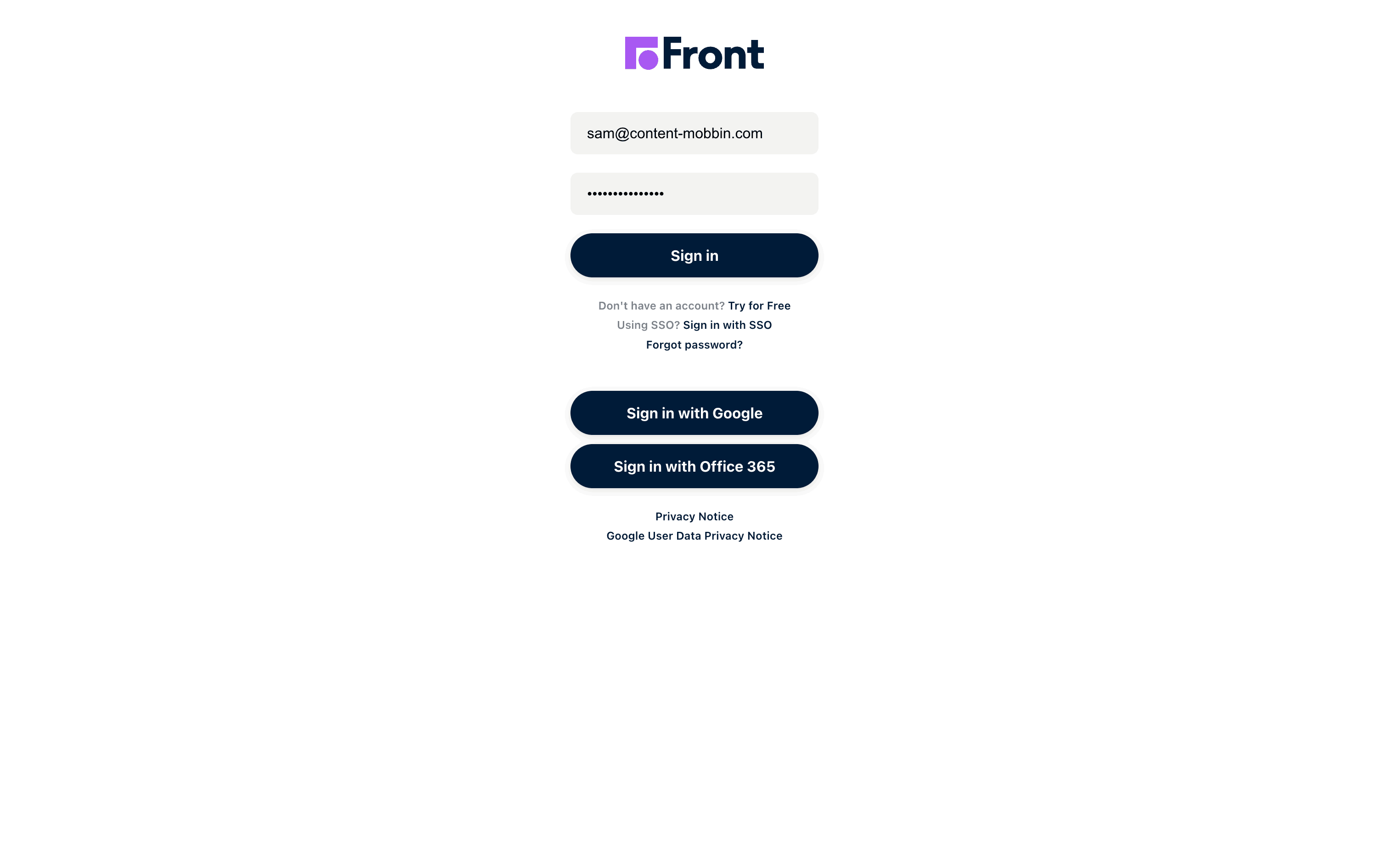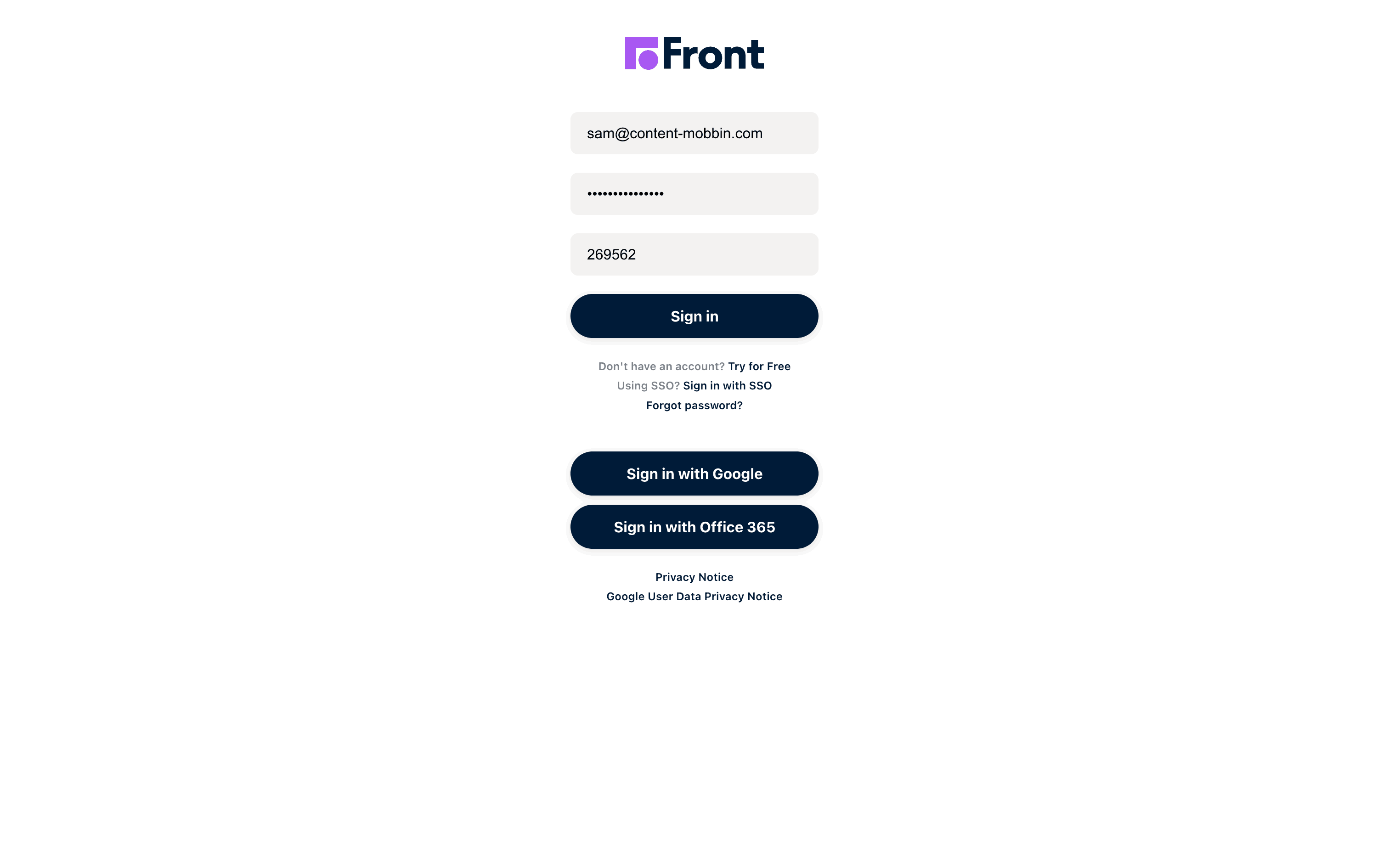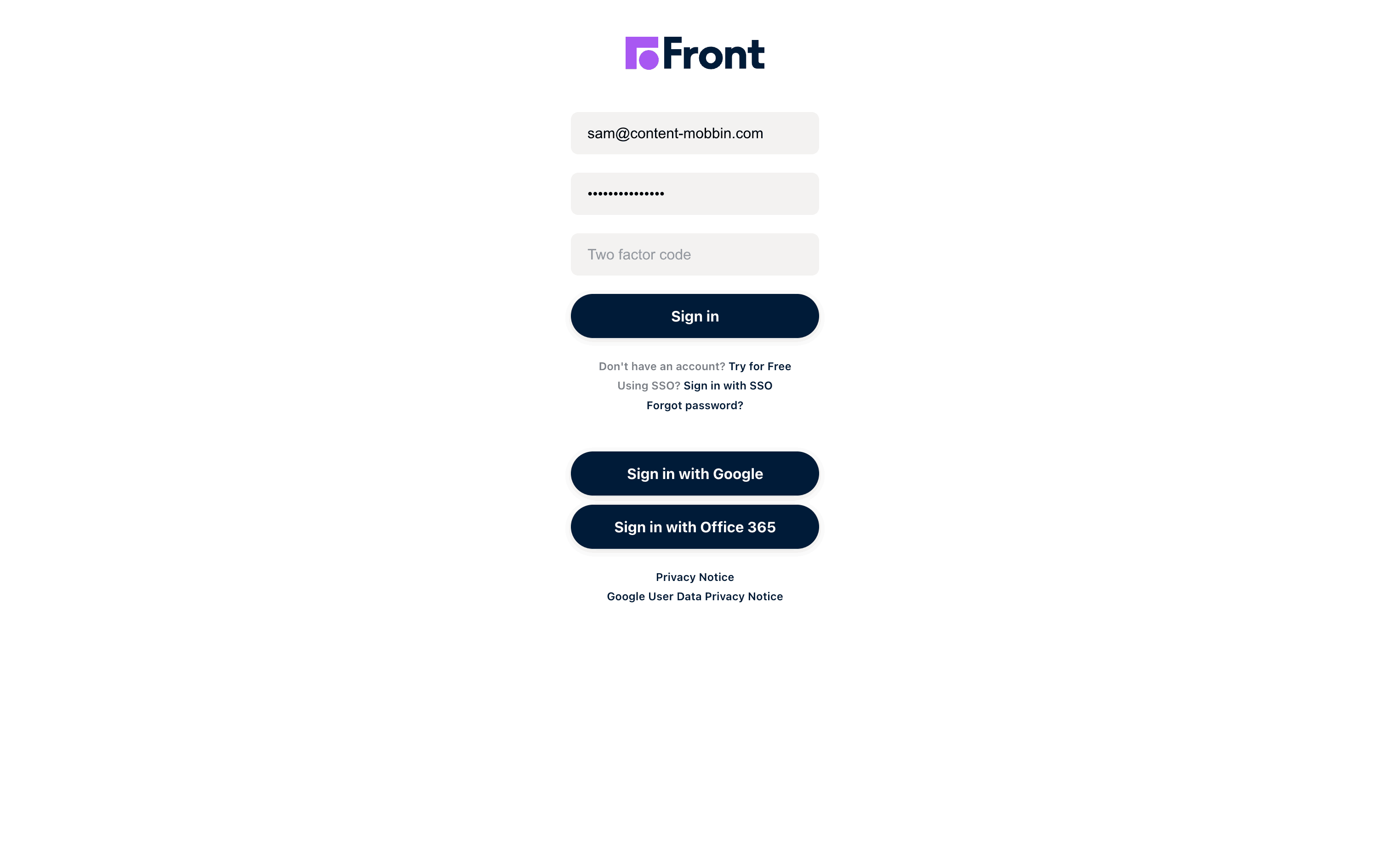 The user logs in with email, password, and two-factor authentication. After successful authentication, the user is directed to the inbox.