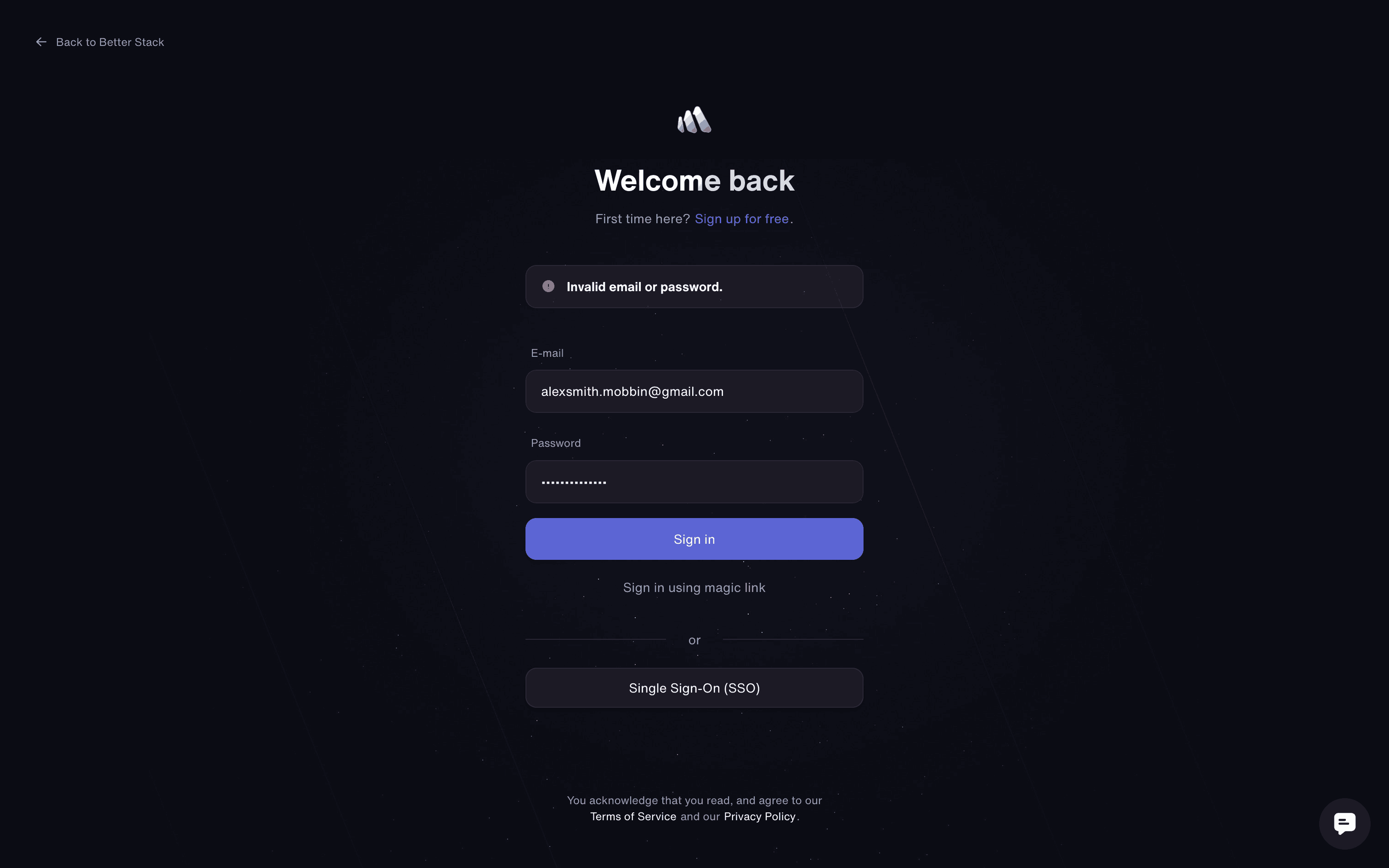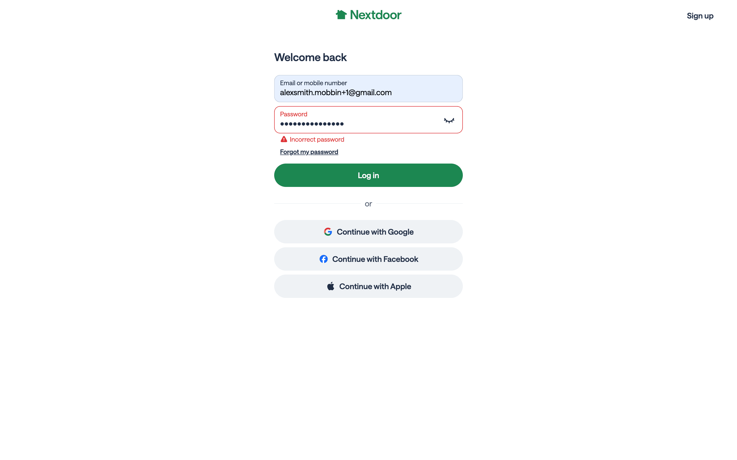 The user attempts to log in, encounters an error, corrects their credentials, and successfully logs in. They are then directed to the homepage.