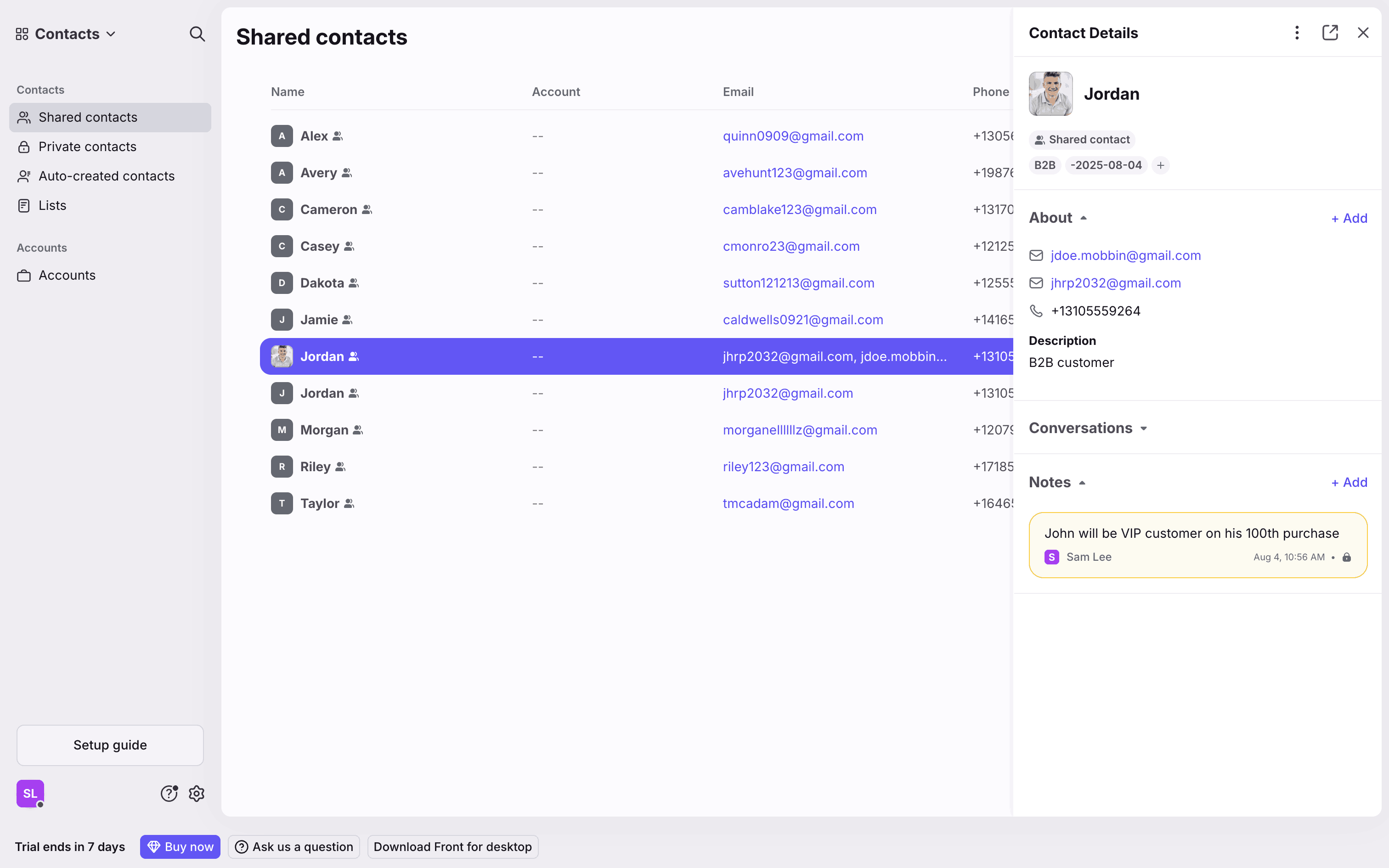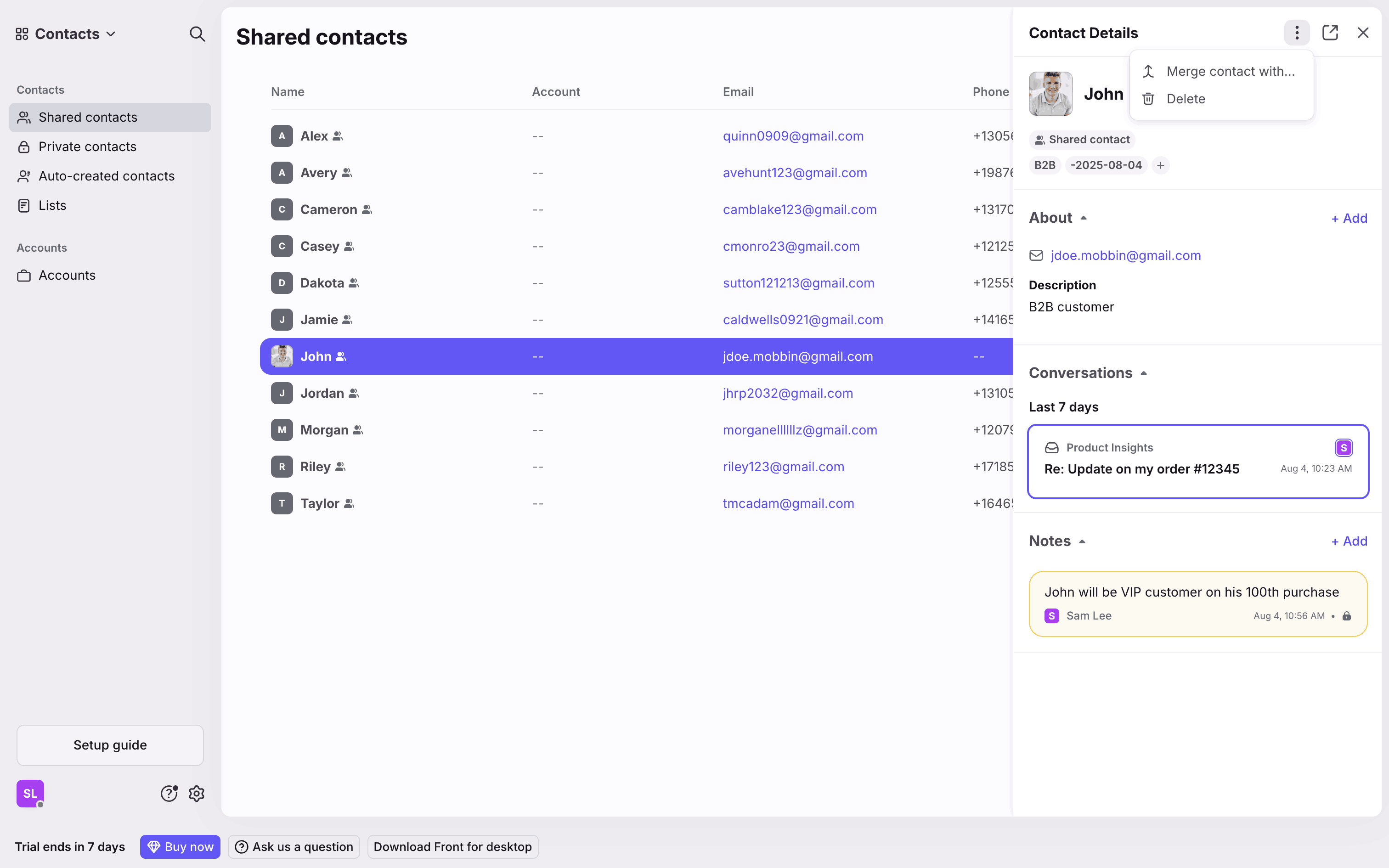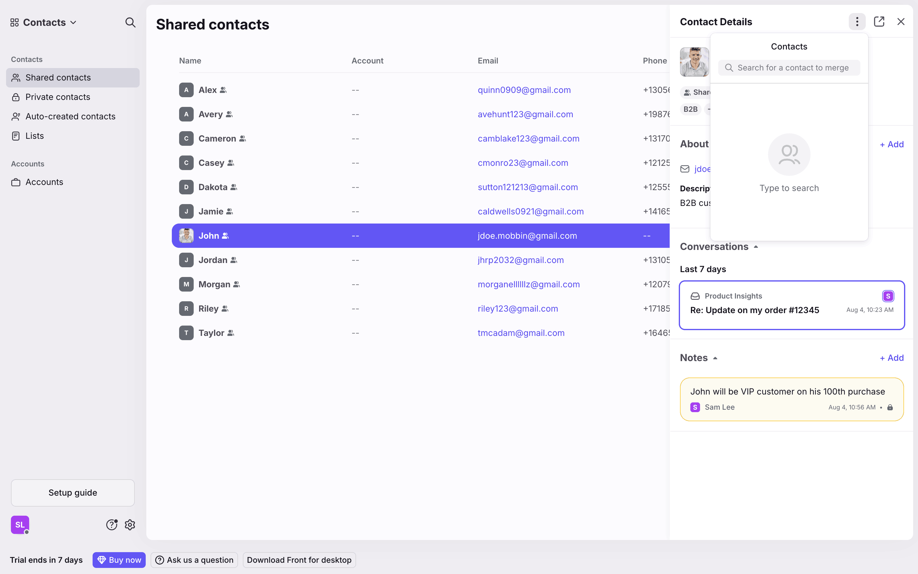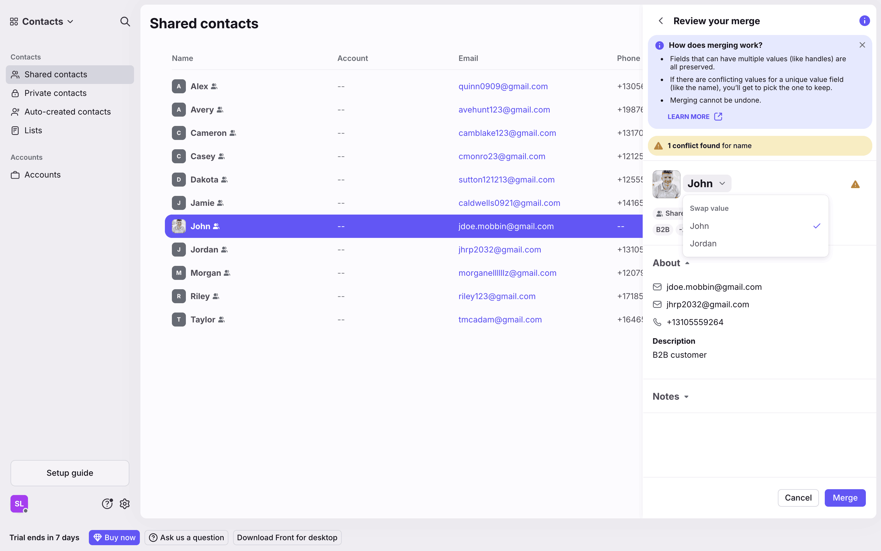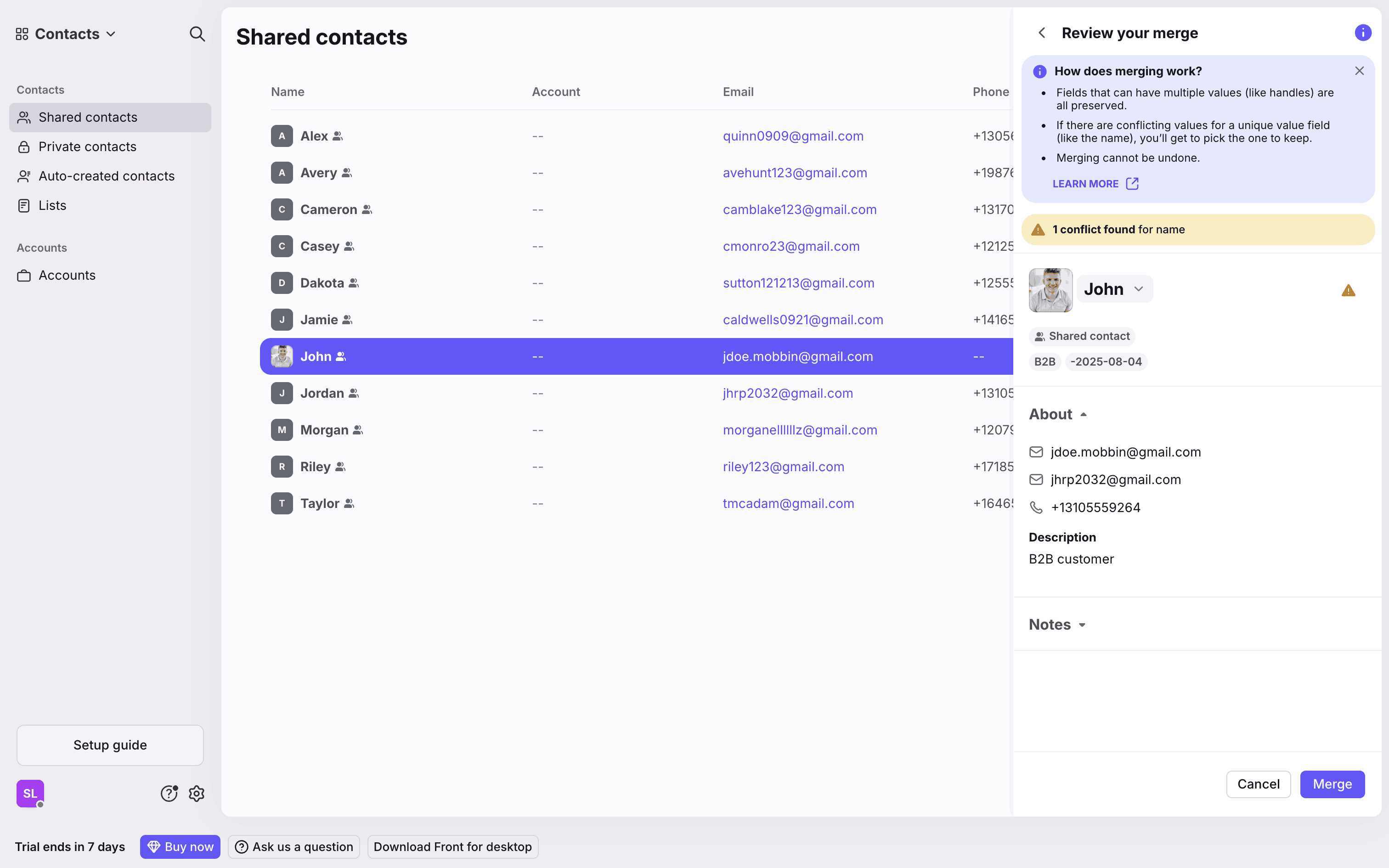 The user merges two contacts by searching for a contact, resolving conflicts, and completing the merge. The contact details panel then displays the merged contact.