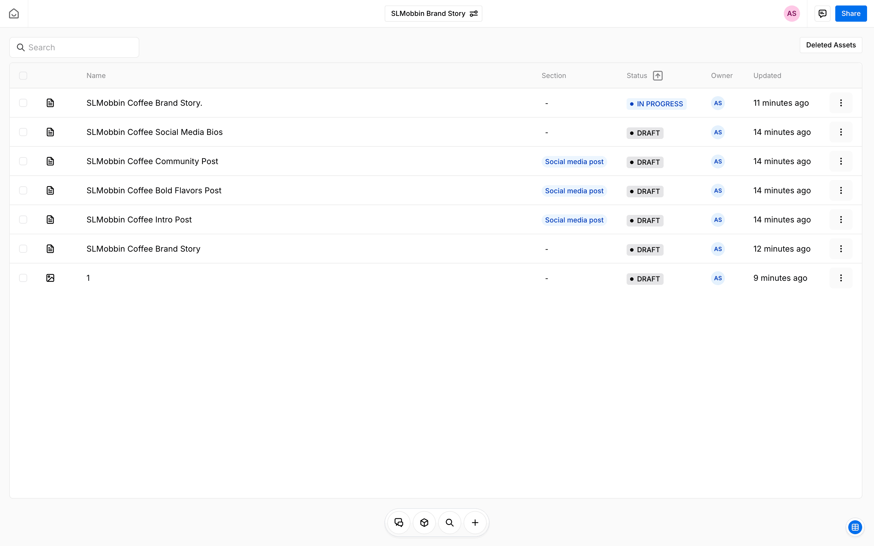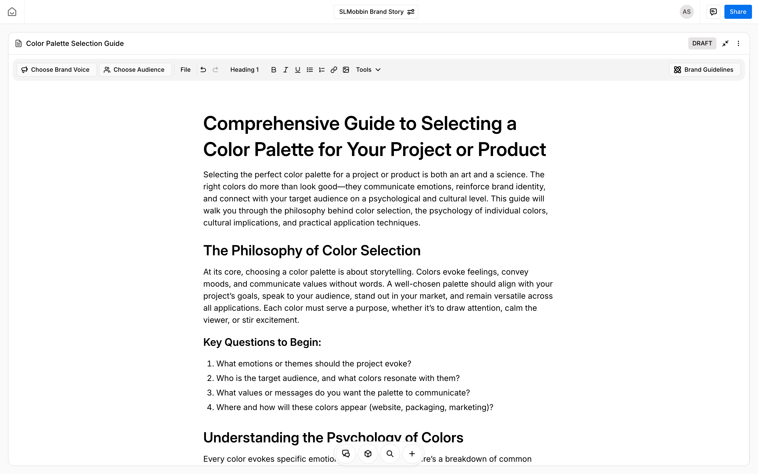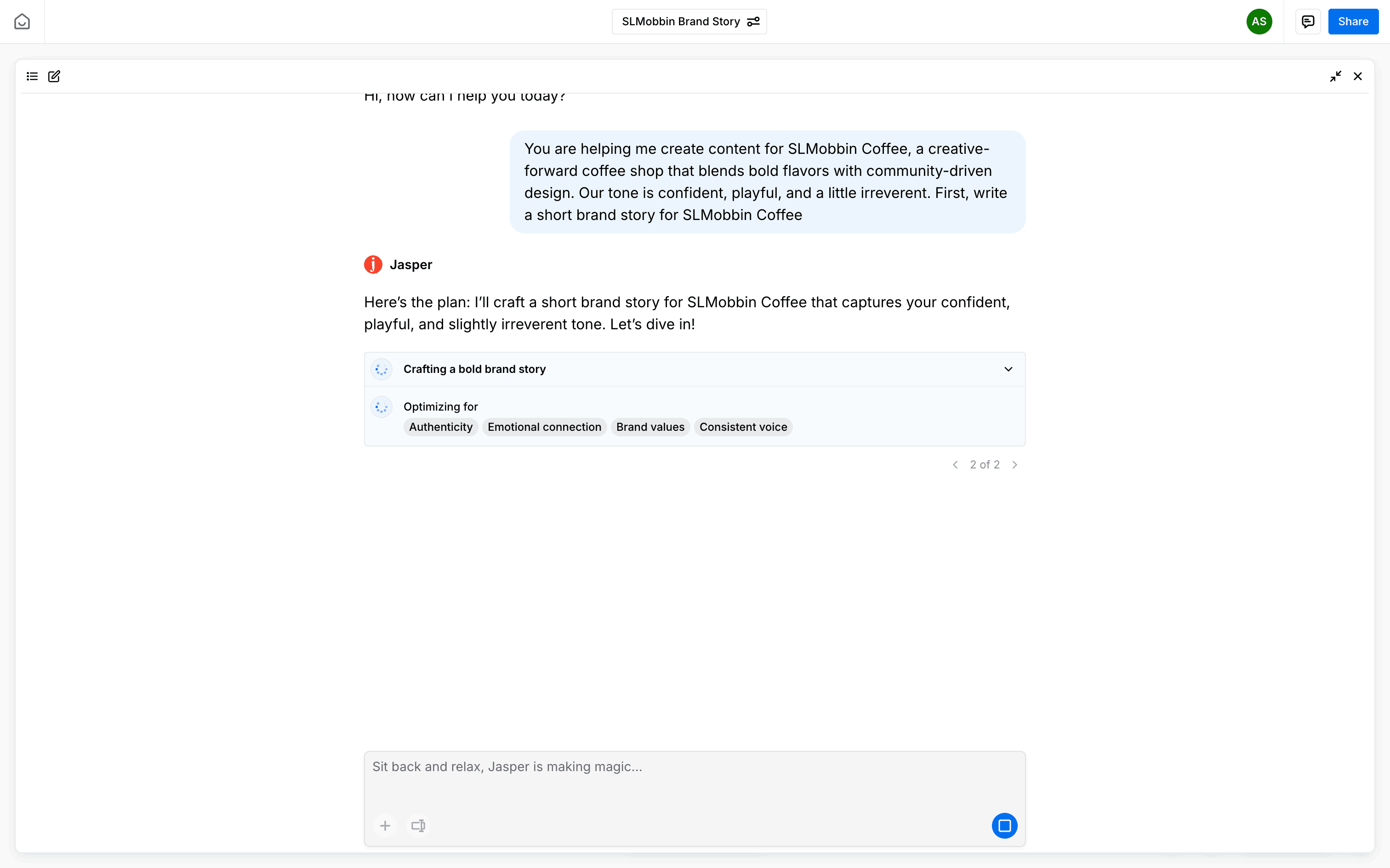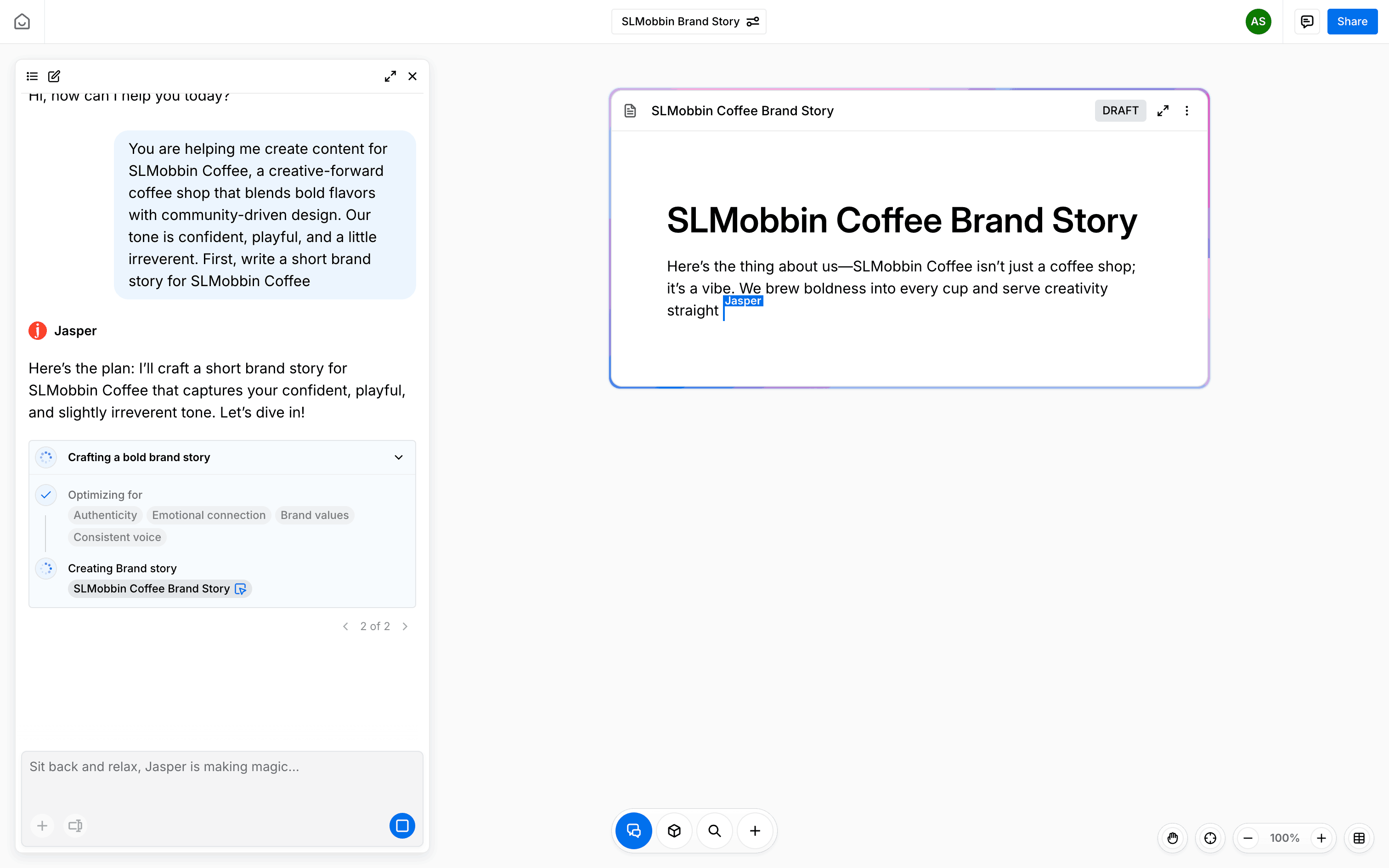 The user provides a prompt to generate a brand story. The system generates a draft and presents the complete story with options to create social media posts.