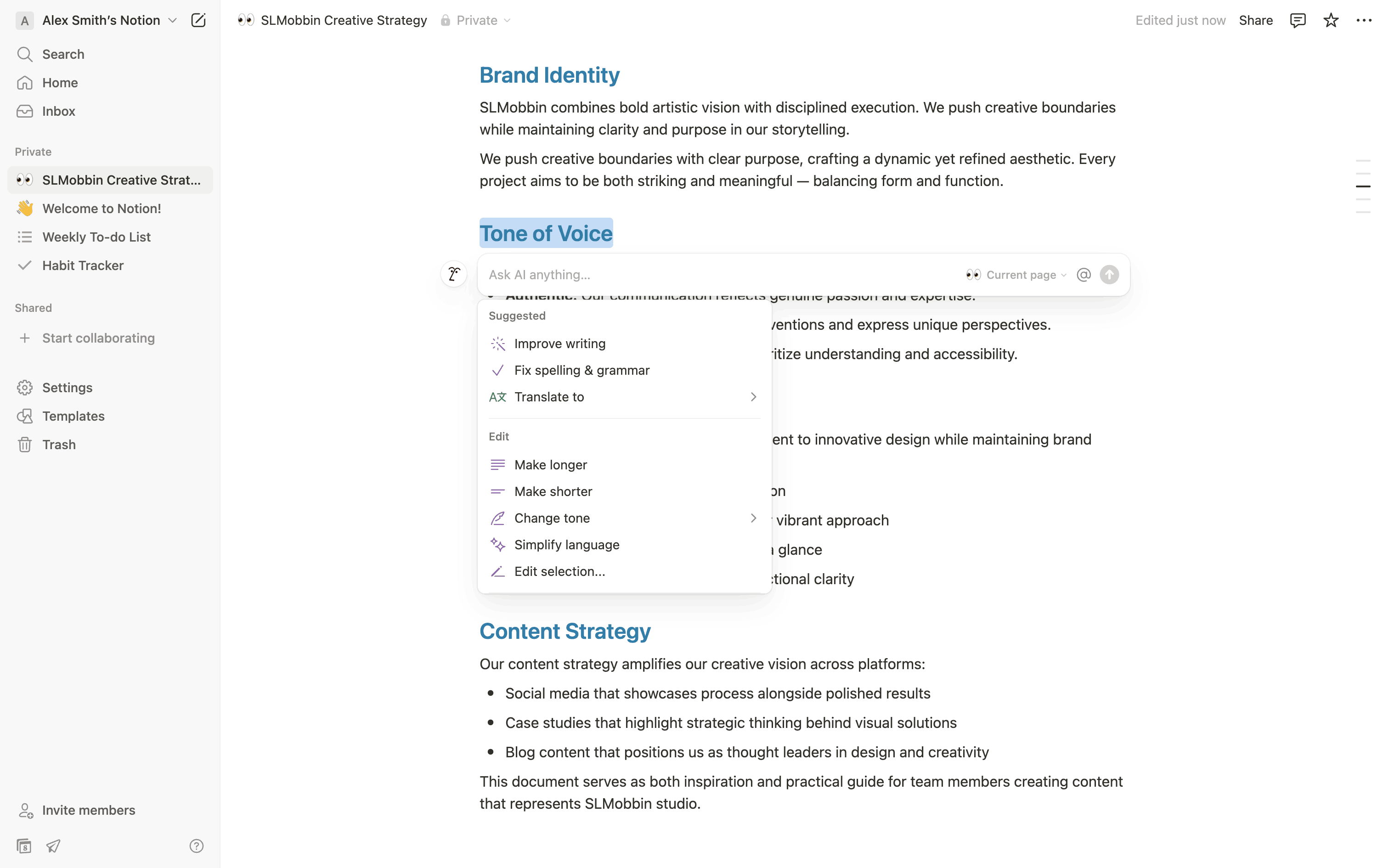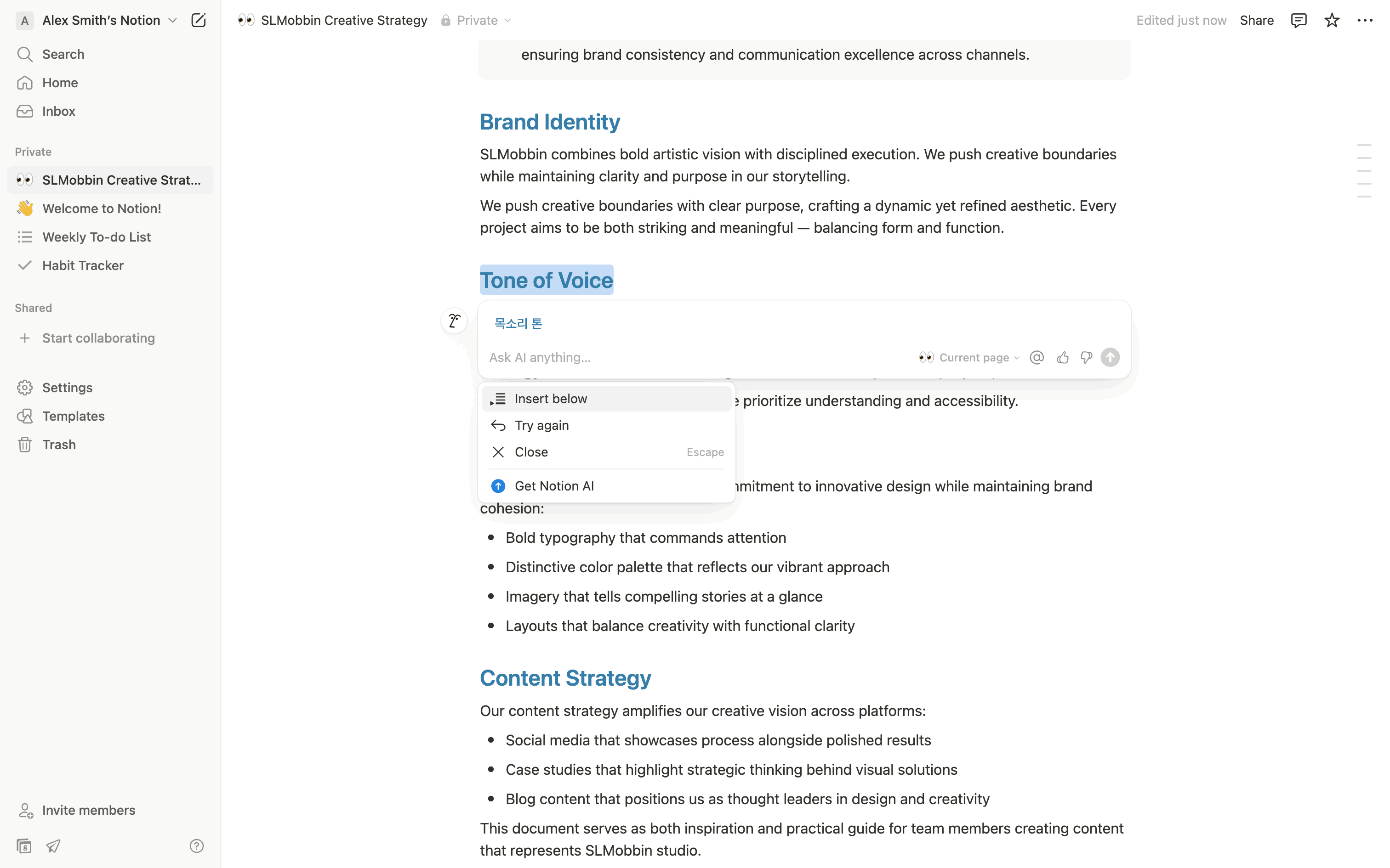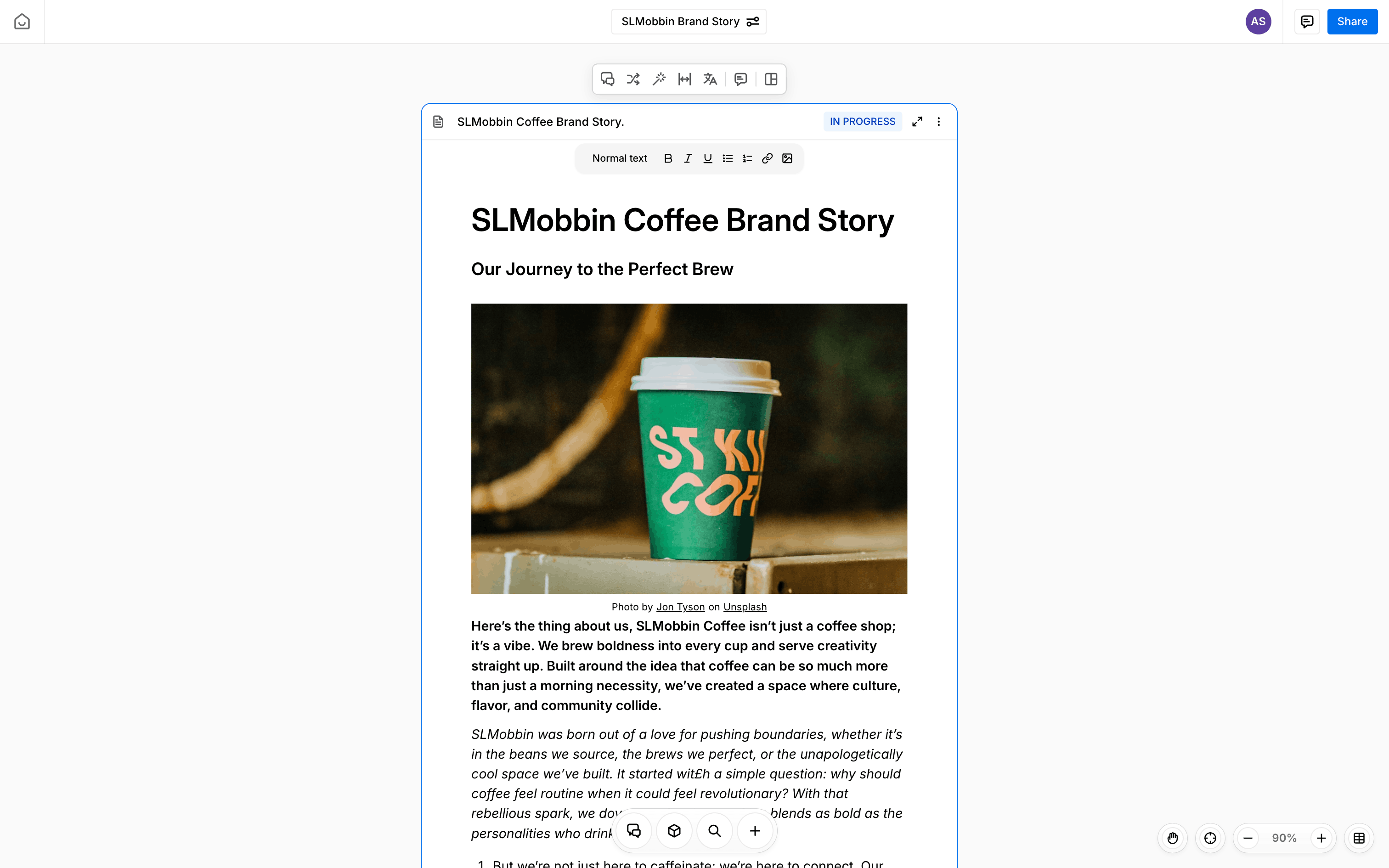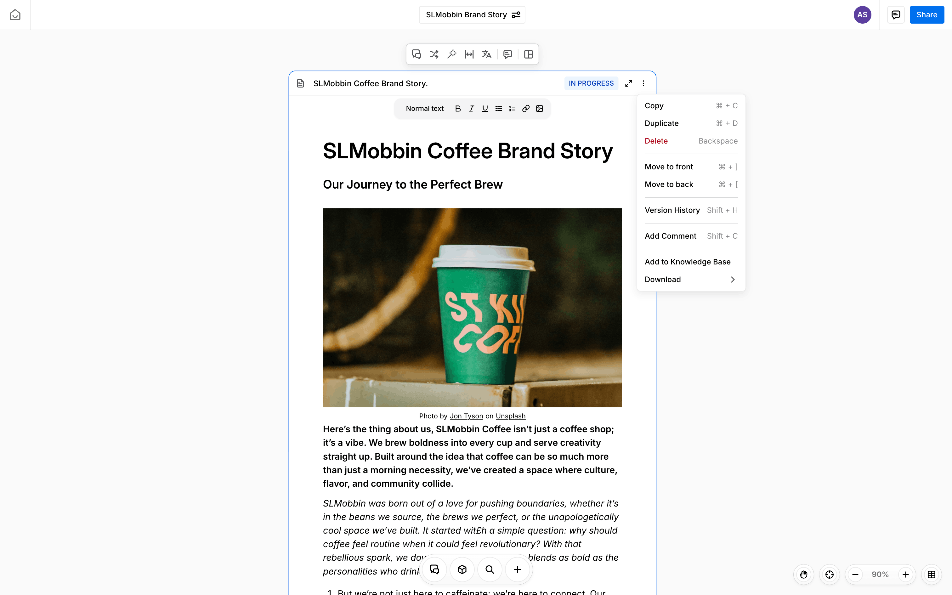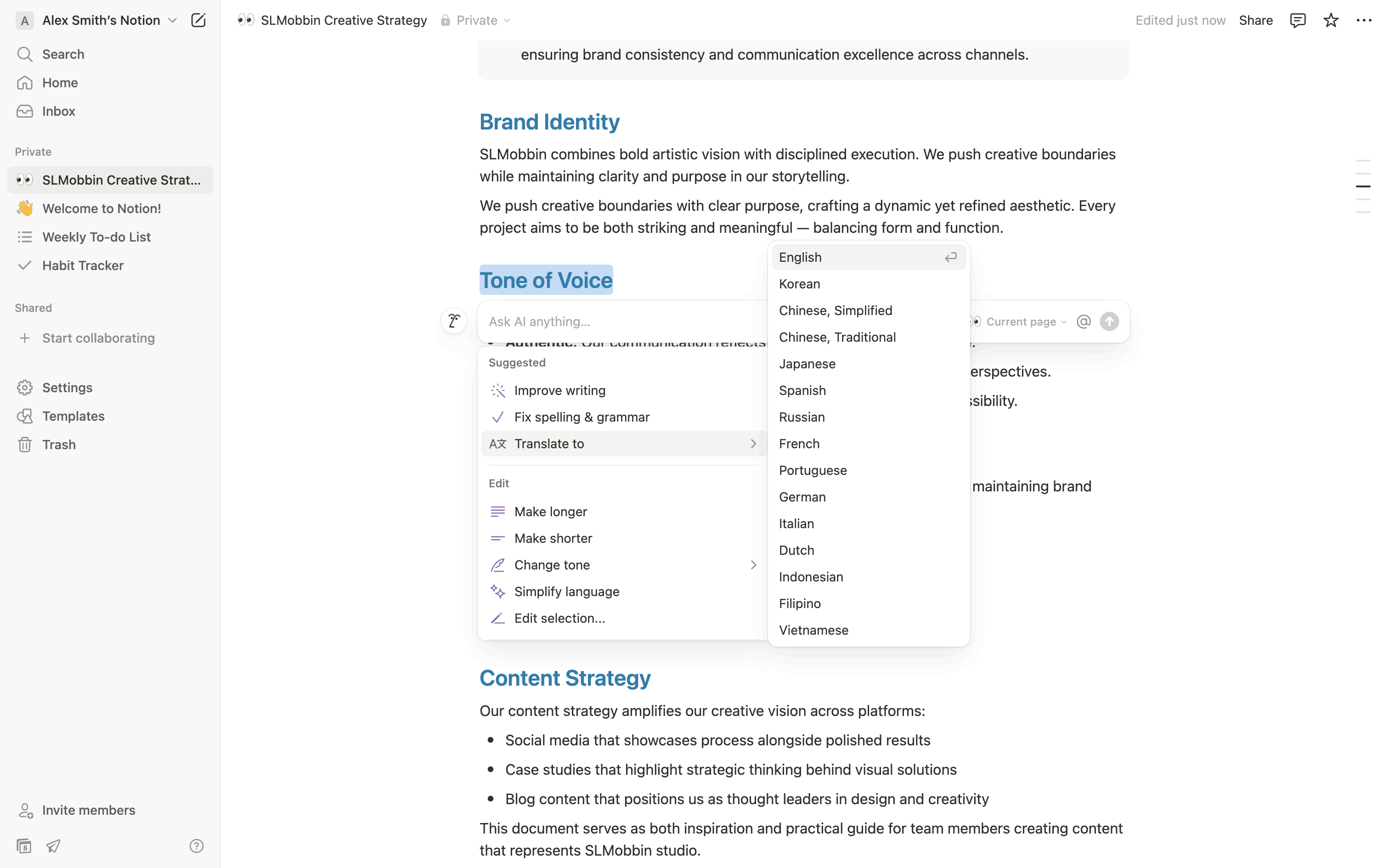 The user translates text within a document using AI. They select text, choose a language, and insert the translation.