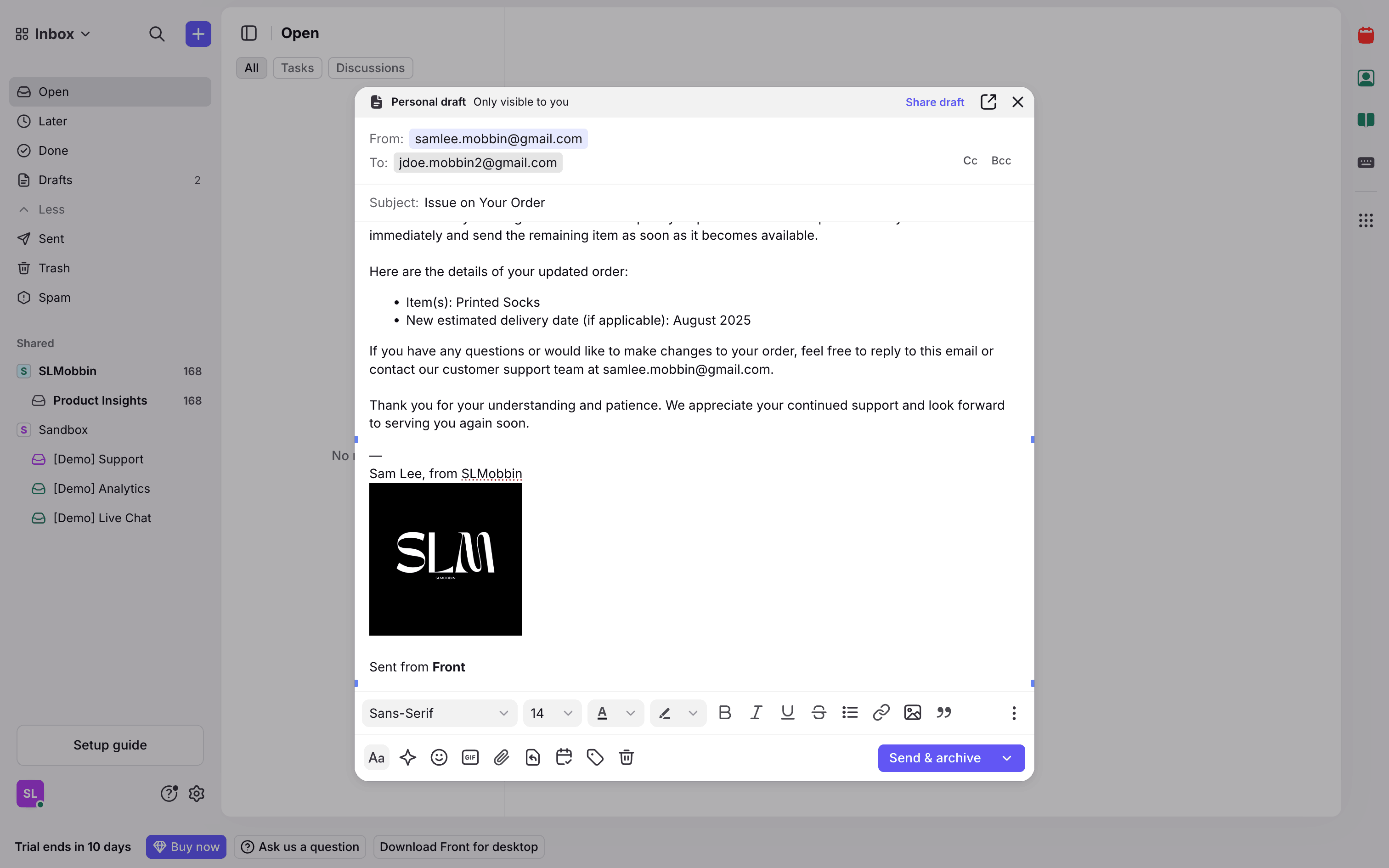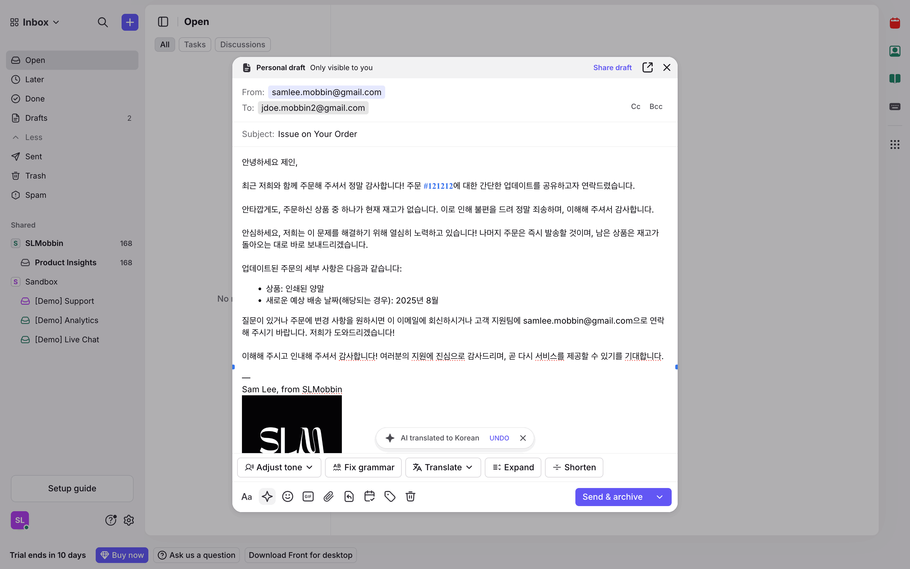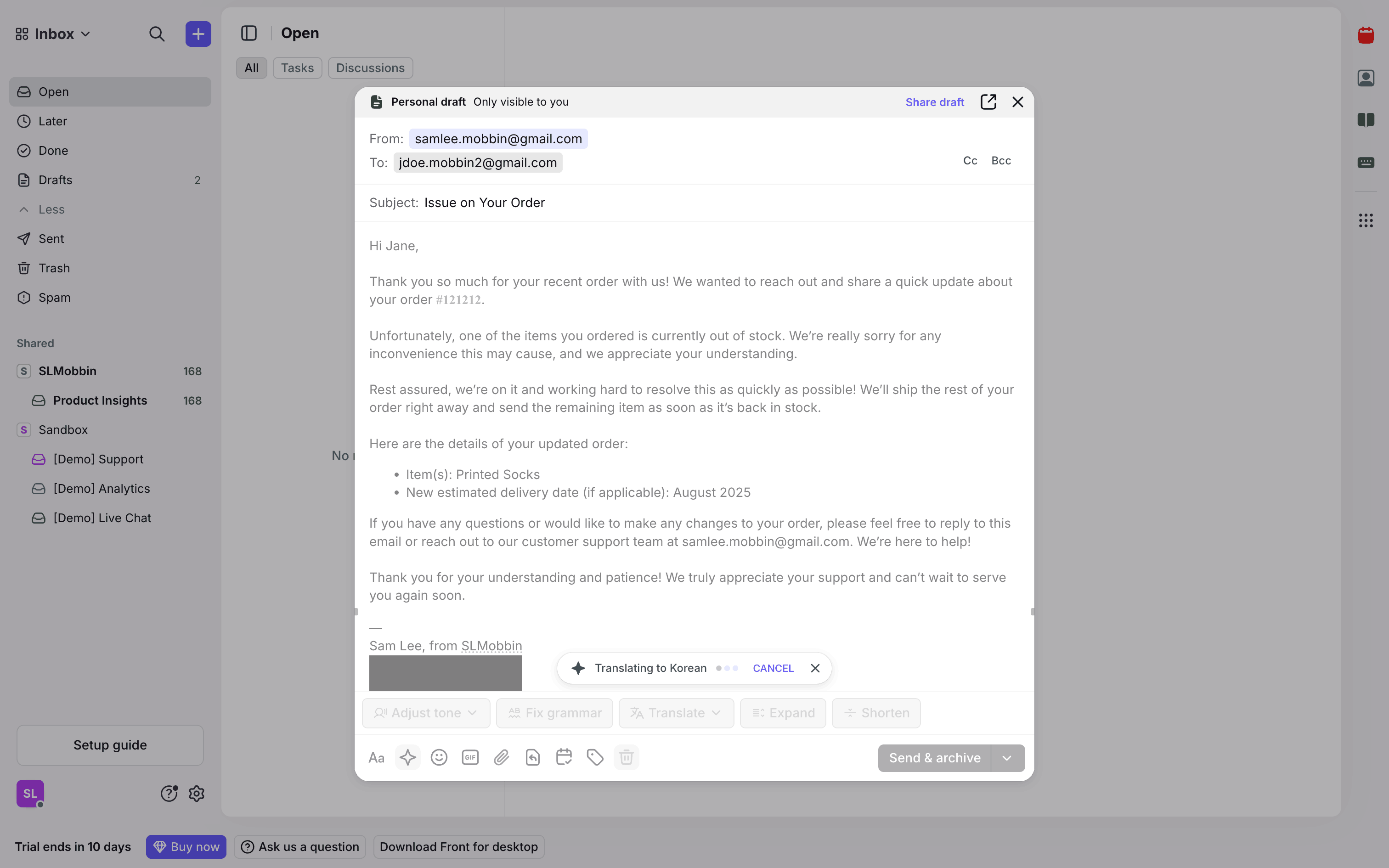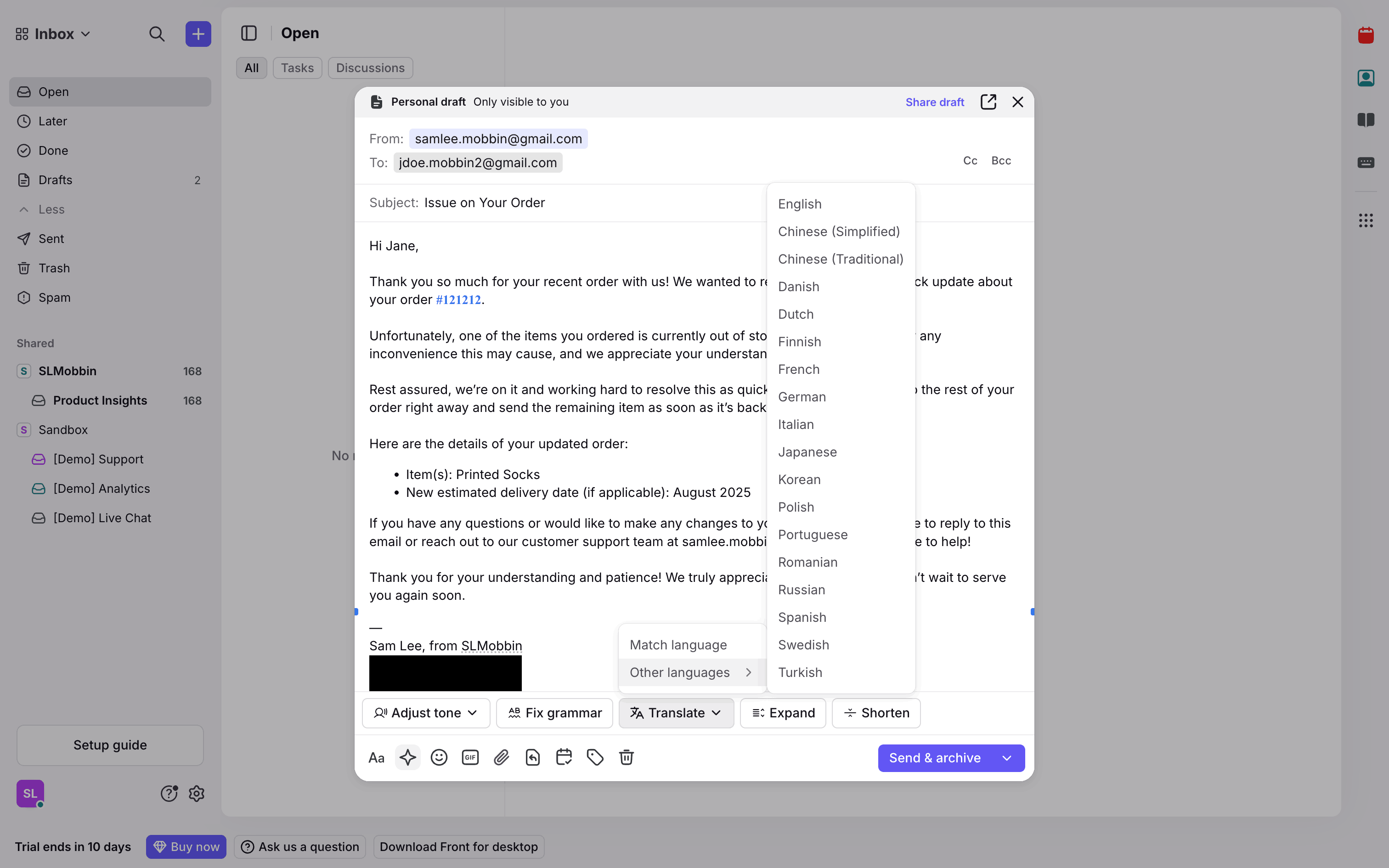 The user translates an email draft using the AI translate feature. They select a language and view the translated email.