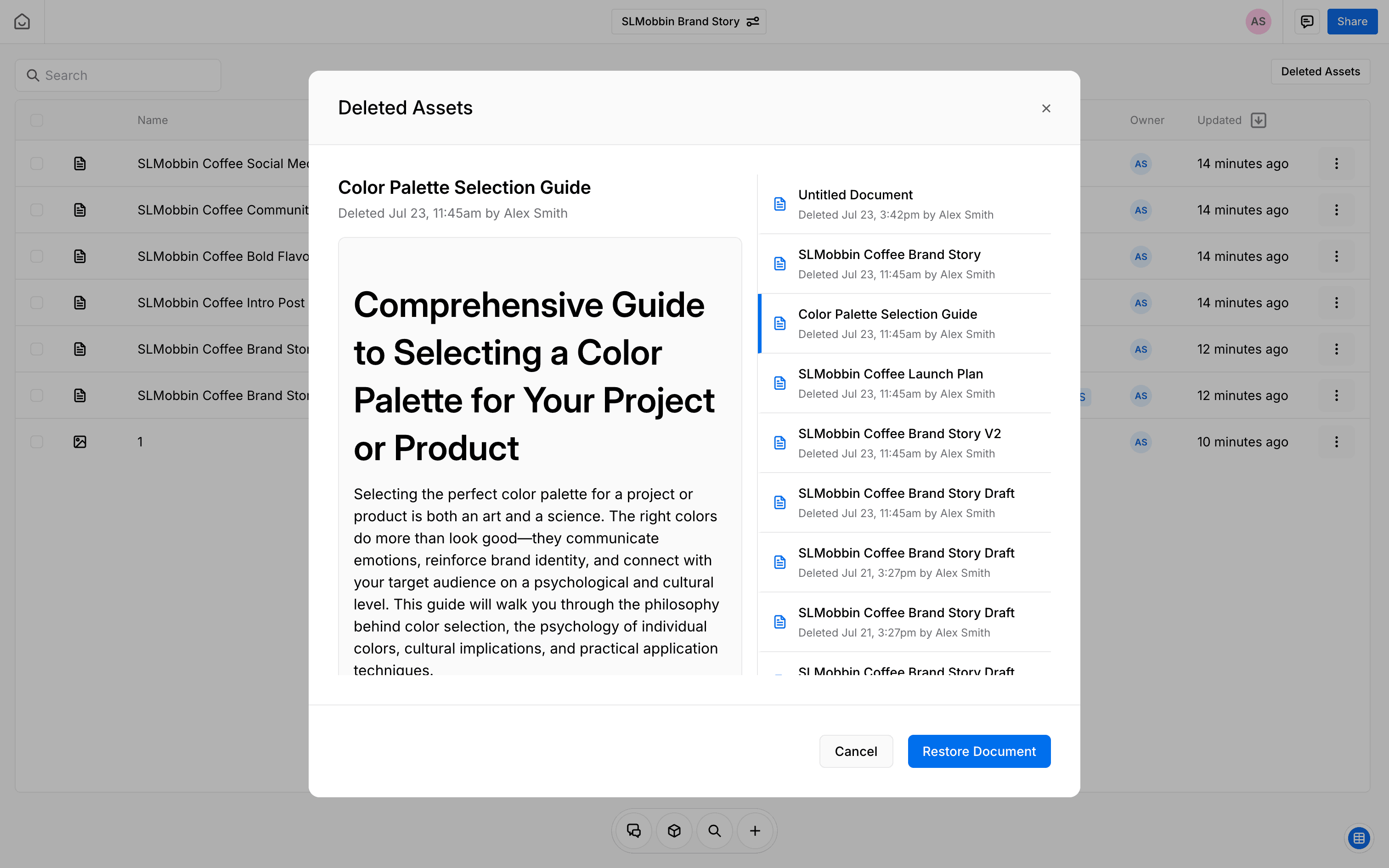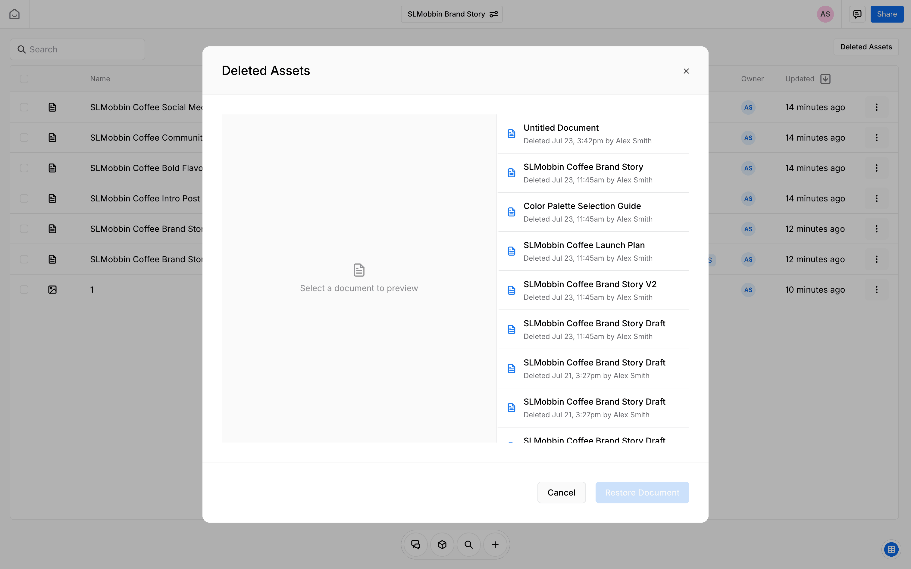 The user views a list of deleted assets, previews a selected asset, and restores it. The restored document is then displayed.