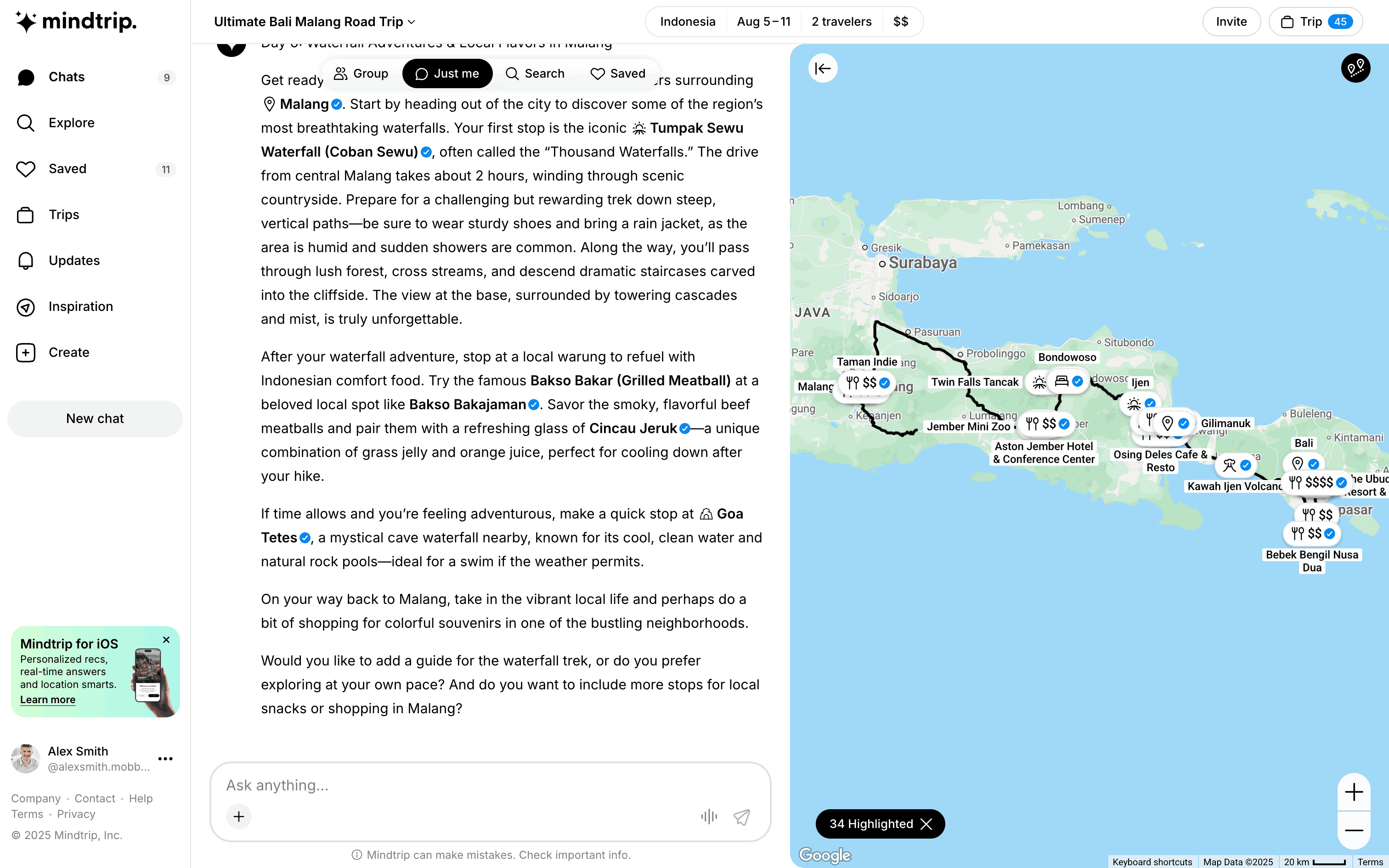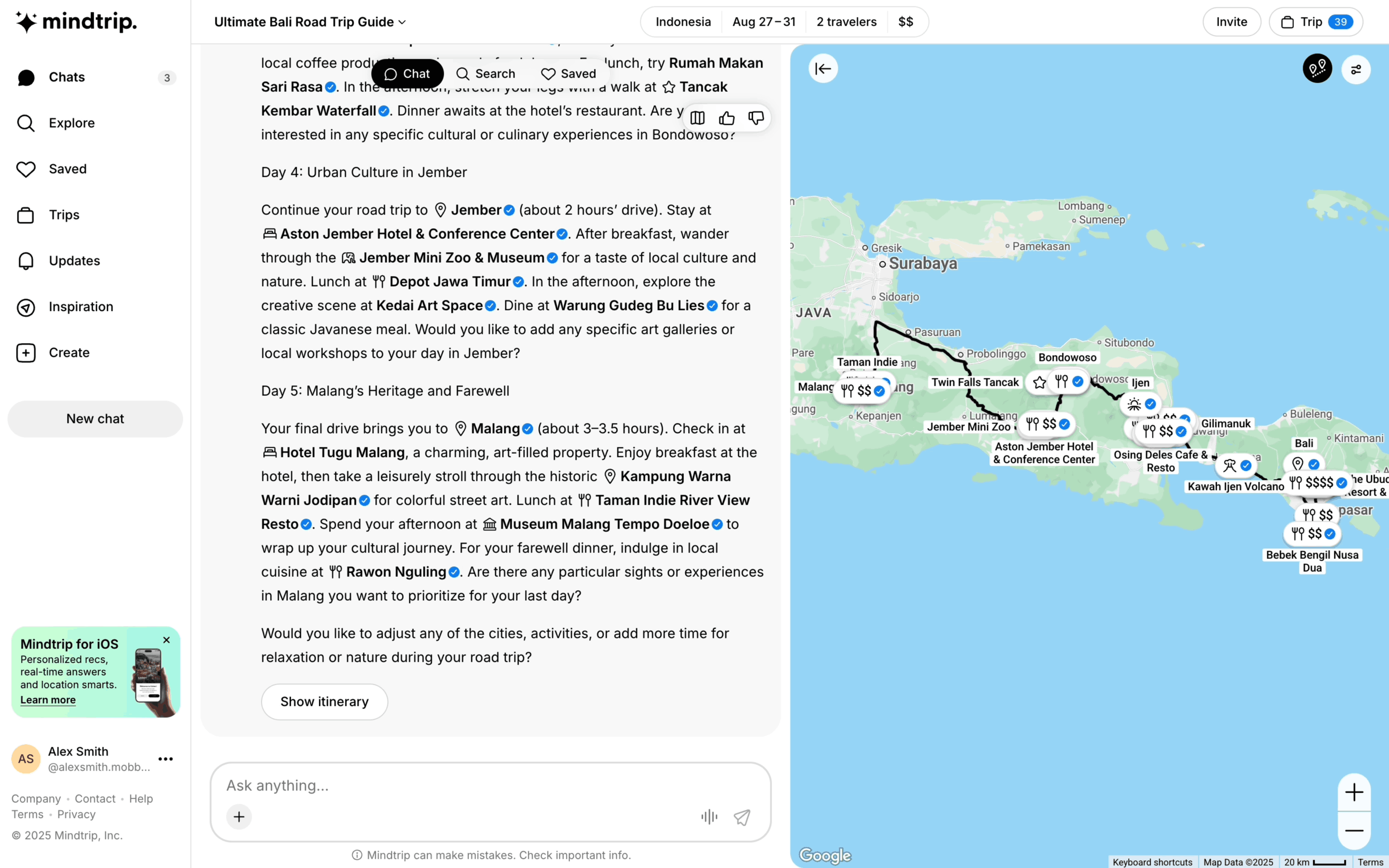 The user flow displays a travel itinerary and highlights specific locations on a map. The user can view the itinerary and see the highlighted locations.