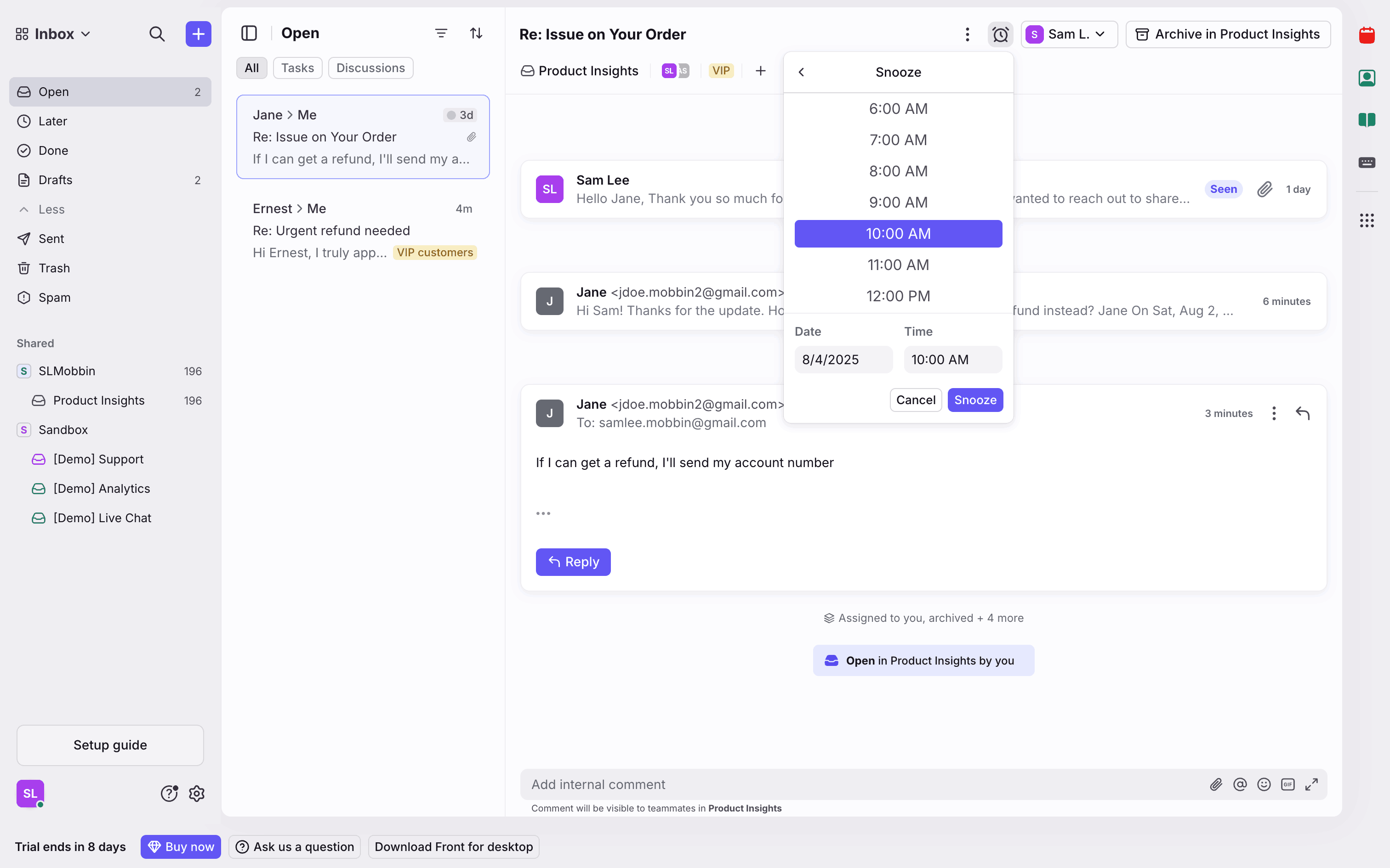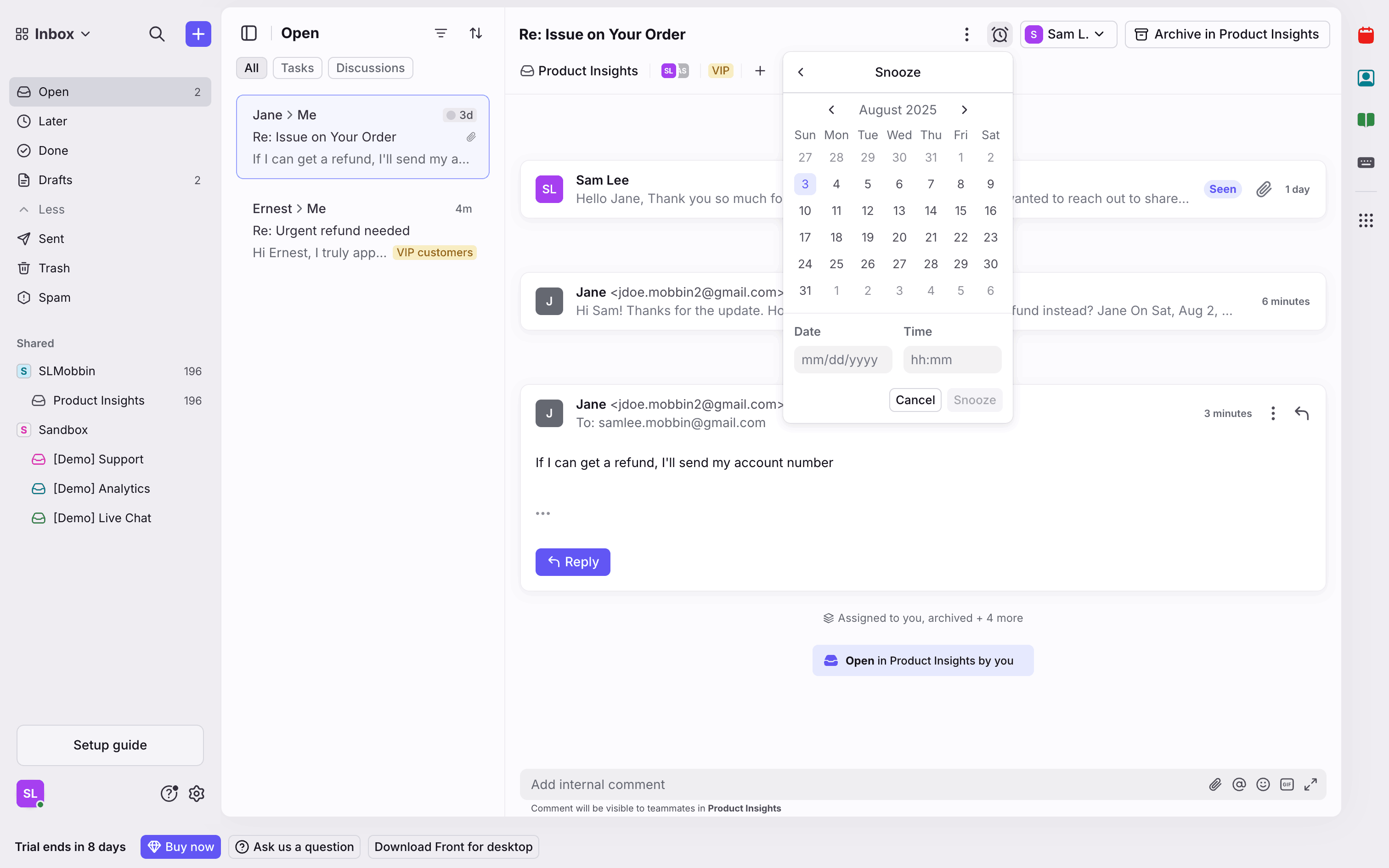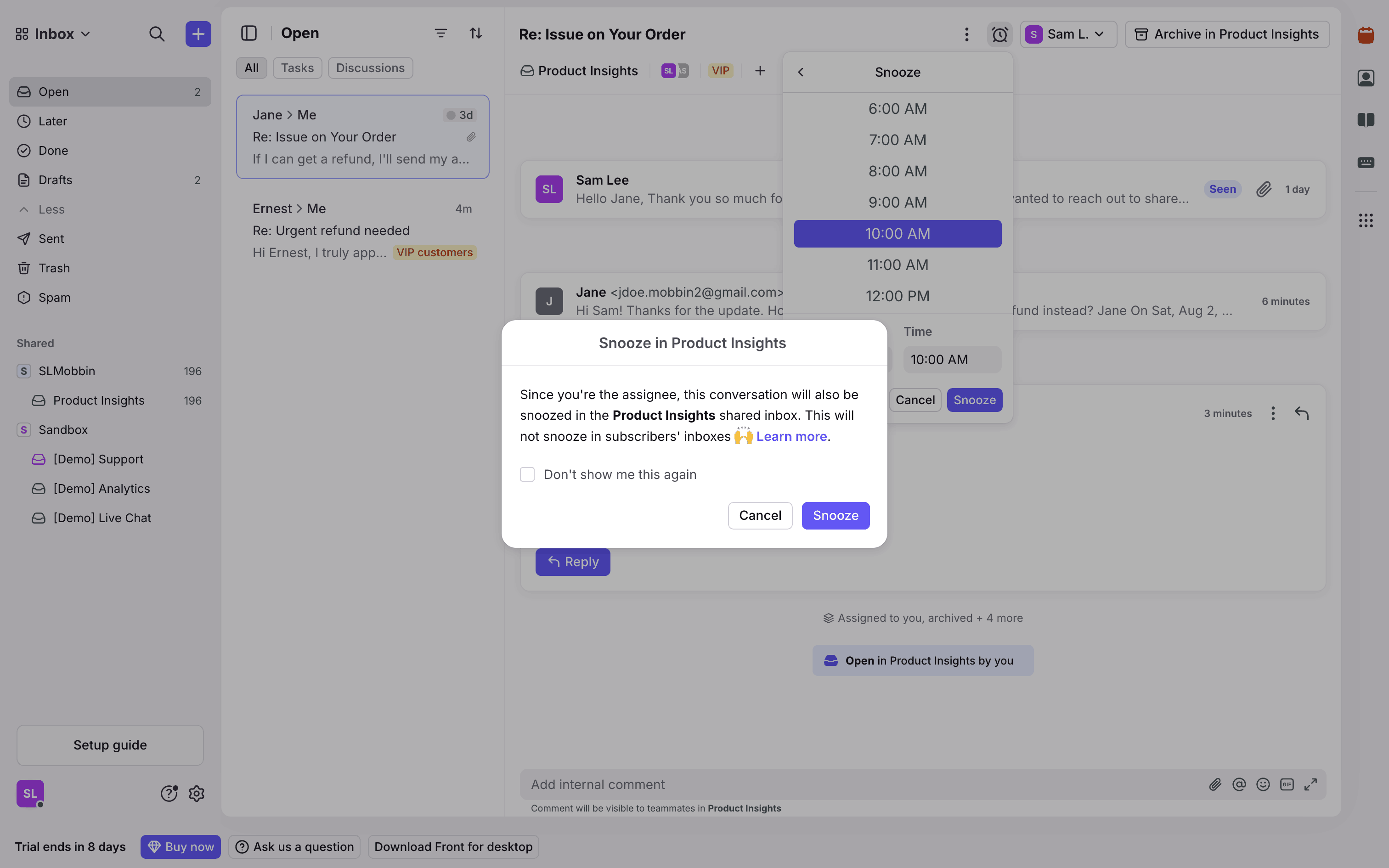 The user snoozes a conversation by selecting a date and time. A confirmation message appears after the action.