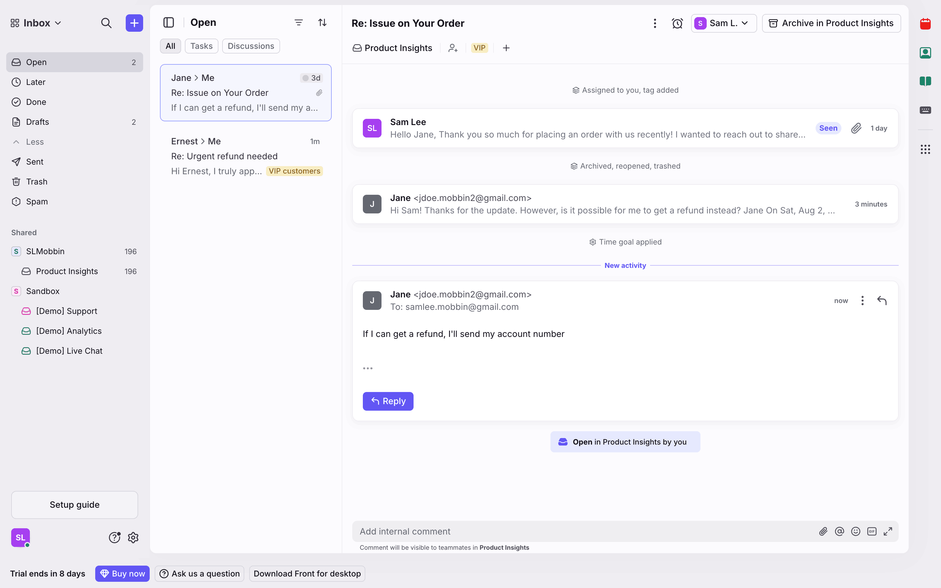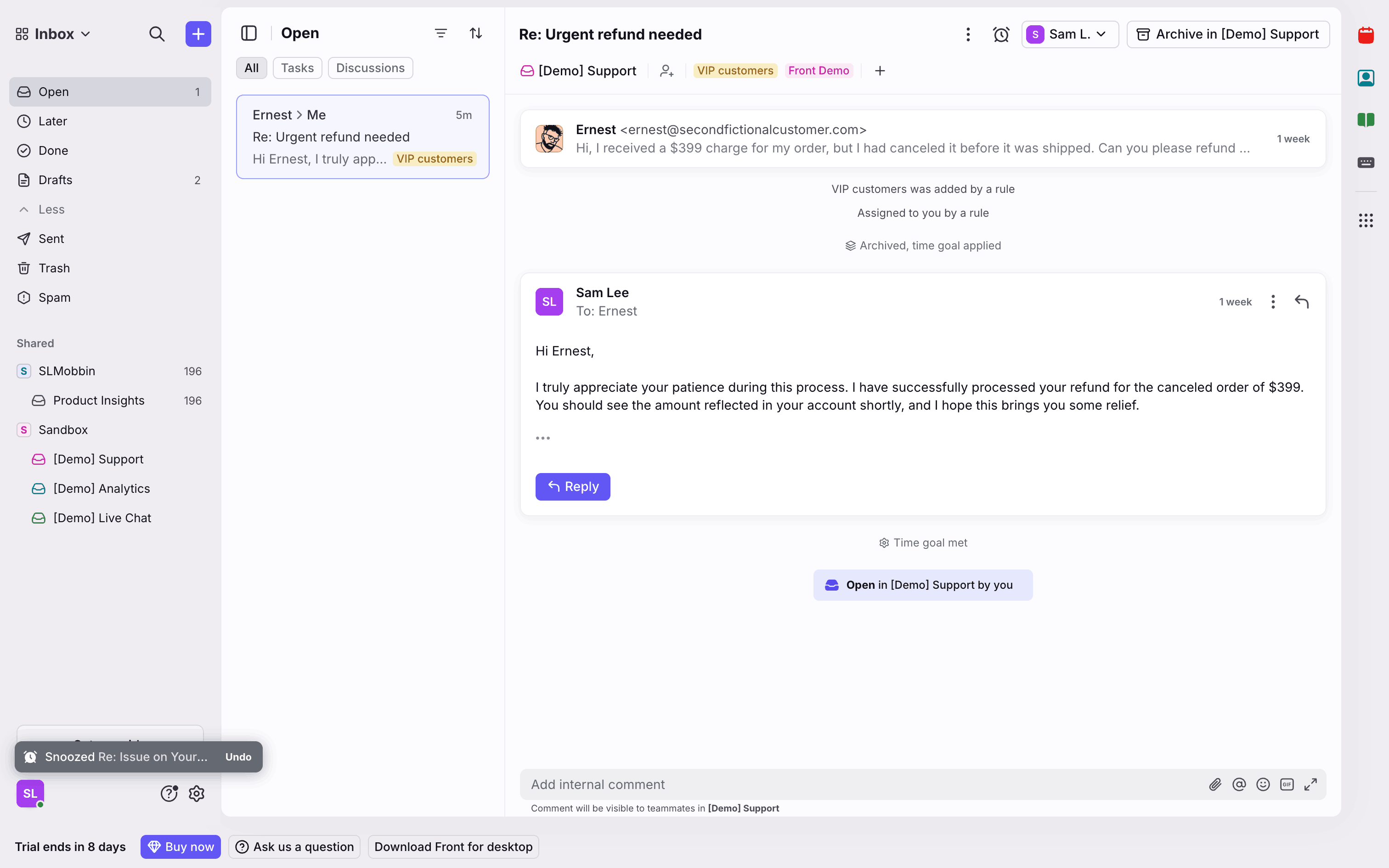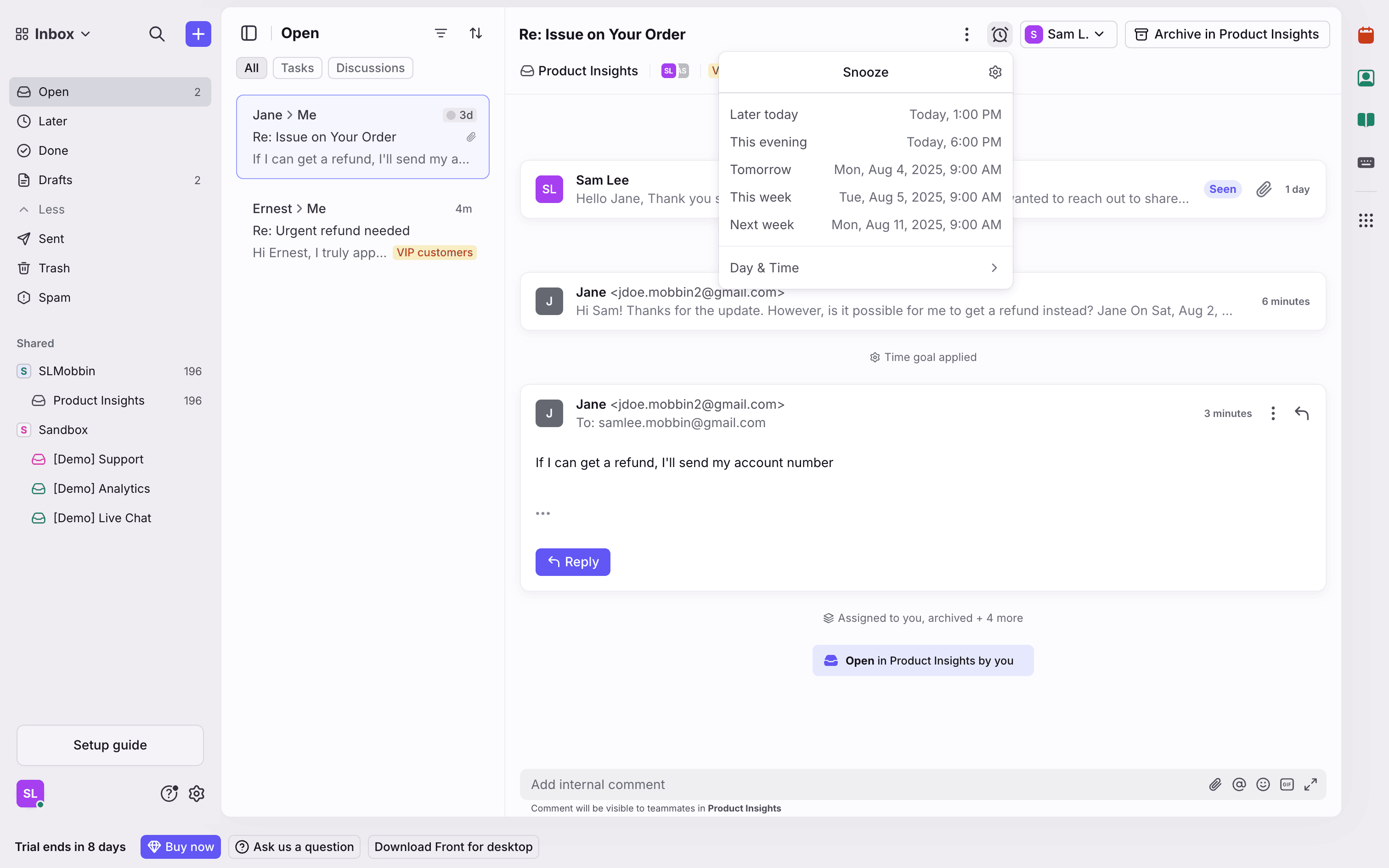 The user snoozes a conversation by selecting a date and time. A confirmation message appears after the action.