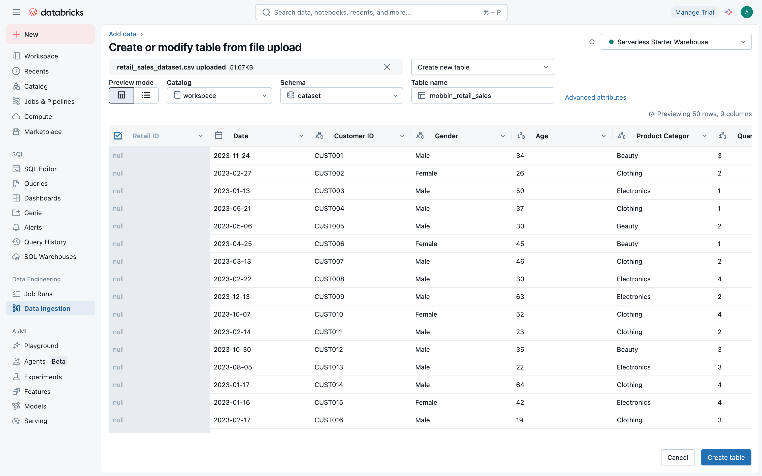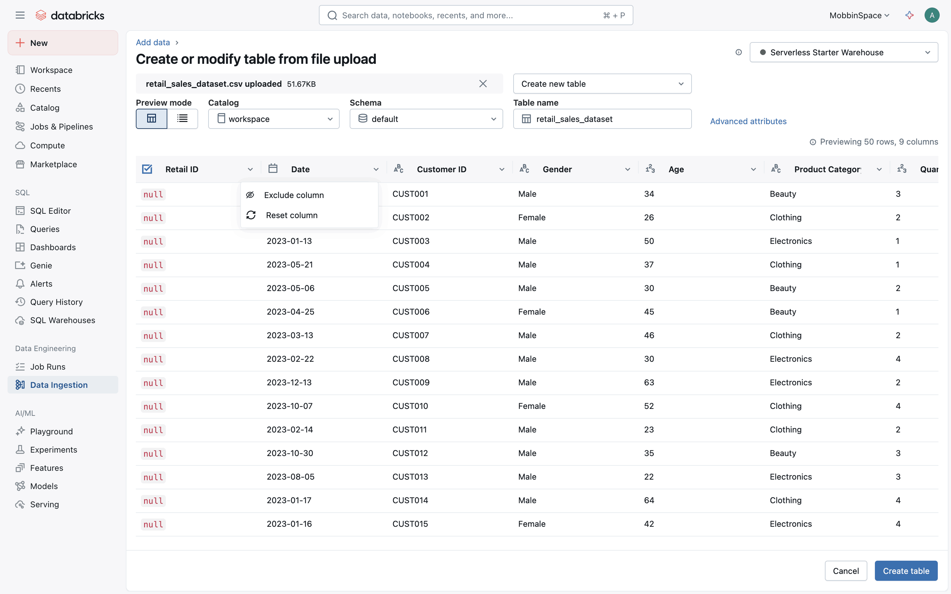 The user uploads a file, previews the data table, and then excludes the "Retail ID" column. Finally, the user can create the table.