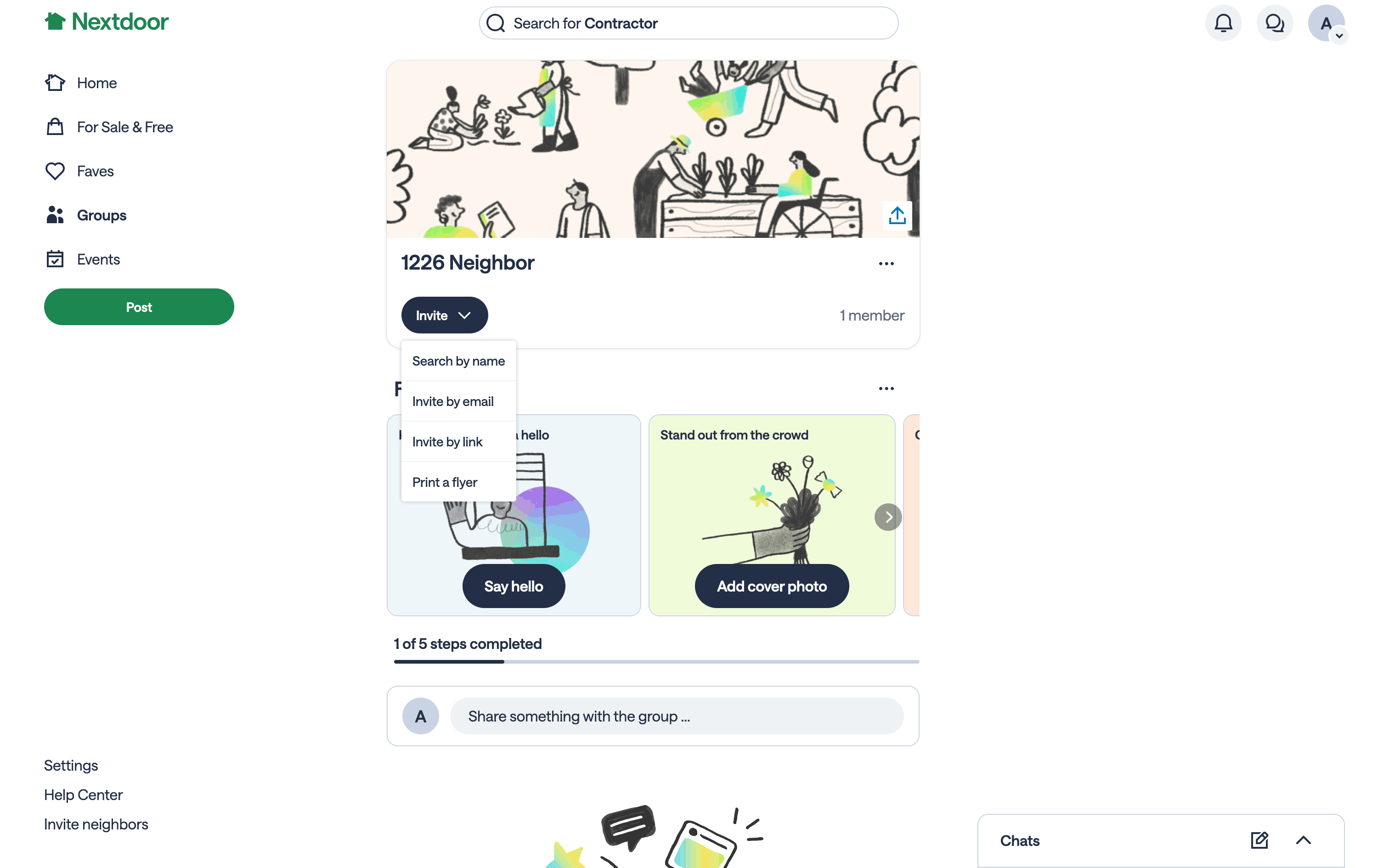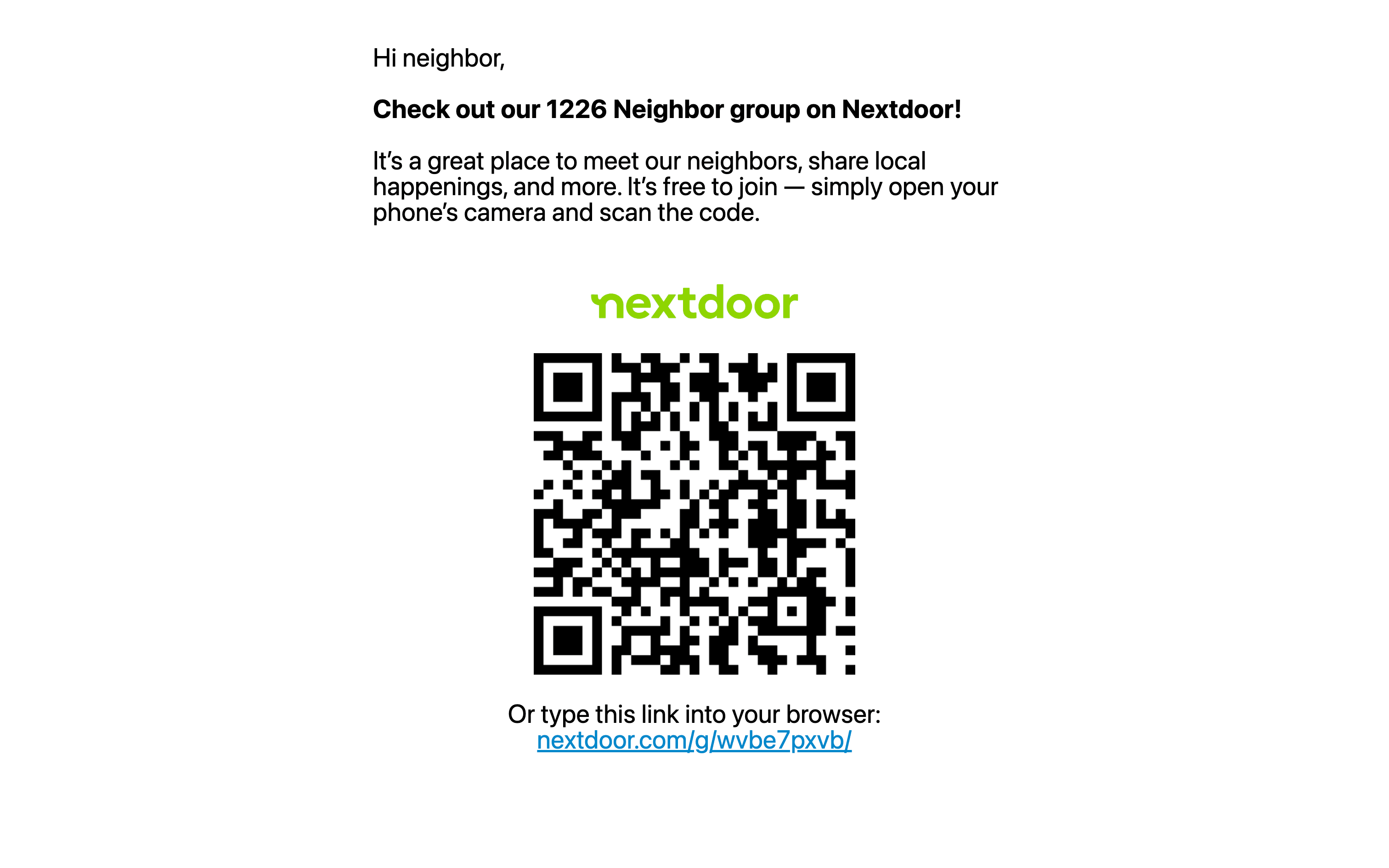 The user flow demonstrates printing a flyer to invite people to a Nextdoor group. It involves navigating to the group page, selecting the invite option, and generating the flyer.