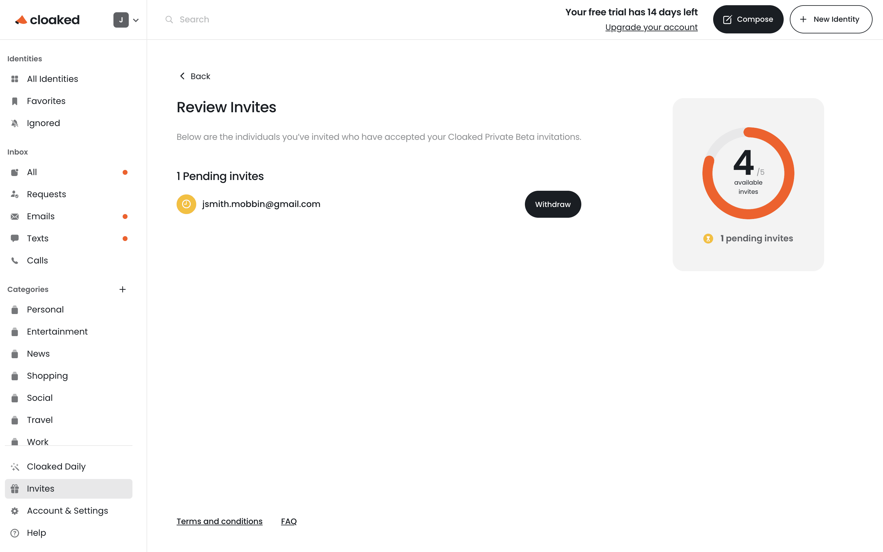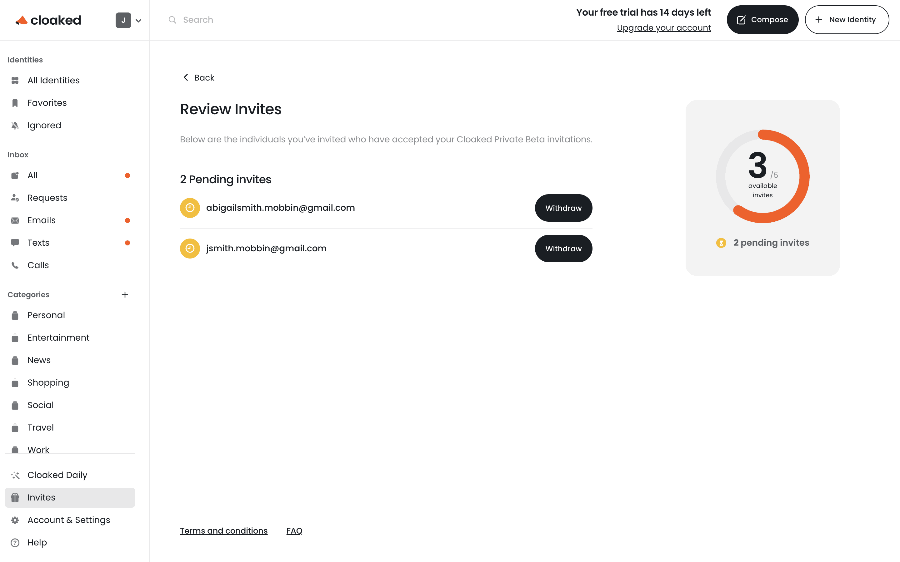 The user views a list of pending invites and withdraws one of them. The UI updates to reflect the change in pending invites and available invites.