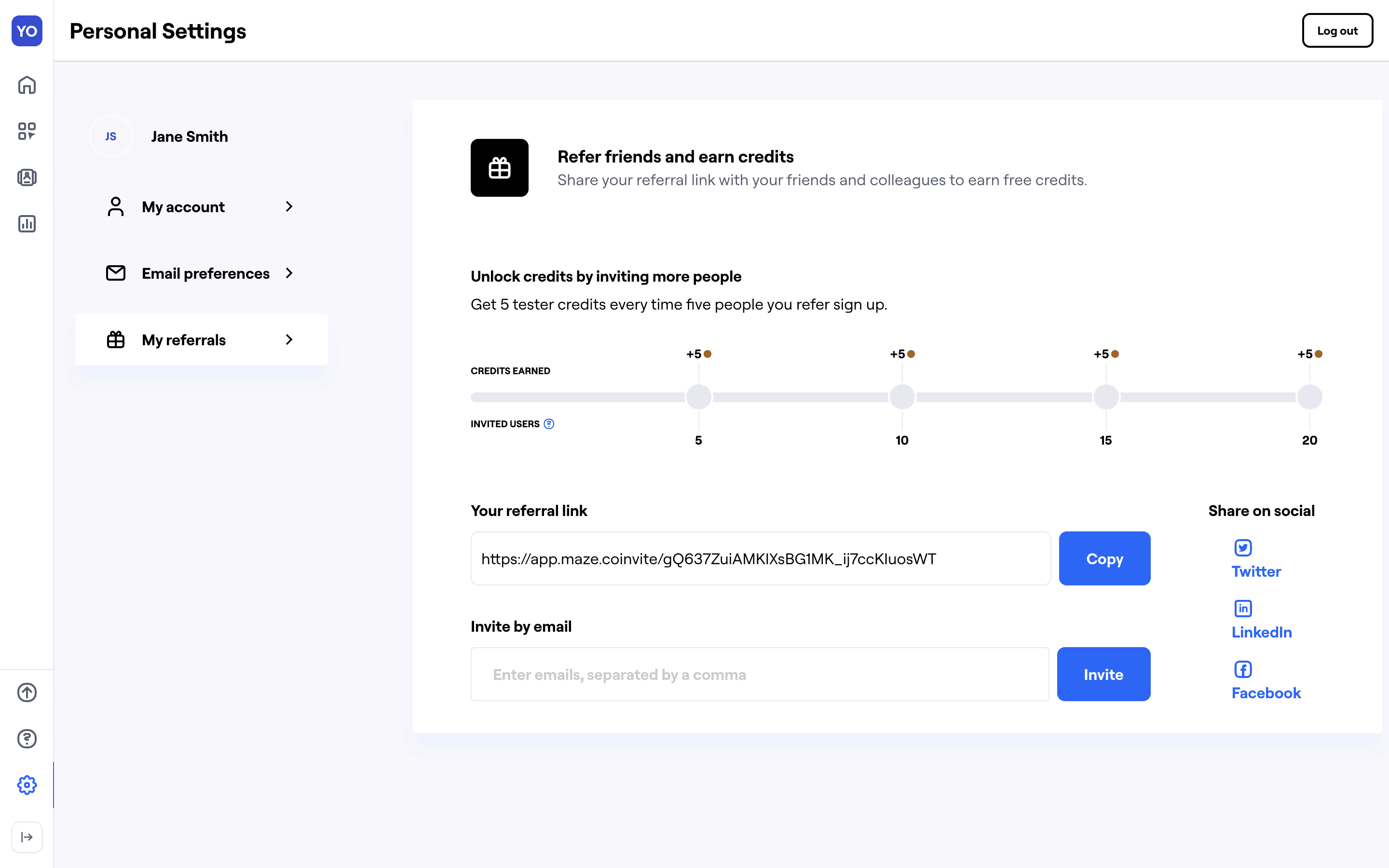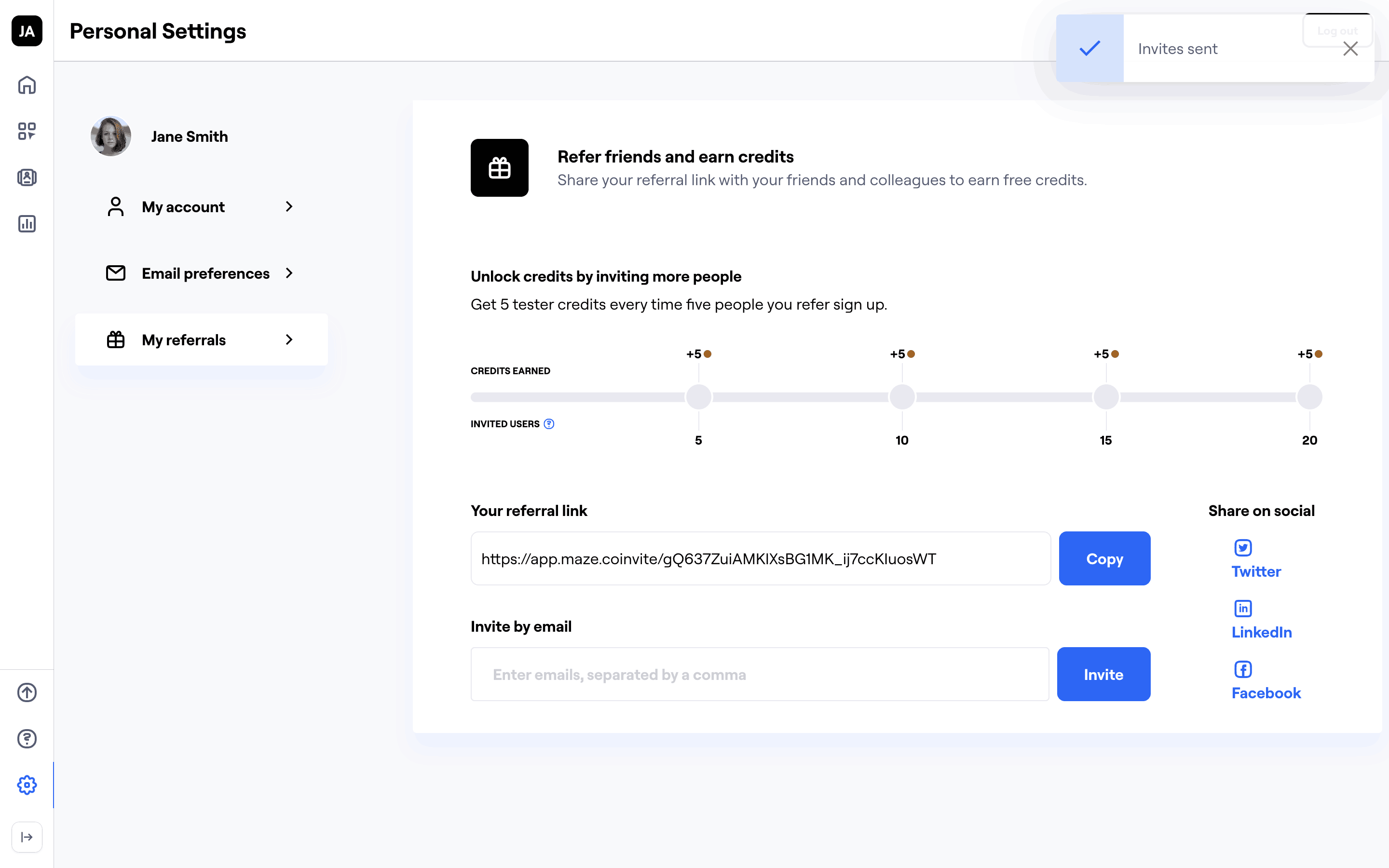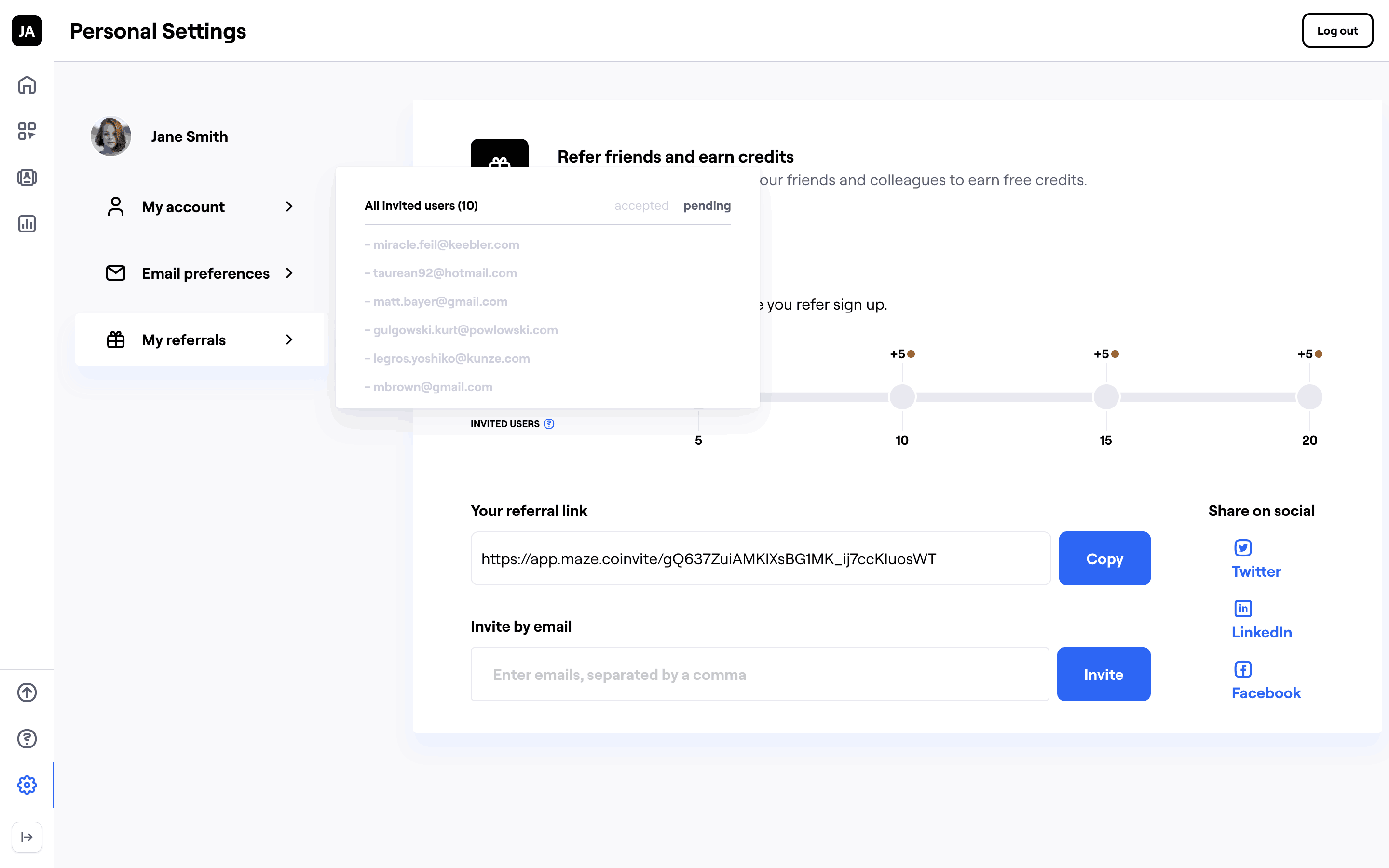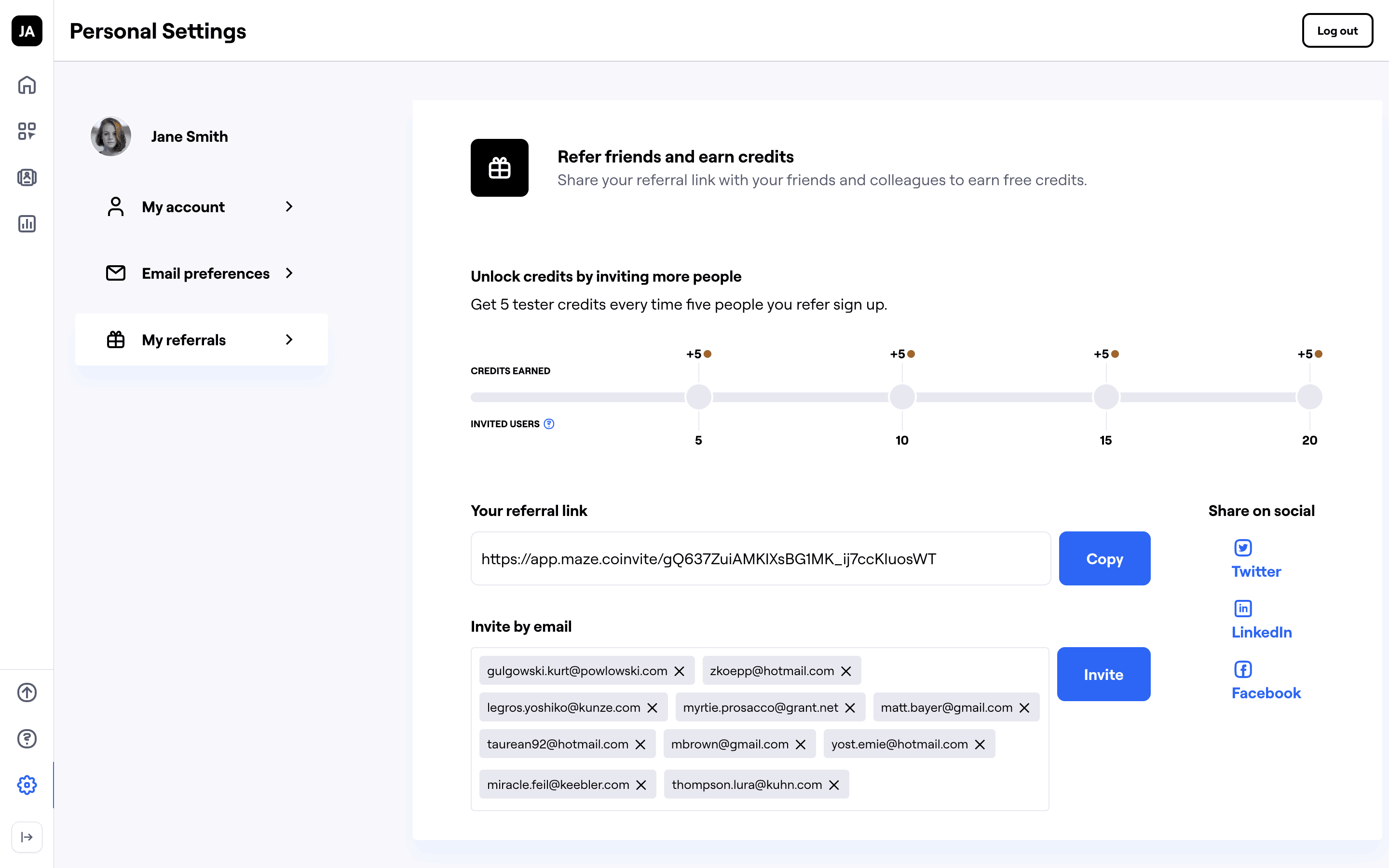 The user refers friends by entering email addresses, sending invites, and then viewing a list of all invited users. The goal is to earn credits by inviting more people.