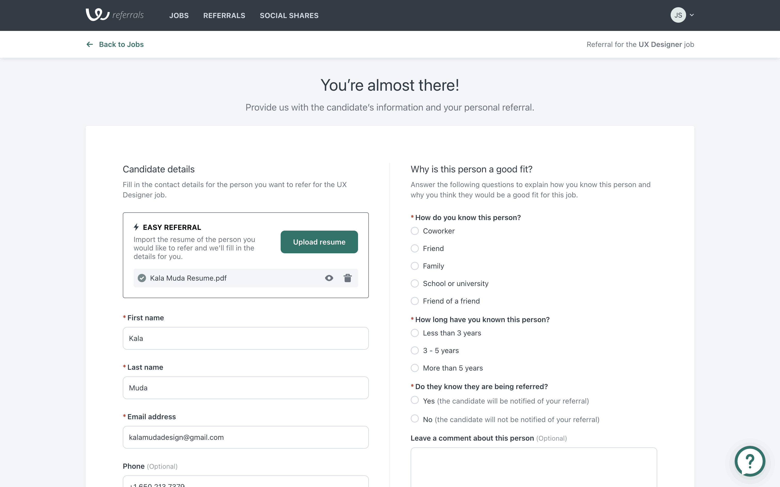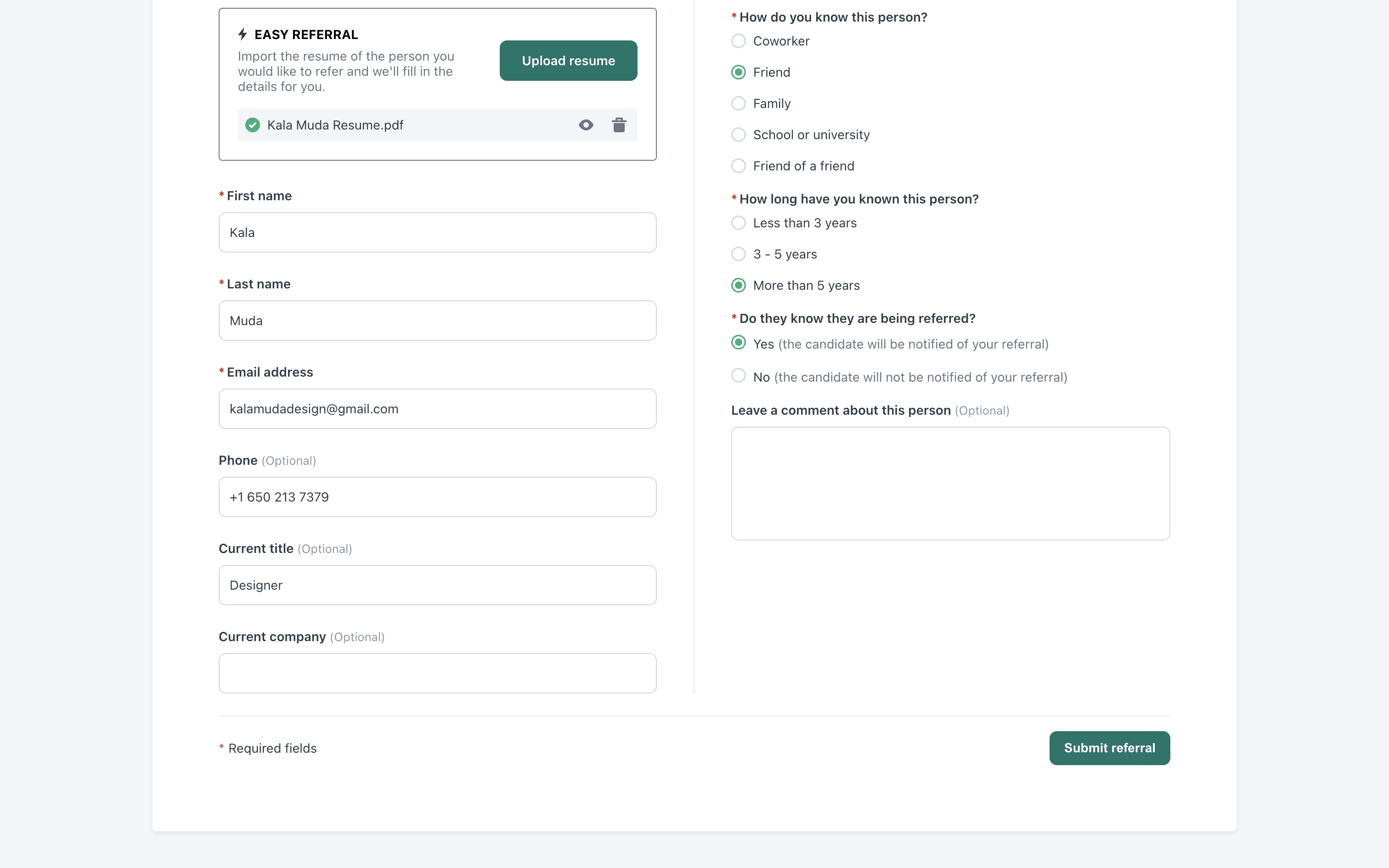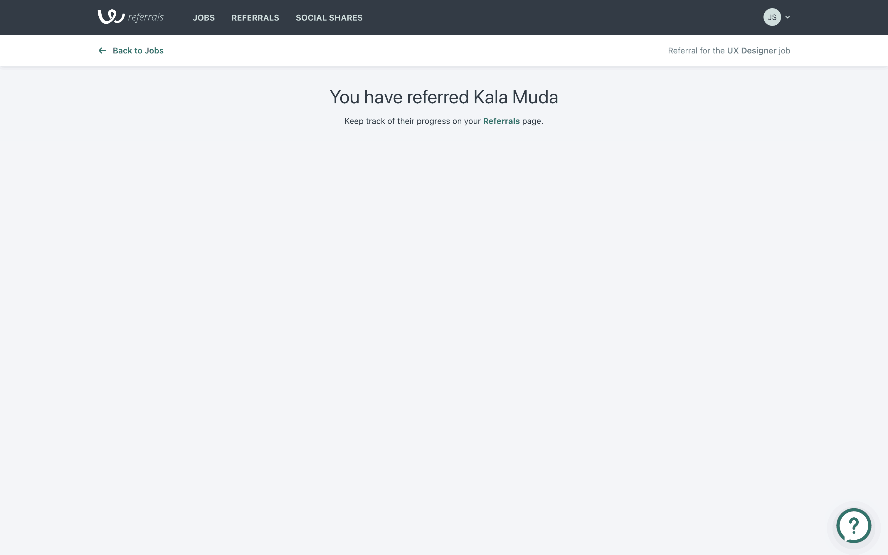 The user refers a candidate for a job by filling out a referral form. The flow ends with a confirmation message.