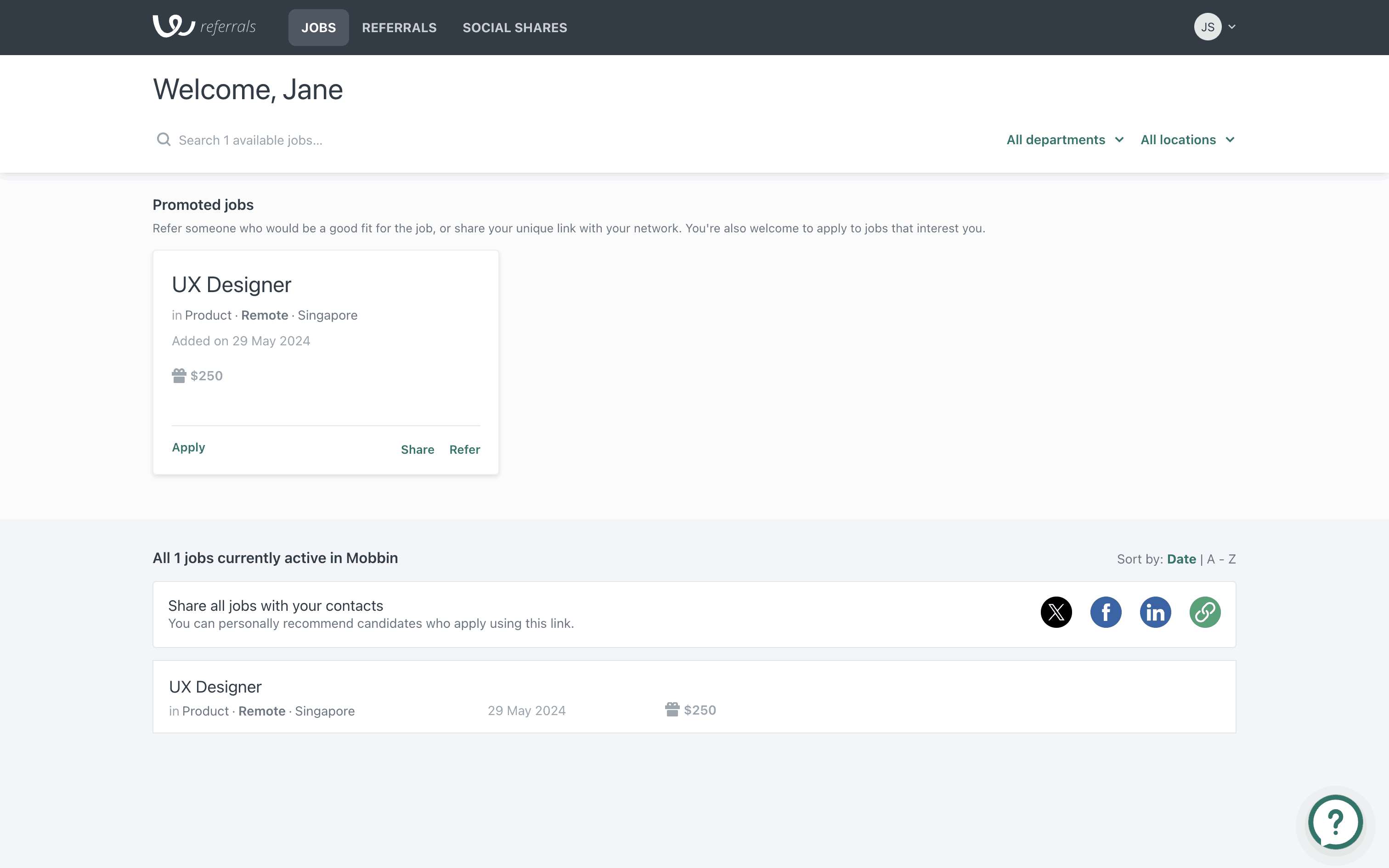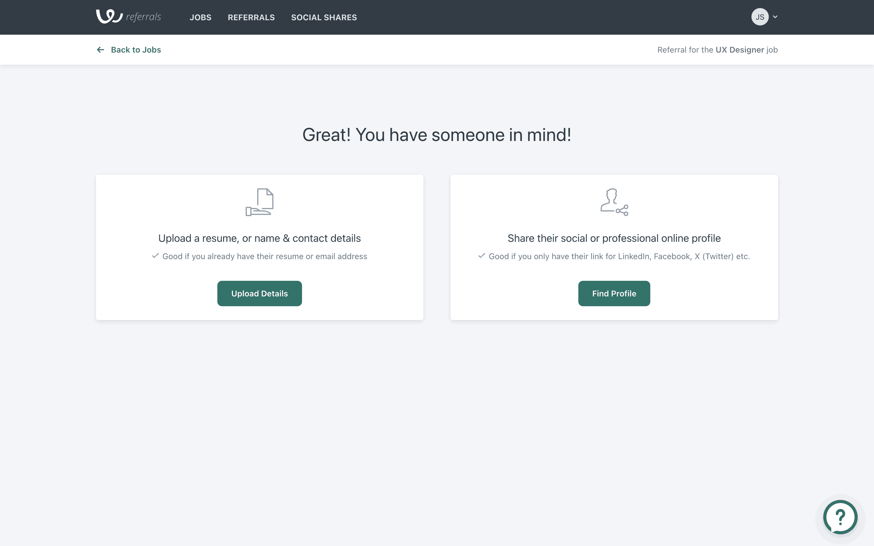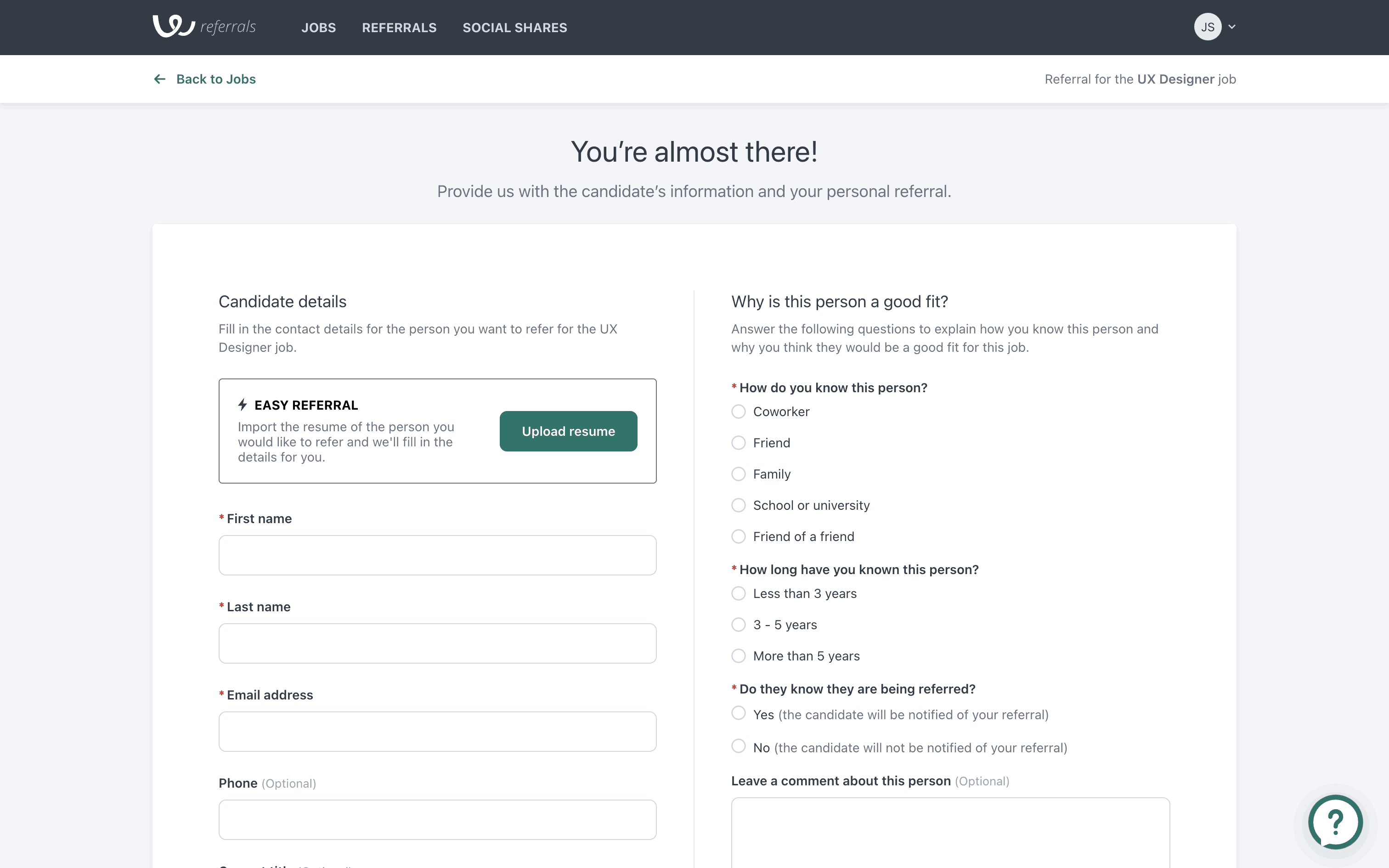 The user refers a candidate for a job by filling out a referral form. The flow ends with a confirmation message.