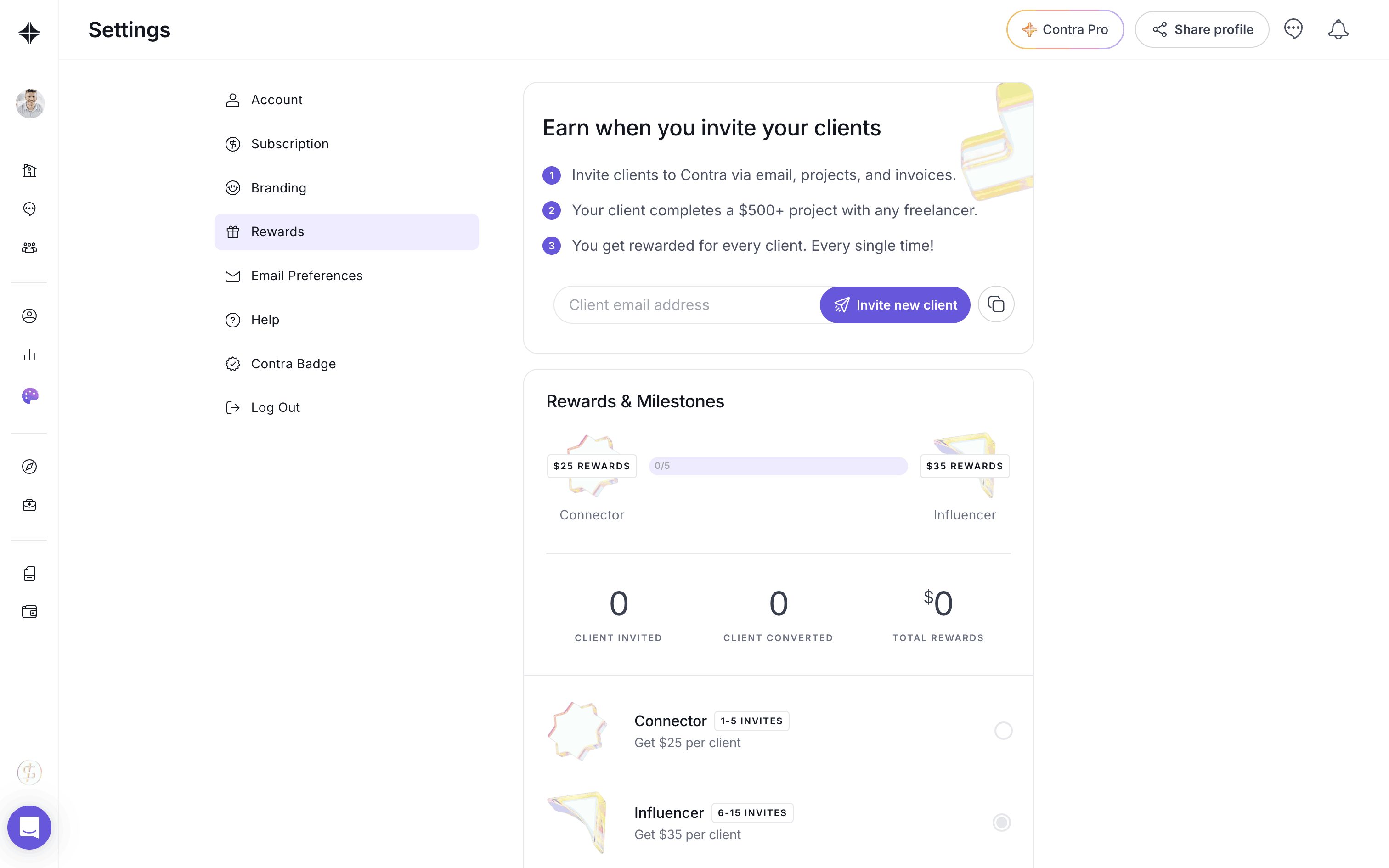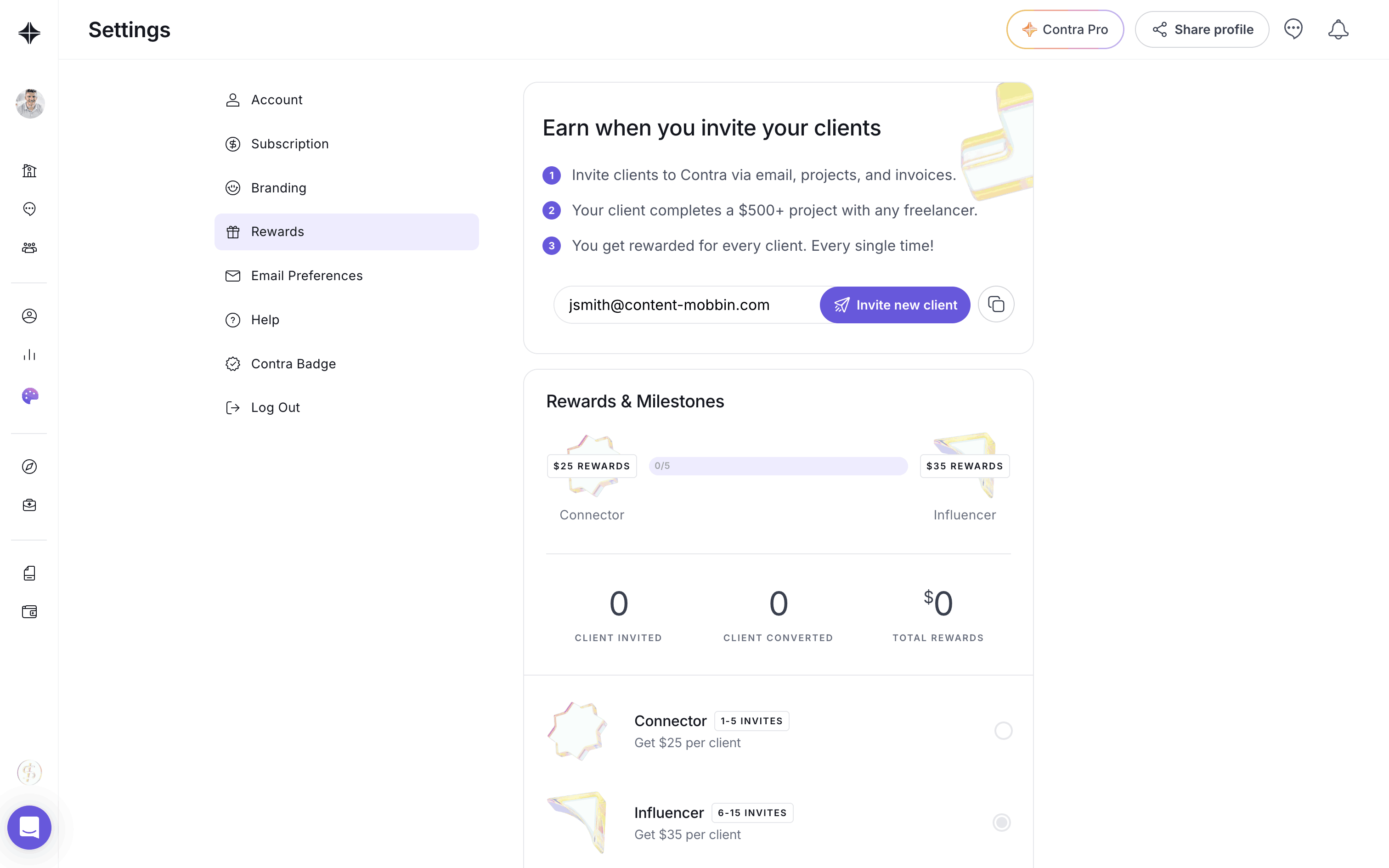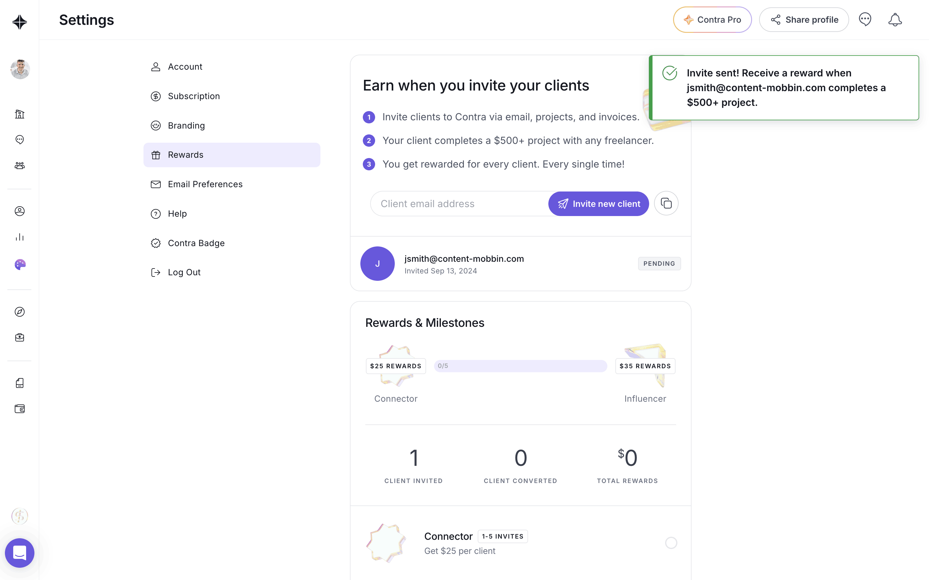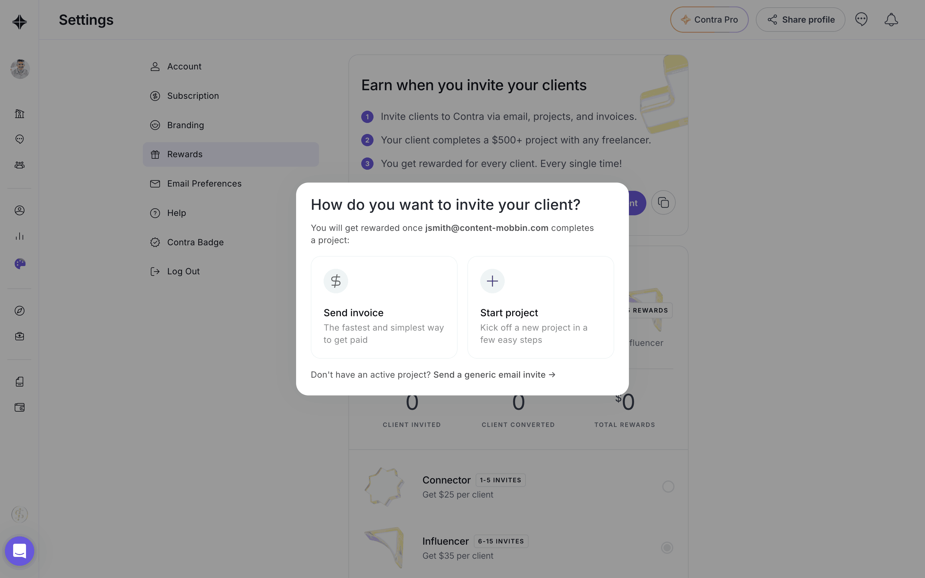 The user navigates to the rewards section, invites a client by email, selects an invitation method, and receives confirmation. The goal is to refer a client and earn rewards.