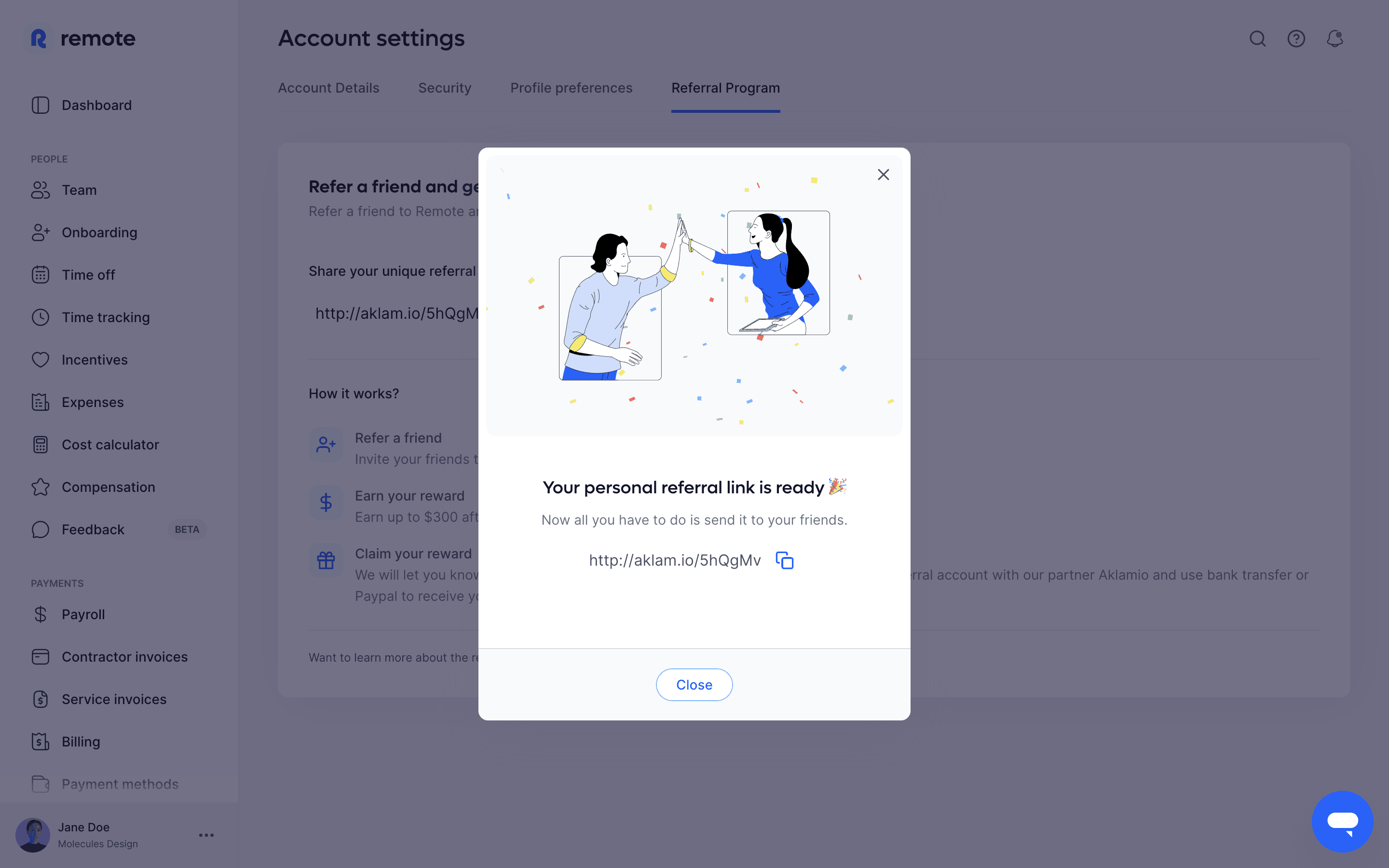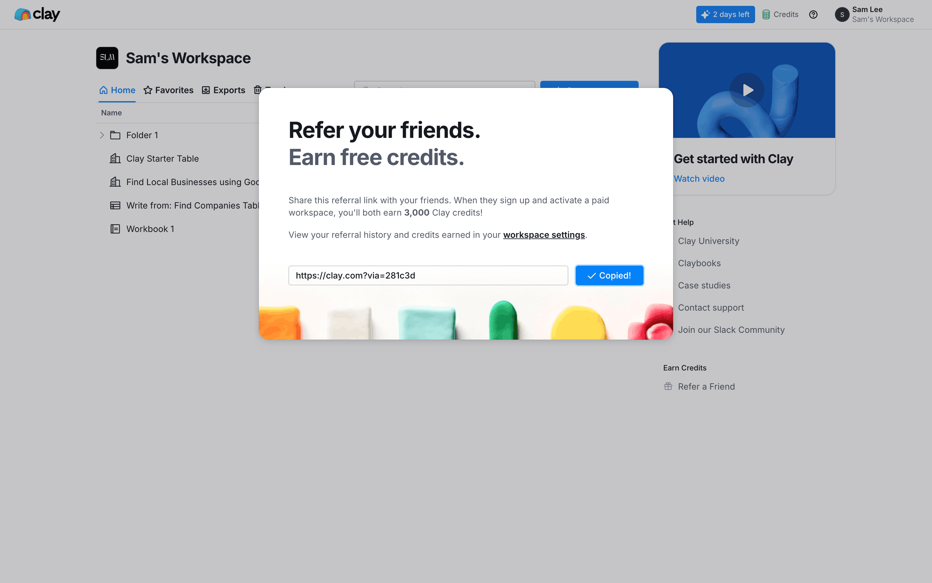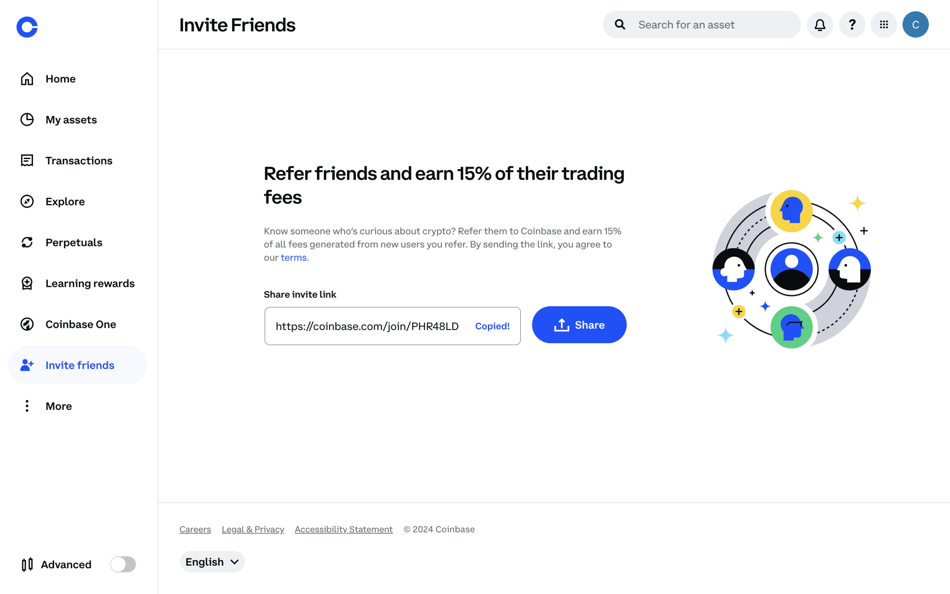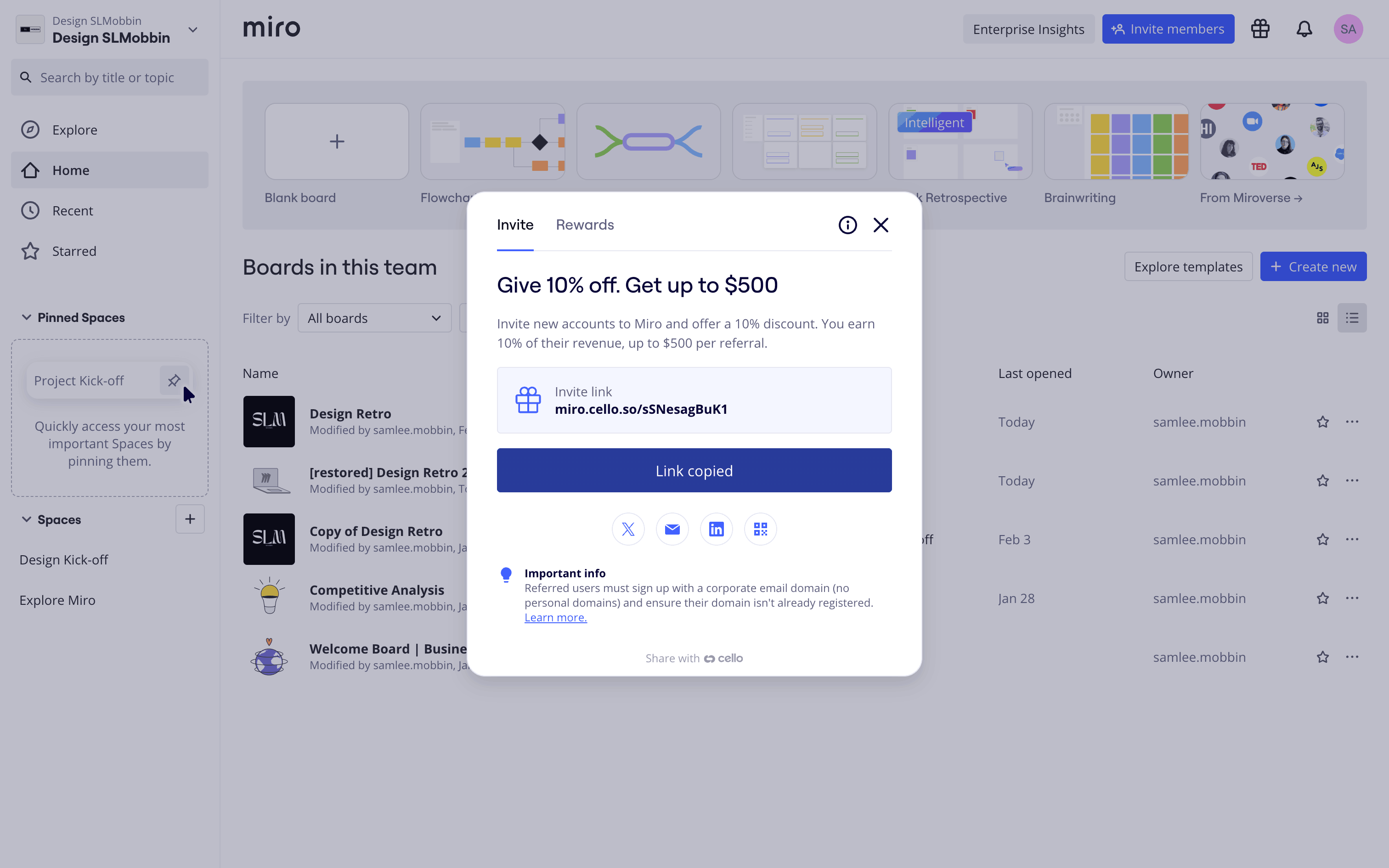 The user navigates to the referral link sharing modal and copies the referral link to share with others.