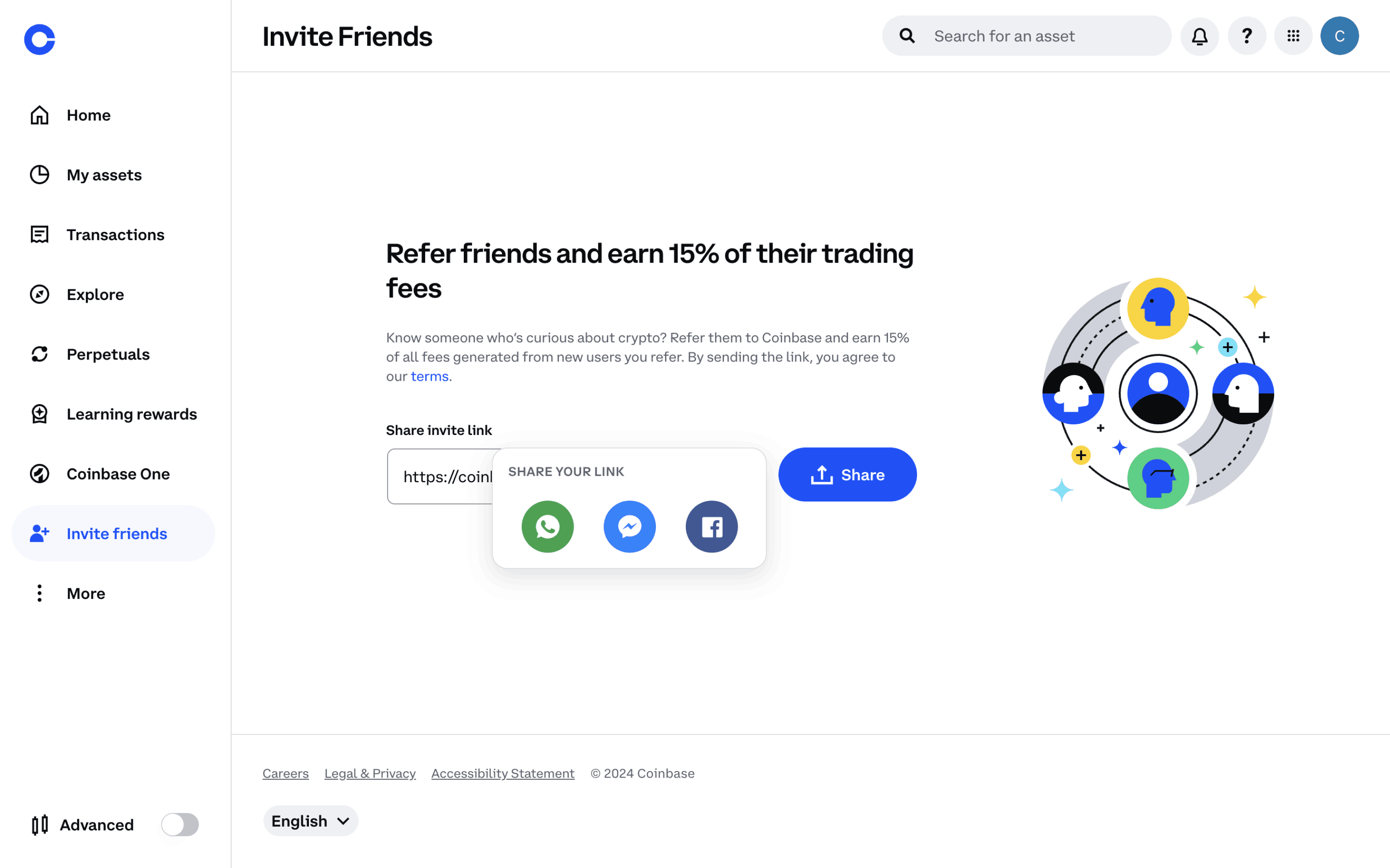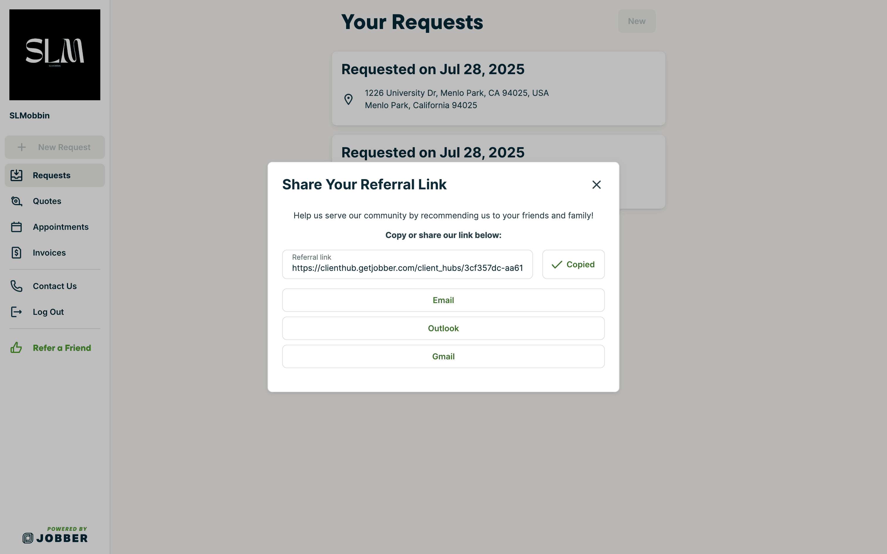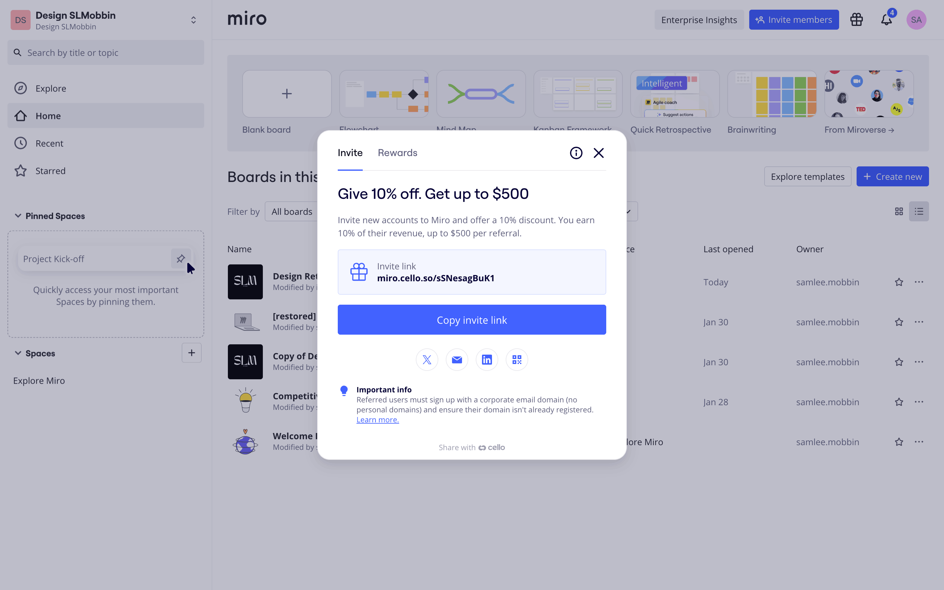 The user navigates to the referral link sharing modal and copies the referral link to share with others.