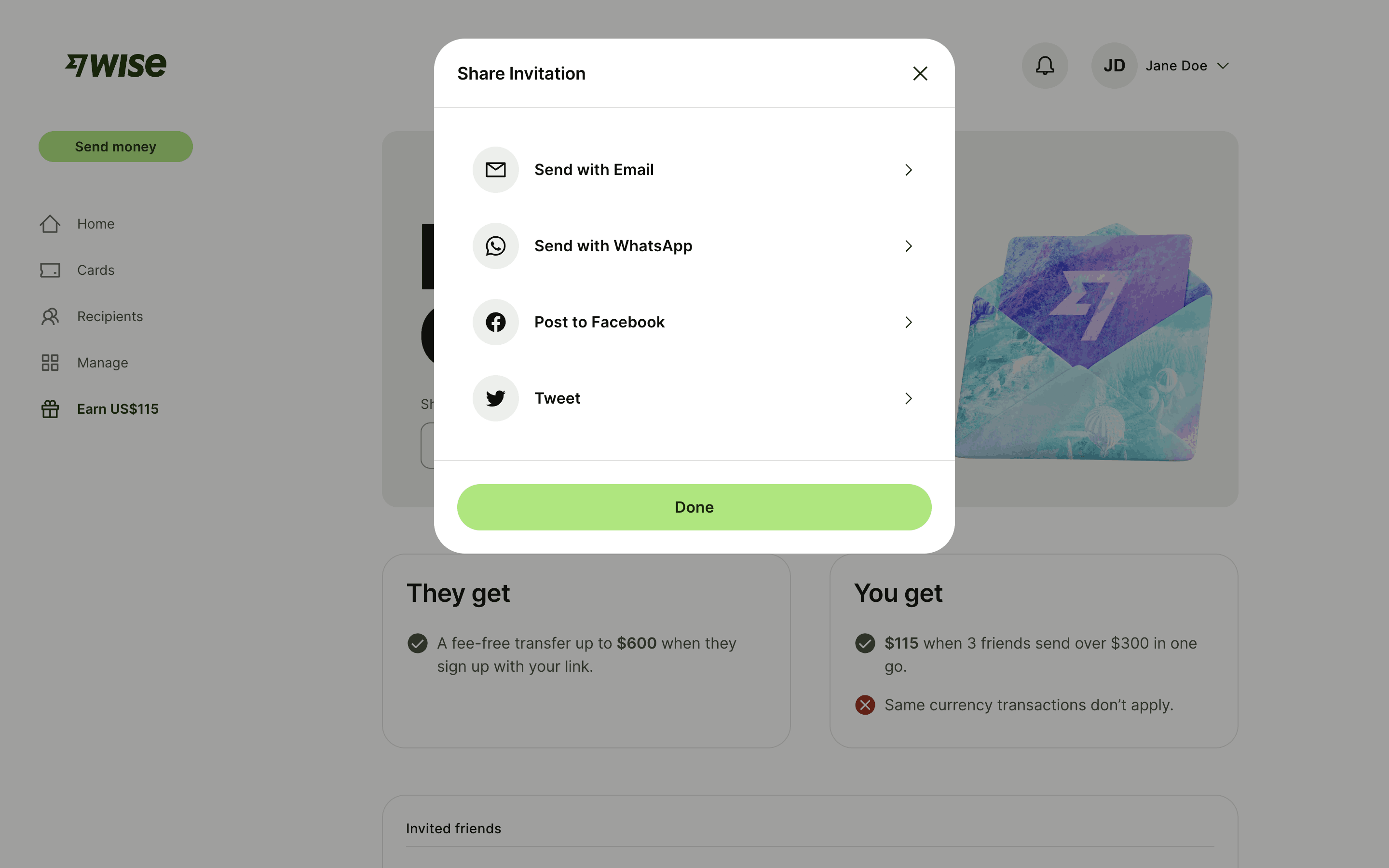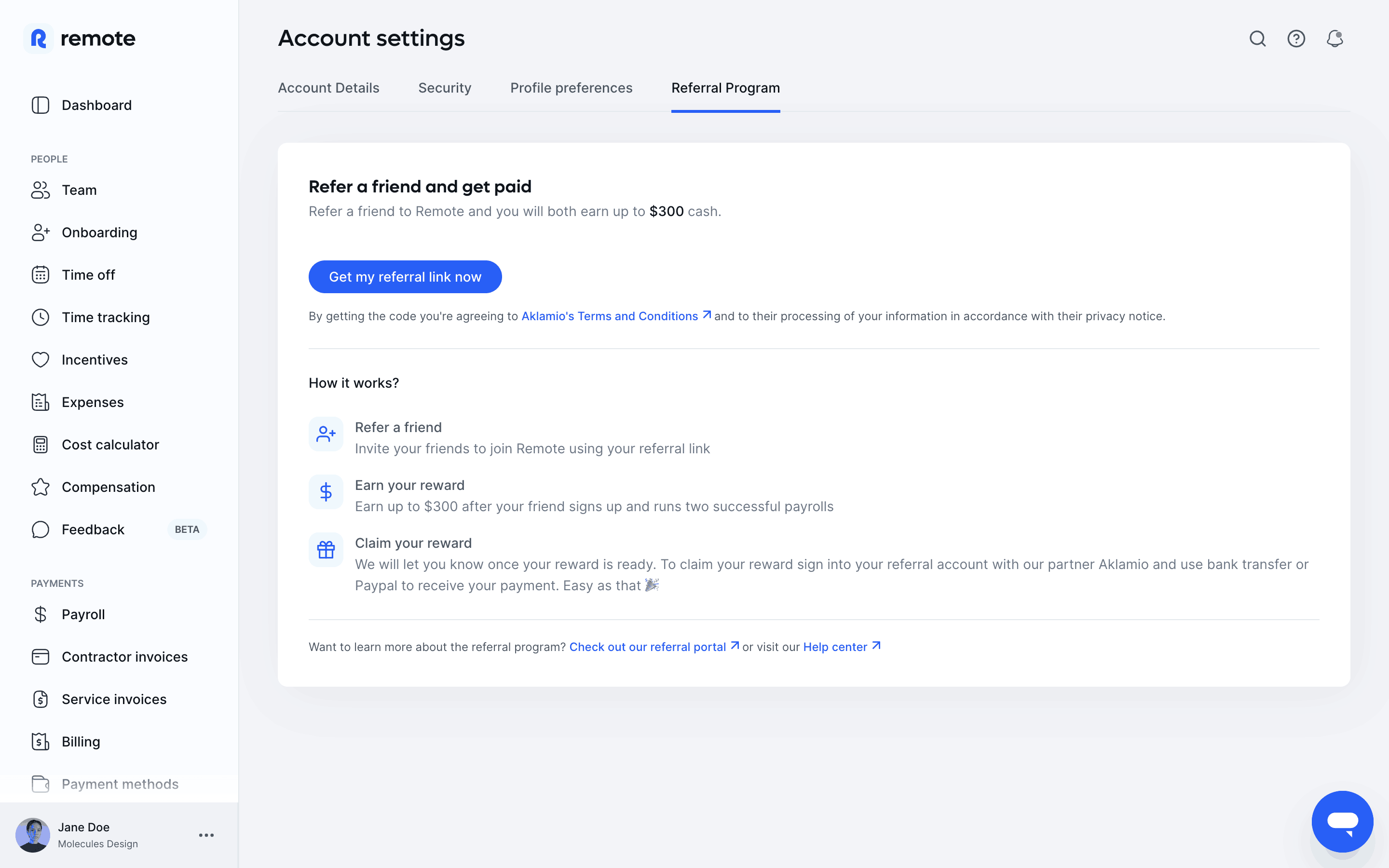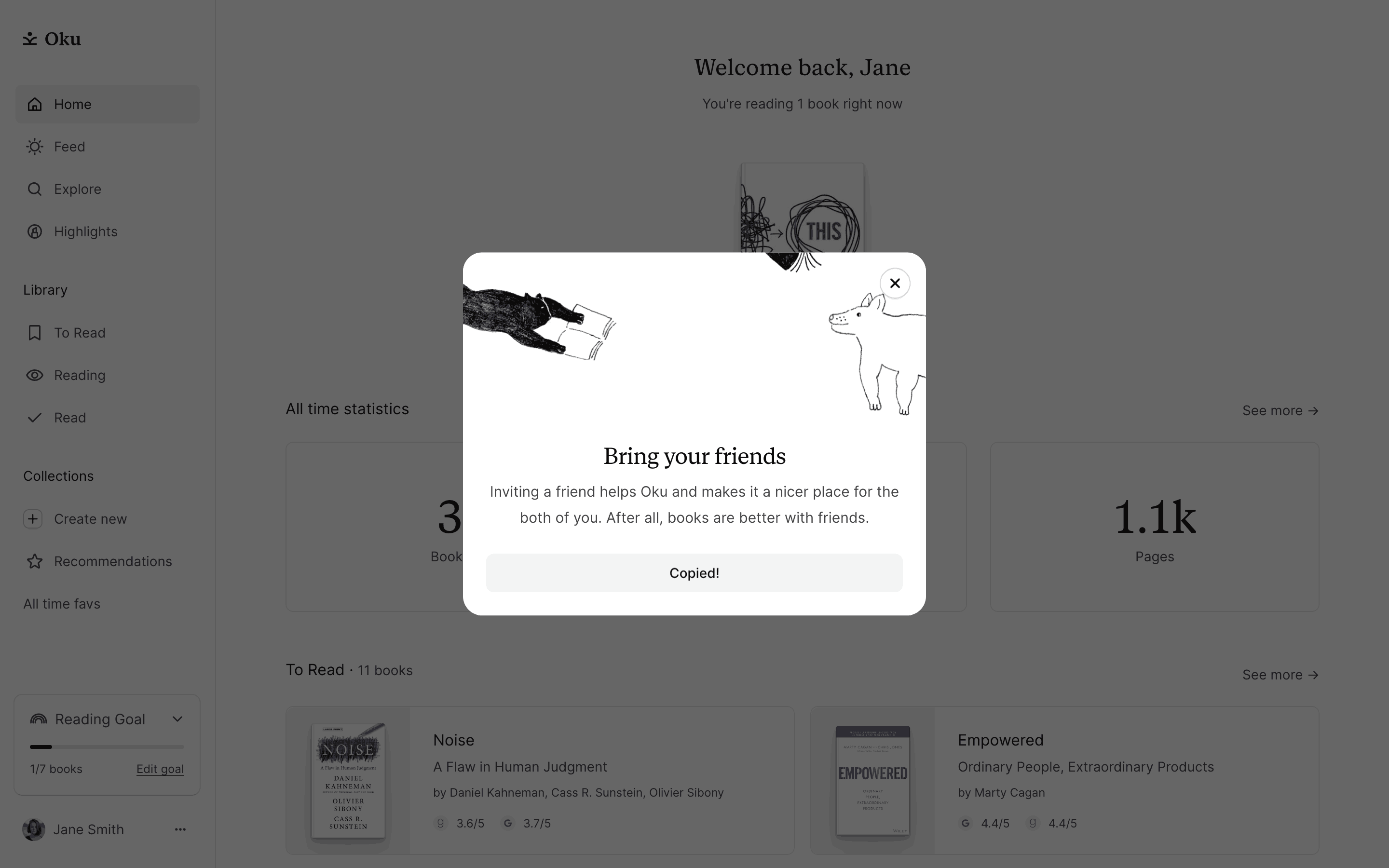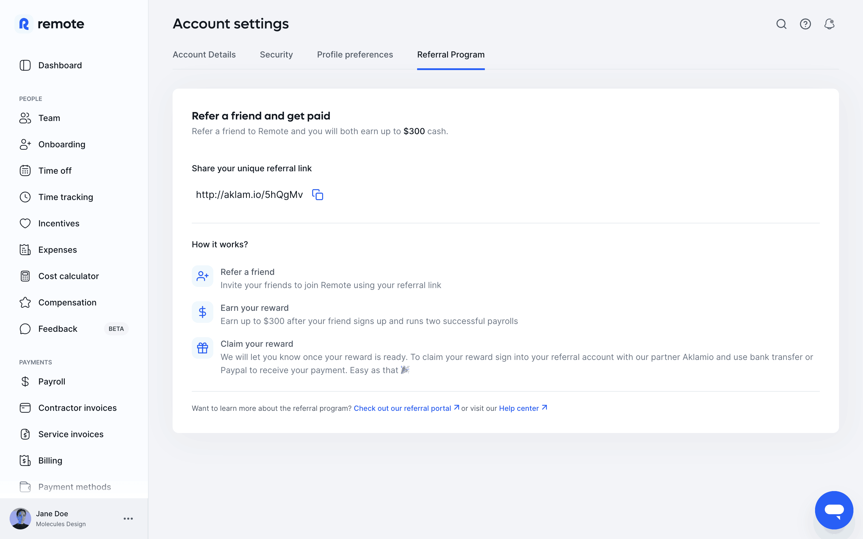The user navigates to the referral link sharing modal and copies the referral link to share with others.