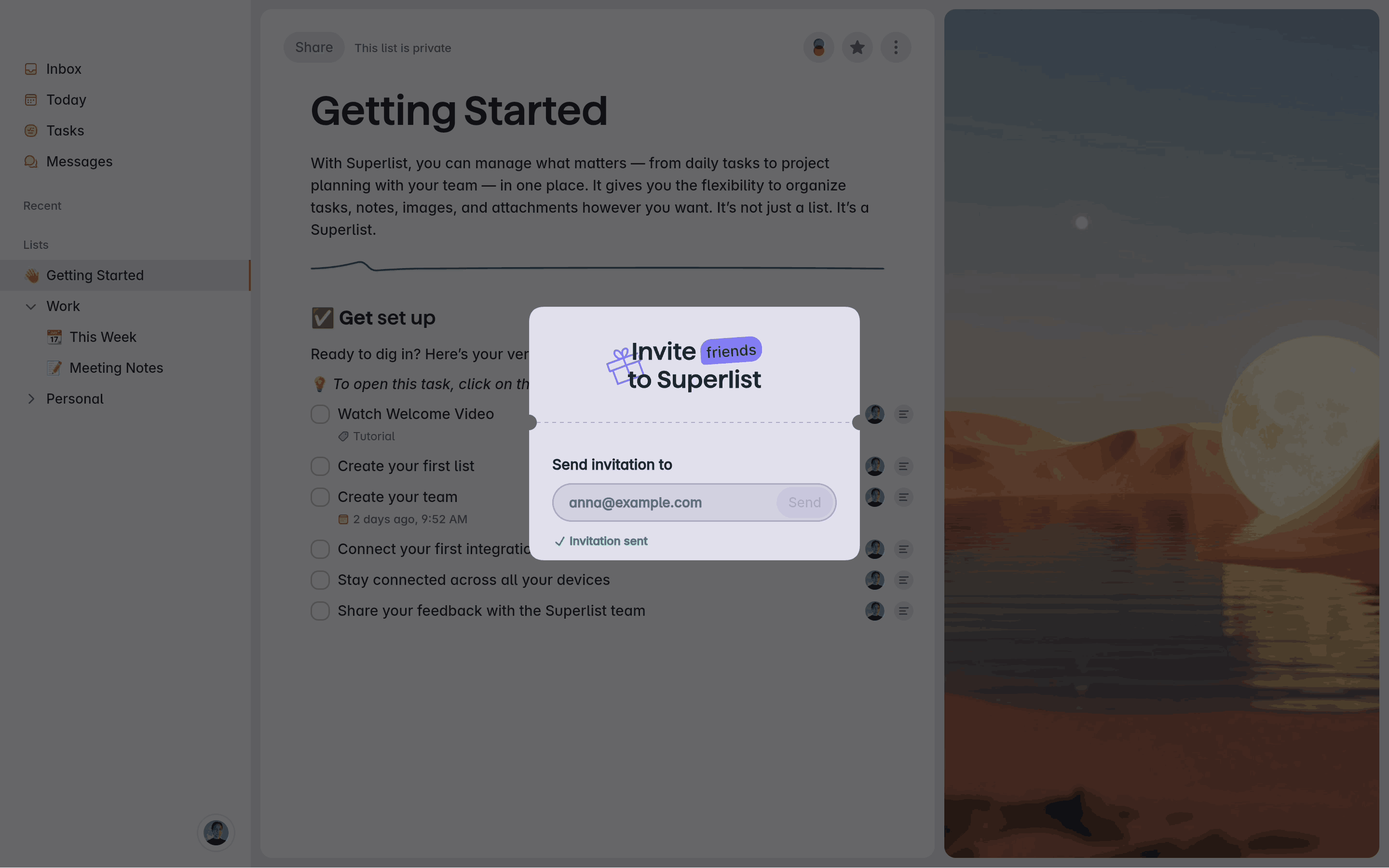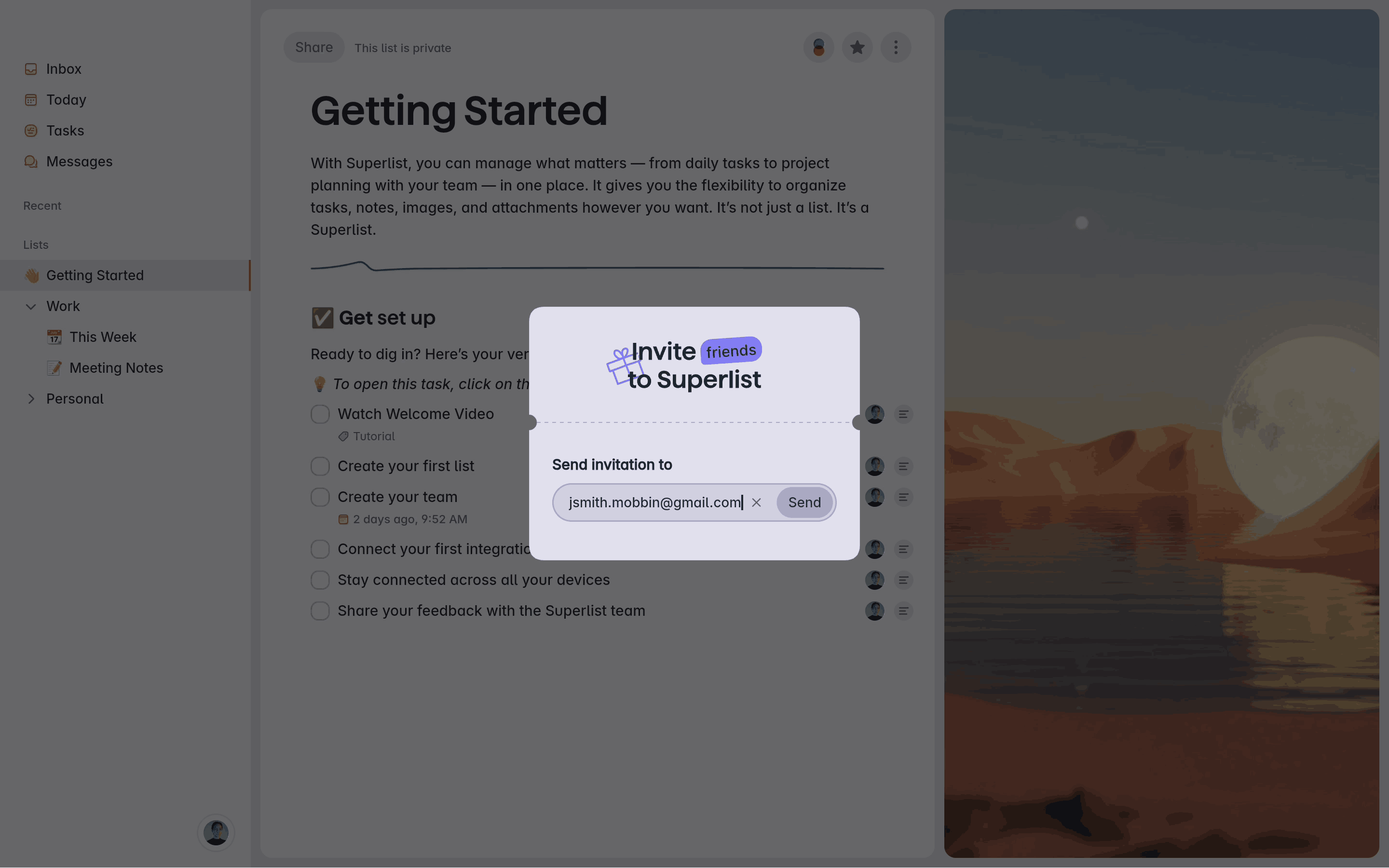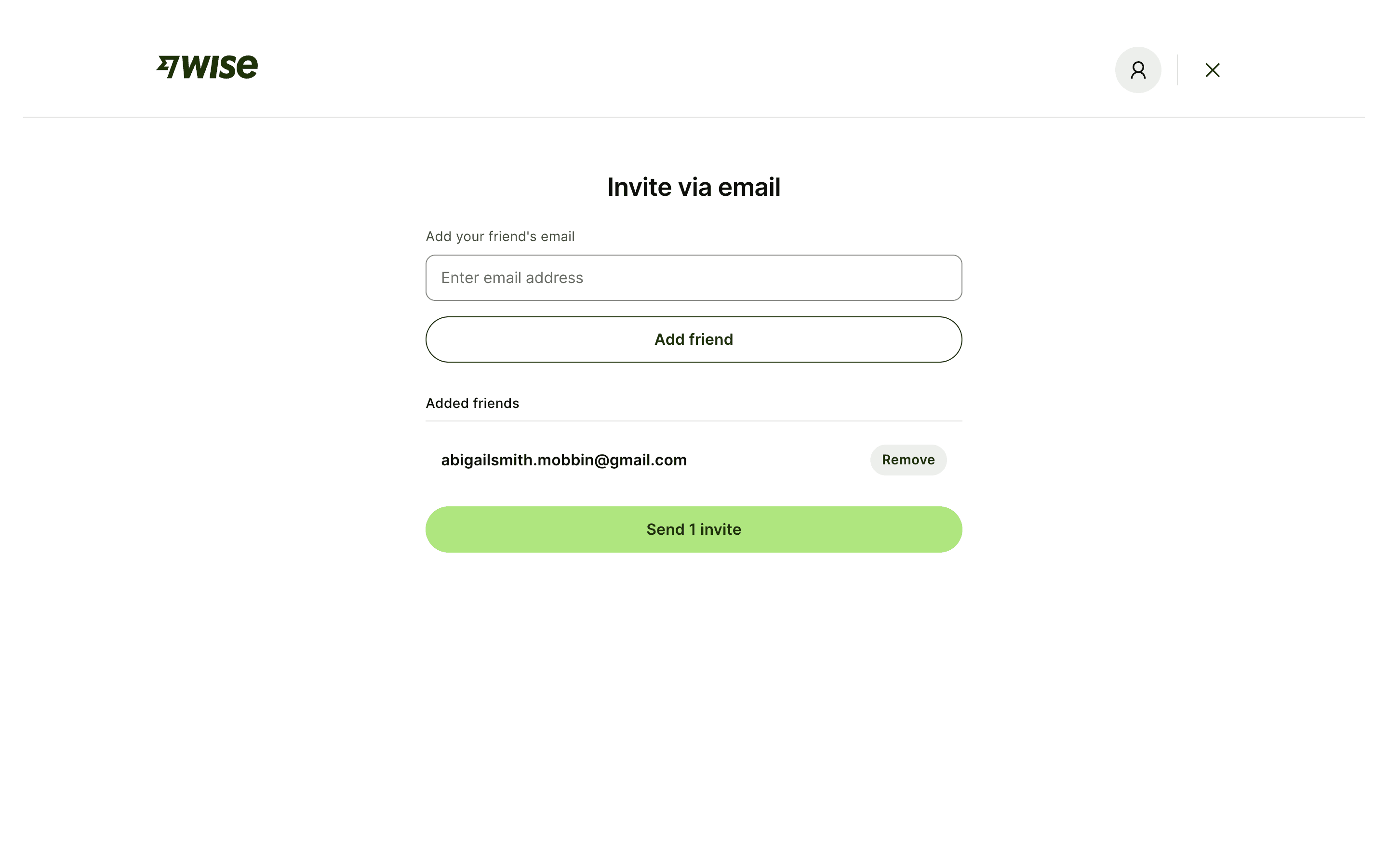 The user flow showcases inviting a friend via email. It involves sharing the invite, entering the email, and sending the invitation.