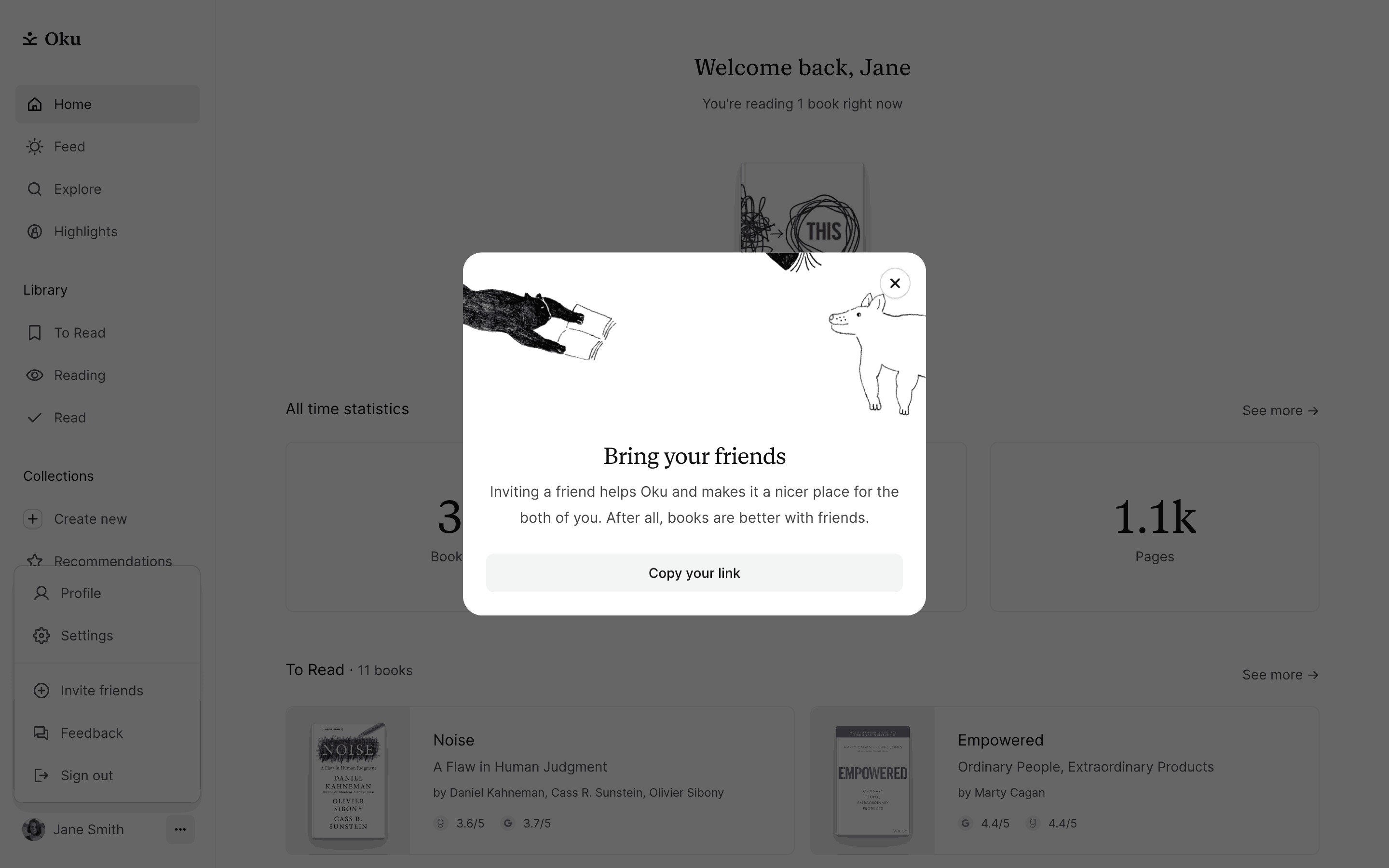 The user navigates to the 'Invite friends' option and copies the invitation link to share with others.