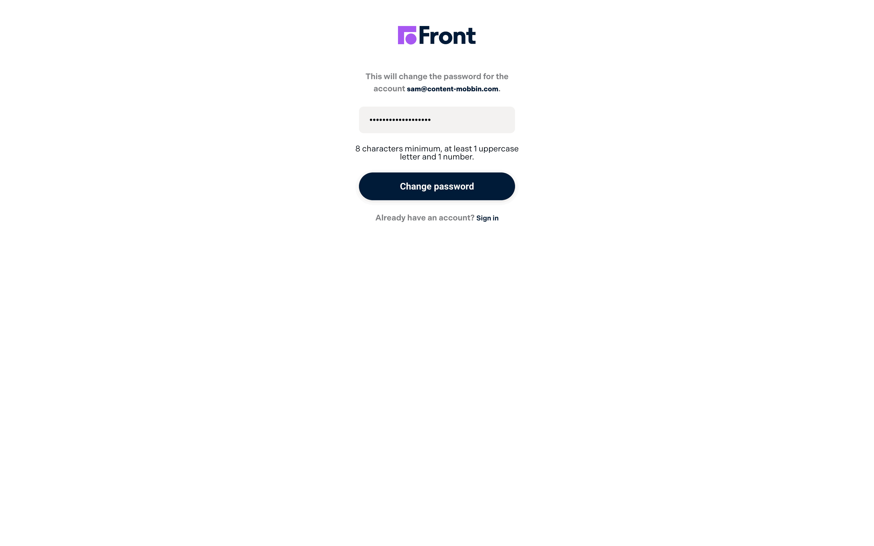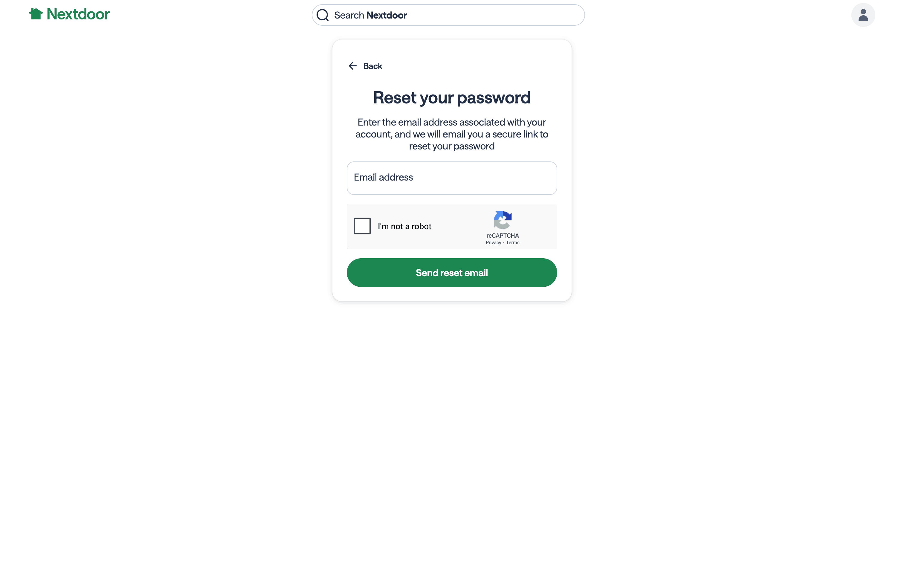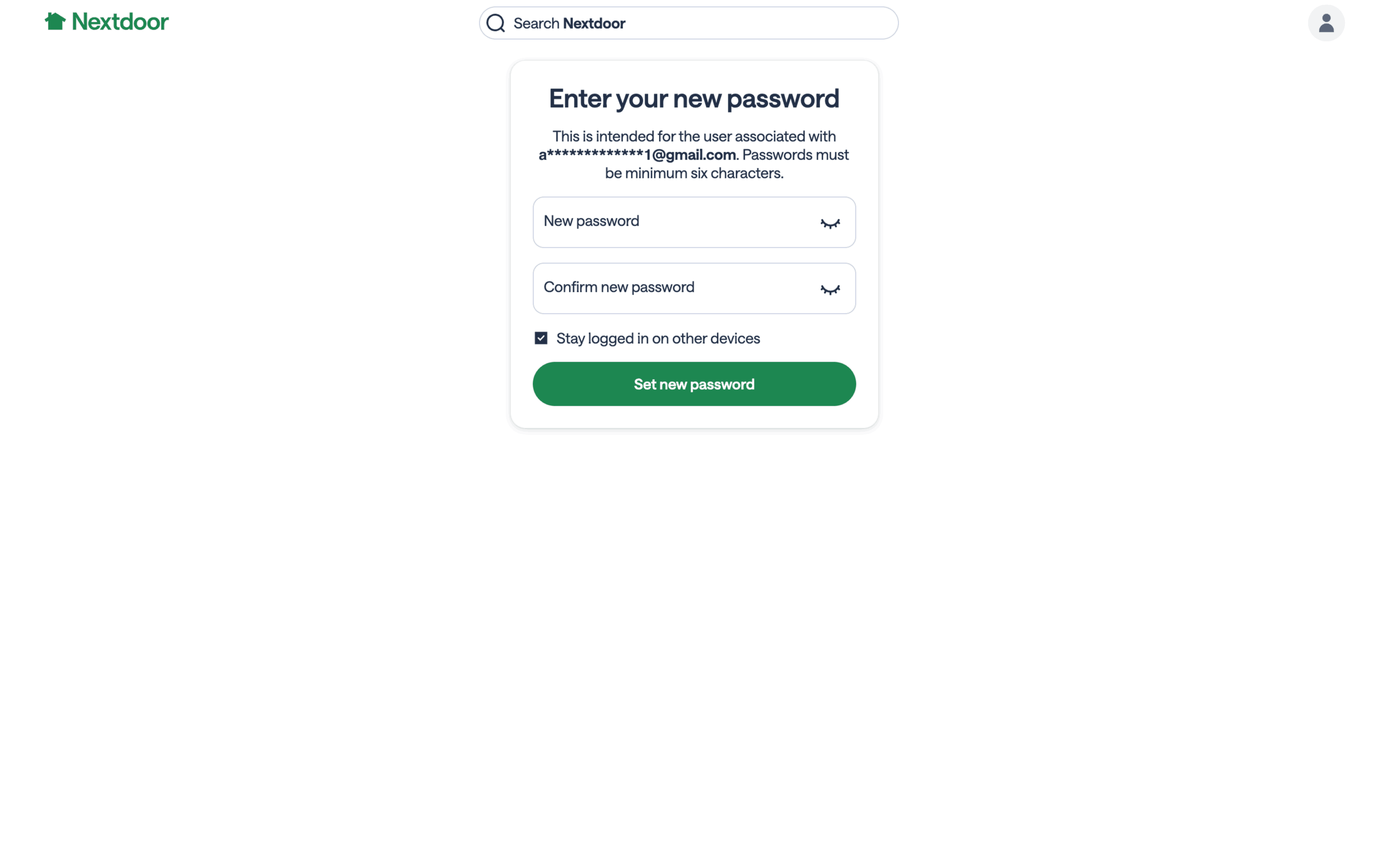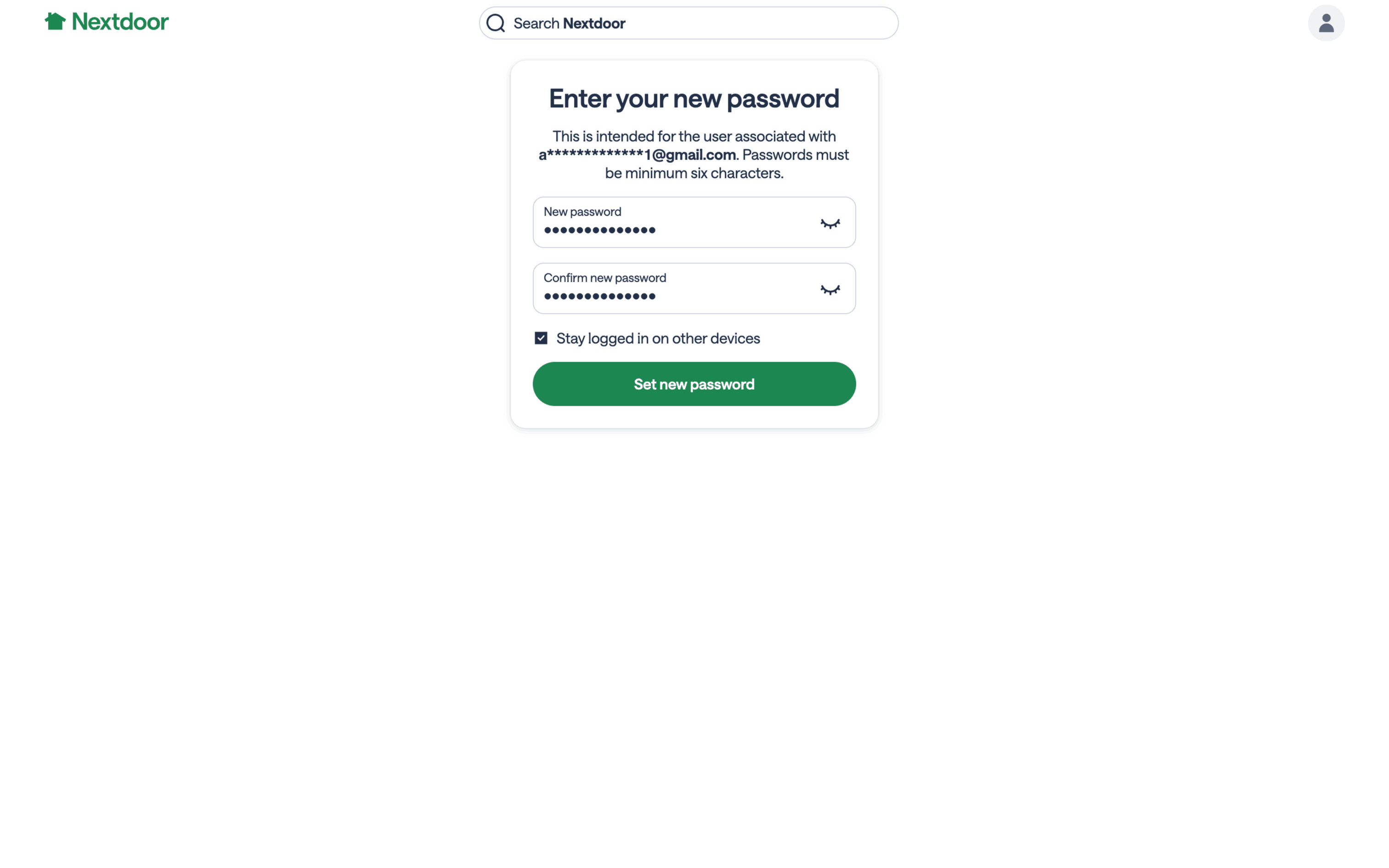 The user requests and completes a password reset flow. They receive a reset link, set a new password, and are redirected to account settings.