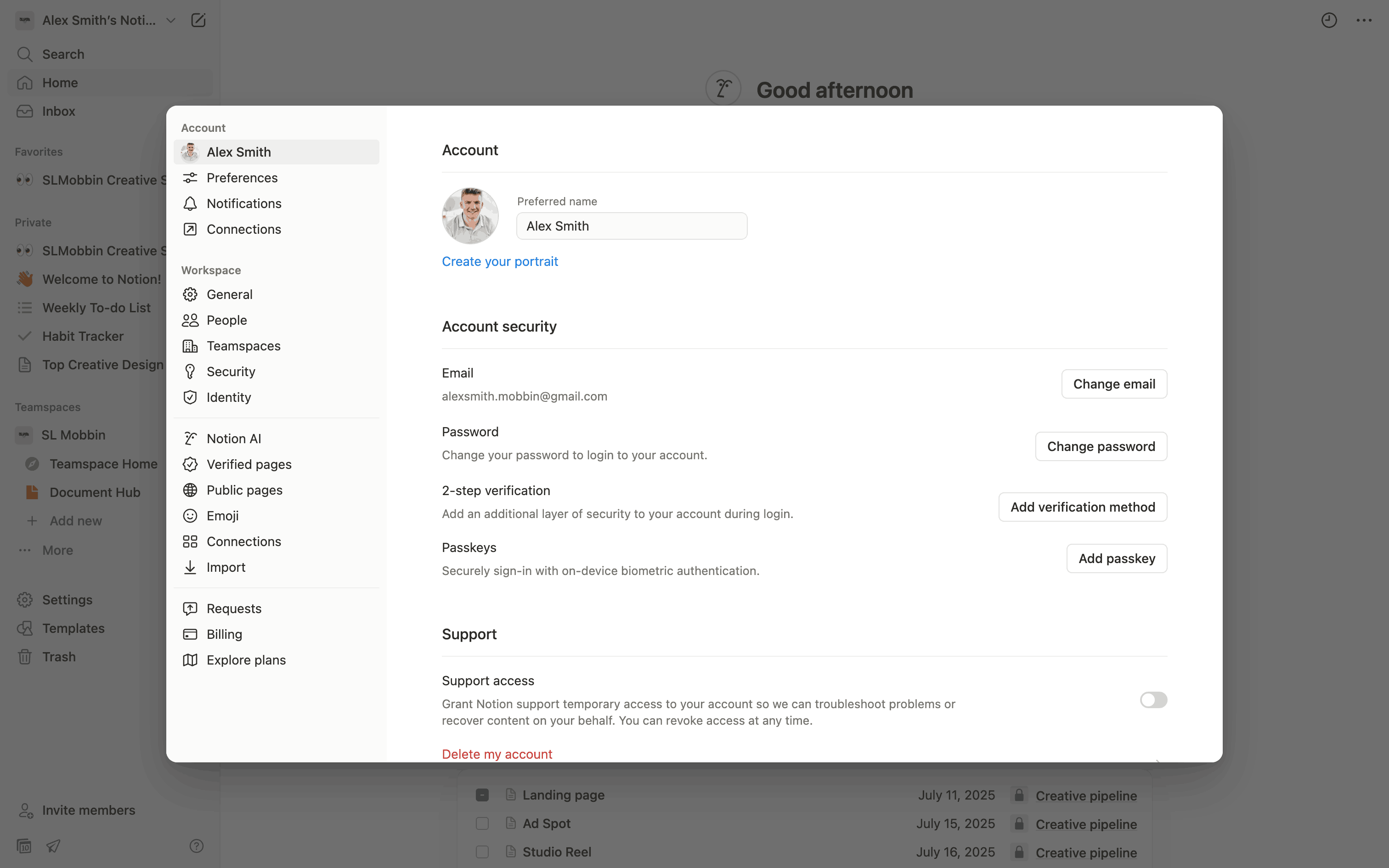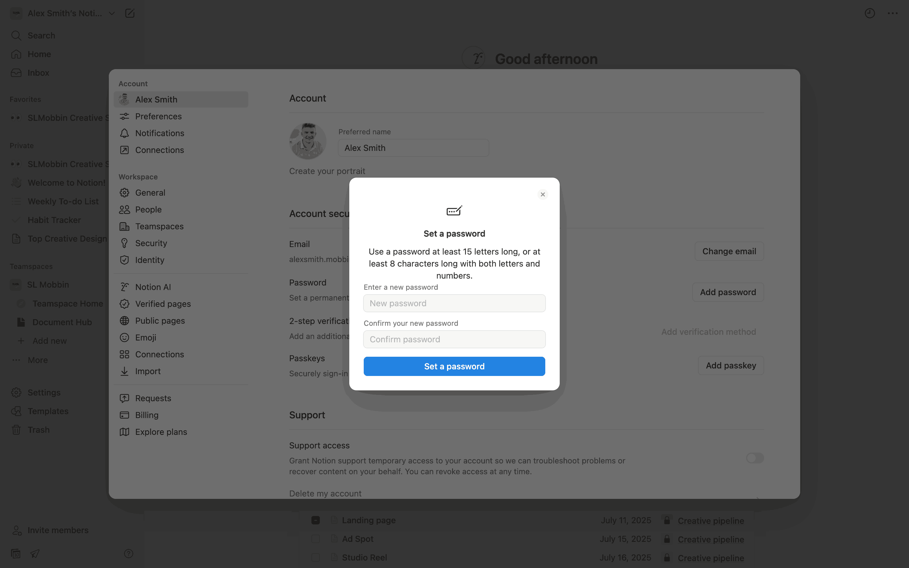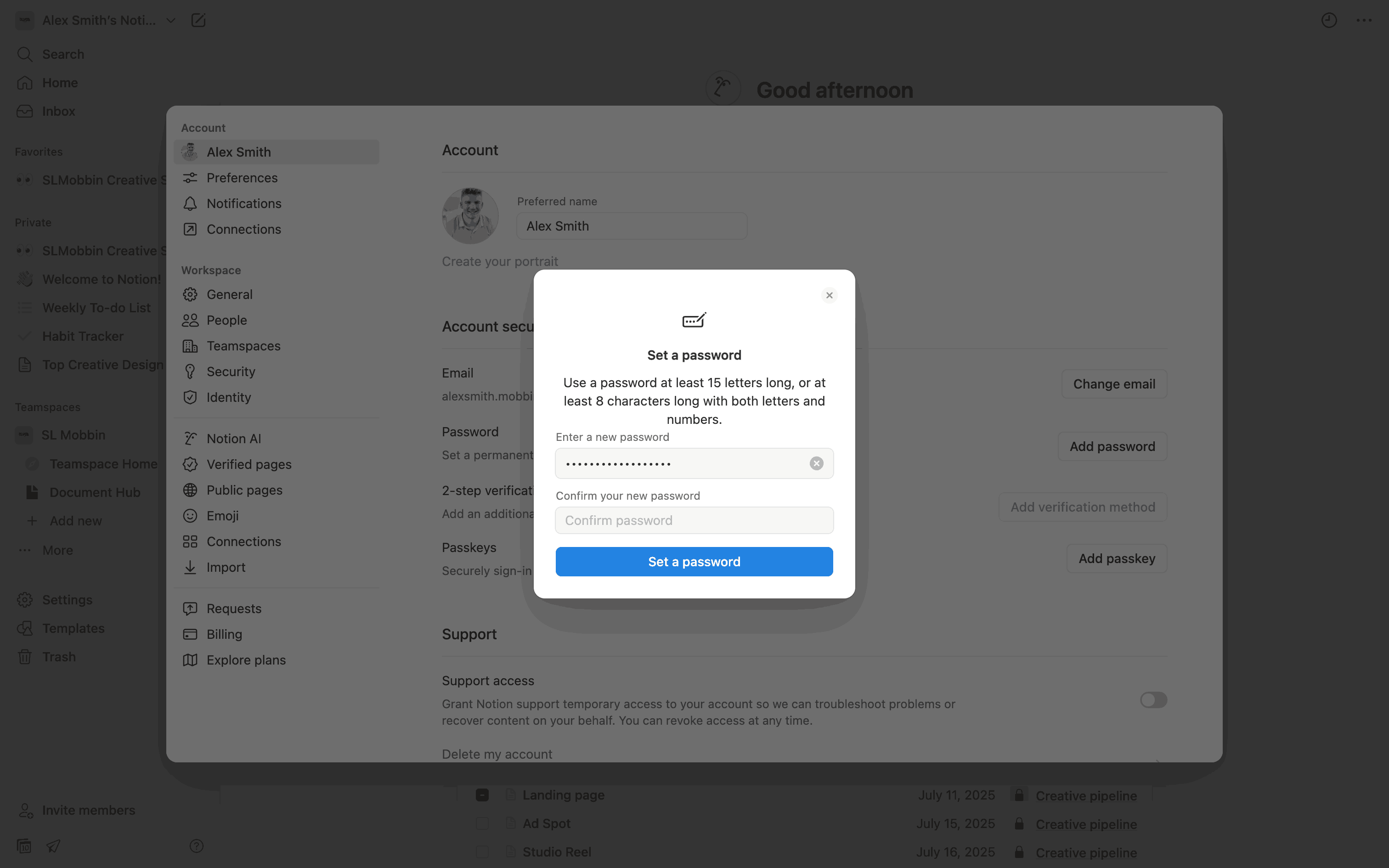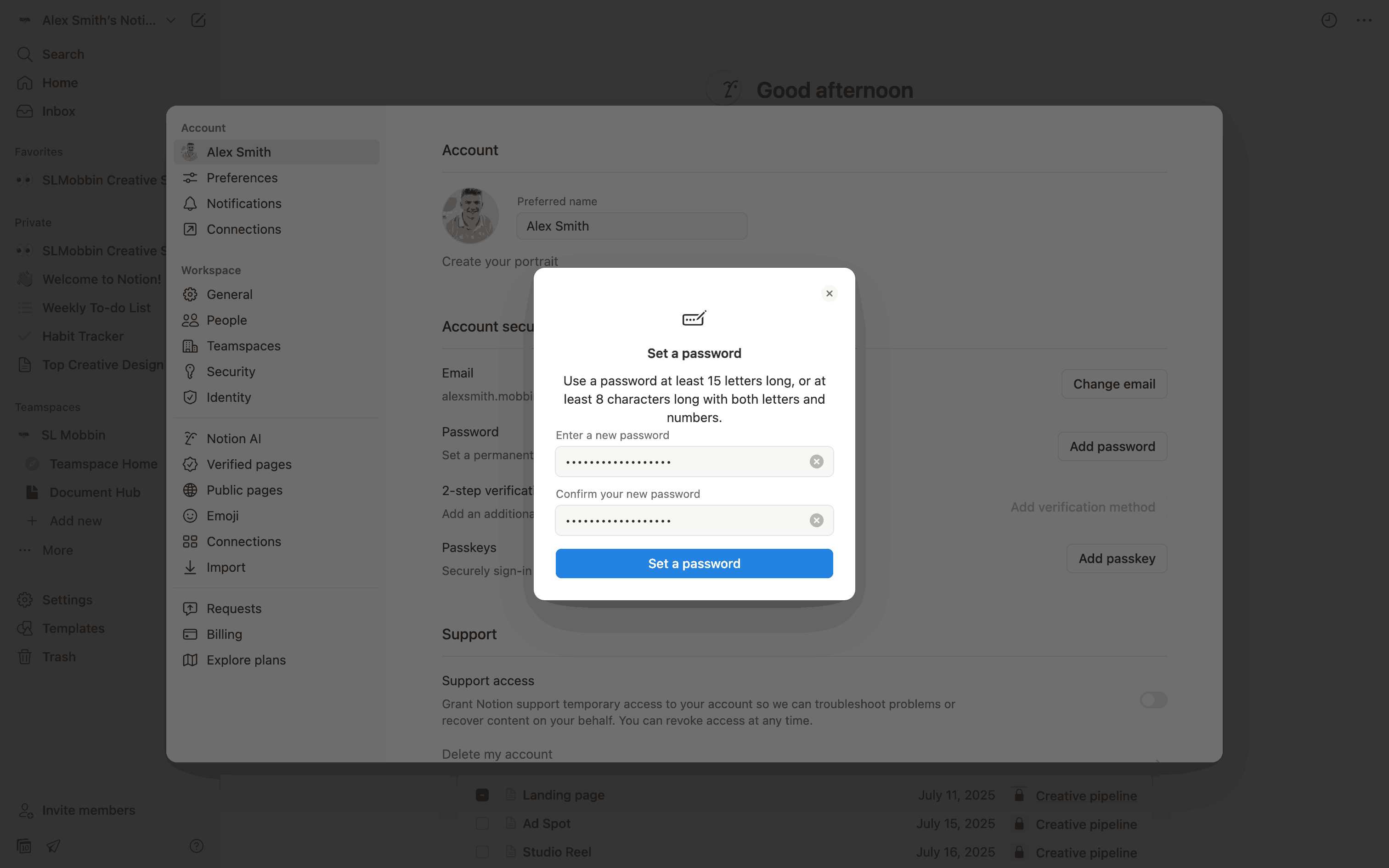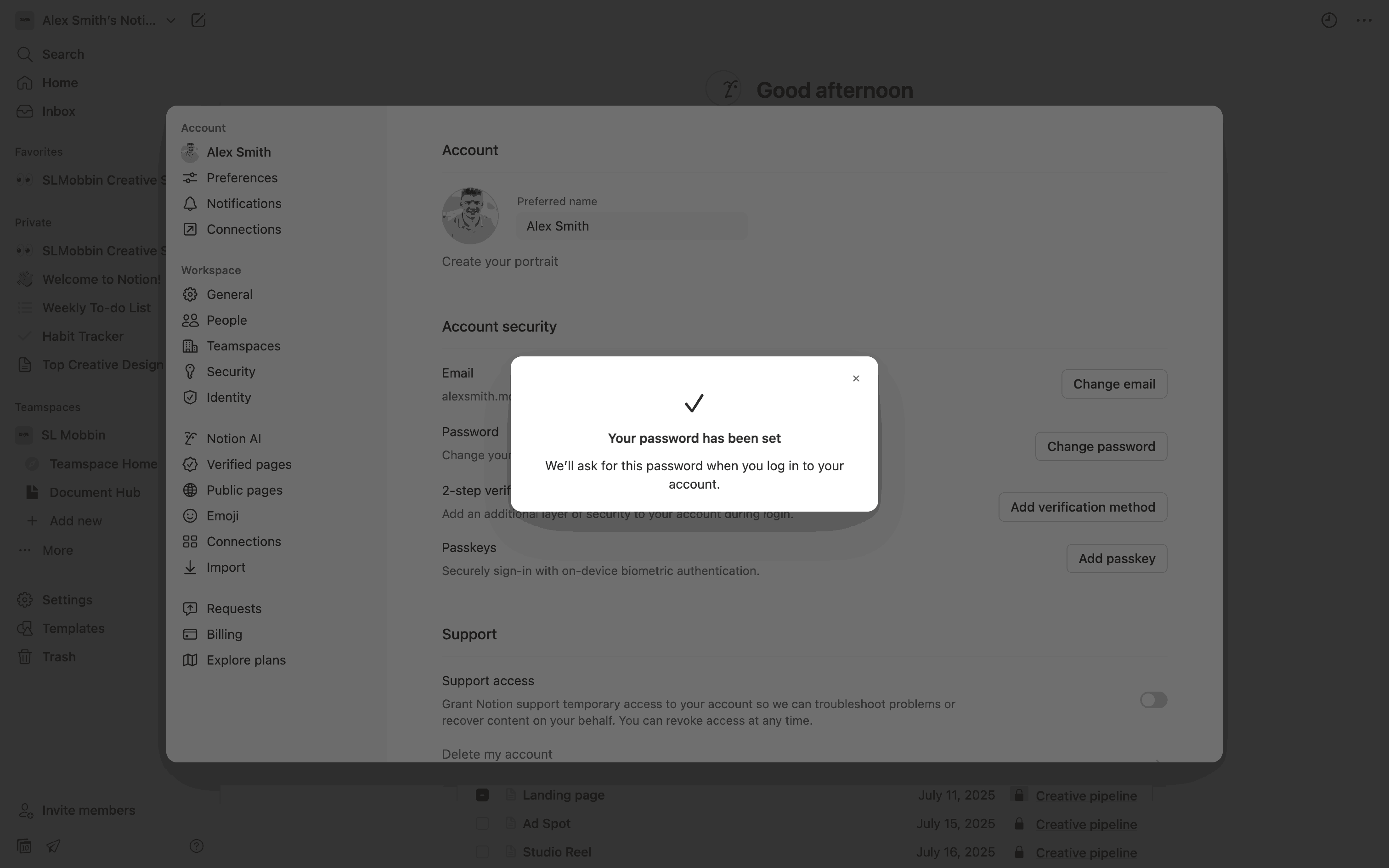 The user requests and completes a password reset flow. They receive a reset link, set a new password, and are redirected to account settings.