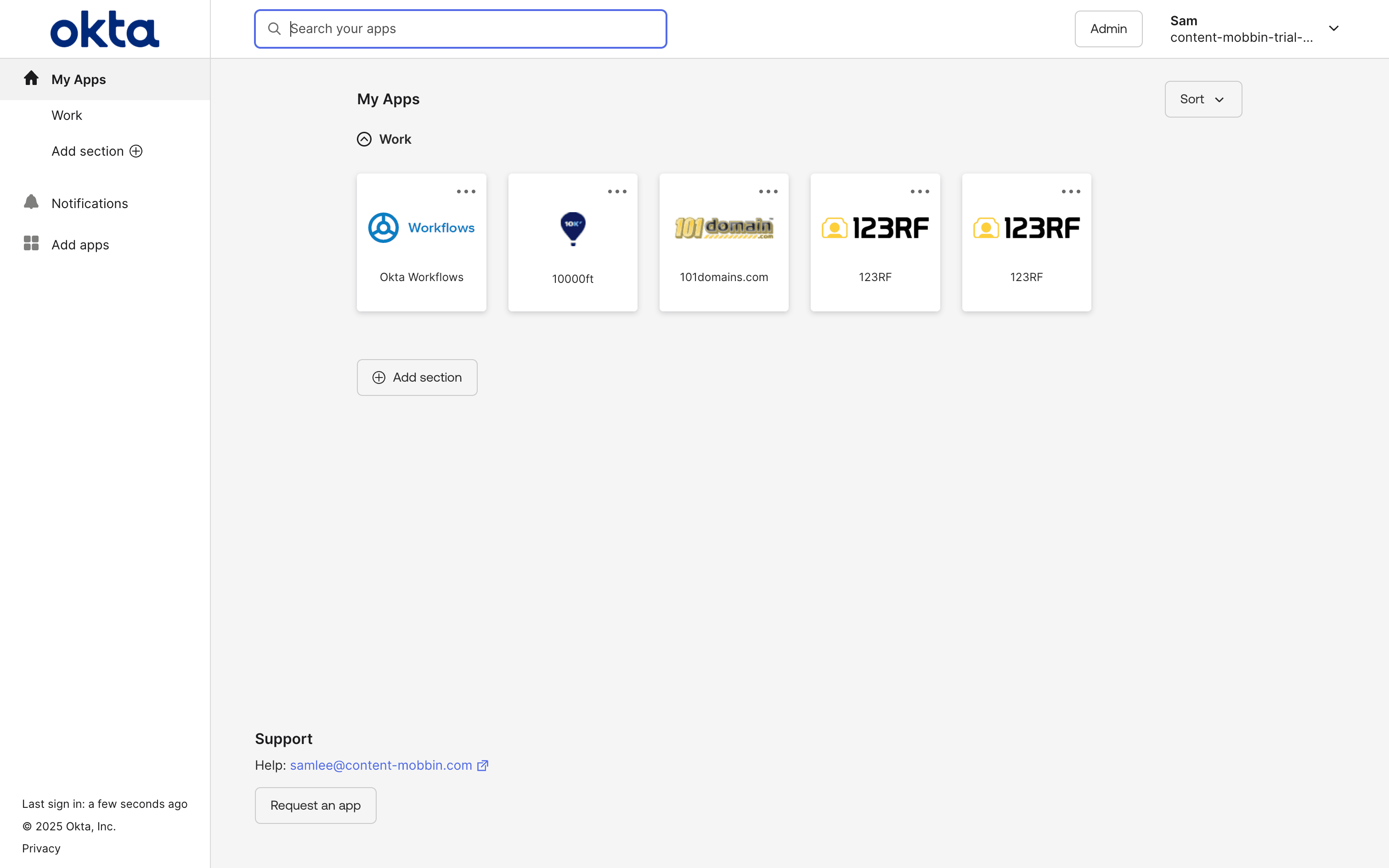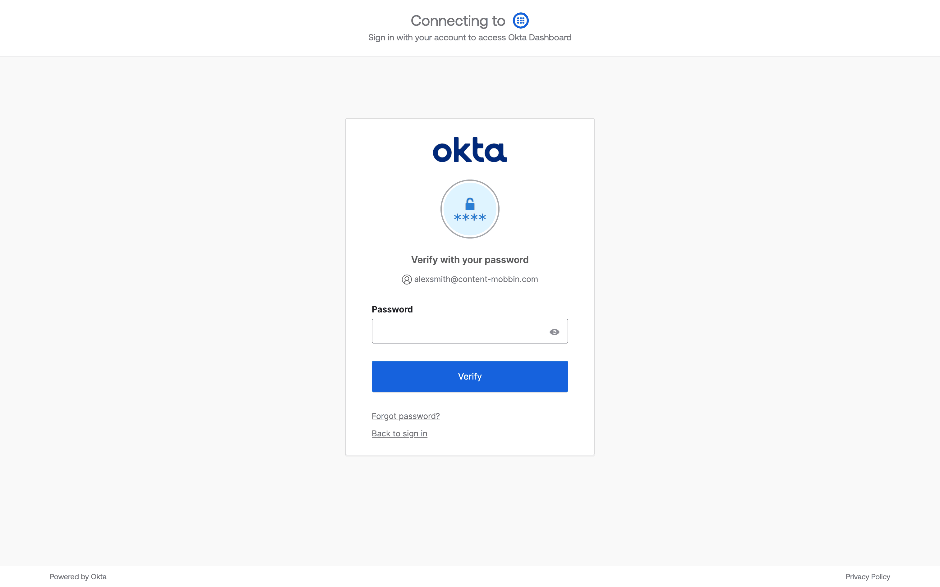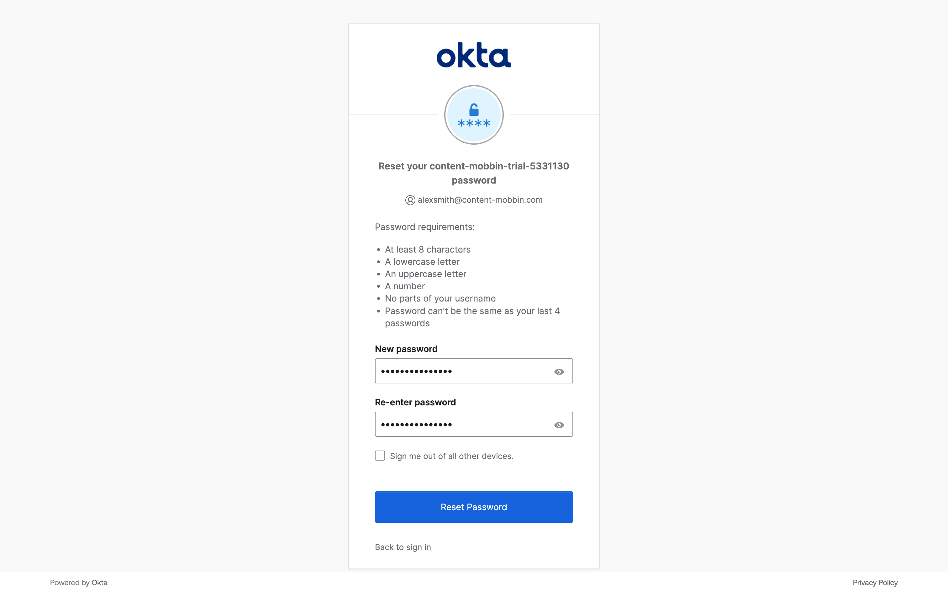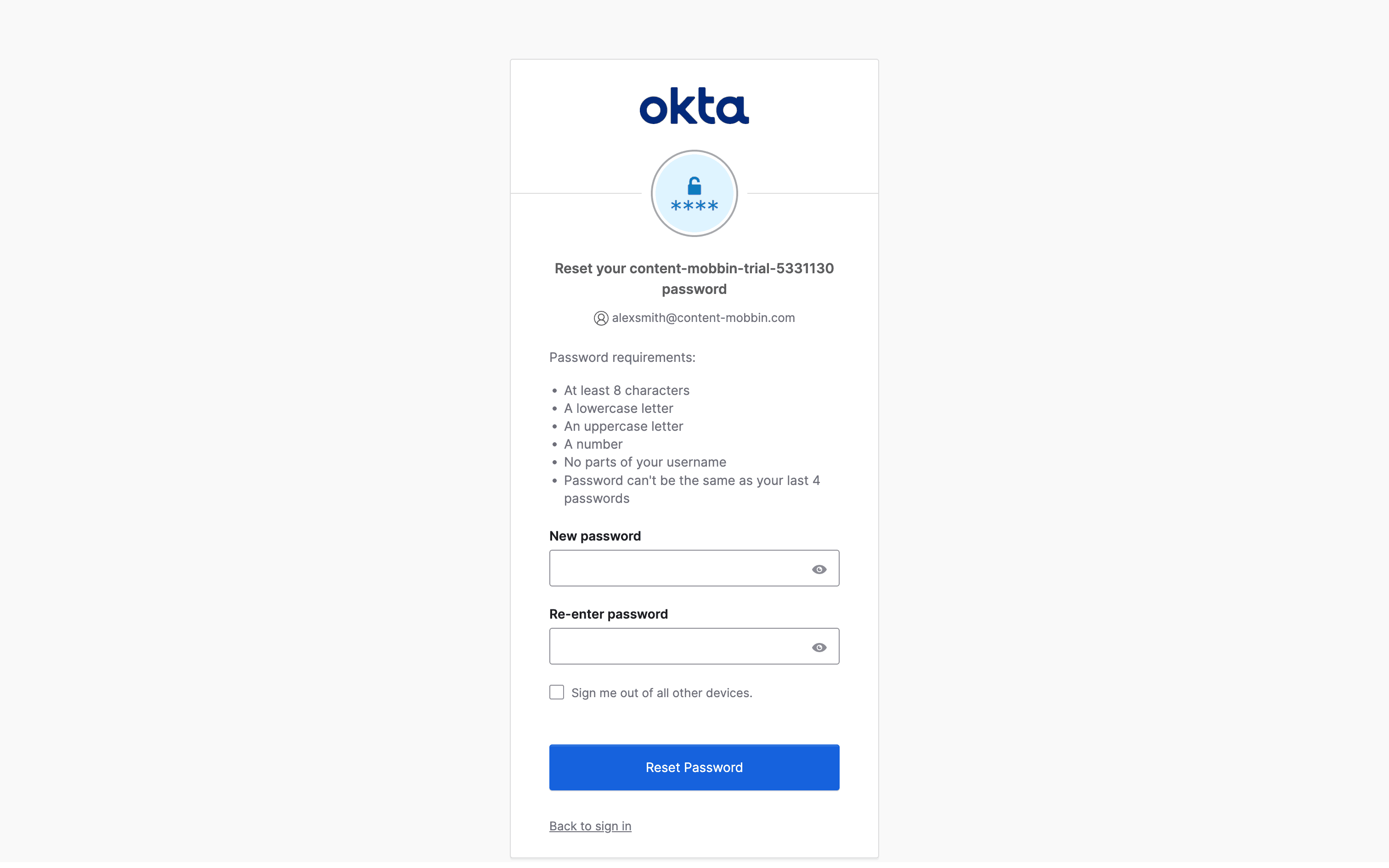 The user resets their password via email verification and is redirected to the Okta dashboard. The flow showcases password recovery and successful login.