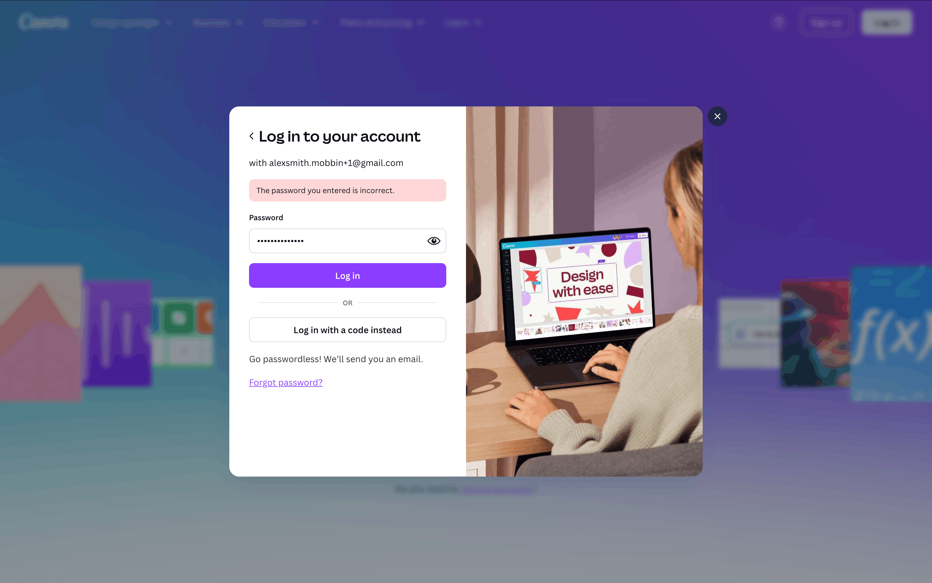 The user resets their password after a failed login attempt by verifying their email and setting a new password. They are then prompted to log back in.