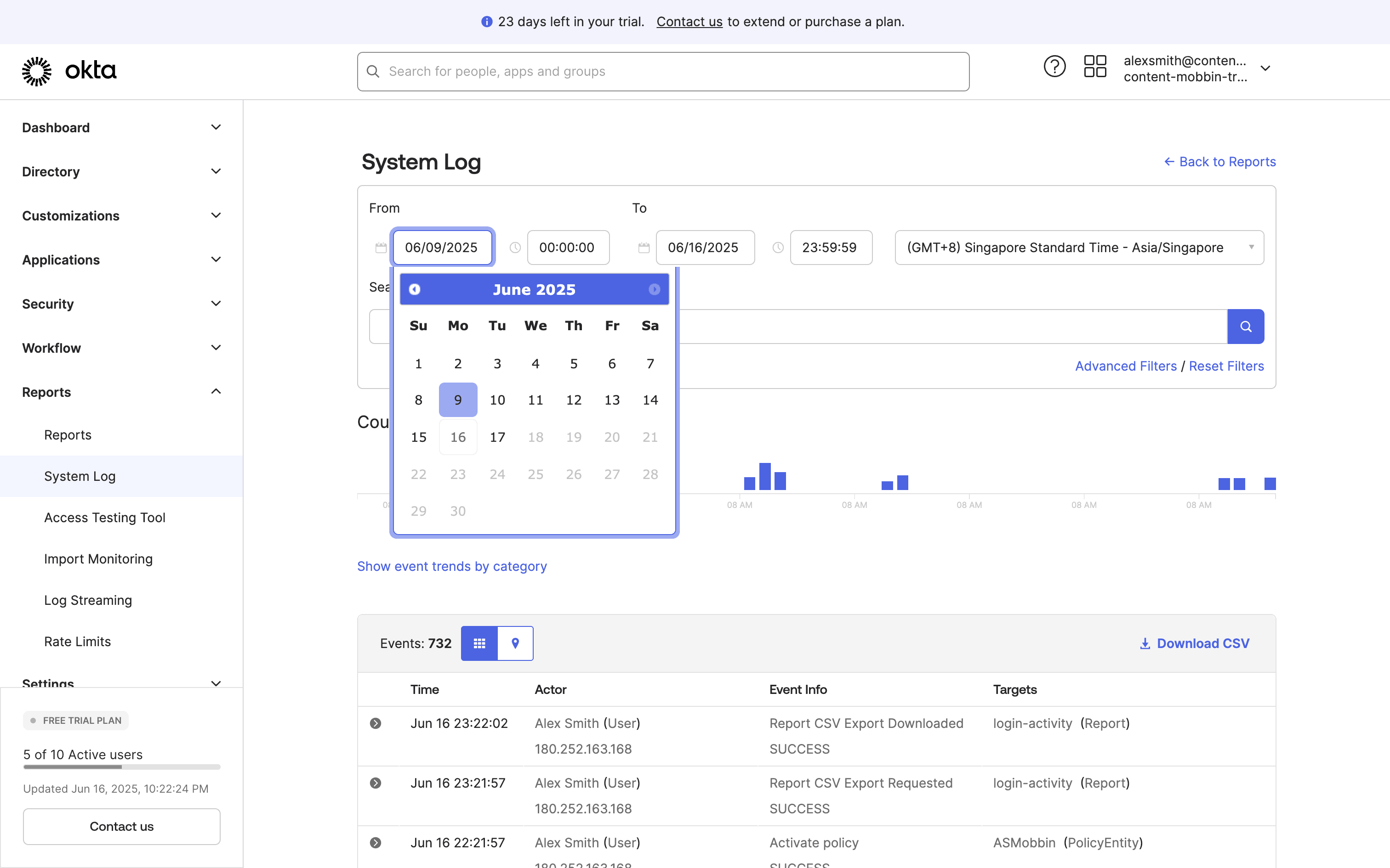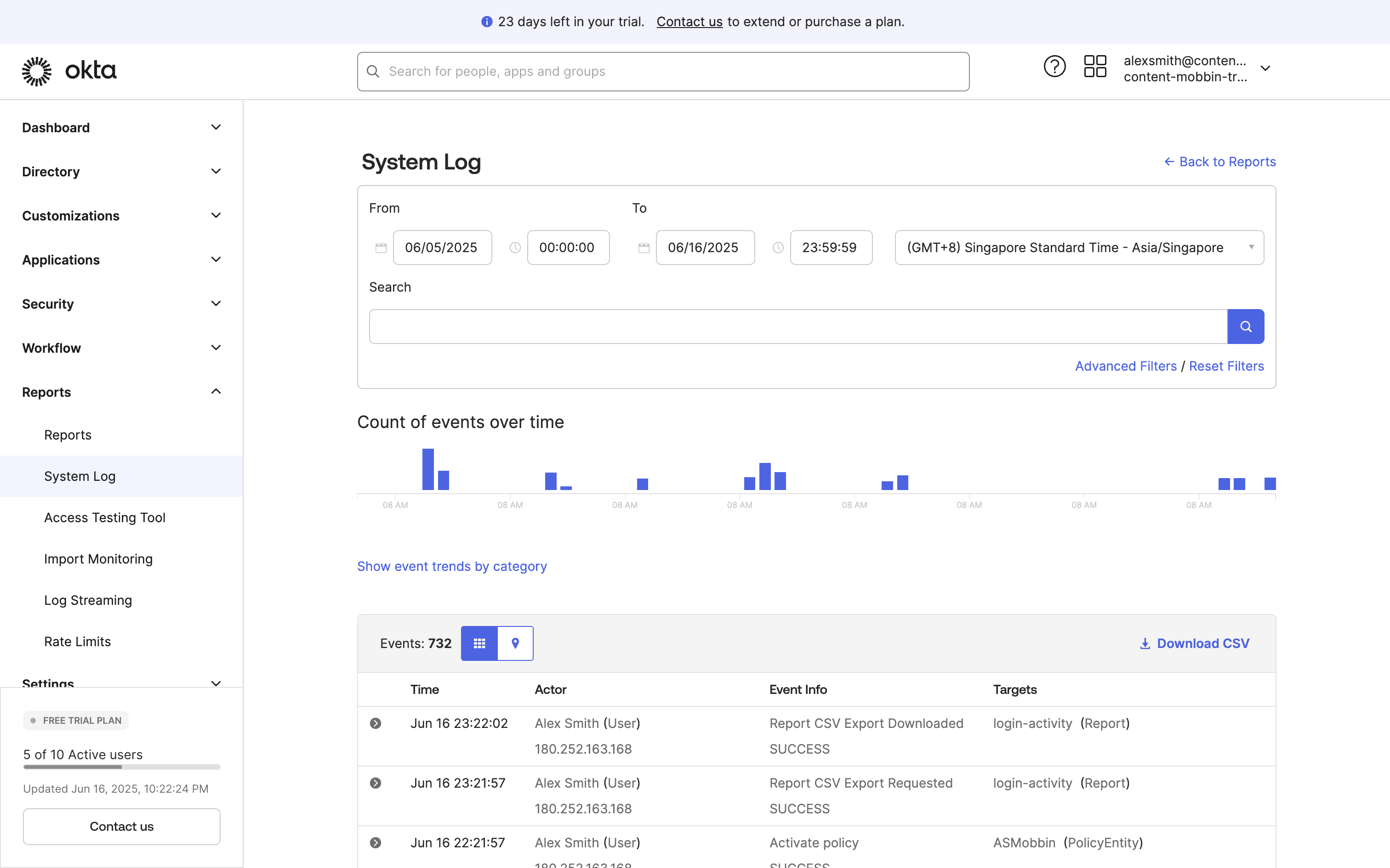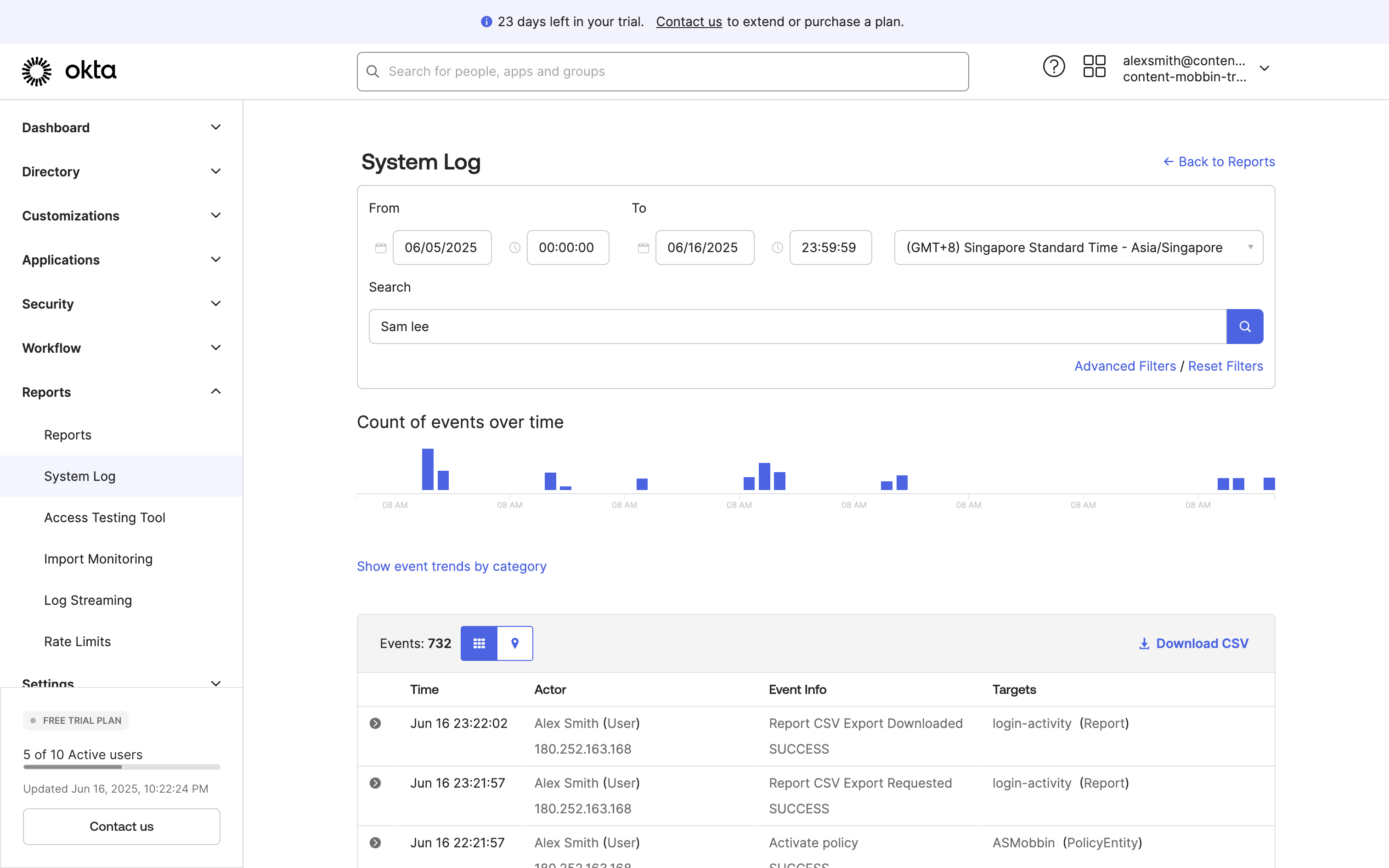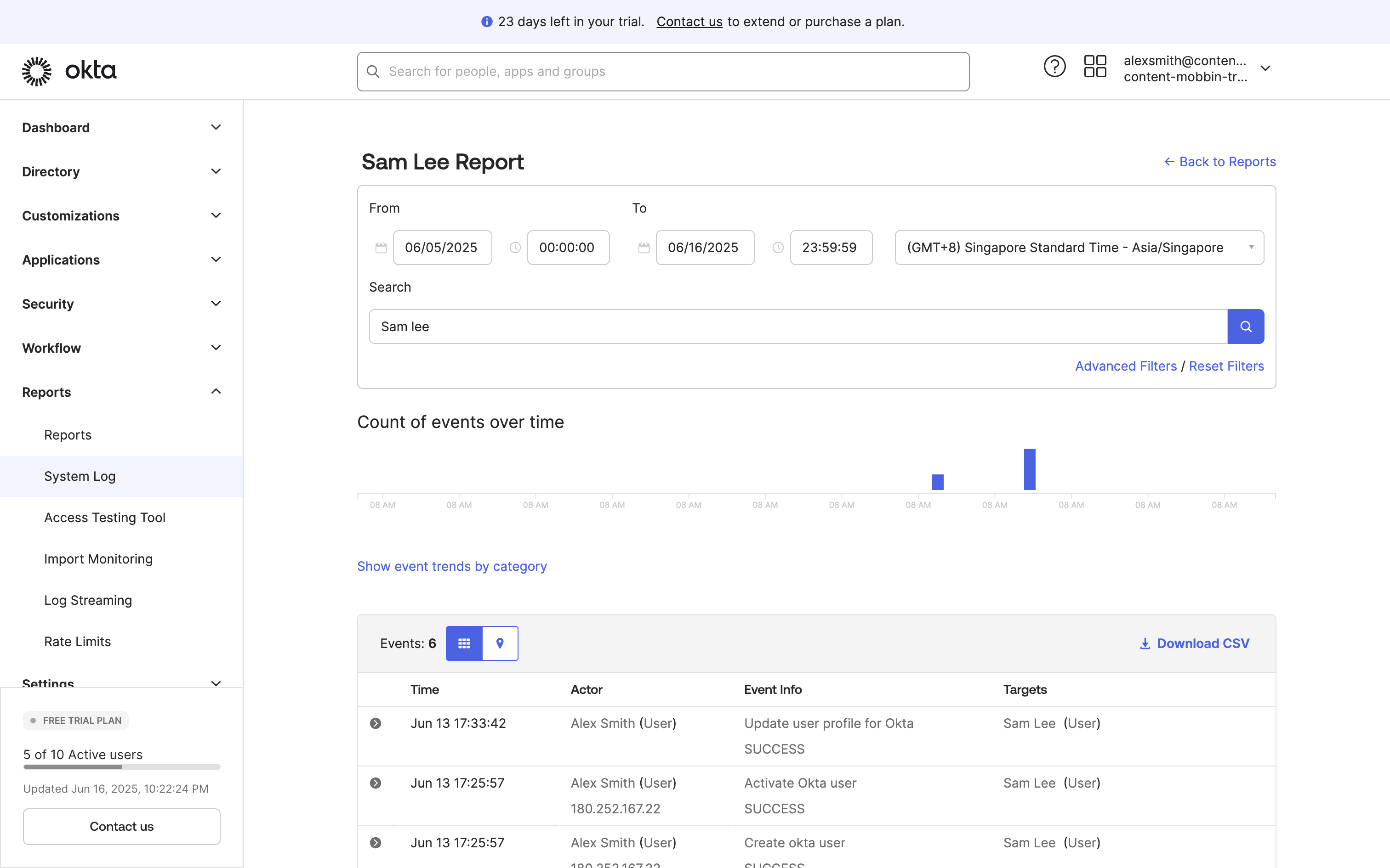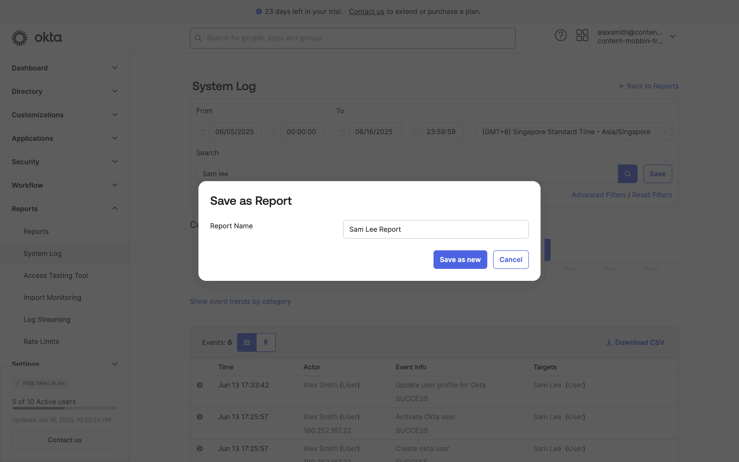 The user filters the system log and saves the filtered view as a report. The report is named and then displayed.