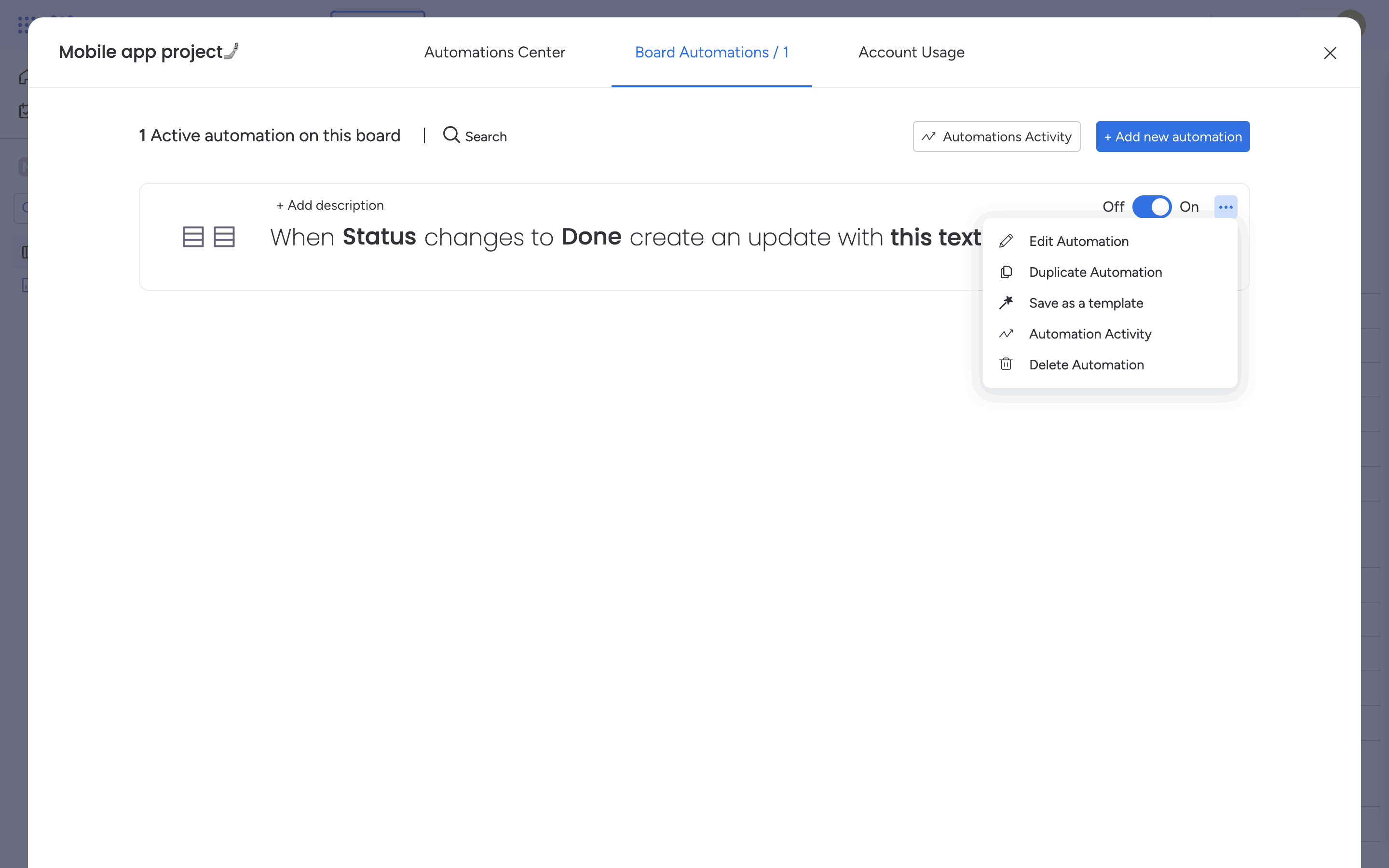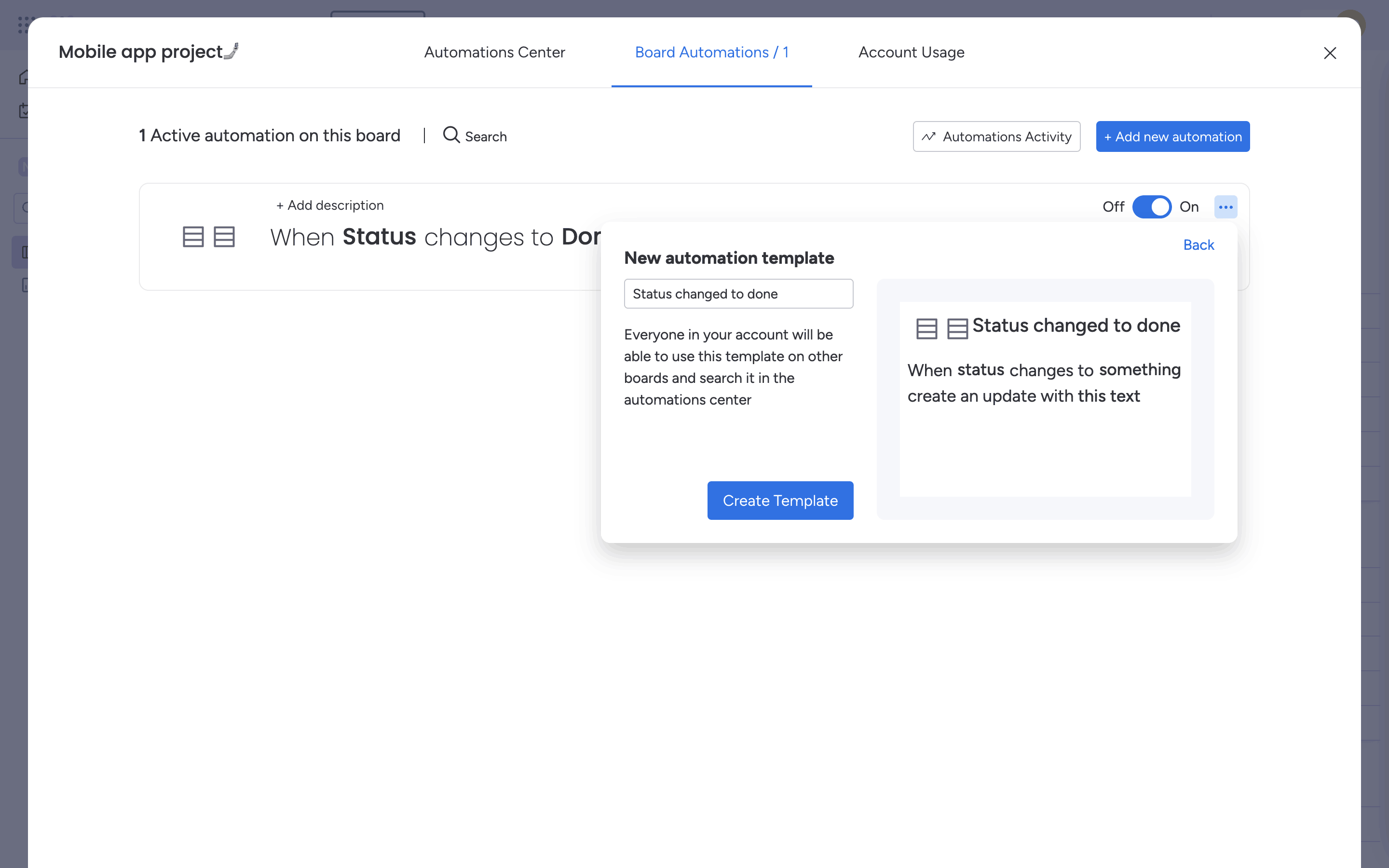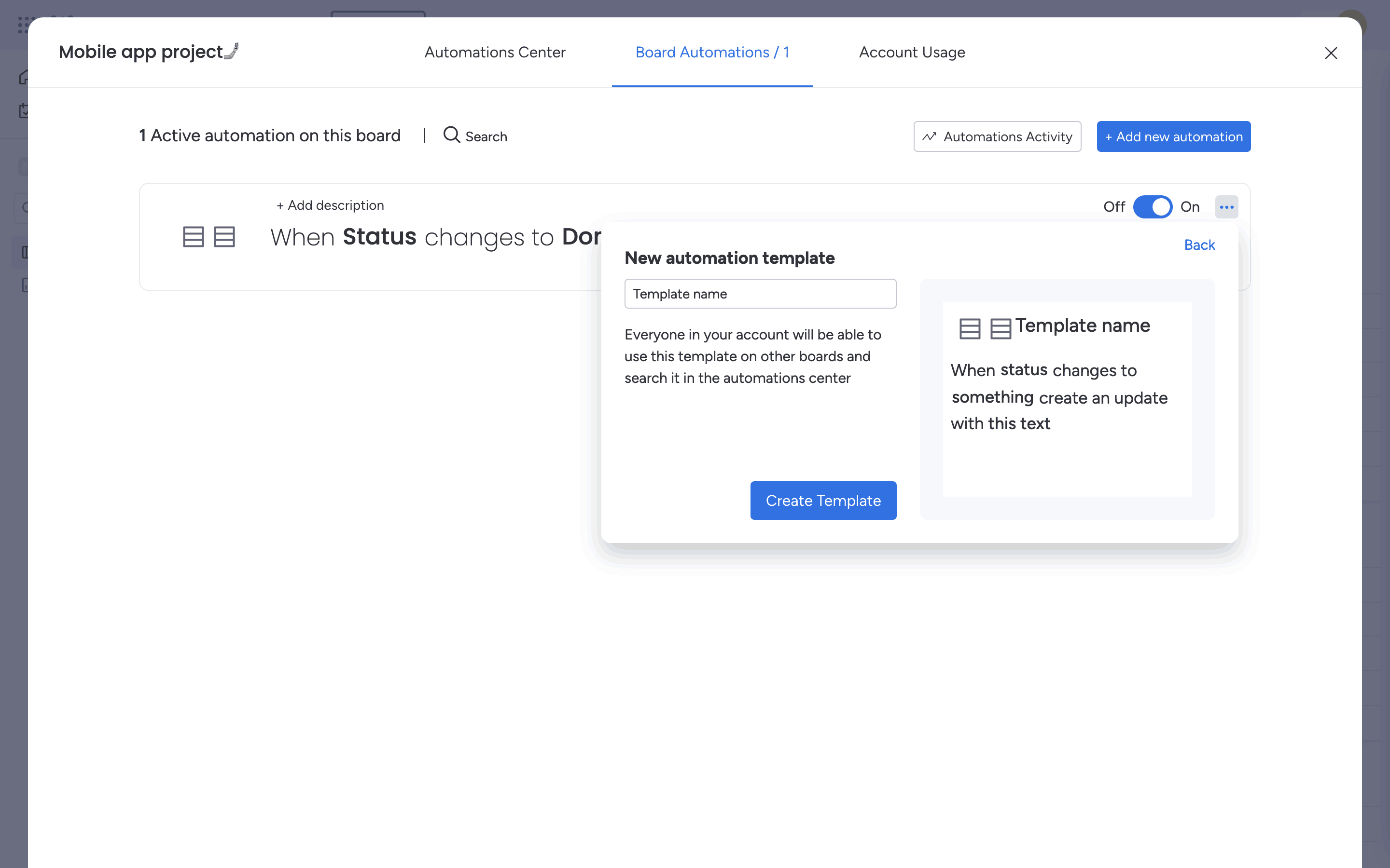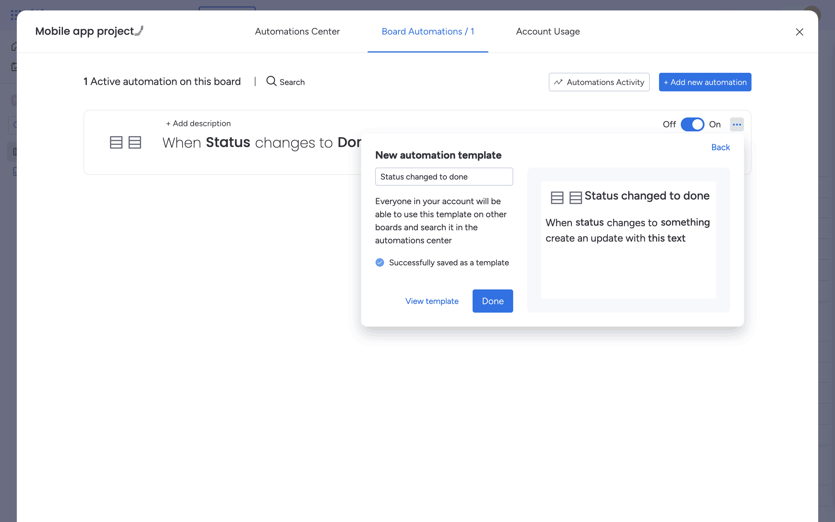 The user saves an existing automation as a template. This involves opening the automation options, naming the template, and confirming the save.