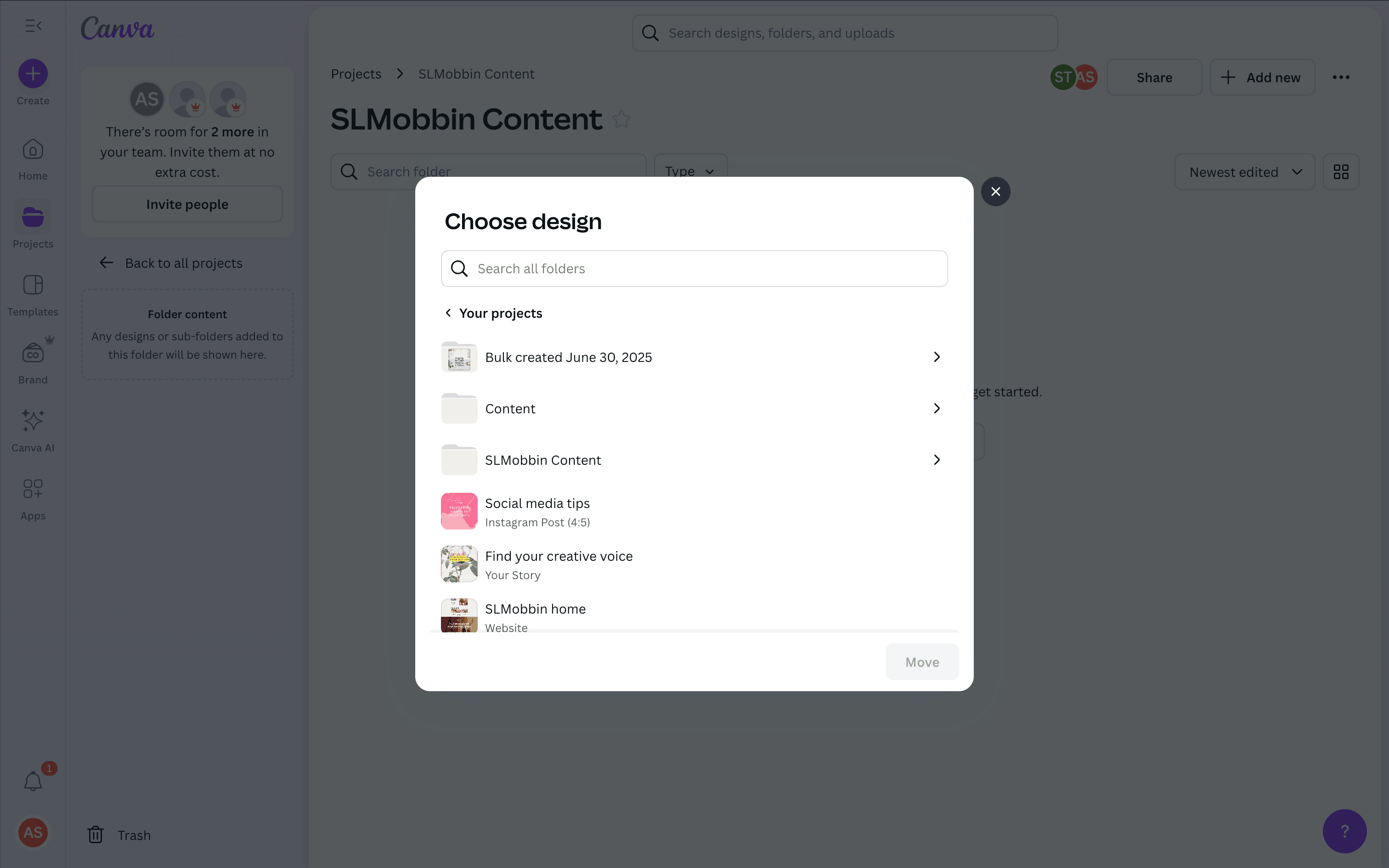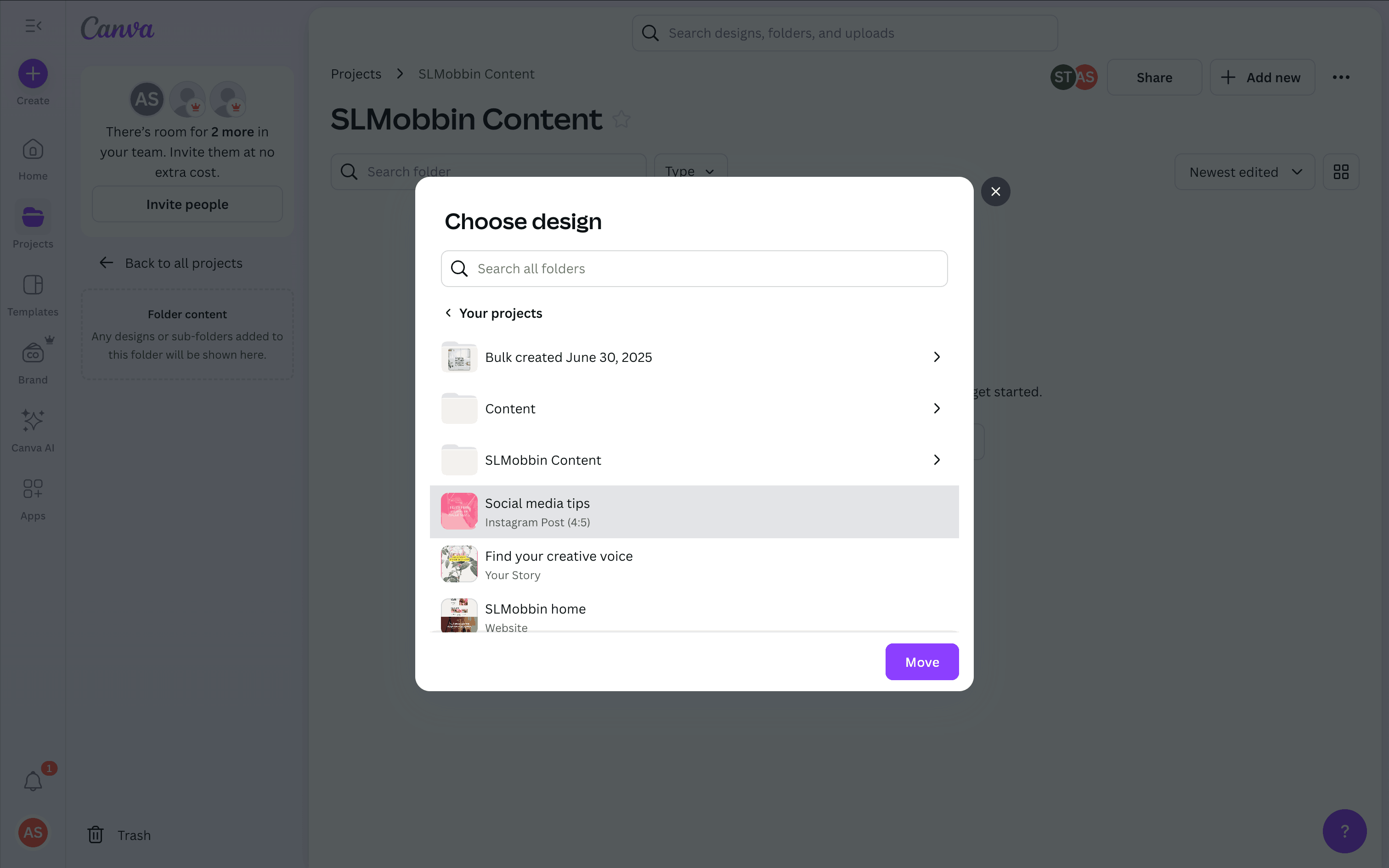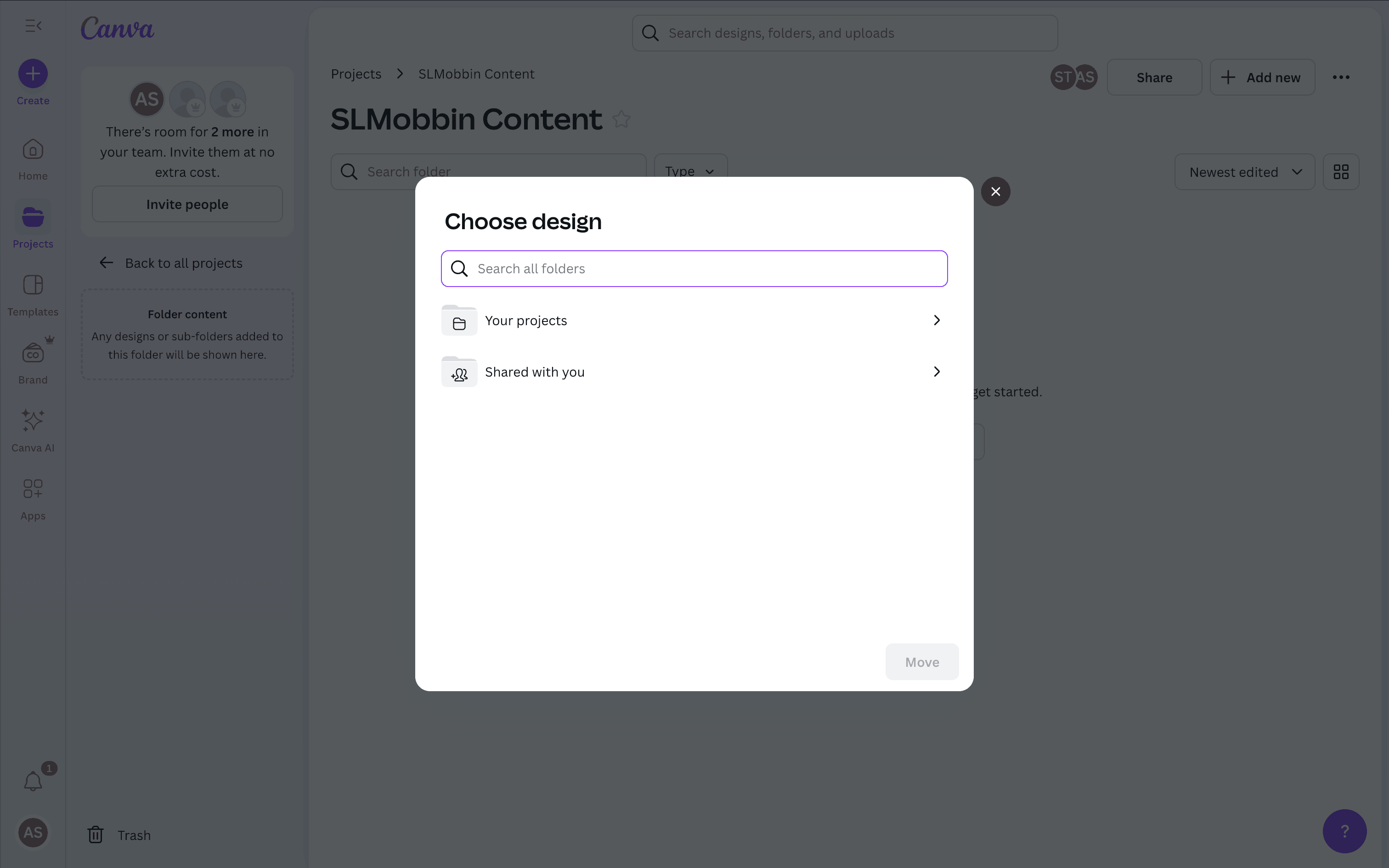 The user adds an existing design to a folder by selecting it from their projects and confirming the move. The flow showcases adding content to a folder.