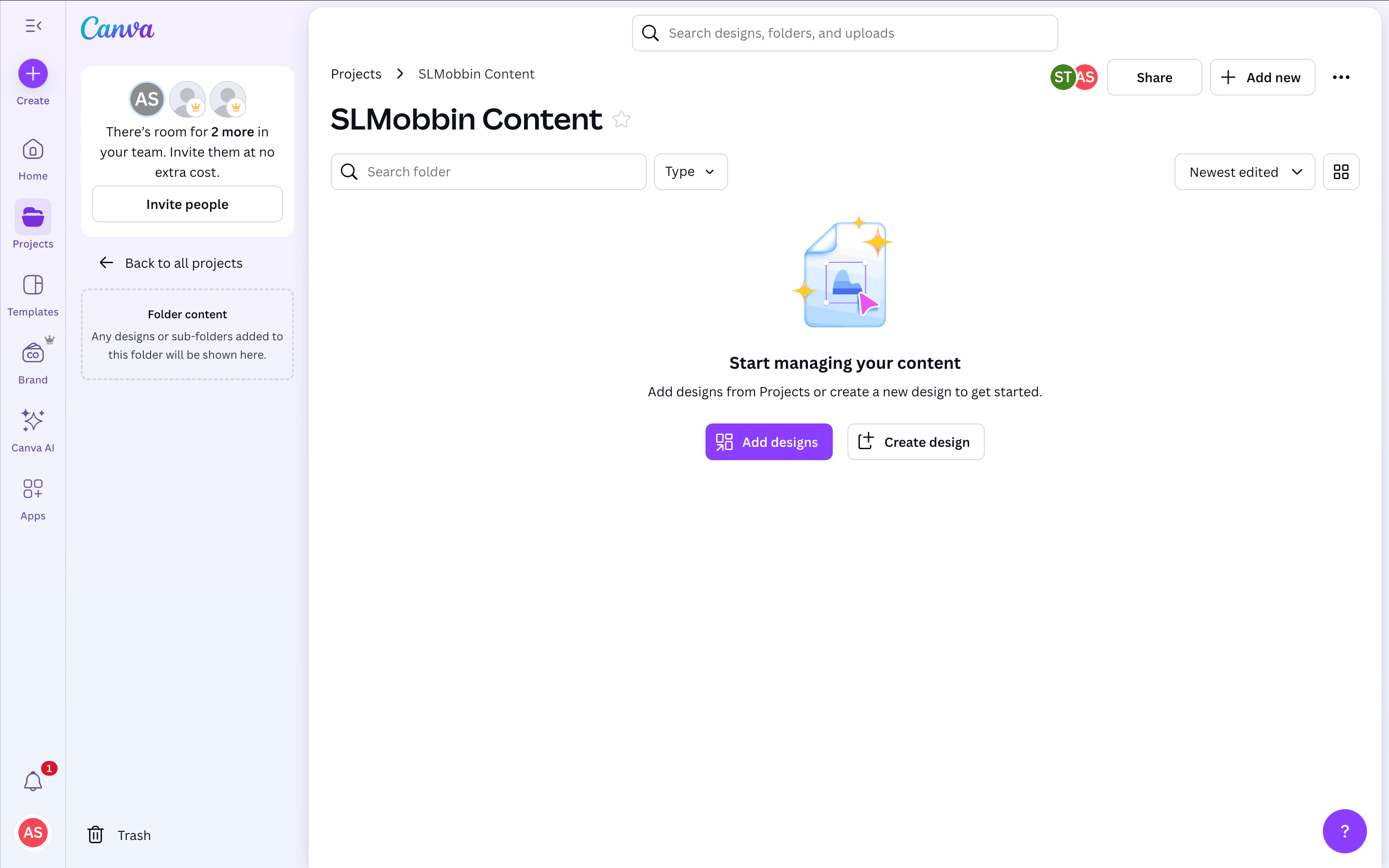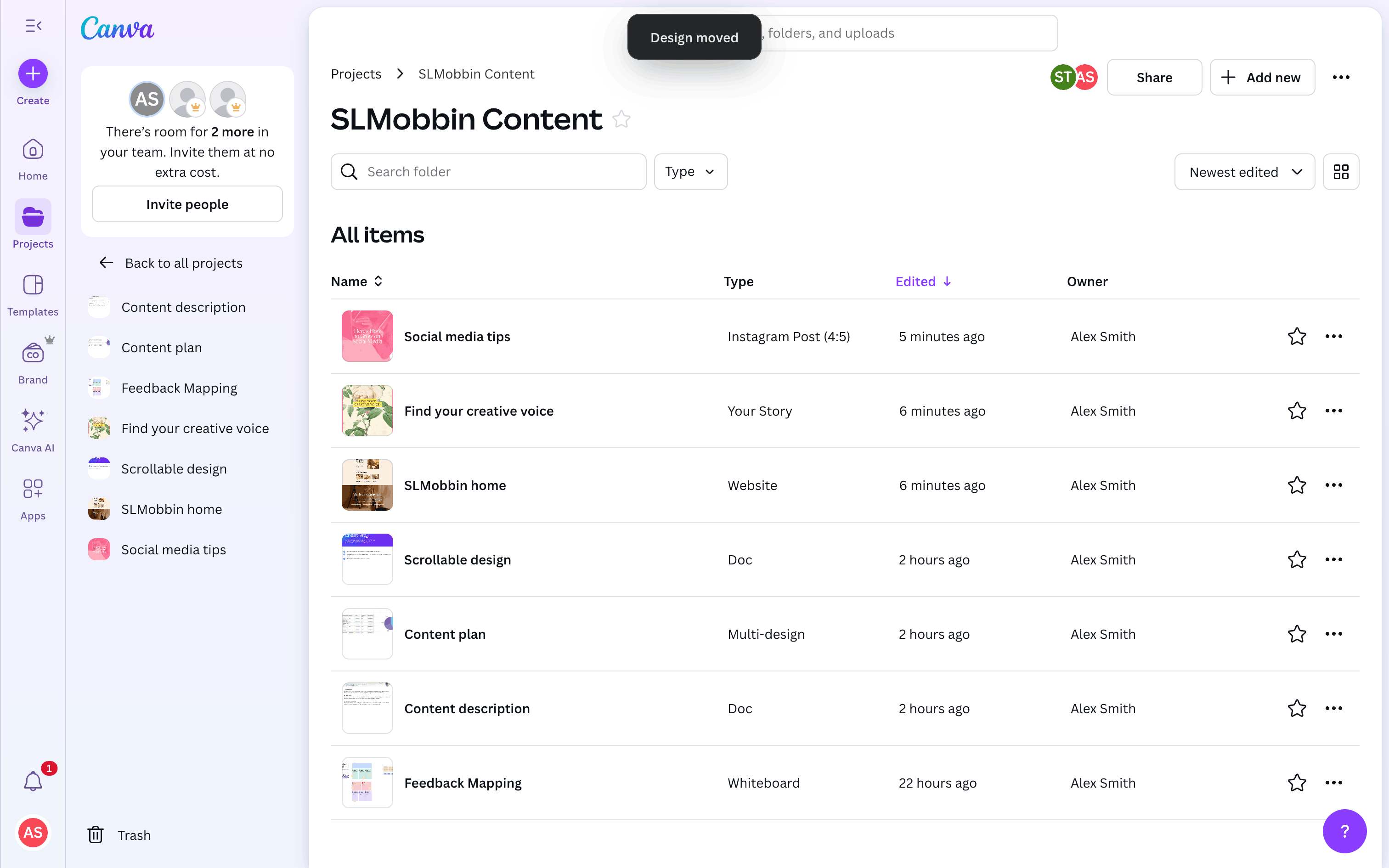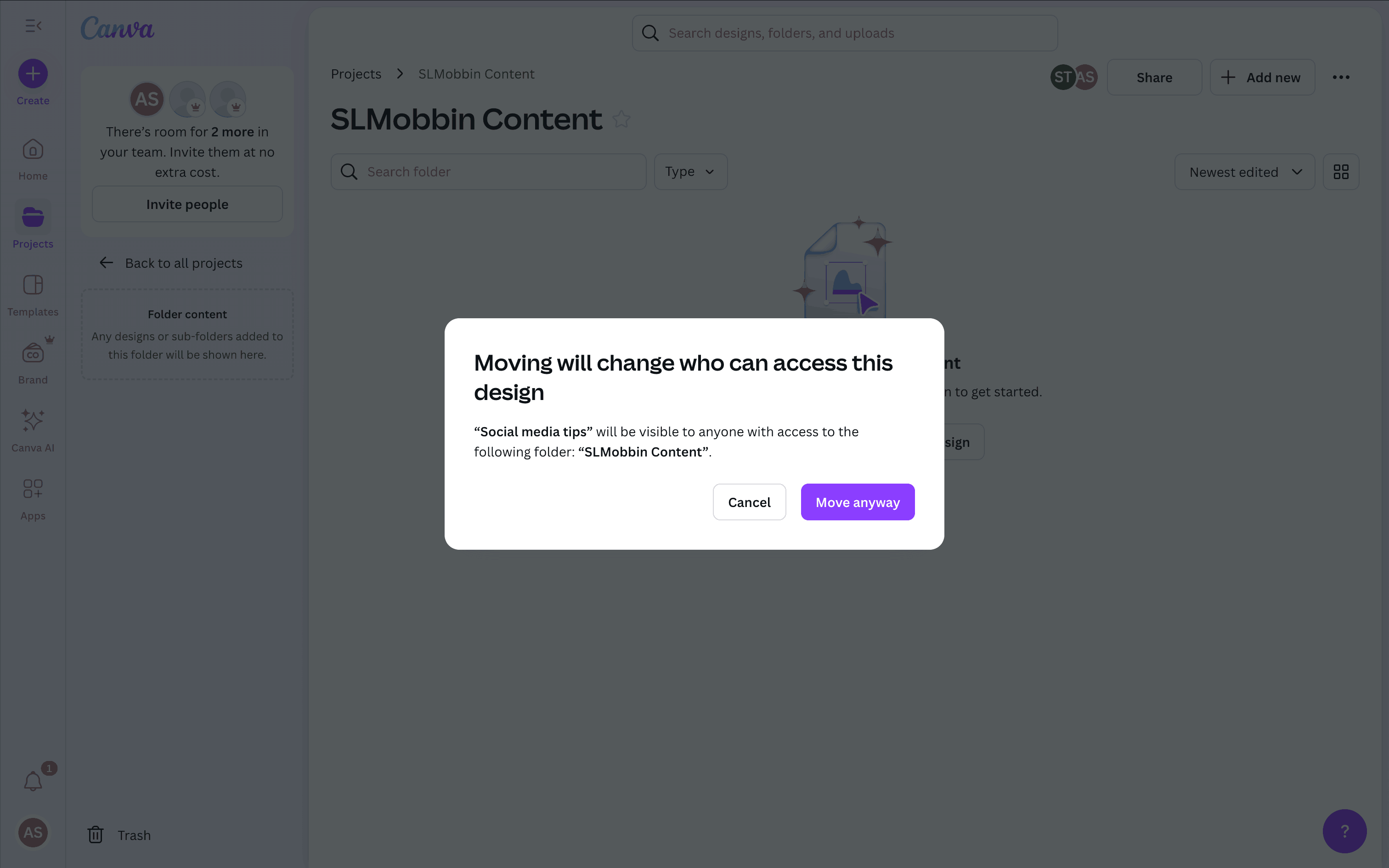 The user adds an existing design to a folder by selecting it from their projects and confirming the move. The flow showcases adding content to a folder.
