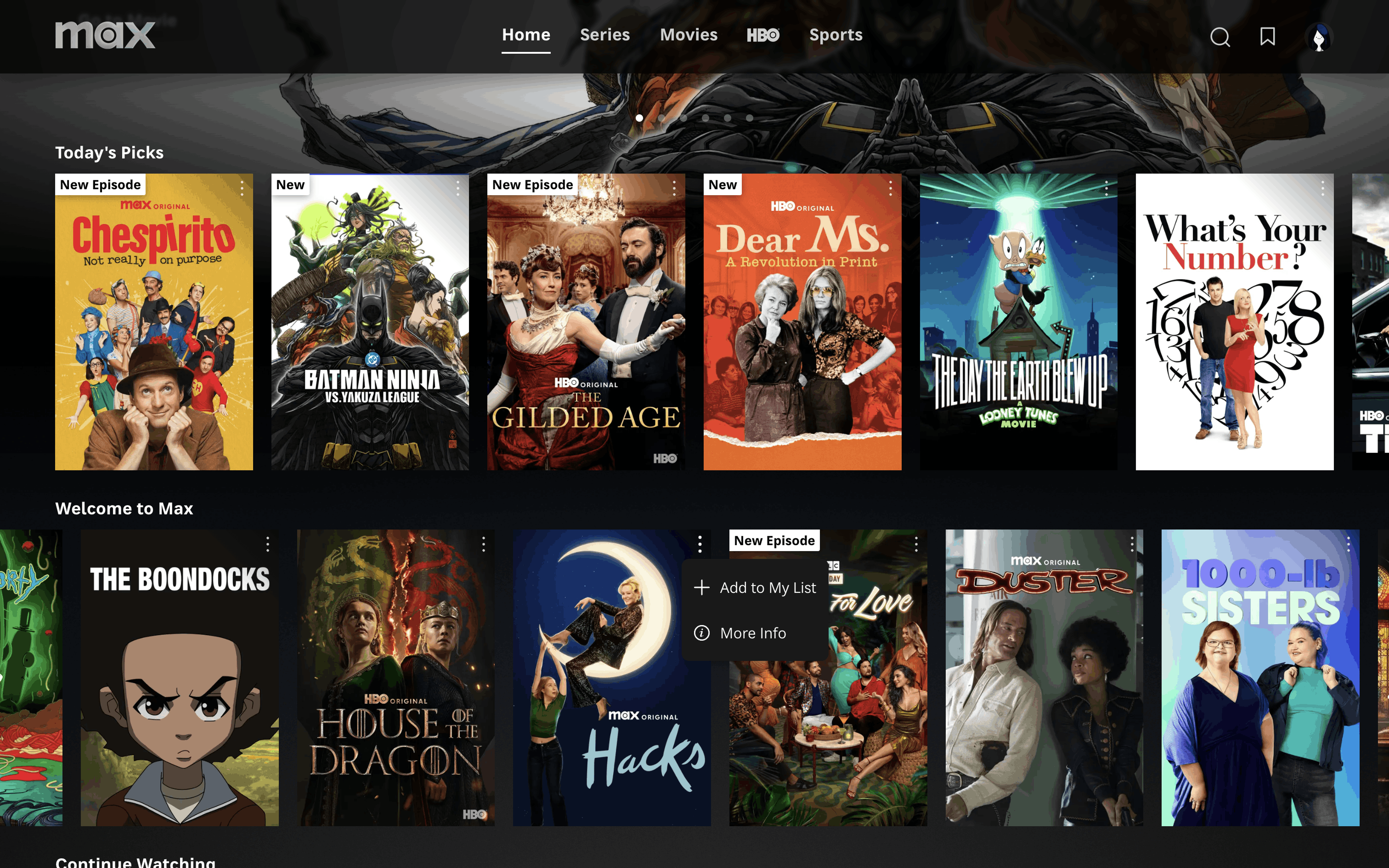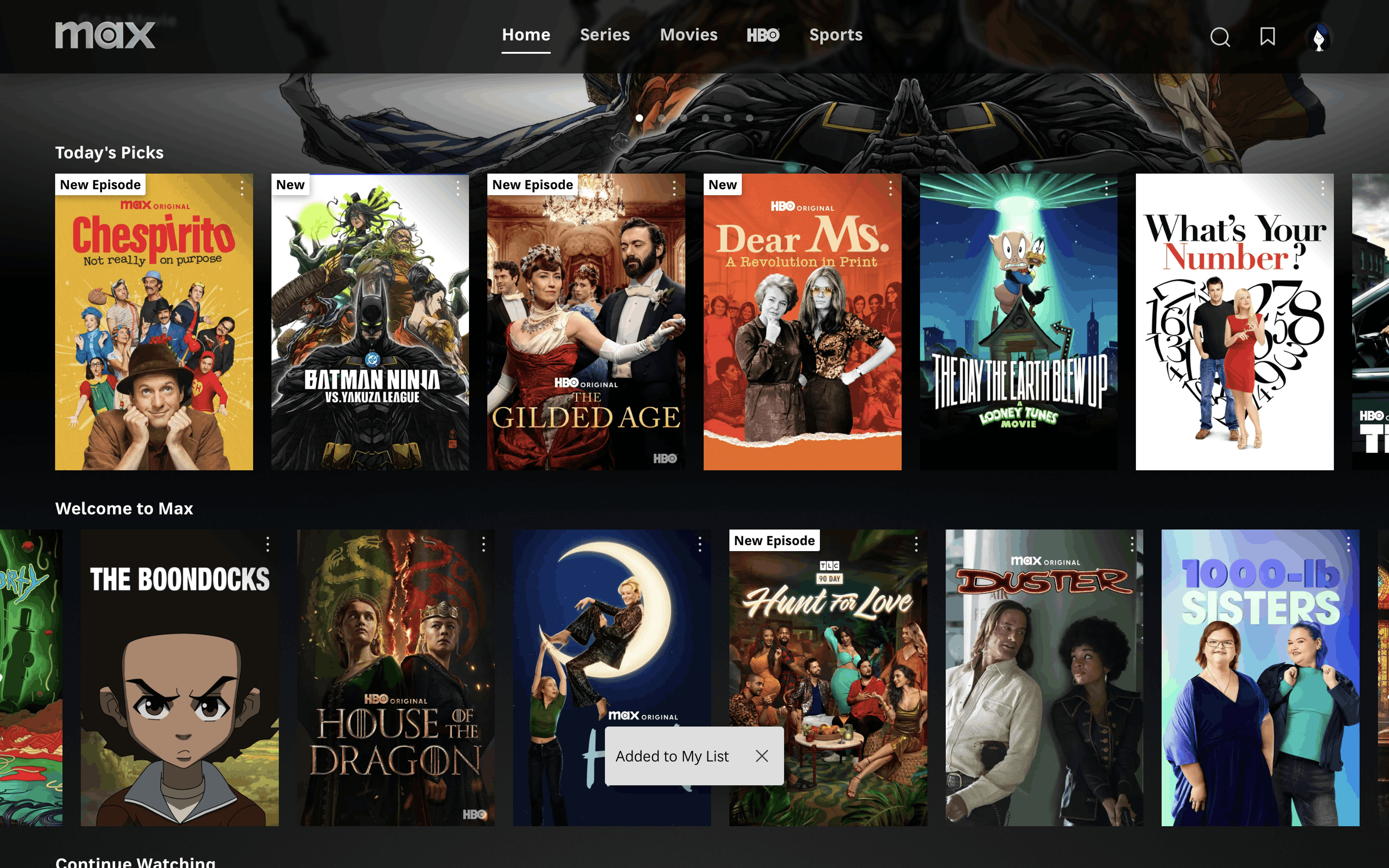 The user saves a show to their list. They hover over a show, select "Add to My List", and see a confirmation.